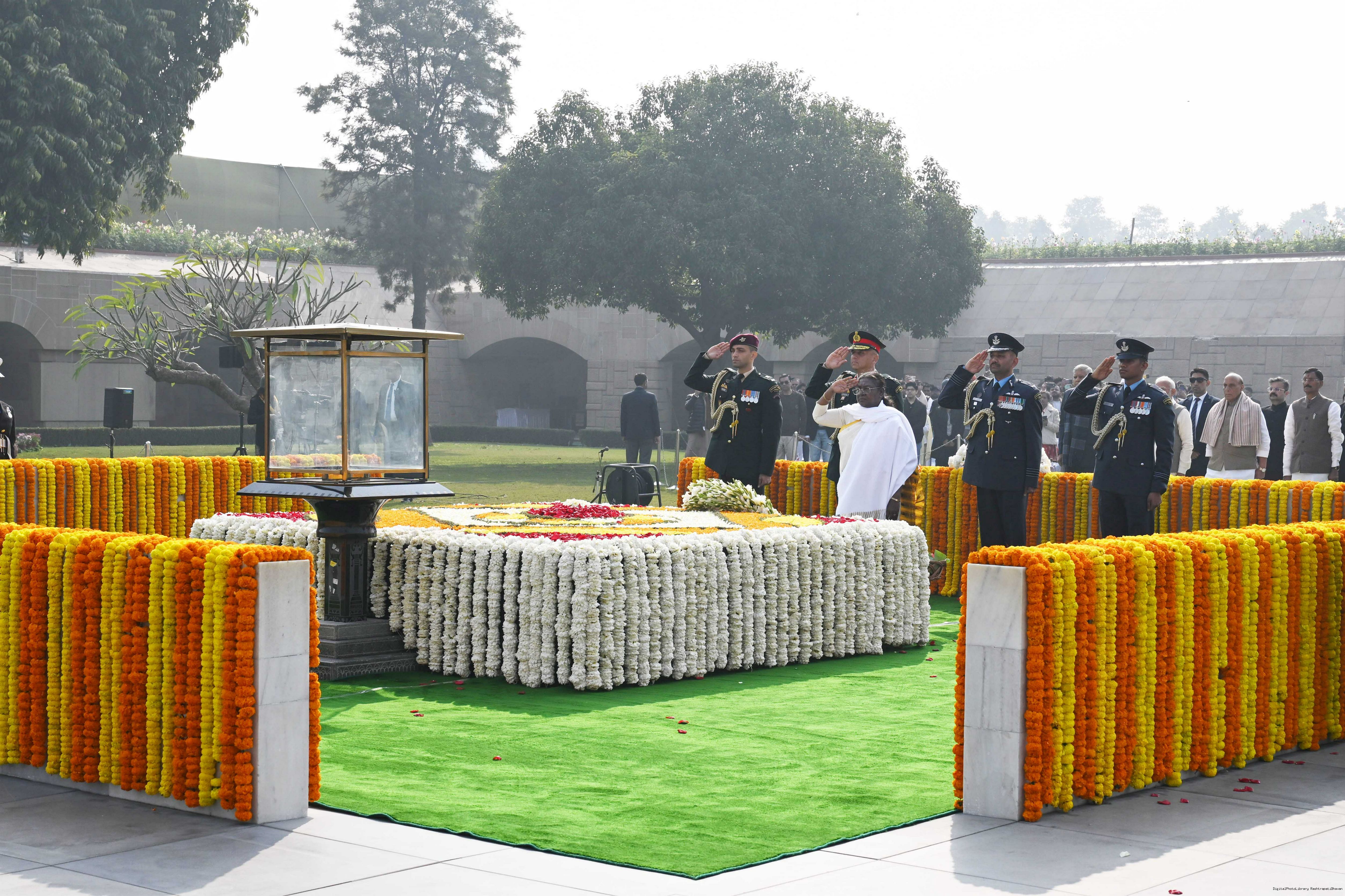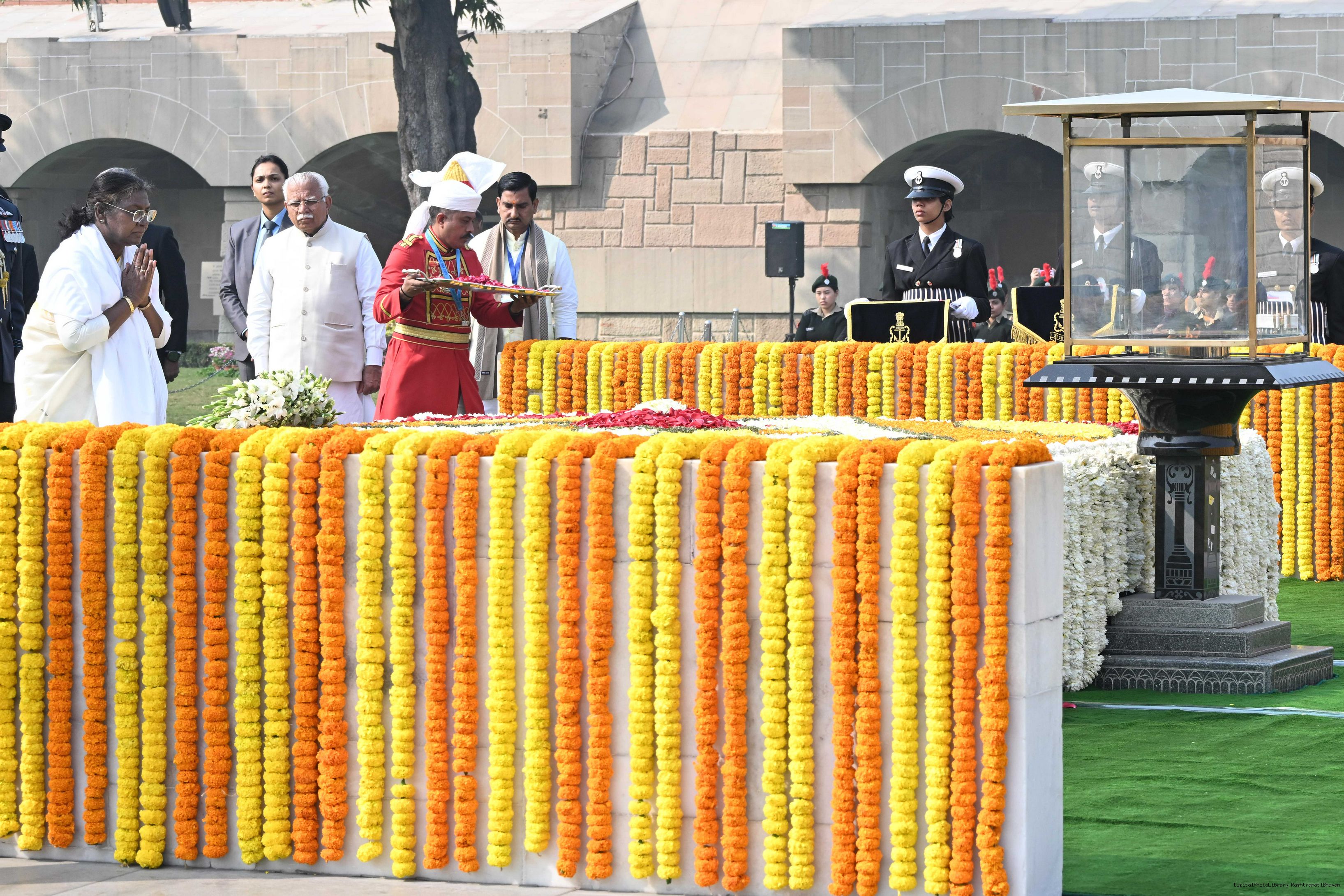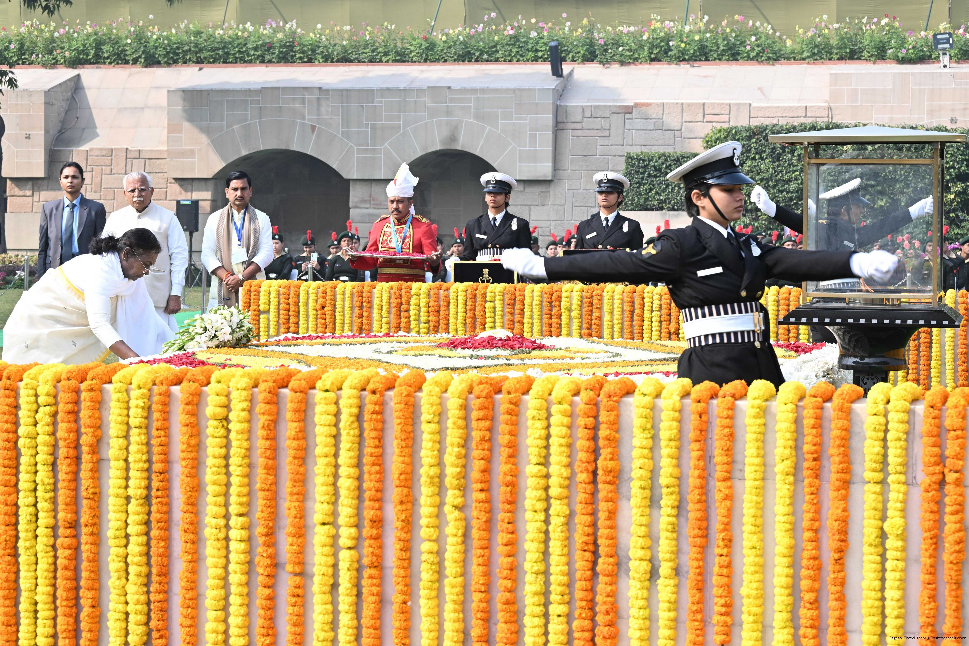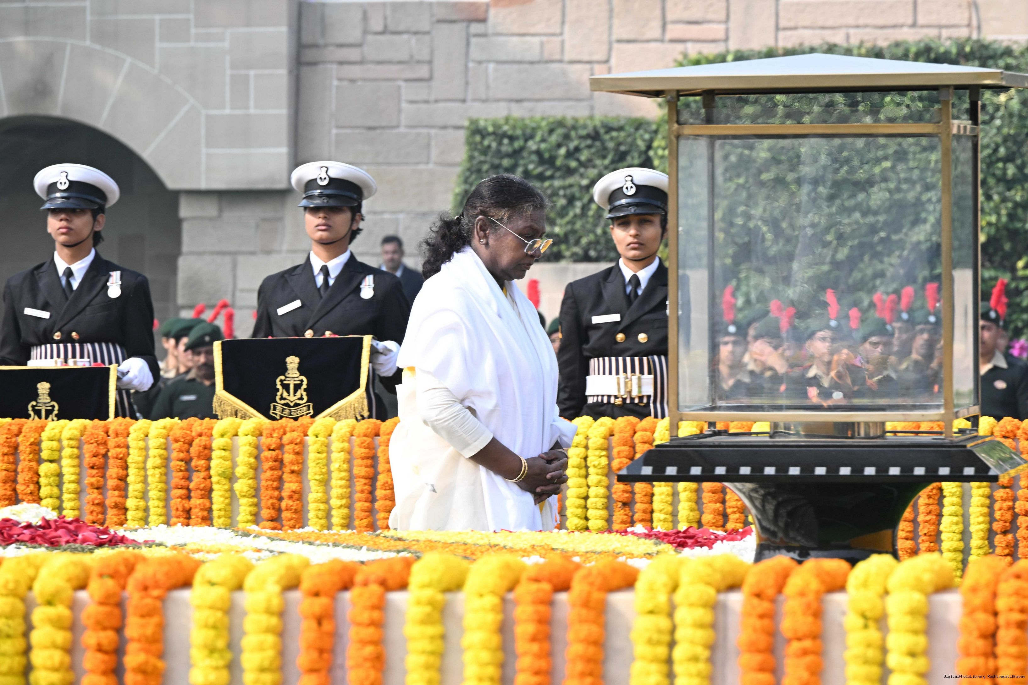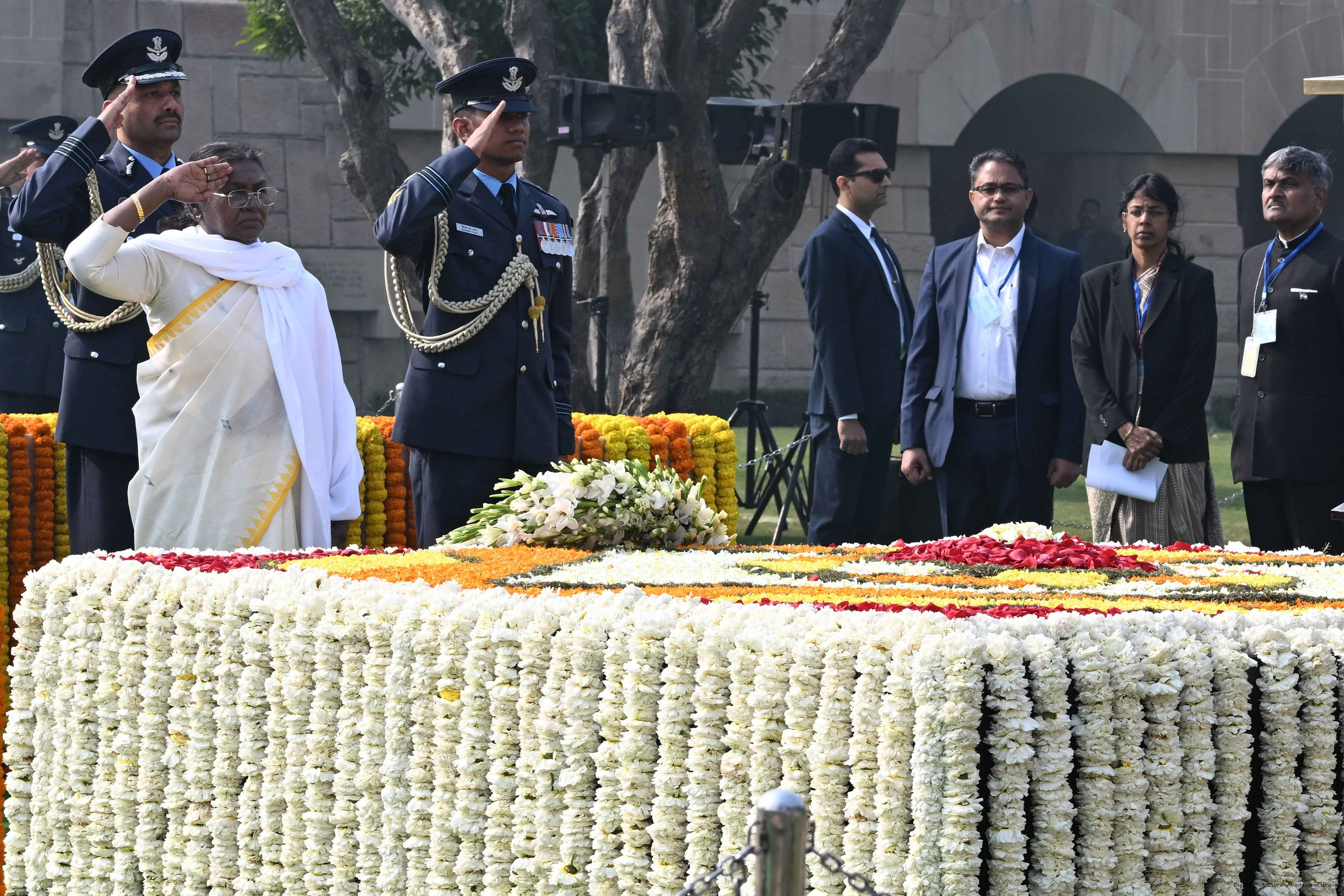 | Caption: | The President of India Smt. Droupadi Murmu paid homage to Mahatma Gandhi on his 77th death anniversary and attended a Sarva Dharma Prarthana at Rajghat, New Delhi on January 30, 2025. |