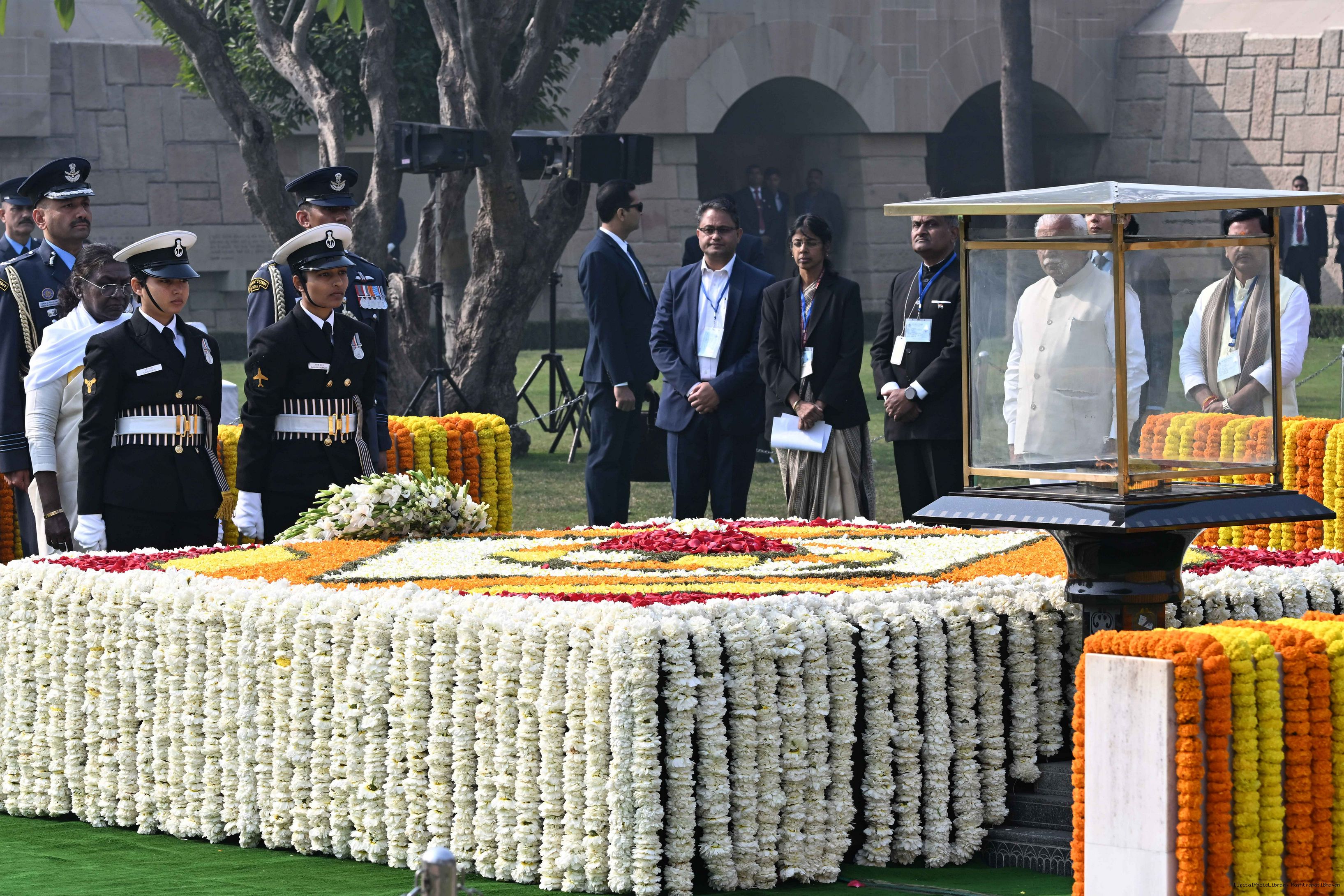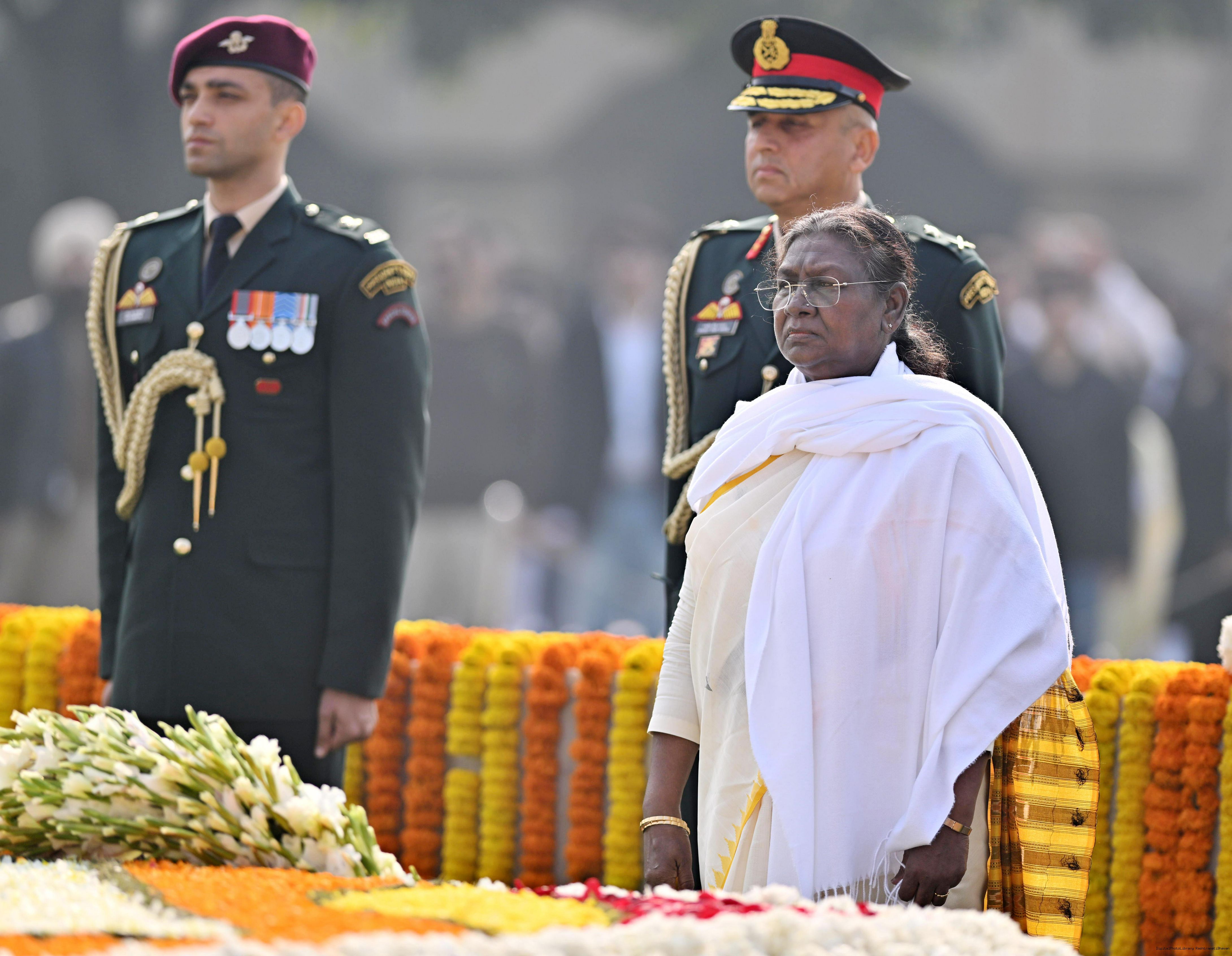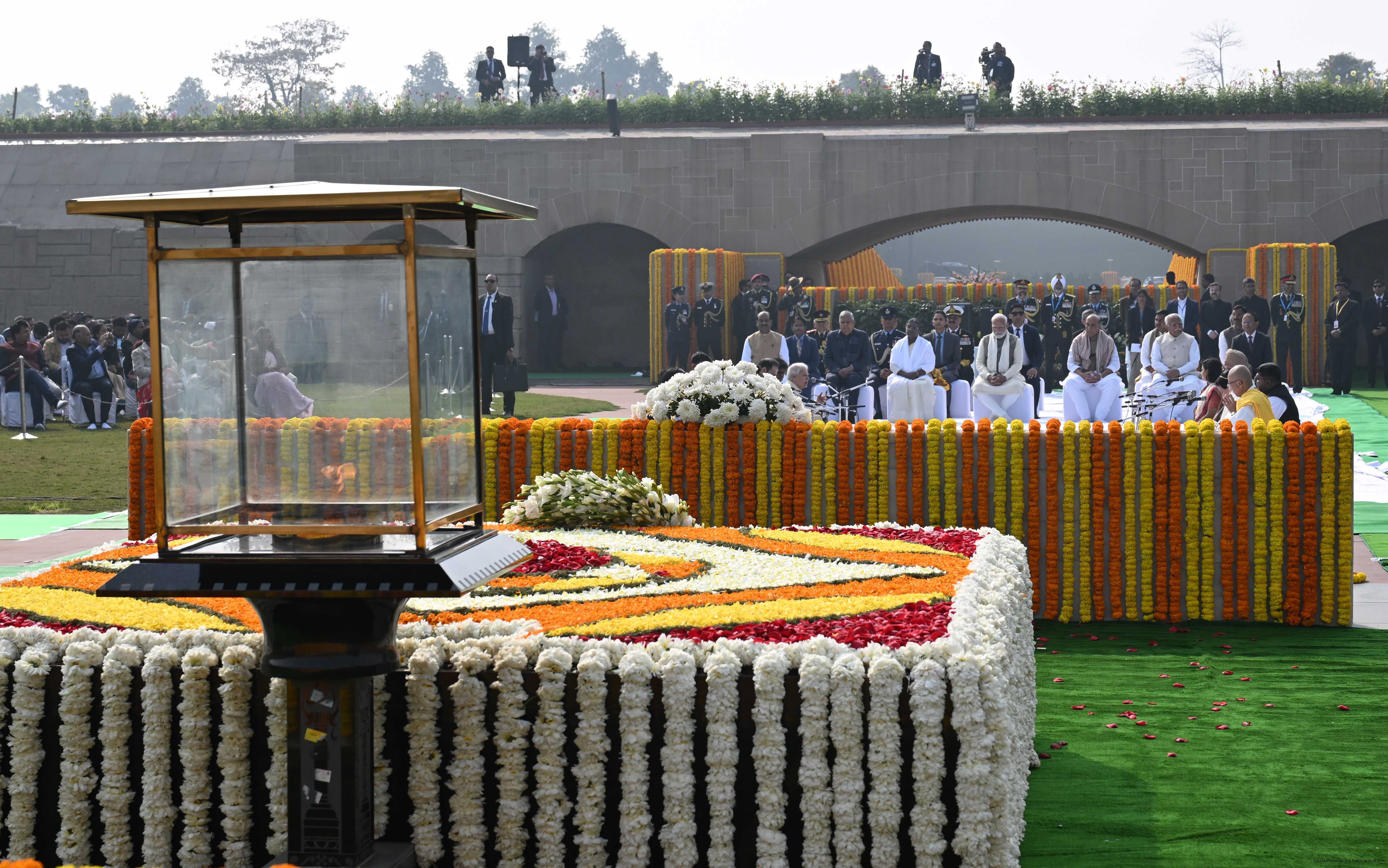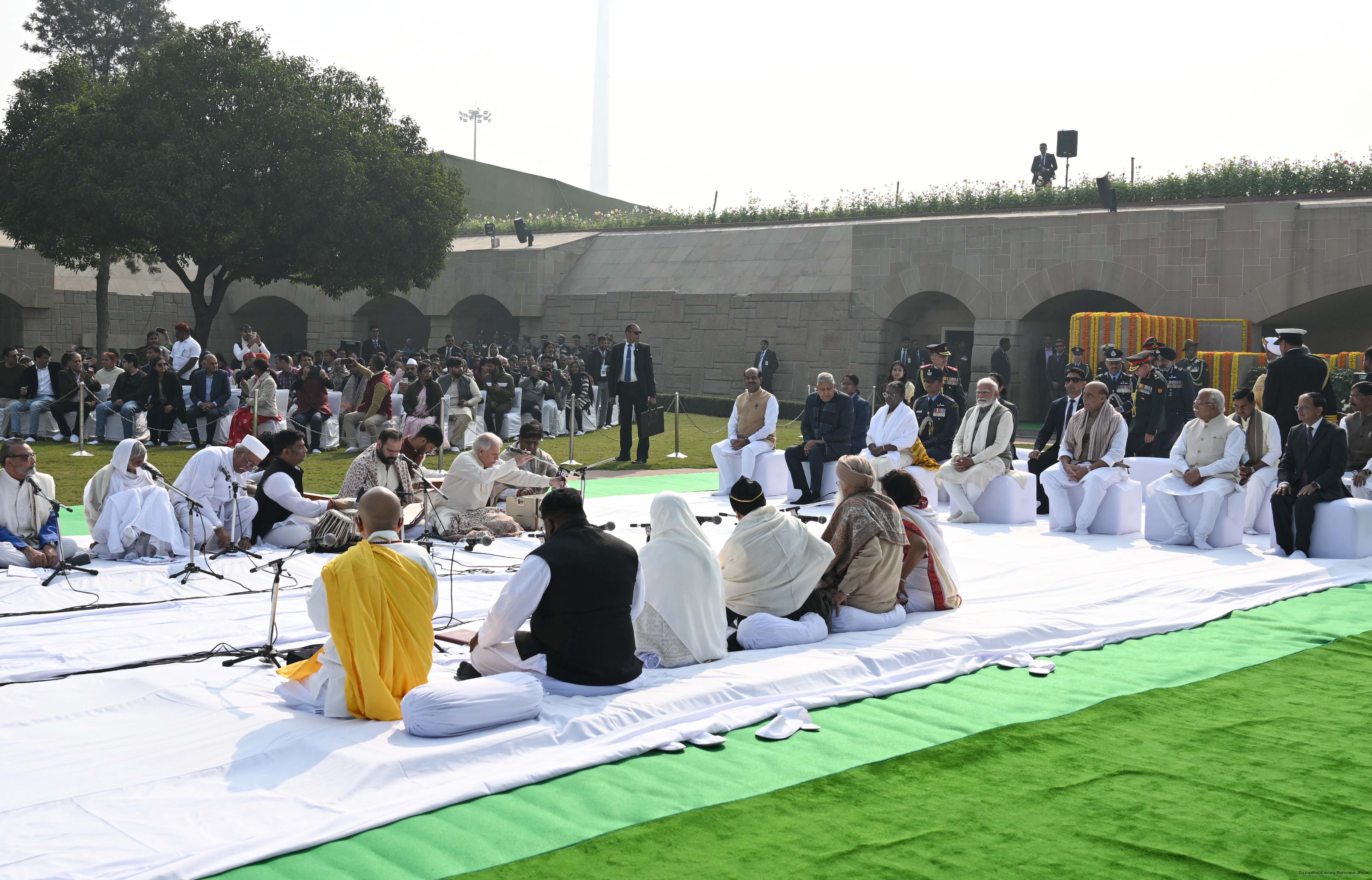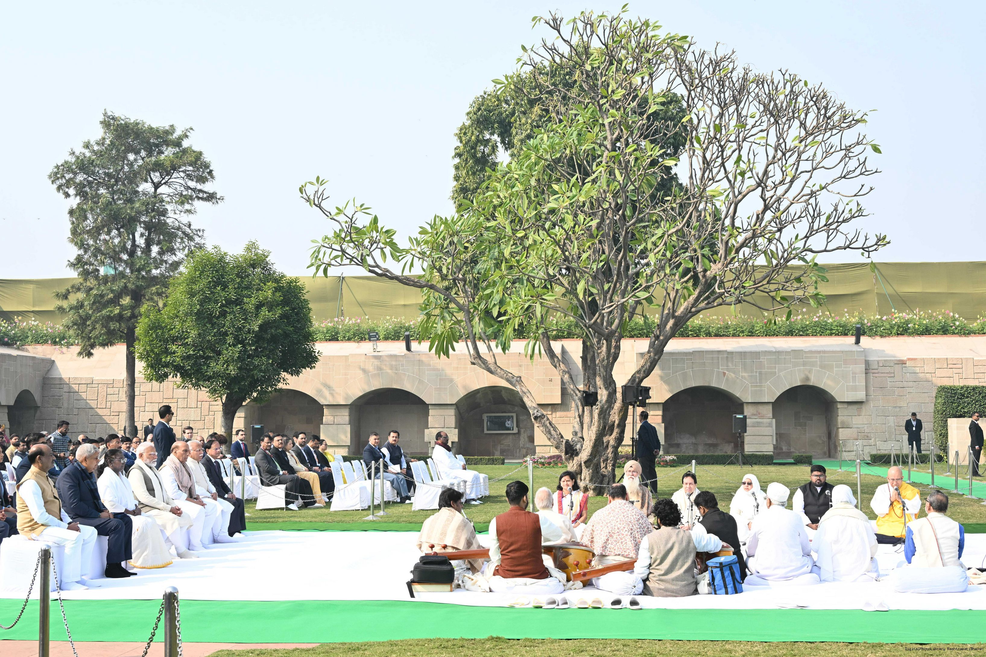 | Caption: | The President of India Smt. Droupadi Murmu paid homage to Mahatma Gandhi on his 77th death anniversary and attended a Sarva Dharma Prarthana at Rajghat, New Delhi on January 30, 2025. |