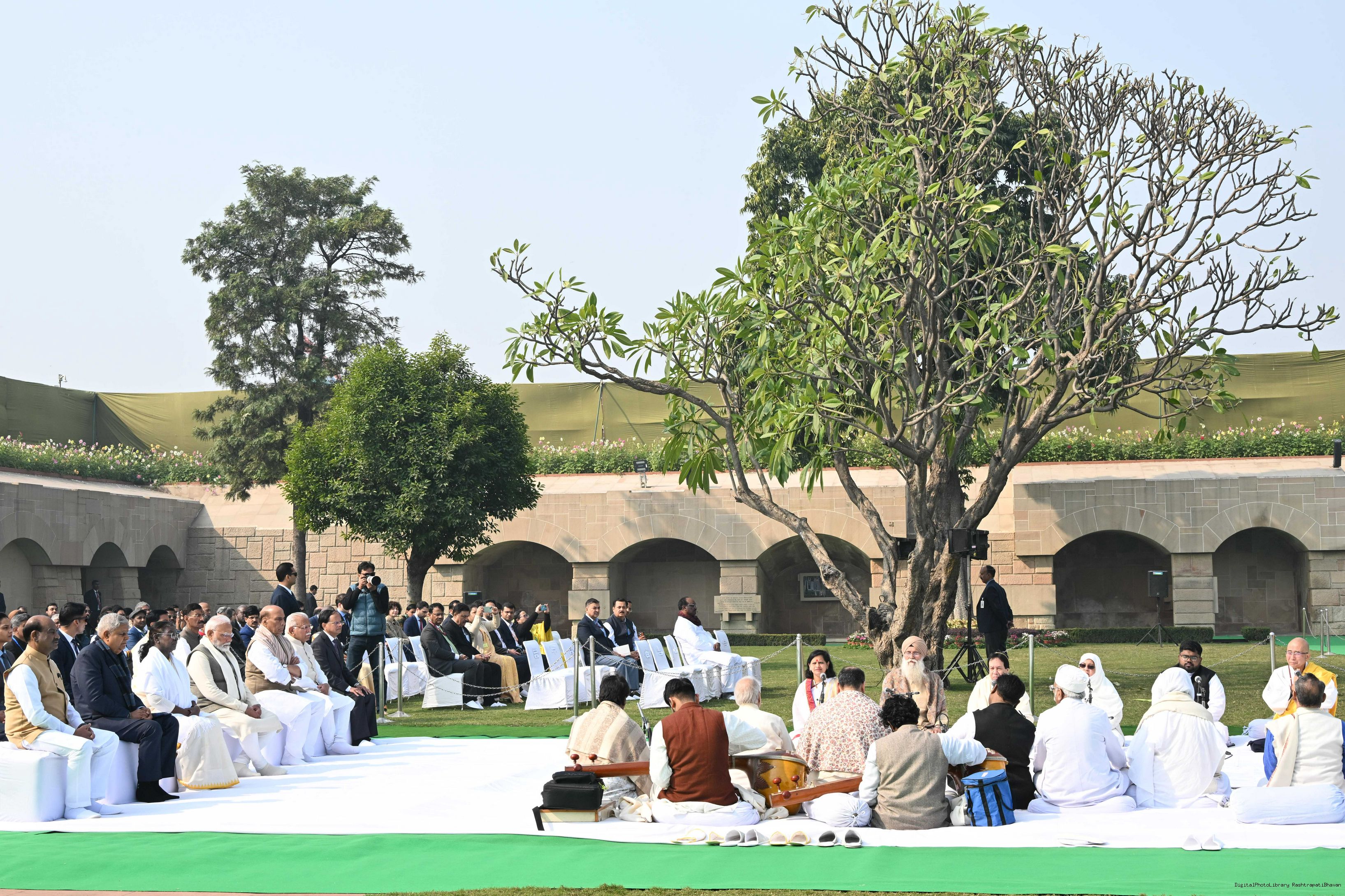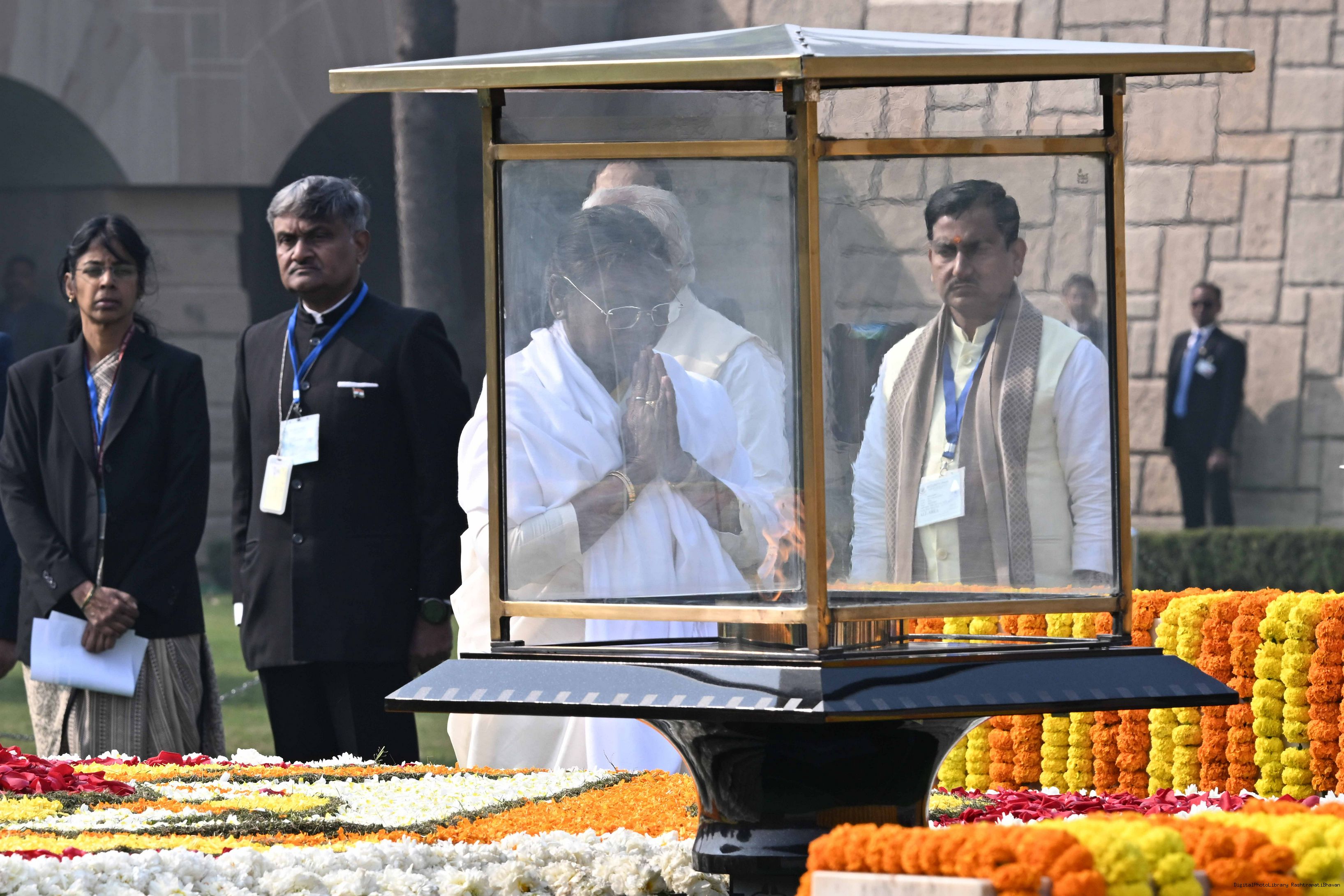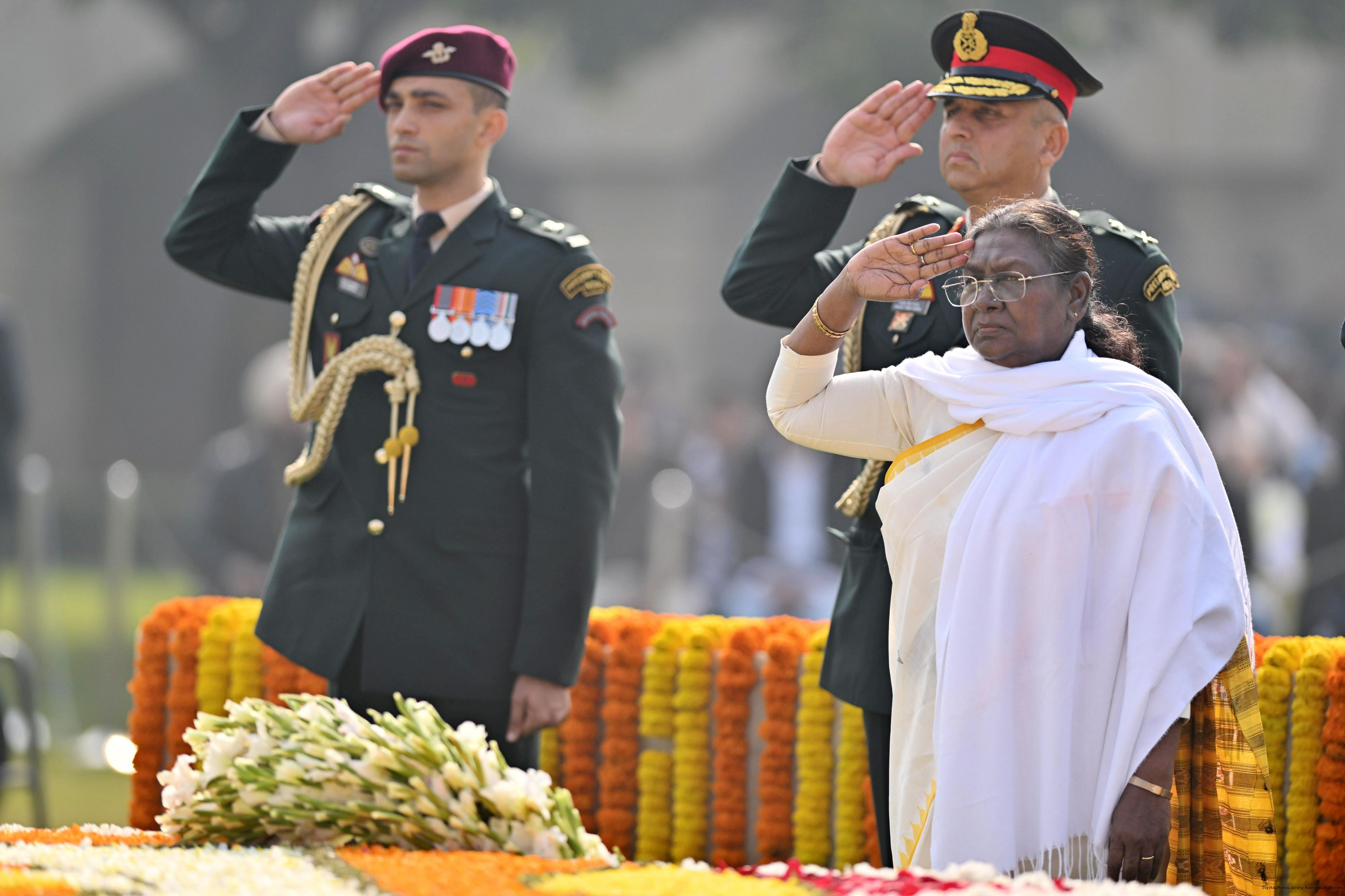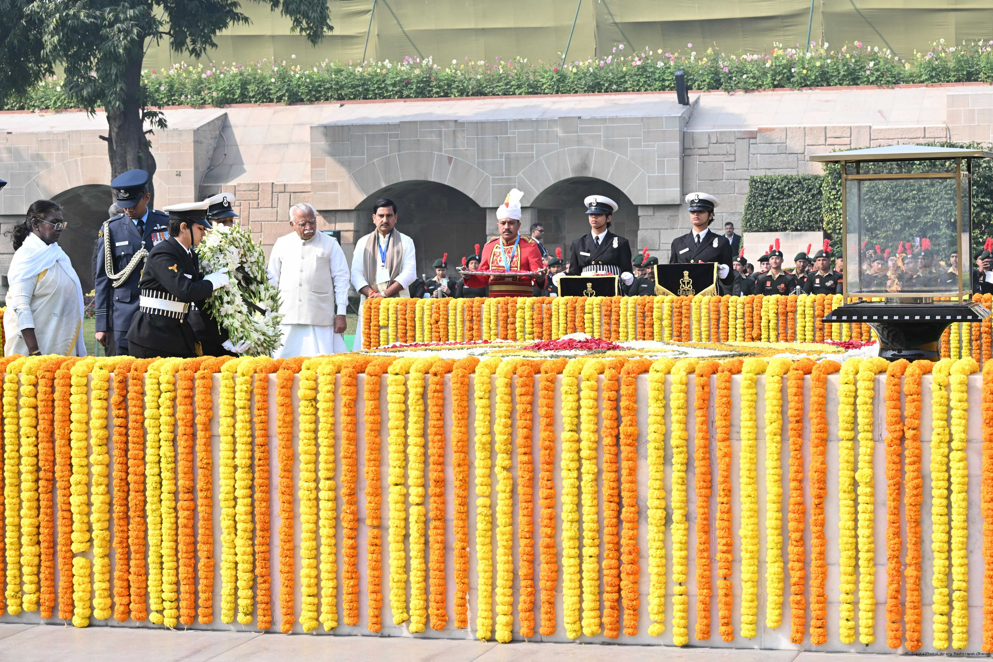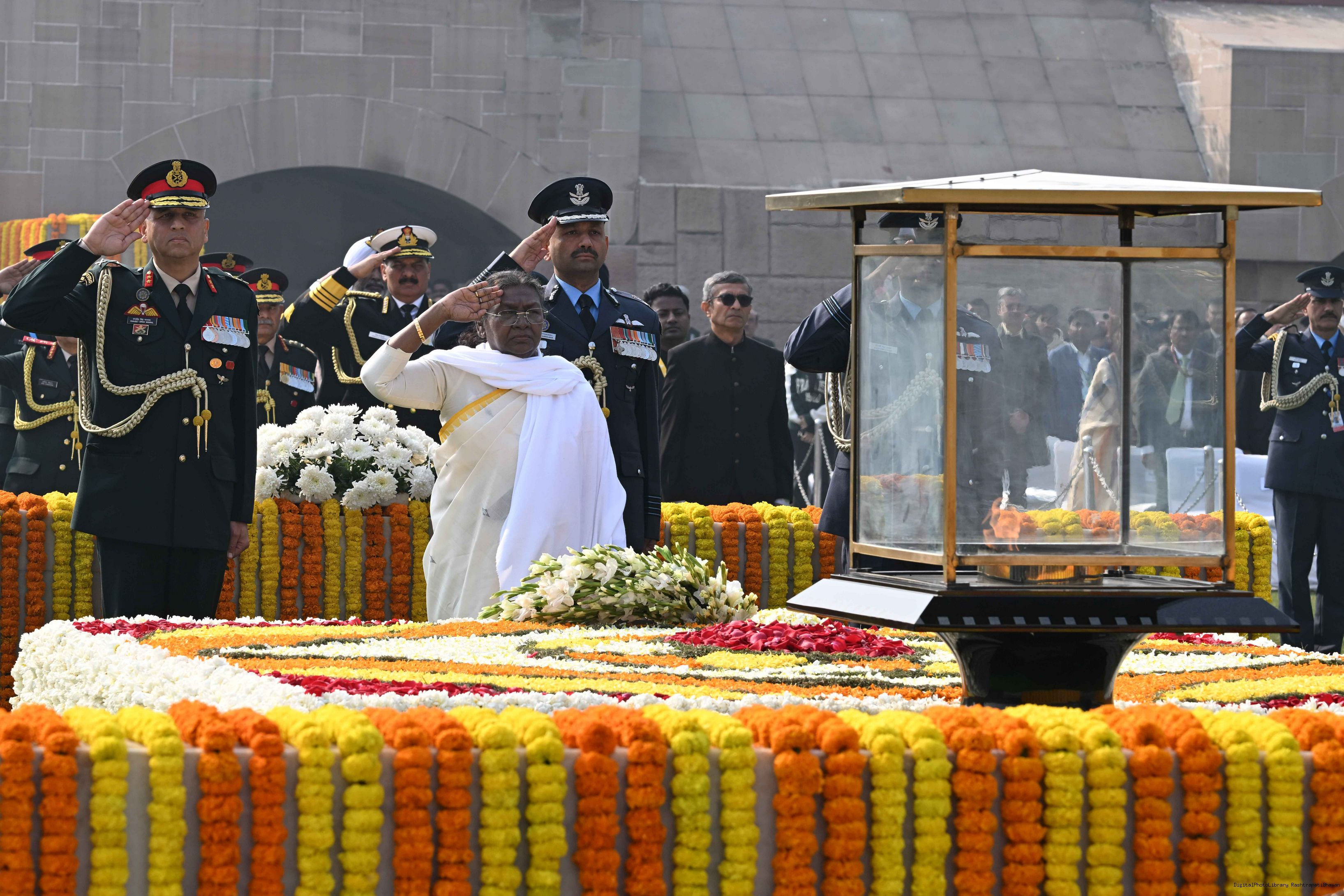 | Caption: | The President of India Smt. Droupadi Murmu paid homage to Mahatma Gandhi on his 77th death anniversary and attended a Sarva Dharma Prarthana at Rajghat, New Delhi on January 30, 2025. |