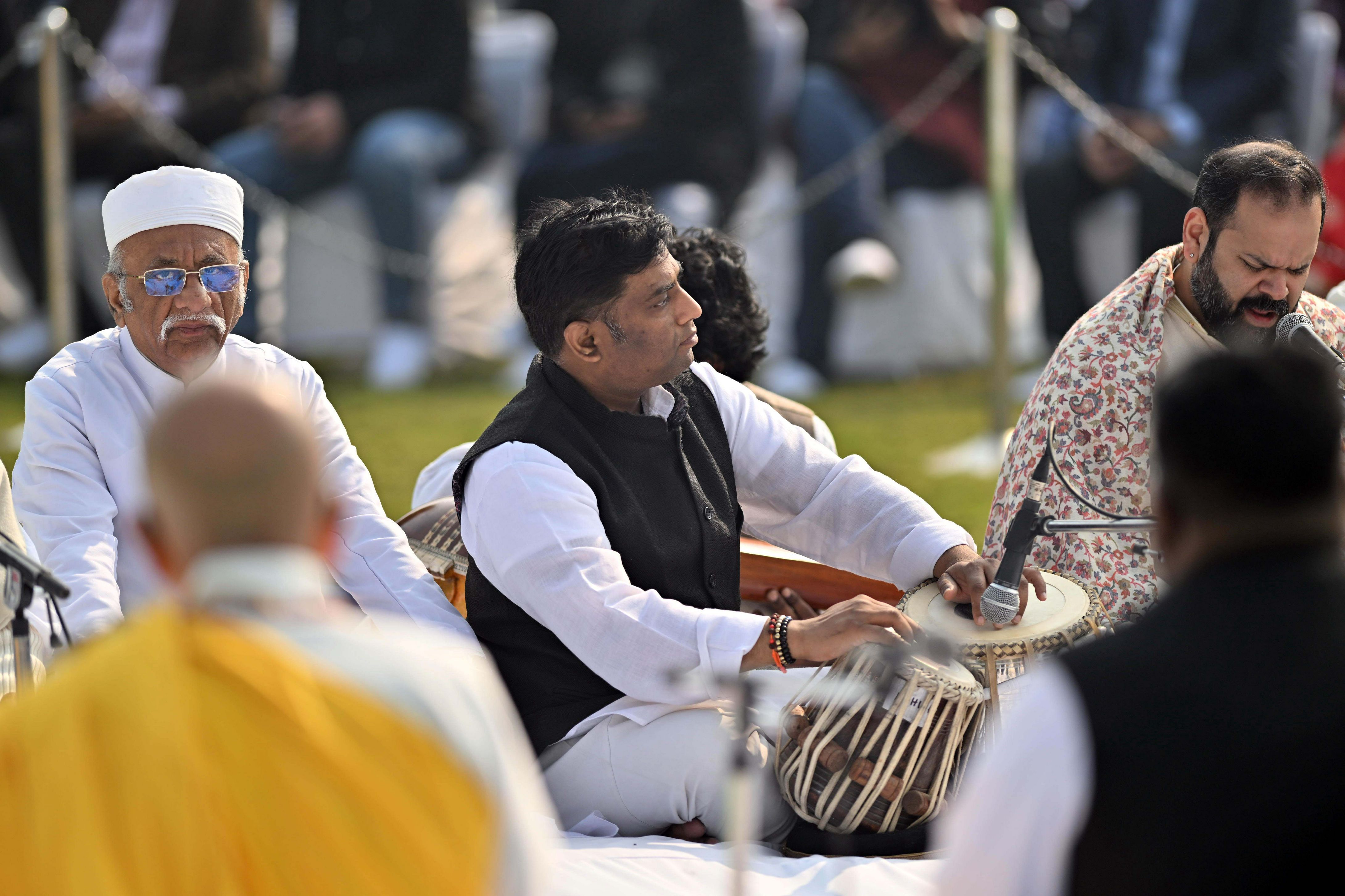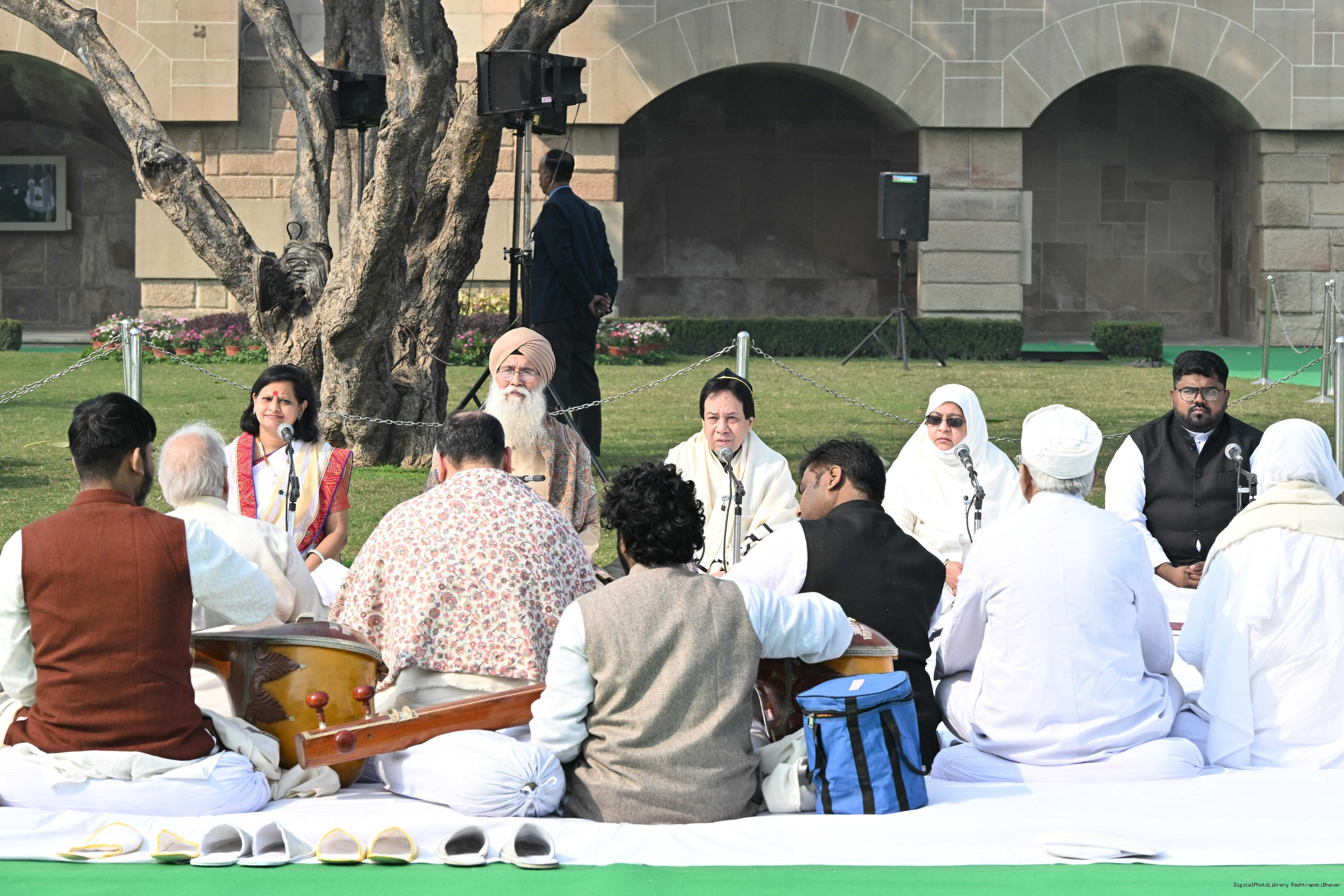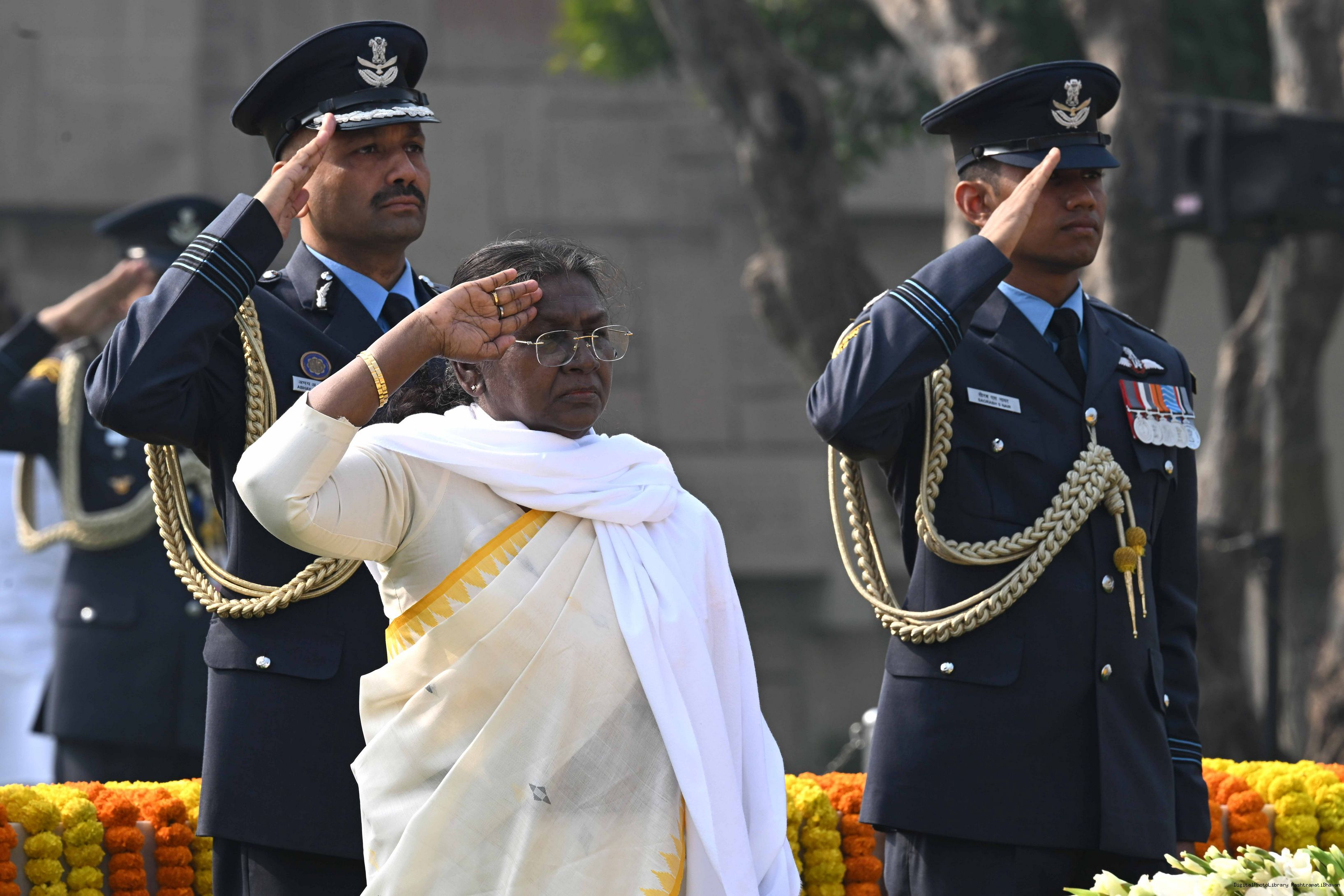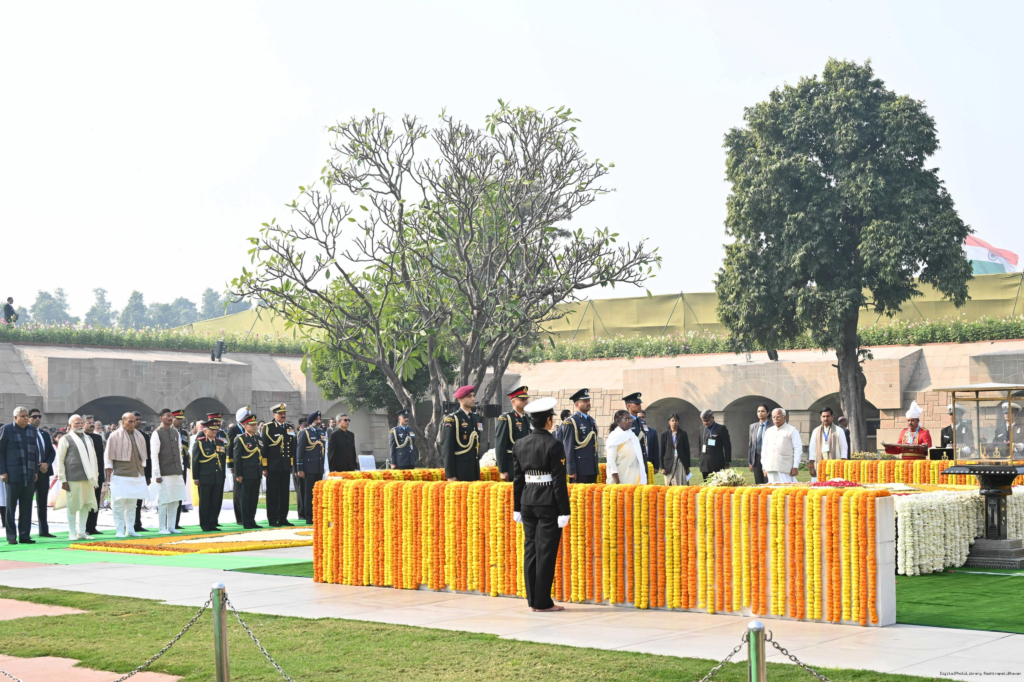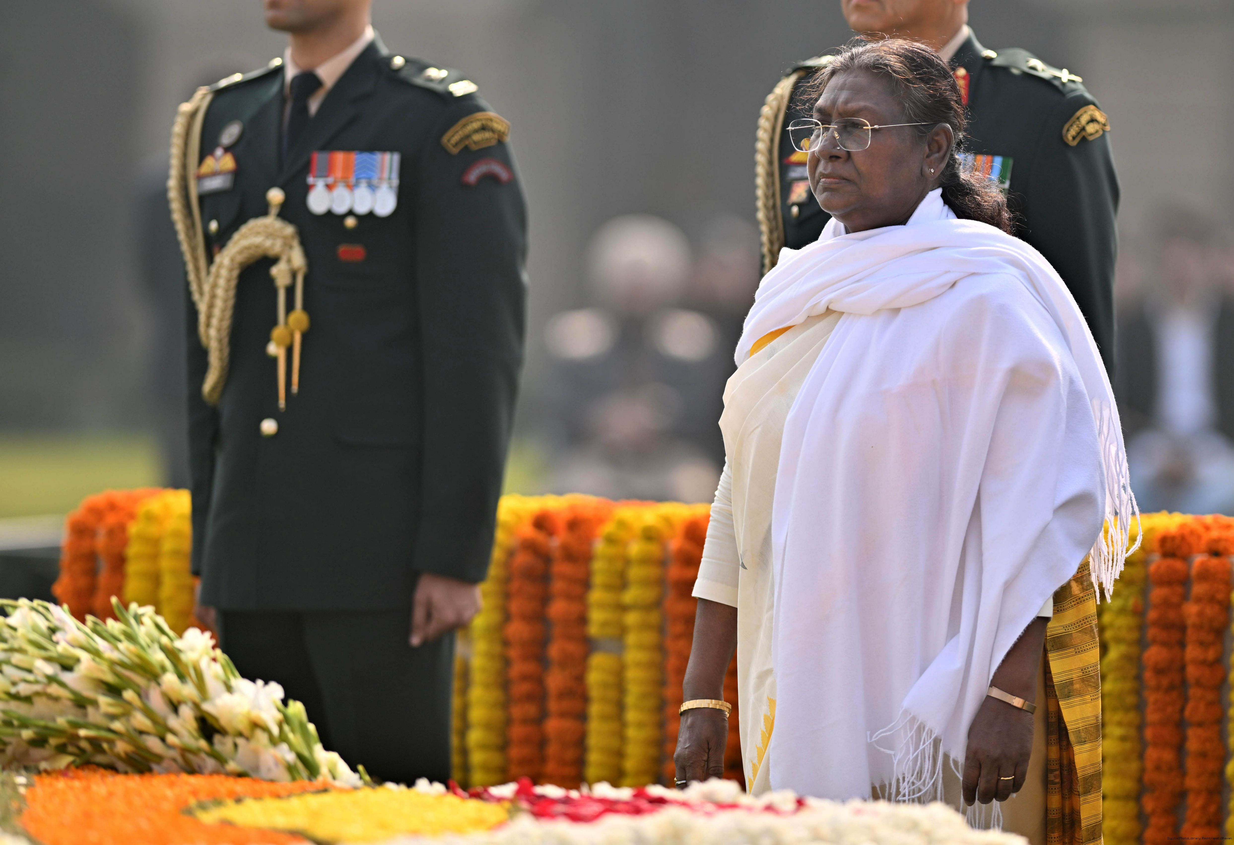 | Caption: | The President of India Smt. Droupadi Murmu paid homage to Mahatma Gandhi on his 77th death anniversary and attended a Sarva Dharma Prarthana at Rajghat, New Delhi on January 30, 2025. |
