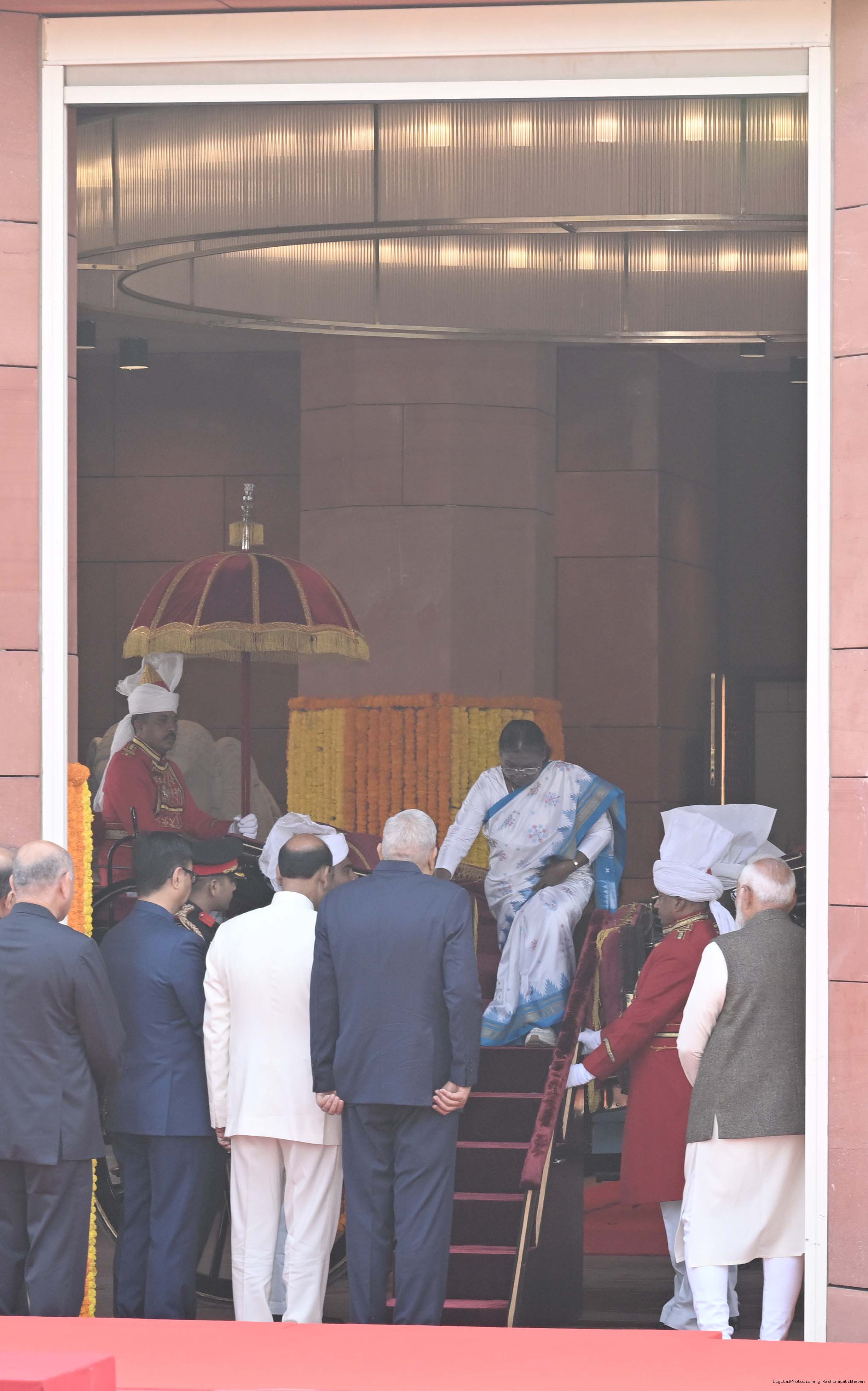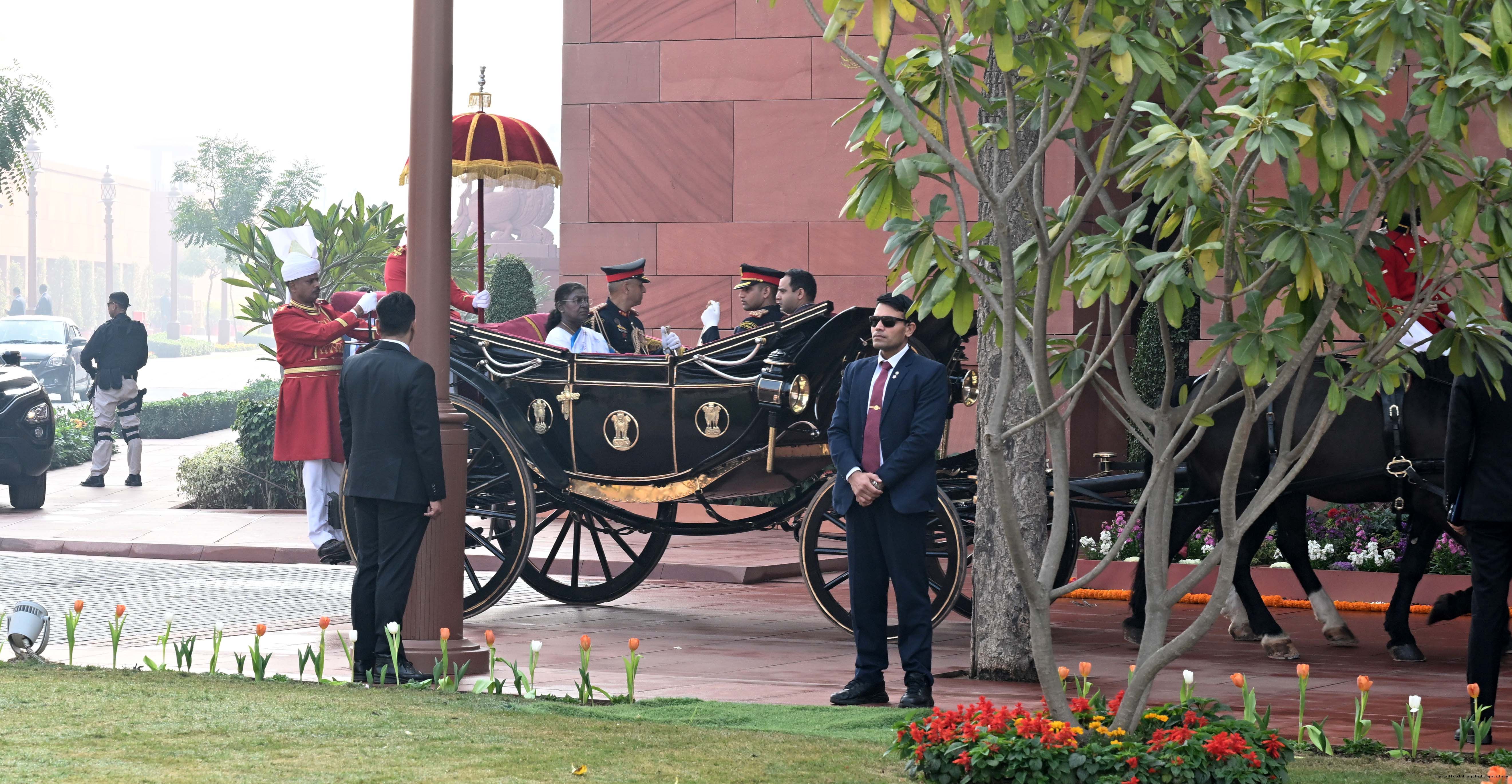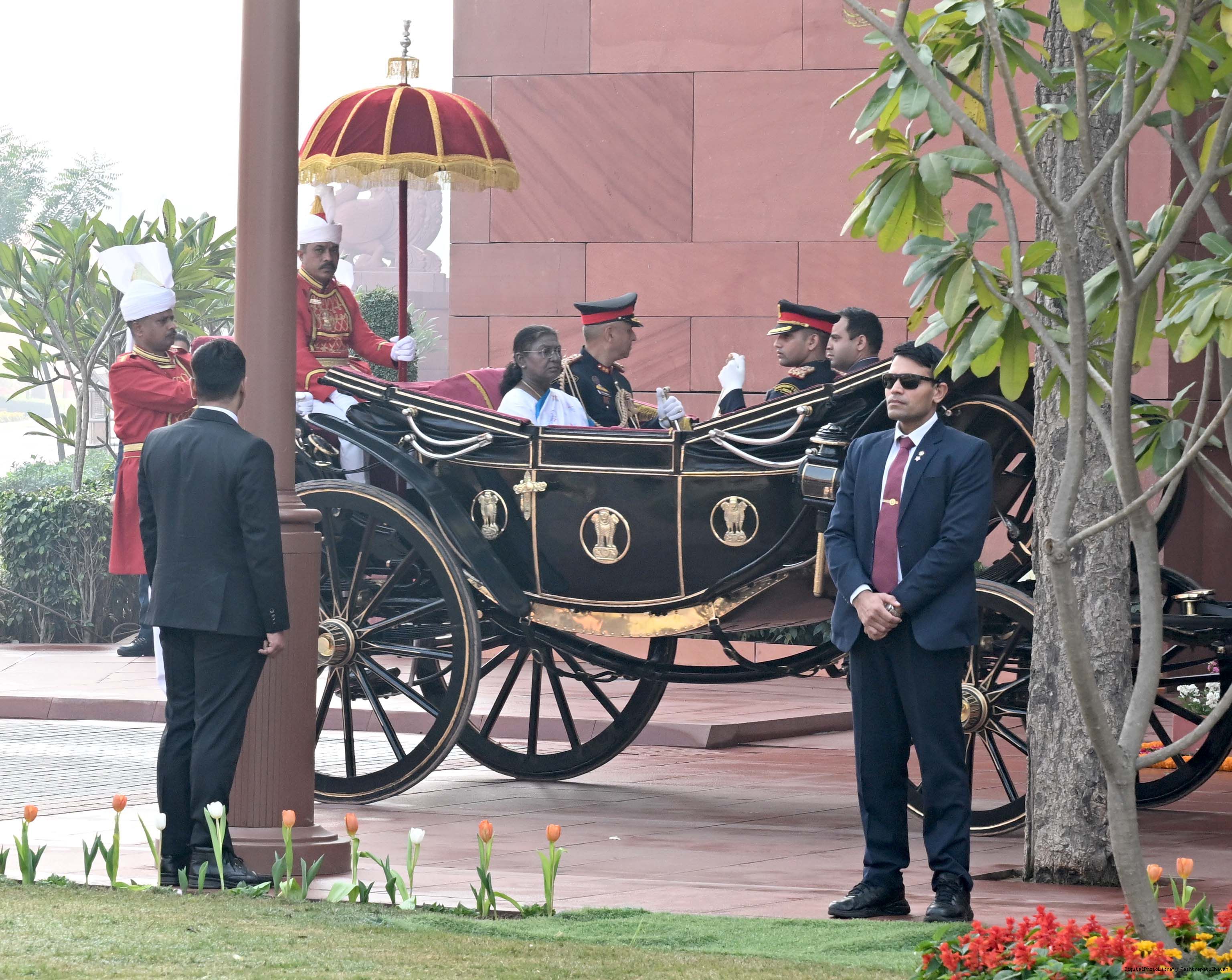 | Caption: | The President of India, Smt. Droupadi Murmu addressing both the Houses of Parliament during her ceremonial arrival and departure in New Delhi on January 31, 2025. |