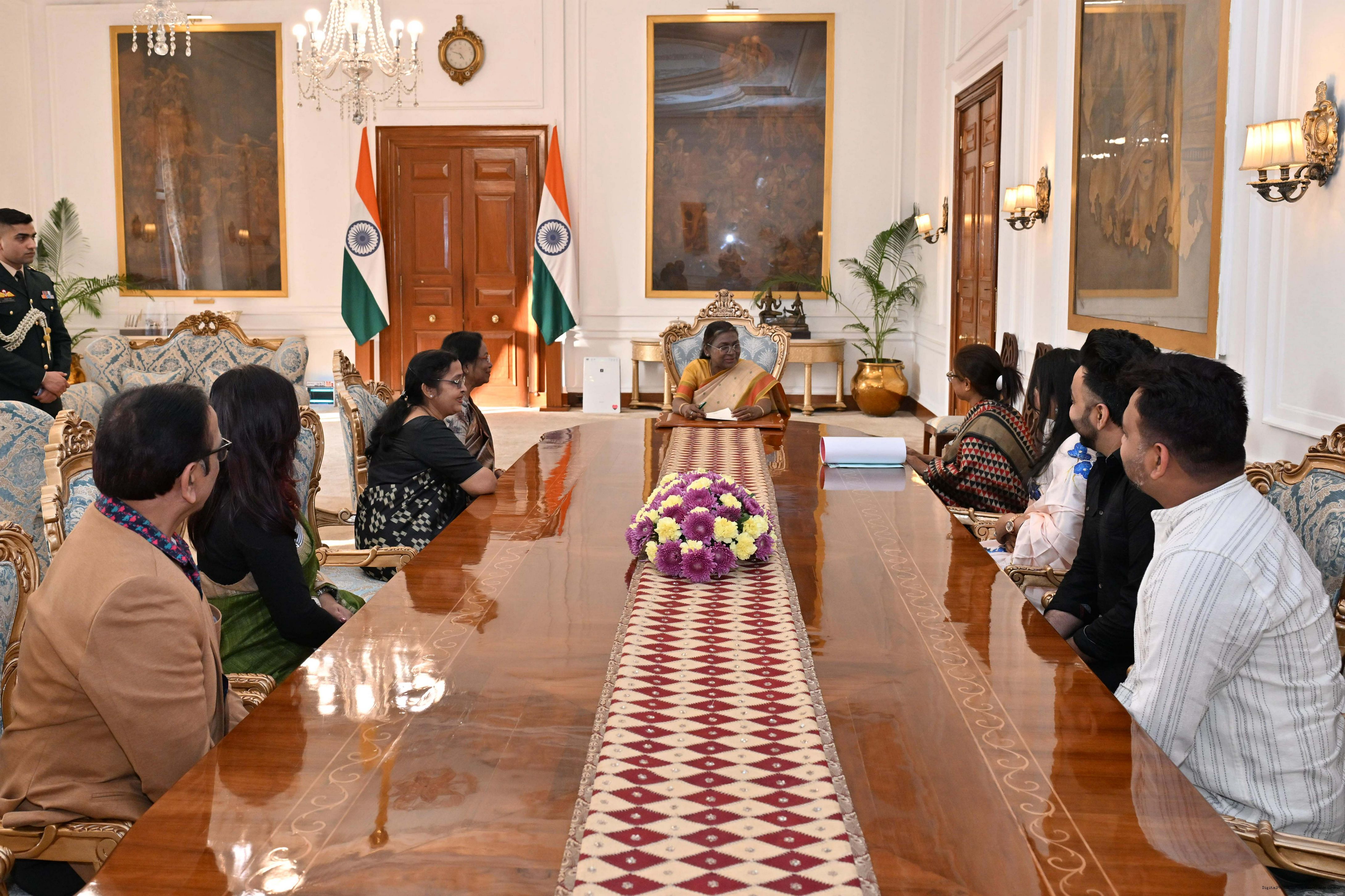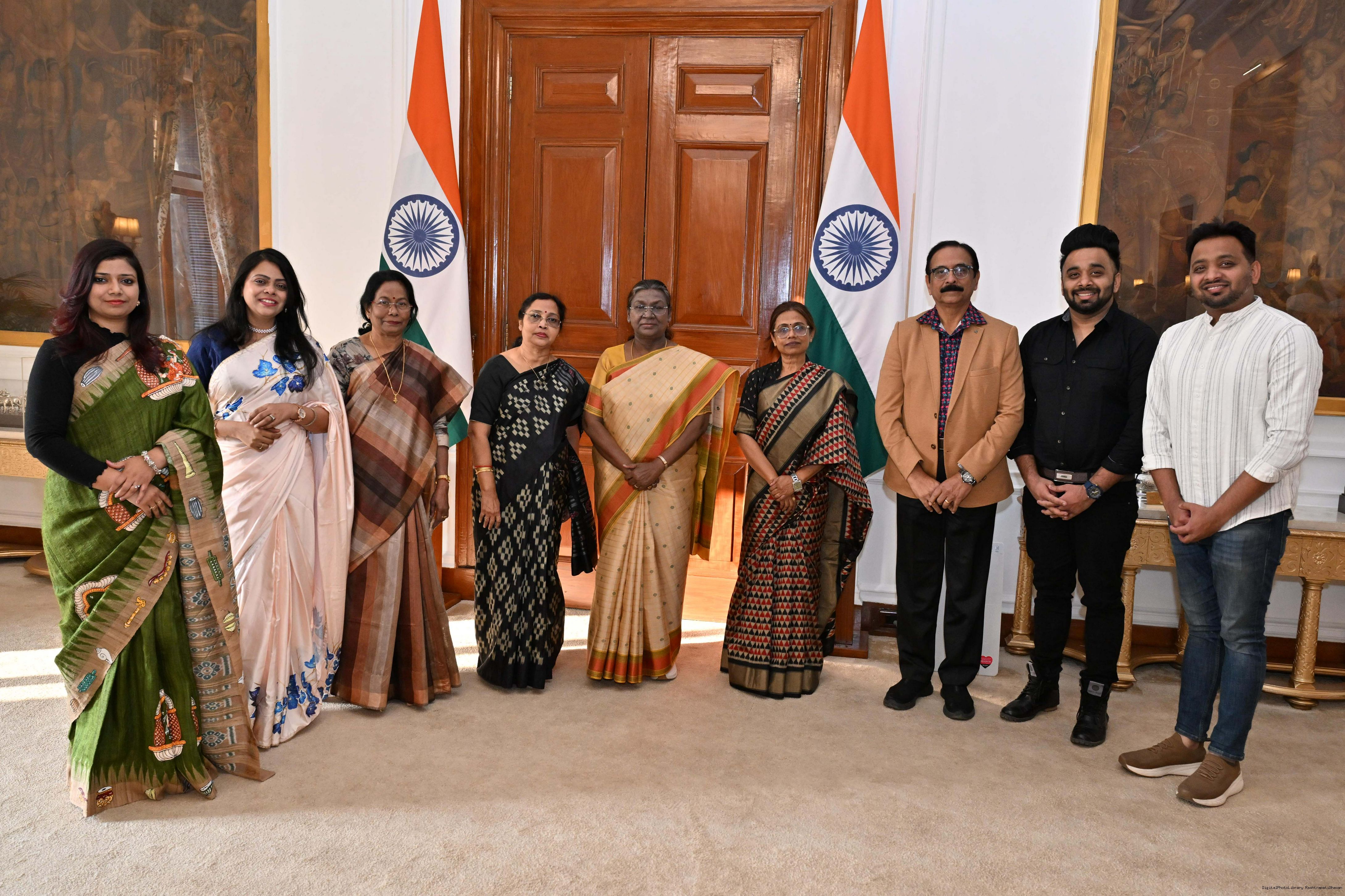 | Caption: | Ms. Suchitra Samal from Bhubaneswar along with others meeting with the President of India Smt. Droupadi Murmu at Rashtrapati Bhavan on February 3, 2025. |