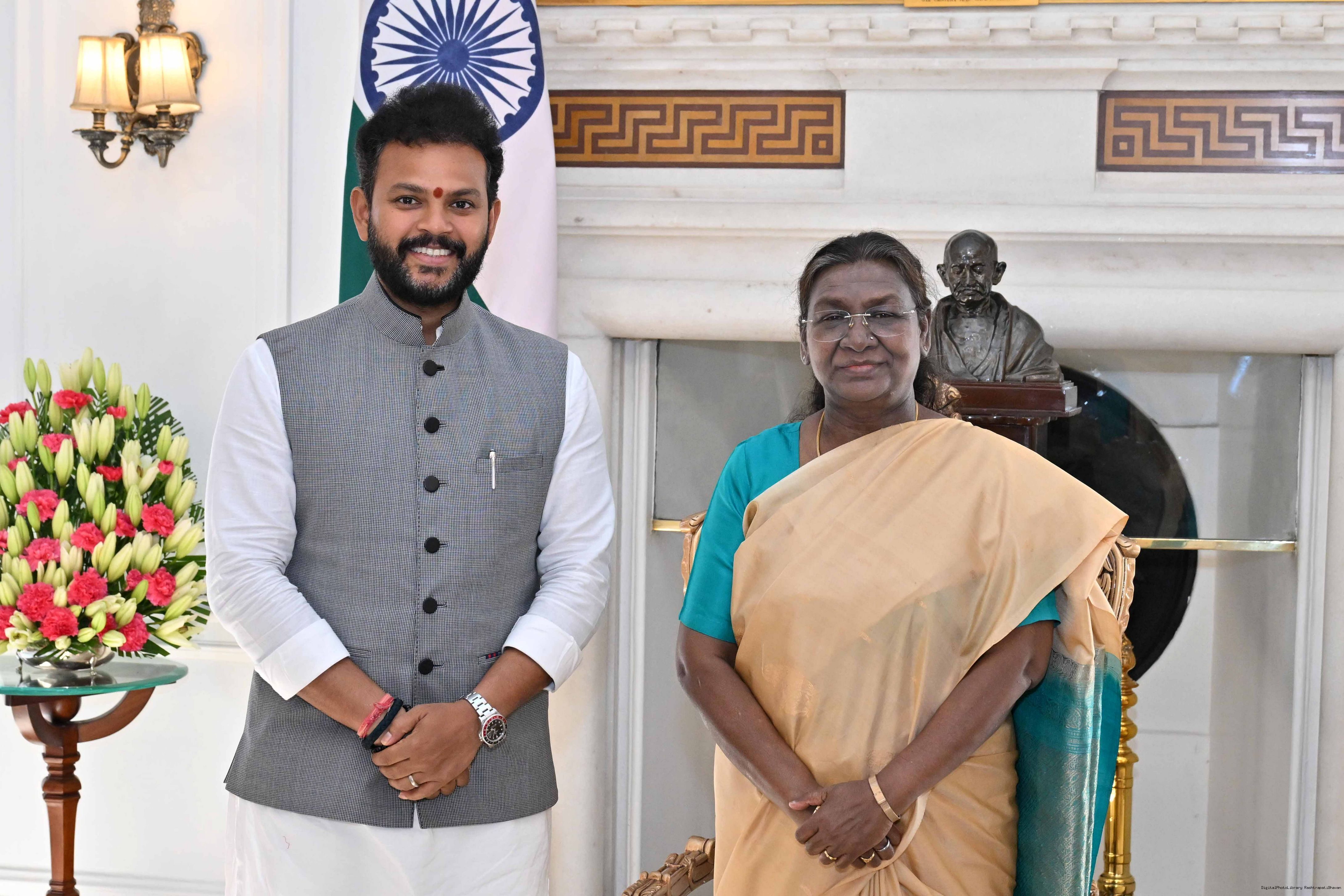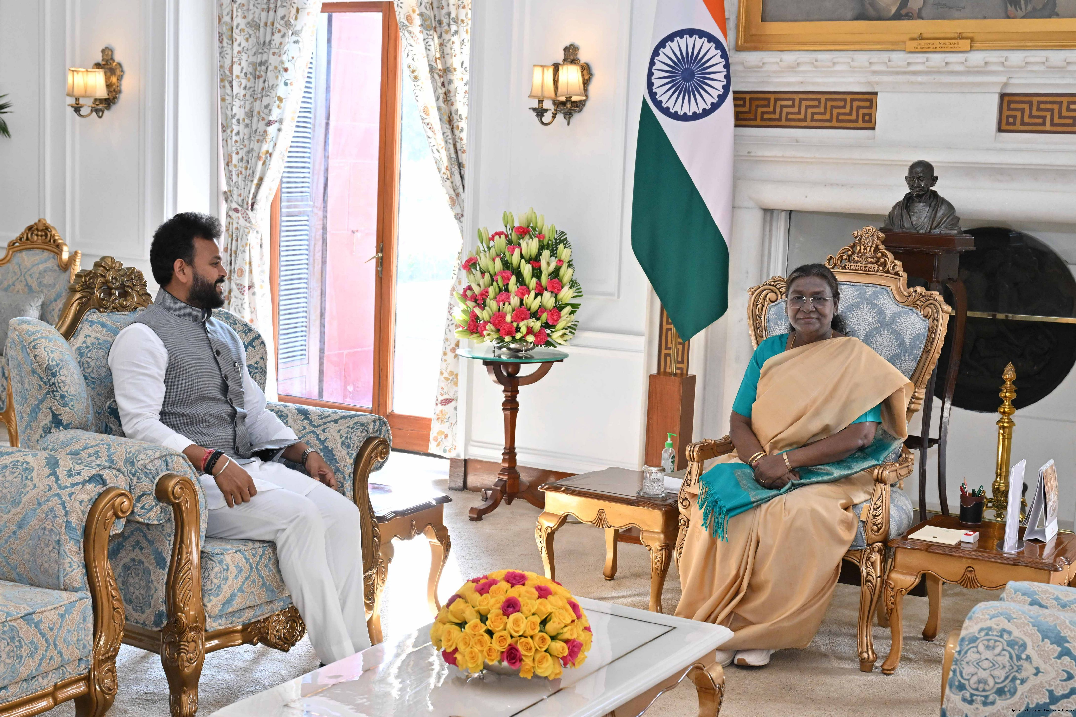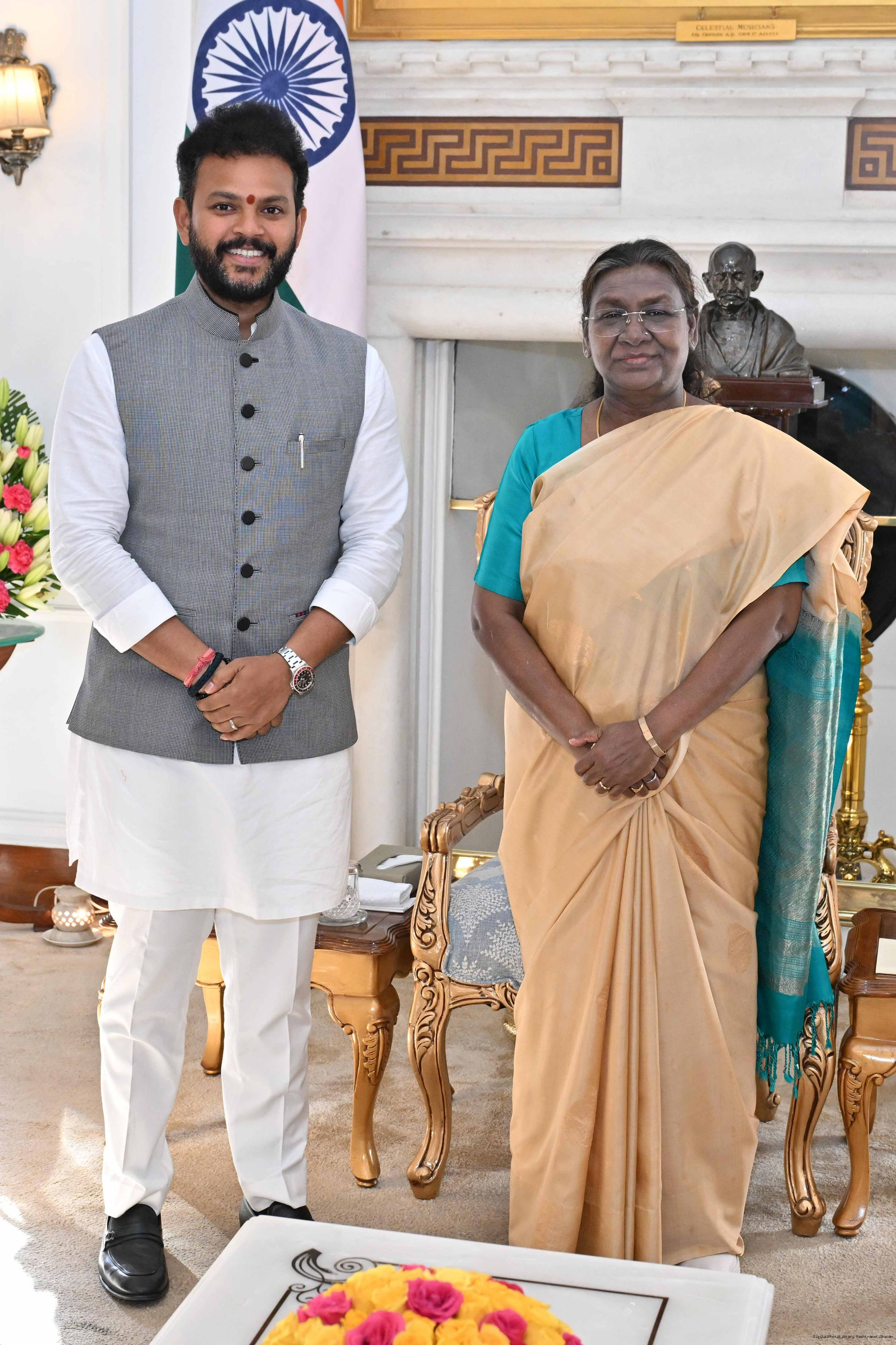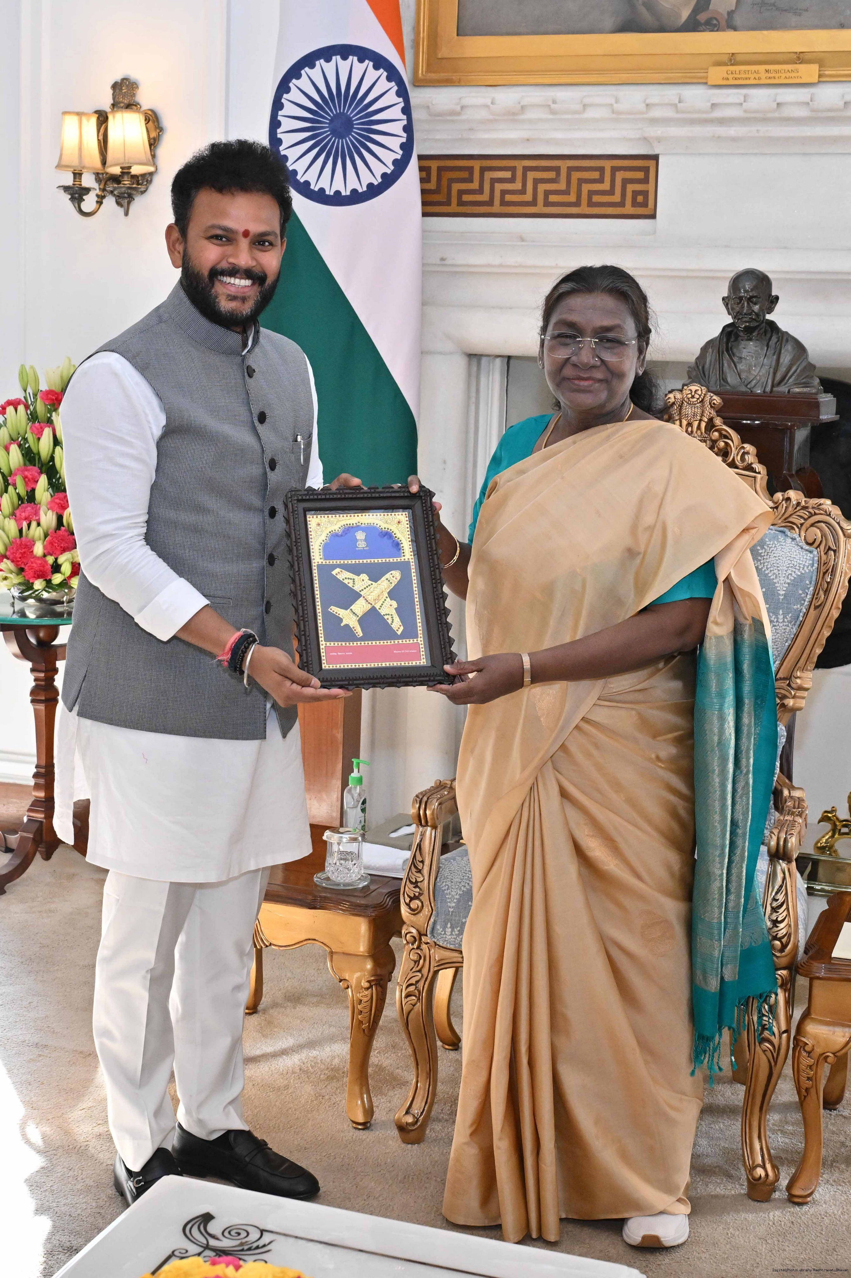 | Caption: | The Union Minister for Civil Aviation, Shri Kinjarapu Rammohan Naidu called on the President of India Smt. Droupadi Murmu at Rashtrapati Bhavan on February 7, 2025. |