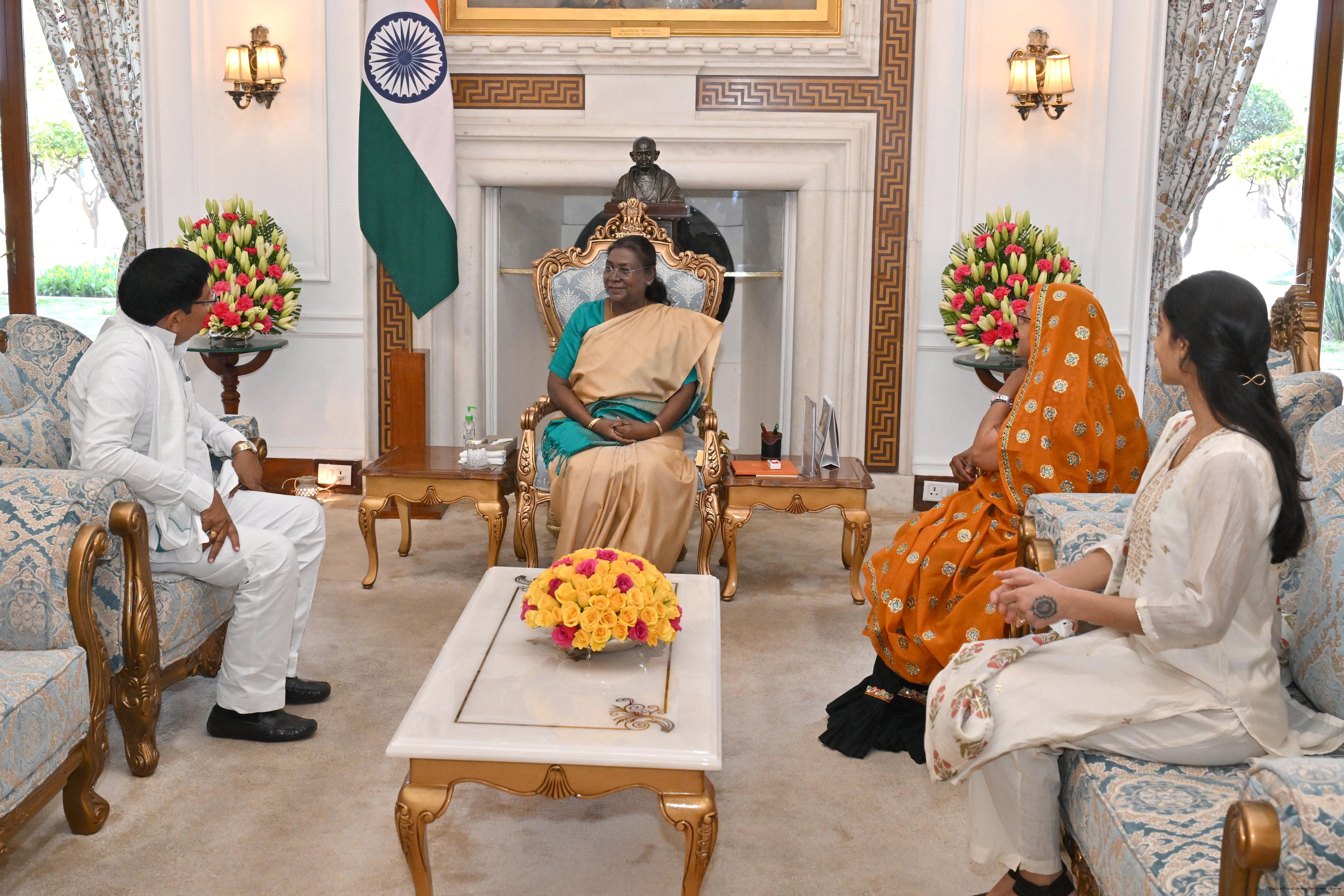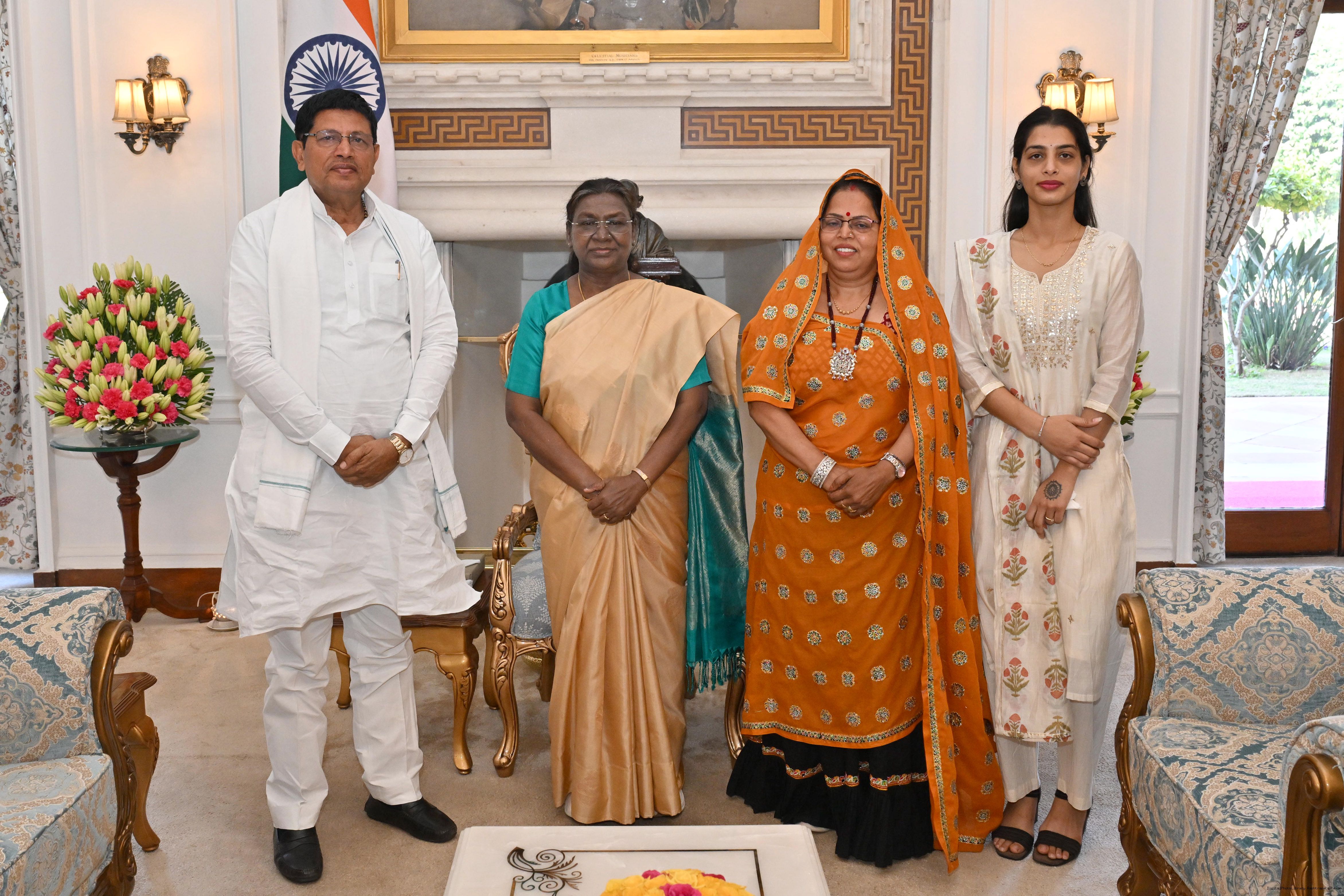 | Caption: | Shri Murari Lal Meena, Member of Parliament (Lok Sabha) from Dausa along Family Members meeting with the President of India Smt. Droupadi Murmu at Rashtrapati Bhavan on February 7, 2025. |
