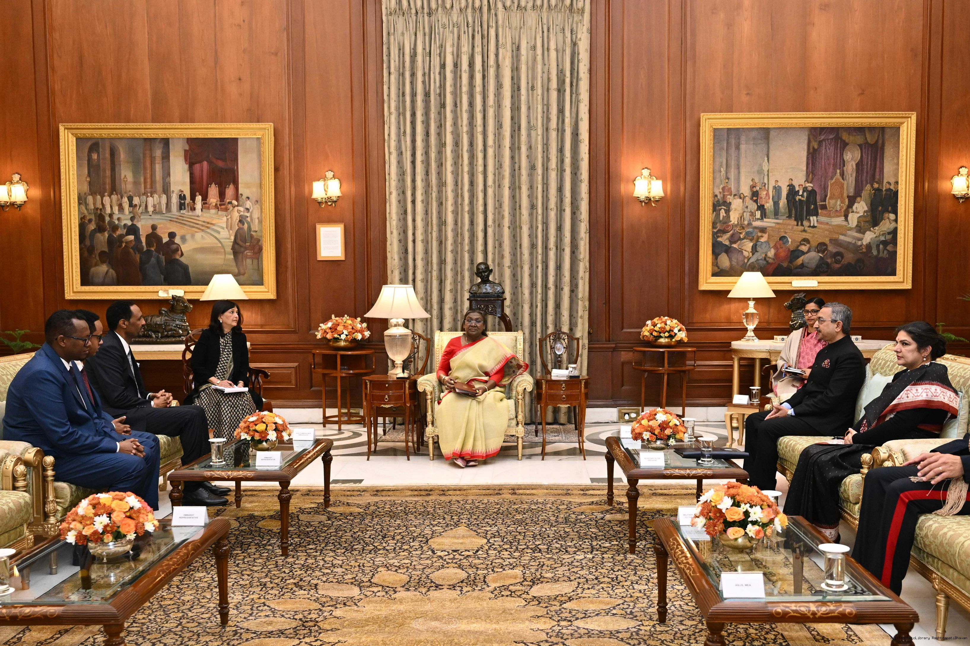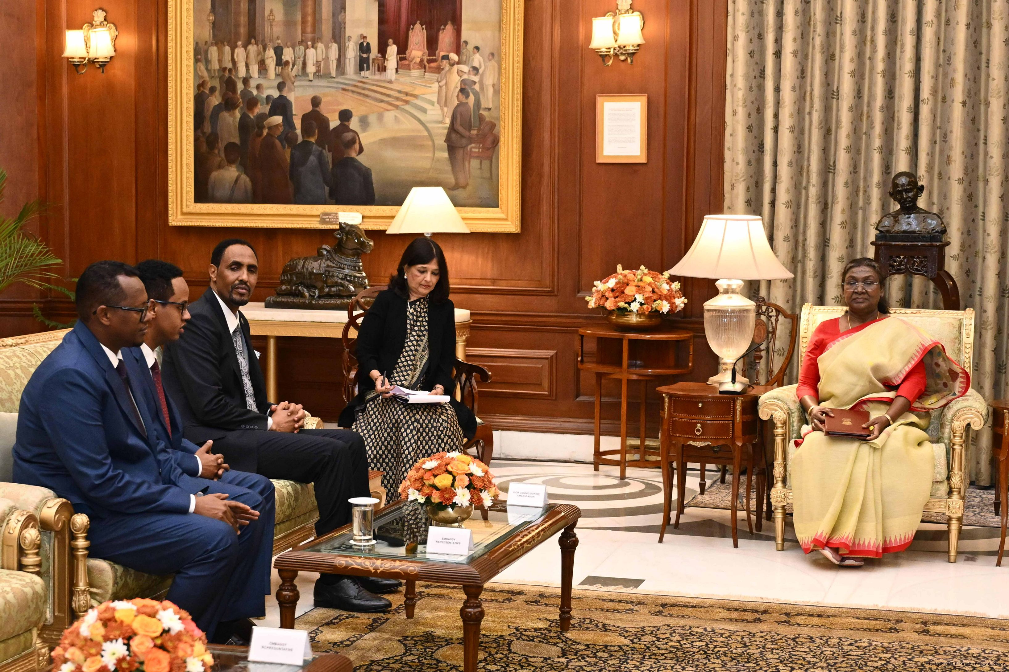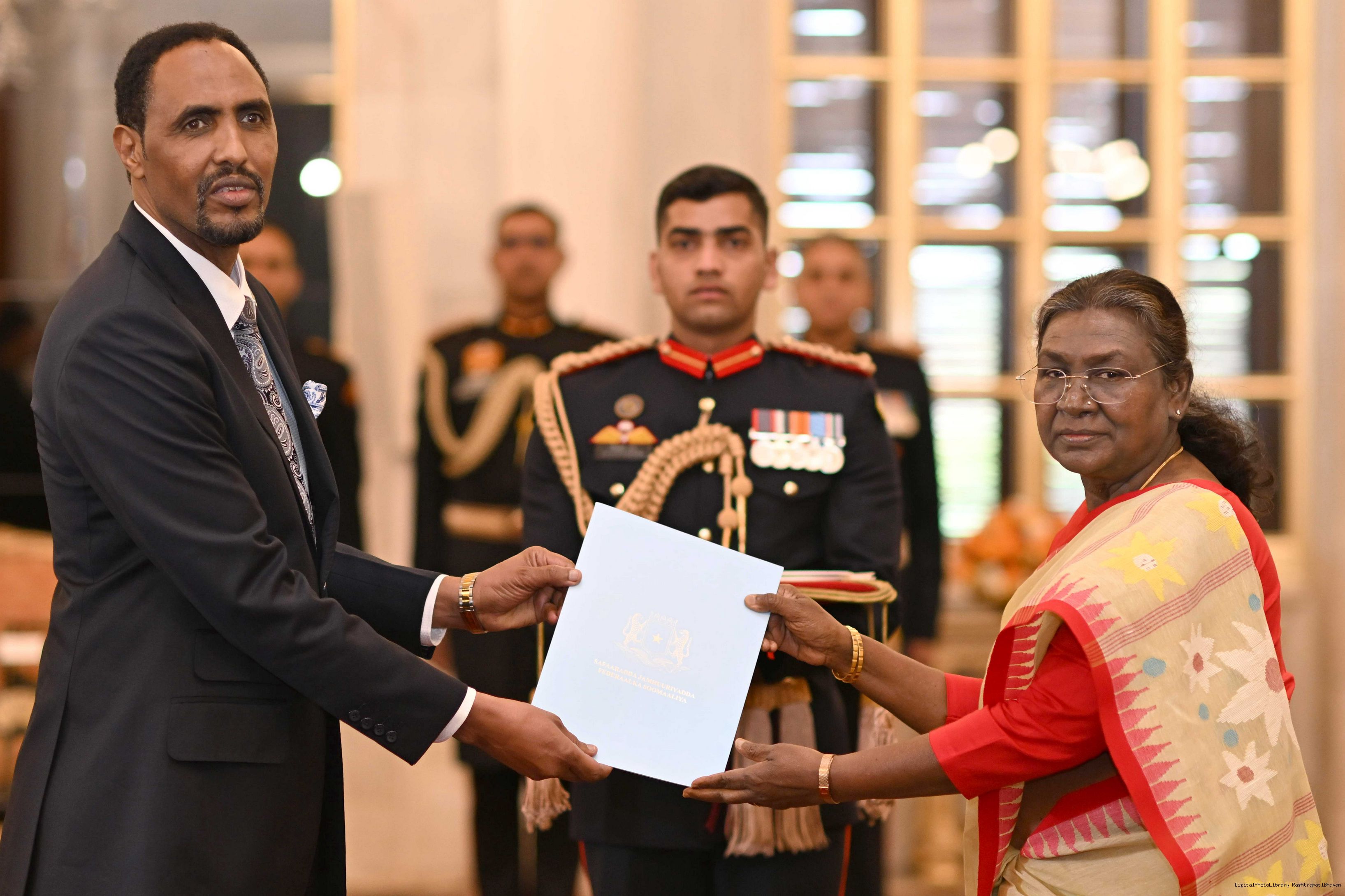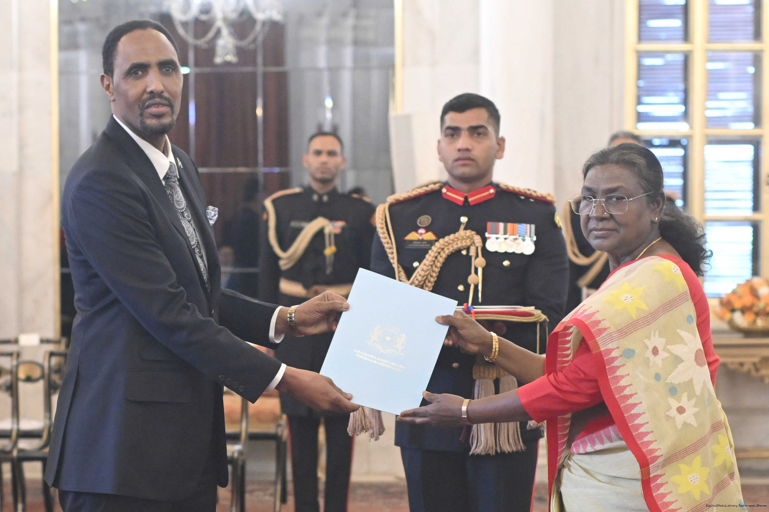 | Caption: | The Ambassador-designate of the Federal Republic of Somalla, Dr. Abdullahi Mohammed Odowa presenting his credentials to the President of India, Smt Droupadi Murmu at Ashok Hall of Rashtrapati Bhavan in New Delhi on February 17, 2025. |