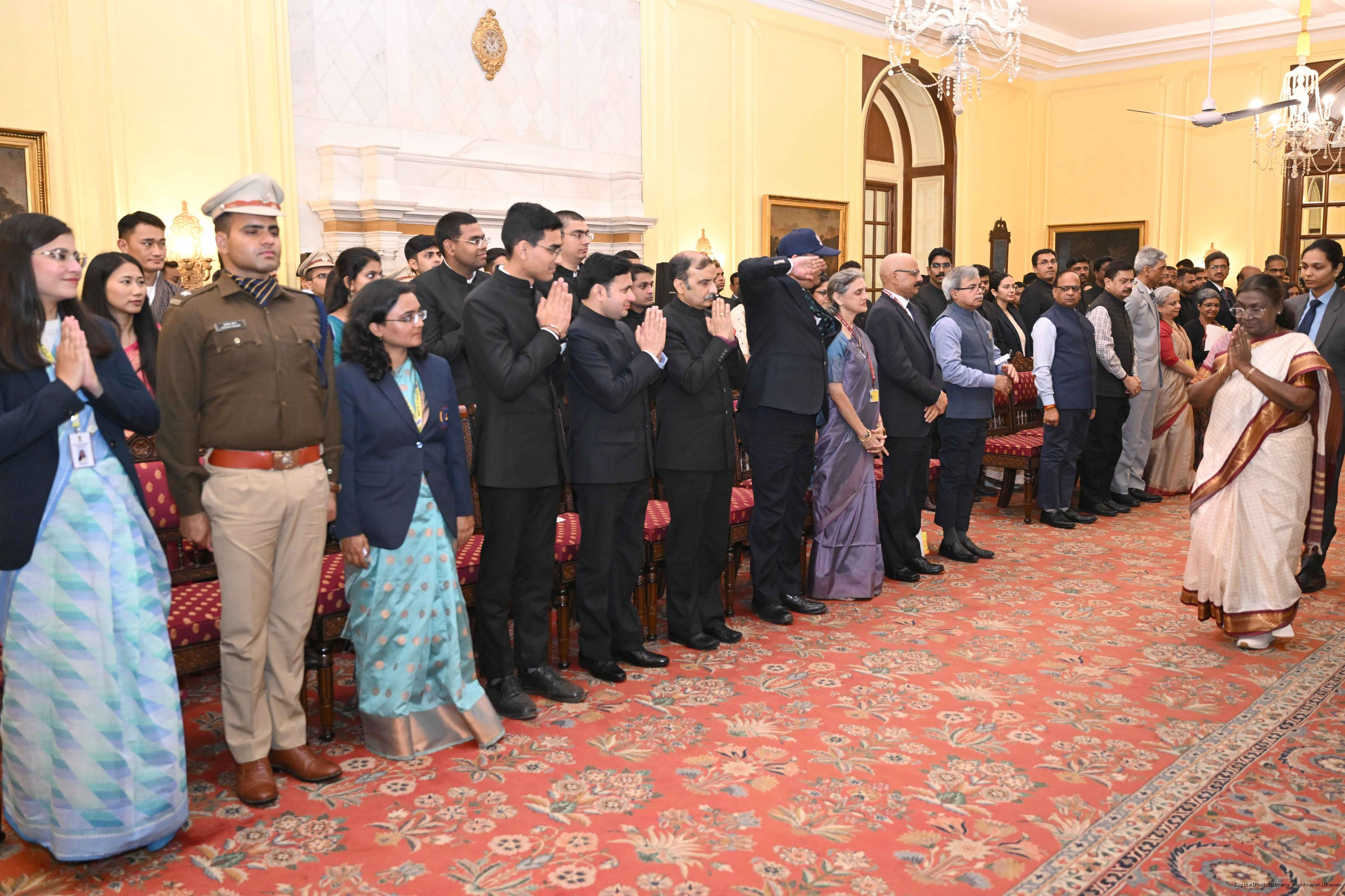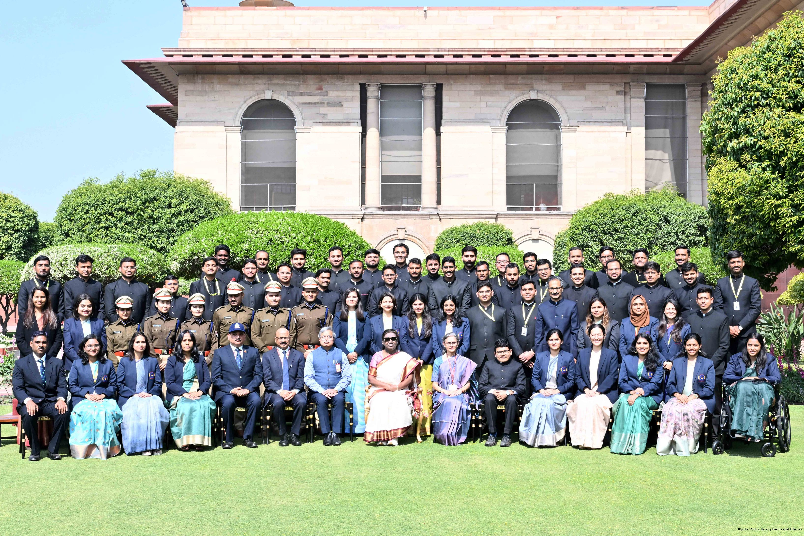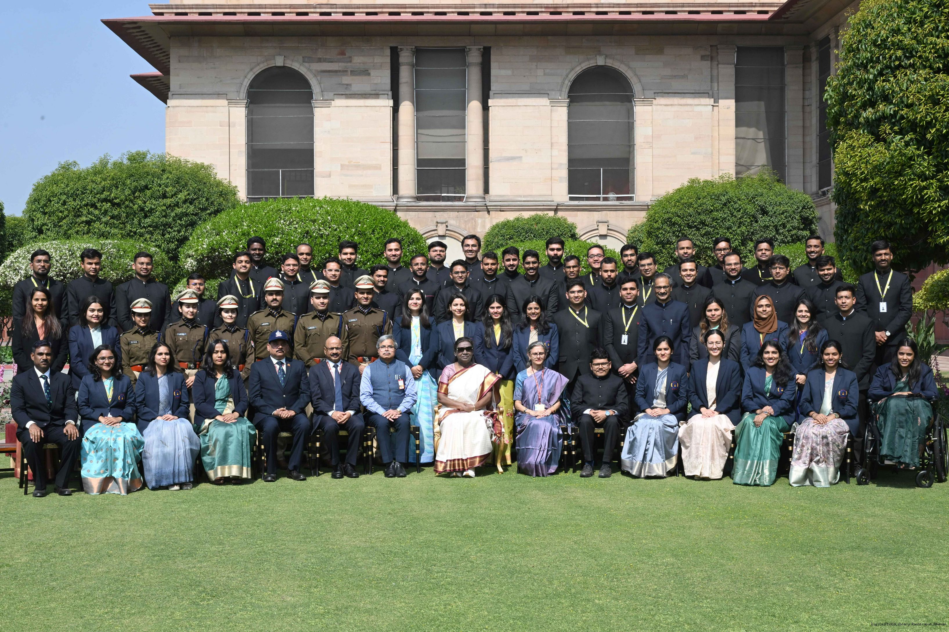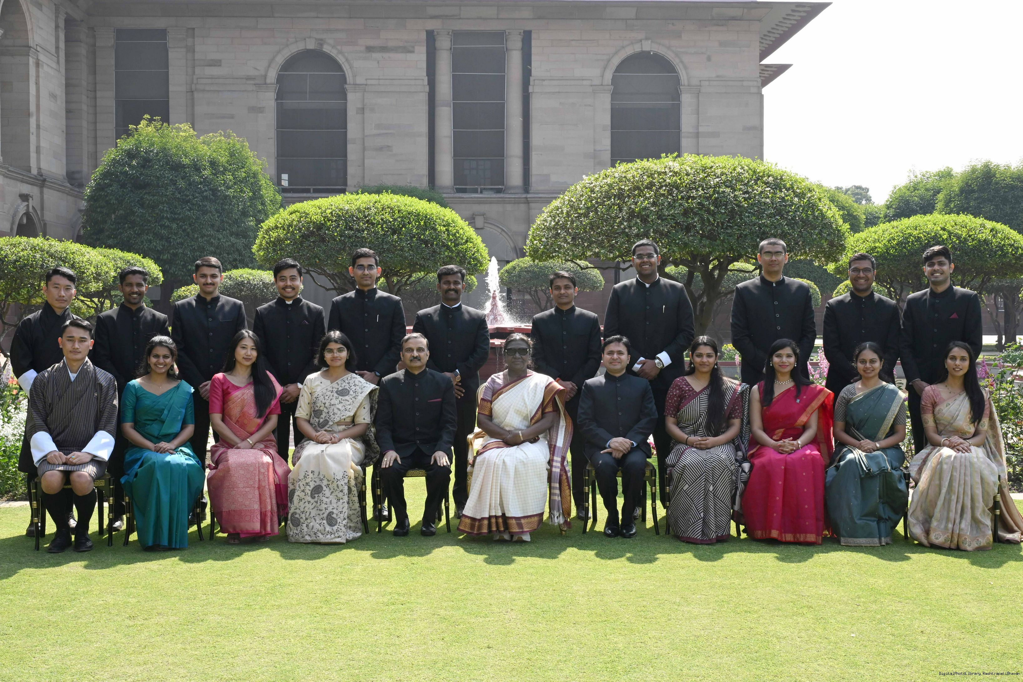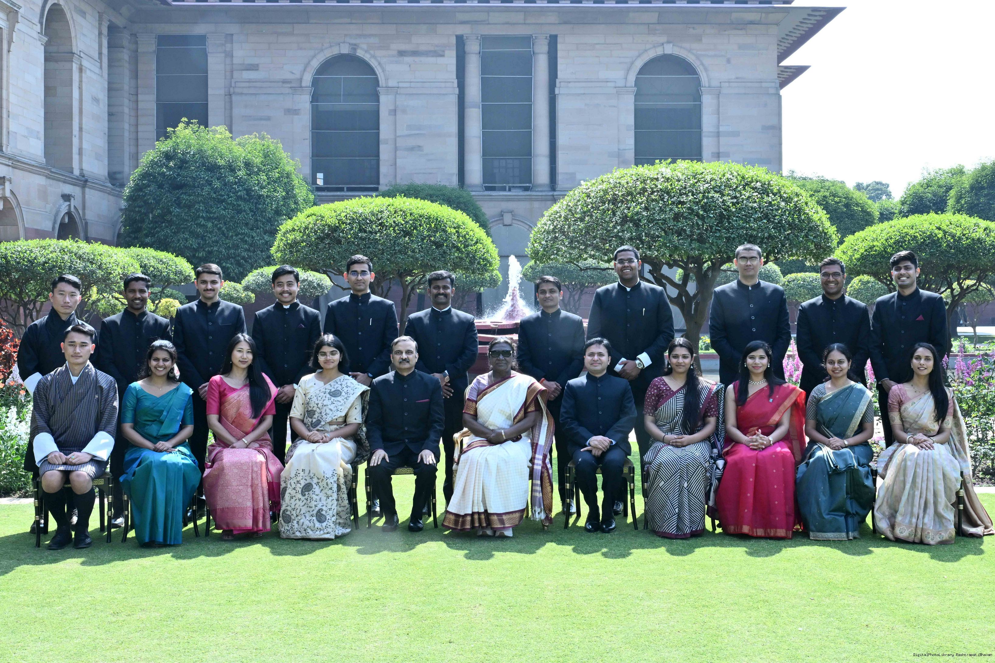| Caption: | A group of officer trainees of Indian Audit and Accounts Service, Indian Railway Protection Force Service, Indian Railway Management Service (Accounts) and Indian Railway Management Service (Traffic) called on the President of India, Smt Droupadi Murmu at Rashtrapati Bhavan on February 24, 2025. |