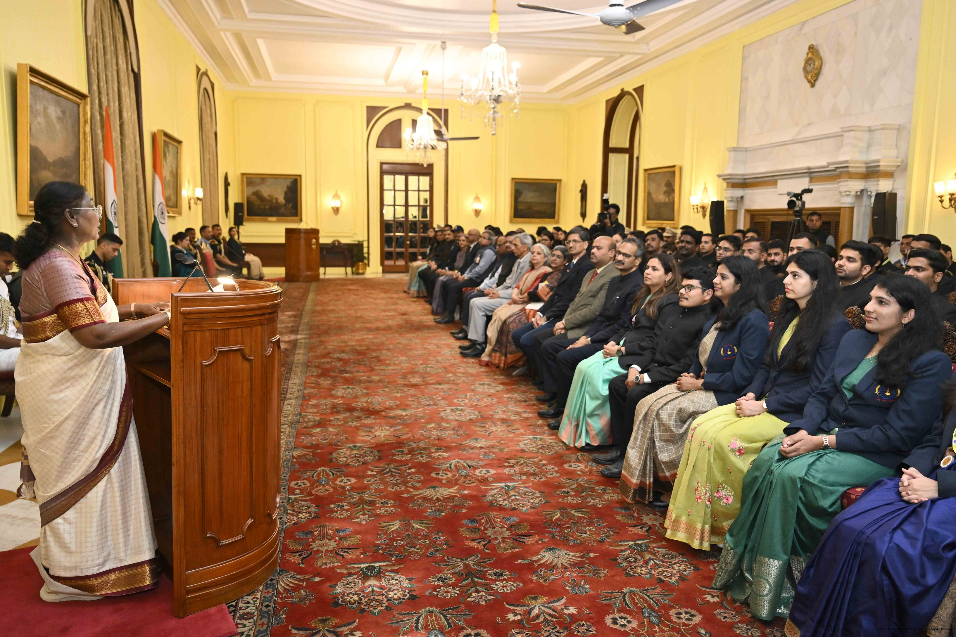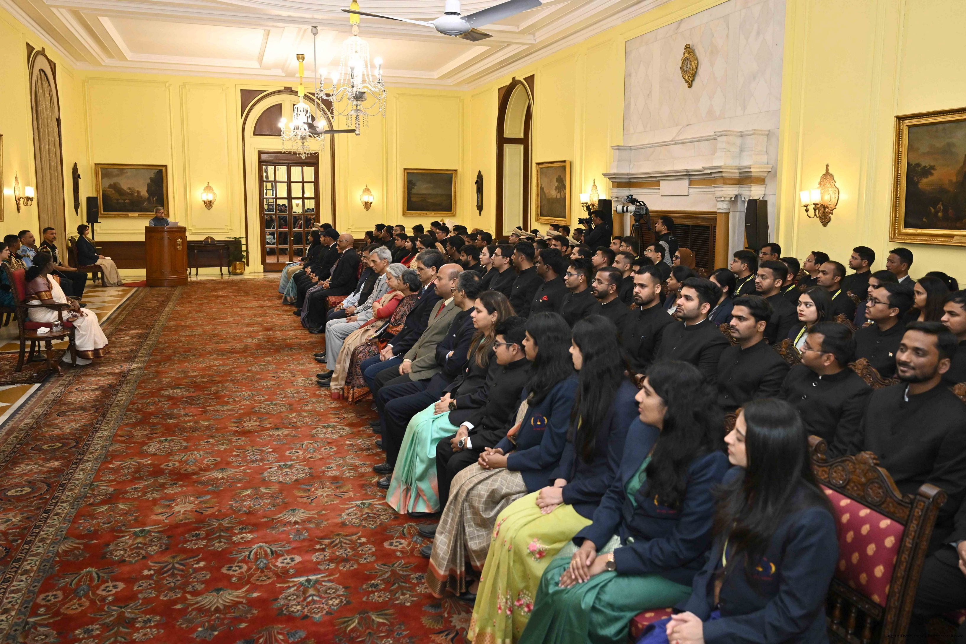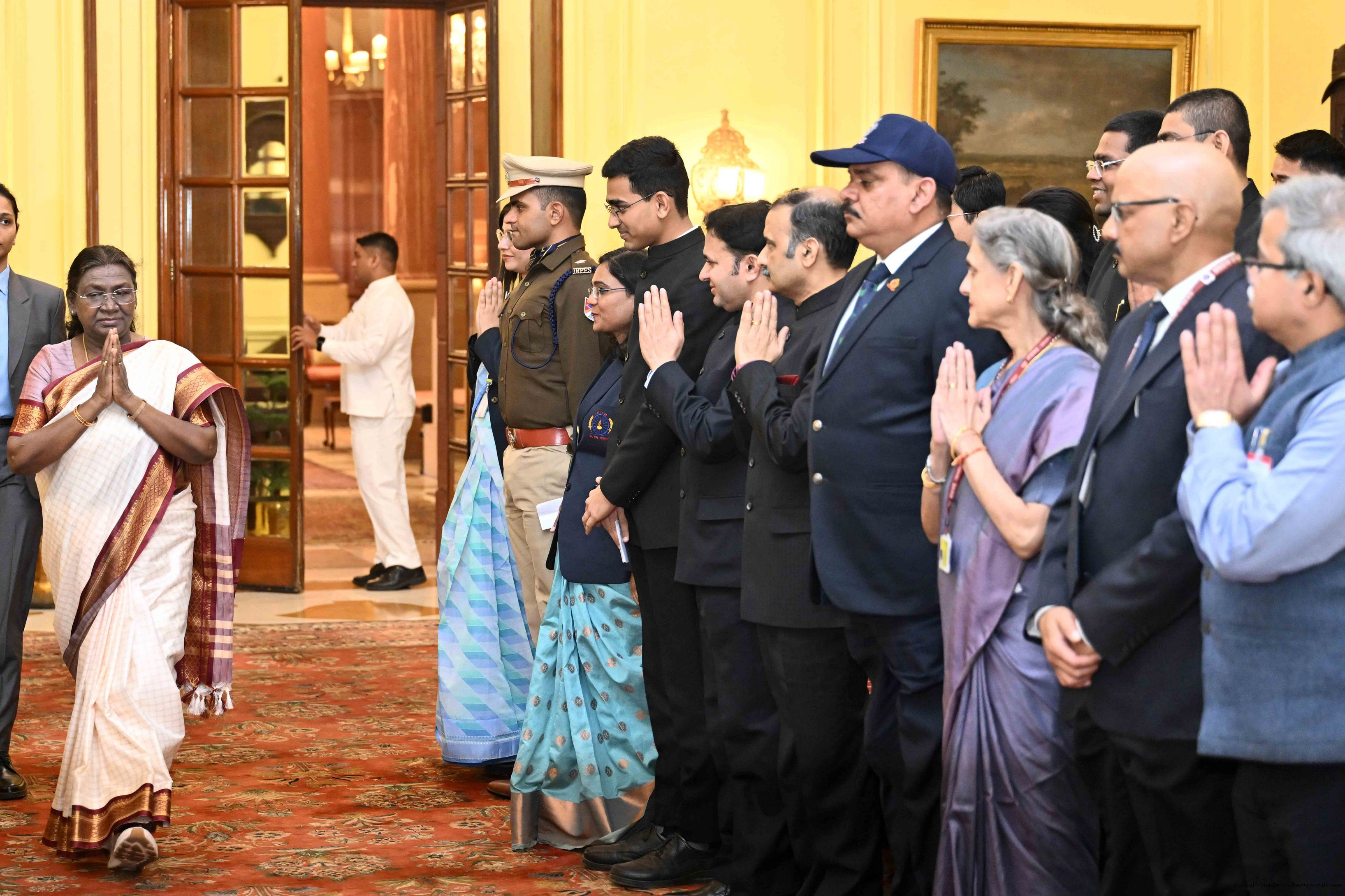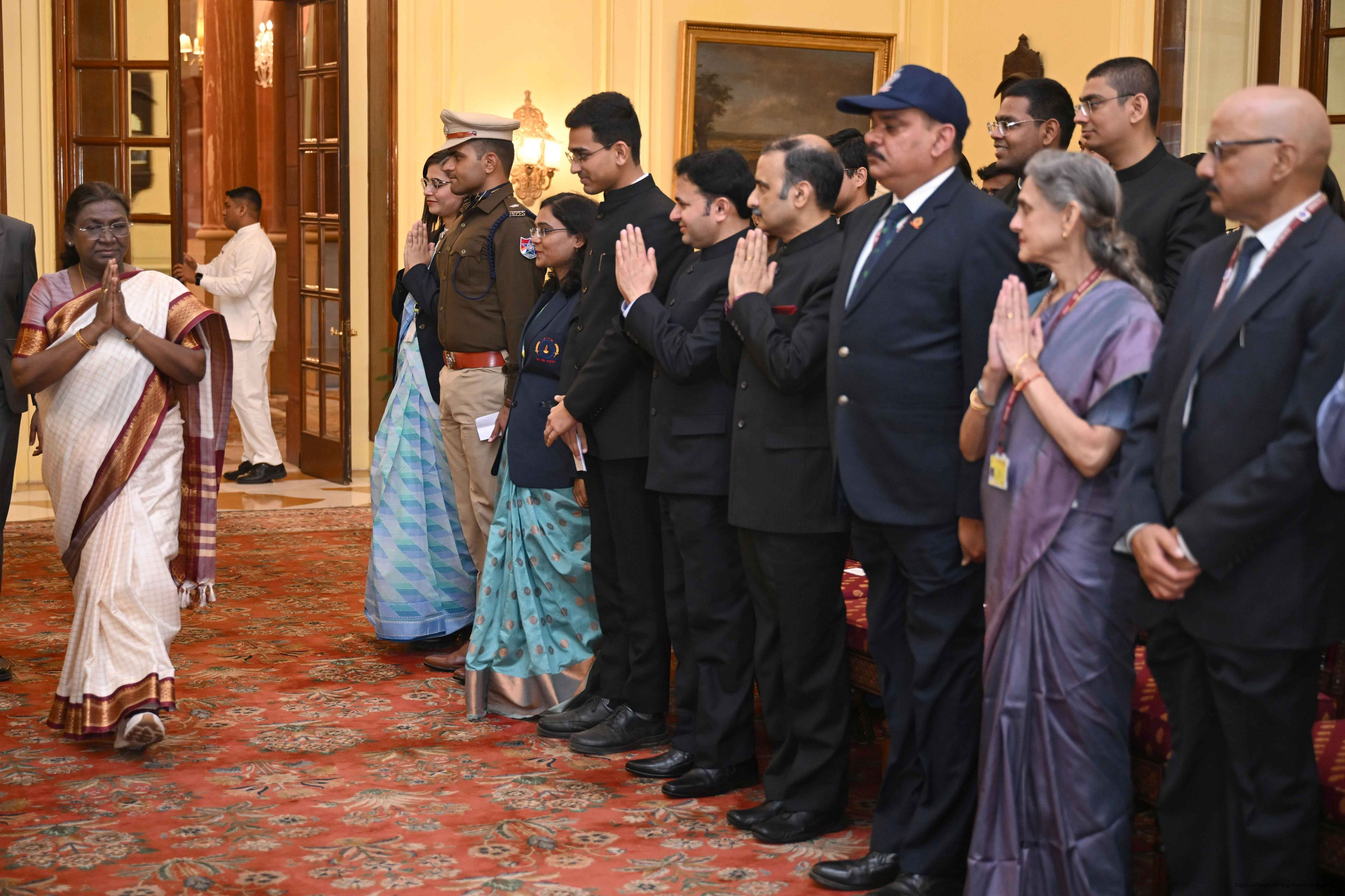 | Caption: | A group of officer trainees of Indian Audit and Accounts Service, Indian Railway Protection Force Service, Indian Railway Management Service (Accounts) and Indian Railway Management Service (Traffic) called on the President of India, Smt Droupadi Murmu at Rashtrapati Bhavan on February 24, 2025. |
