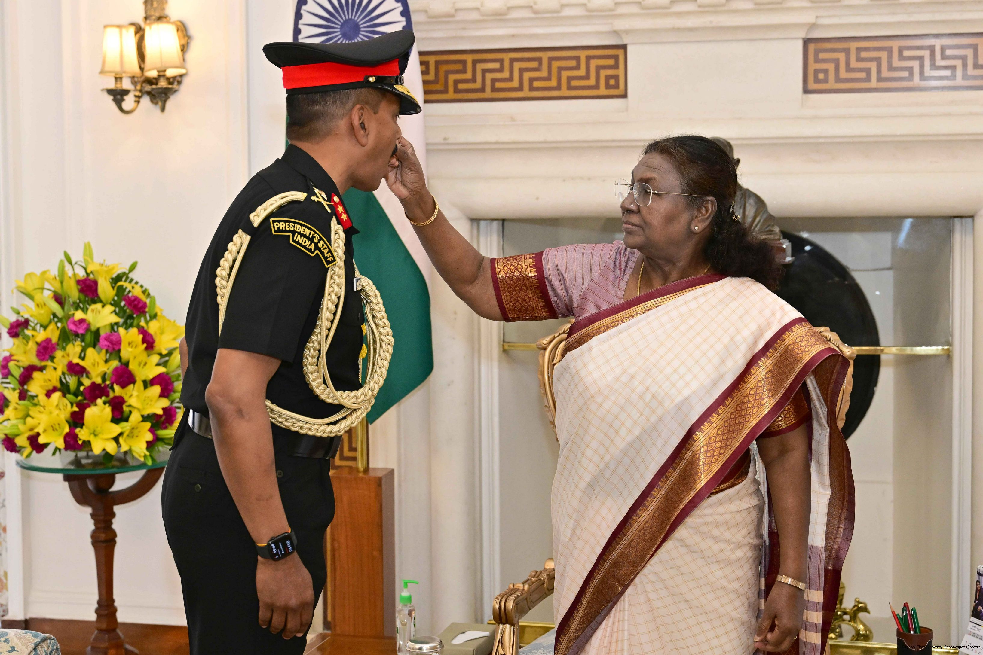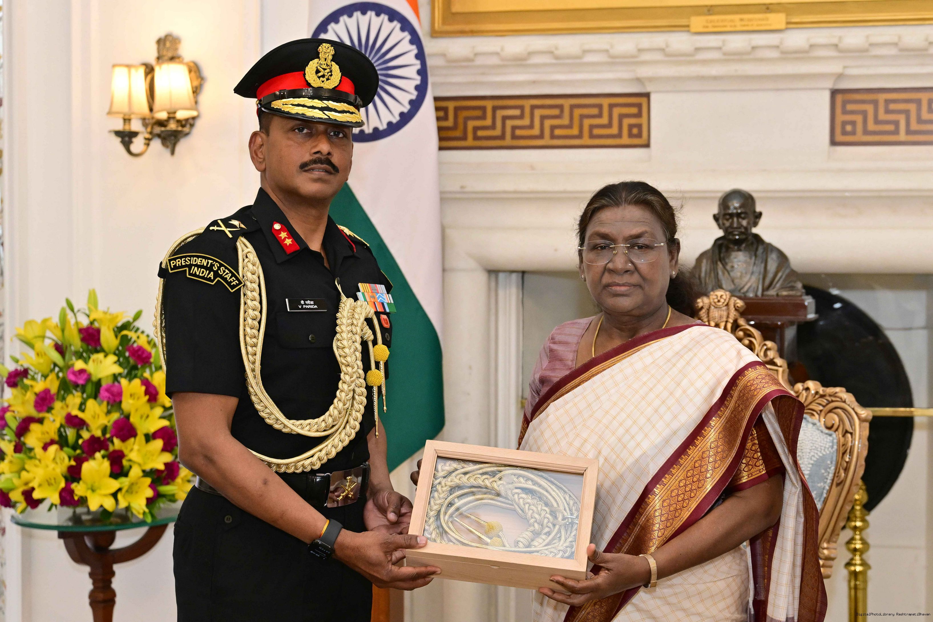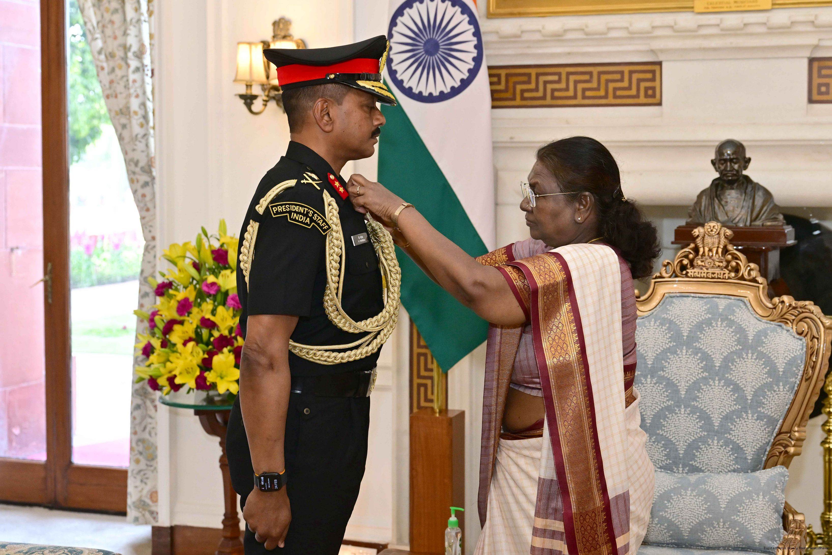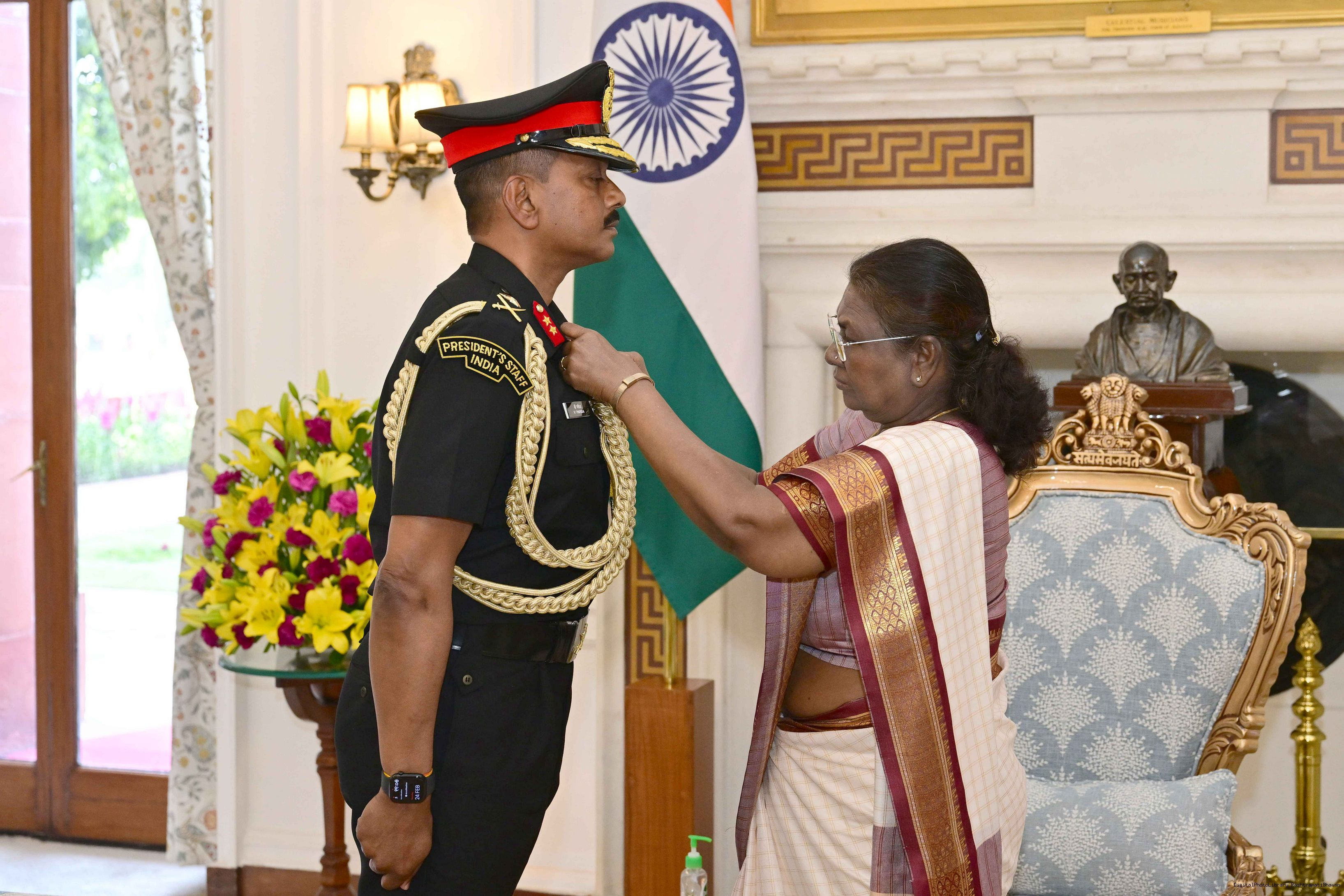 | Caption: | The President of India, Smt Droupadi Murmu presents the aiguillette to Maj Gen Voodev Parida, VSM, Military Secretary to the President at Rashtrapati Bhavan on February 24, 2025. |