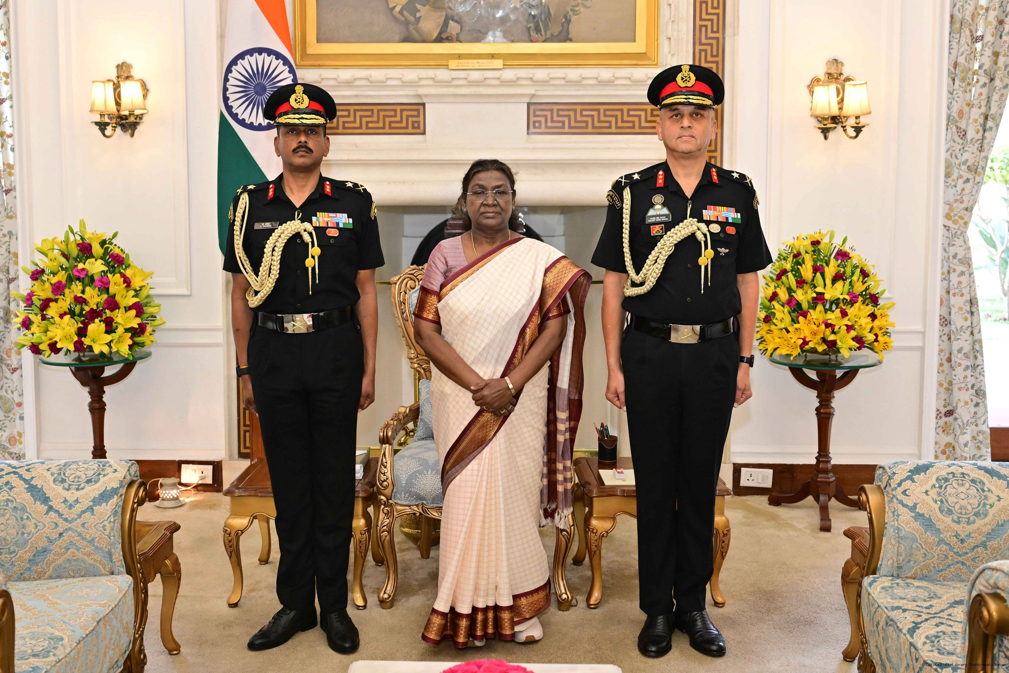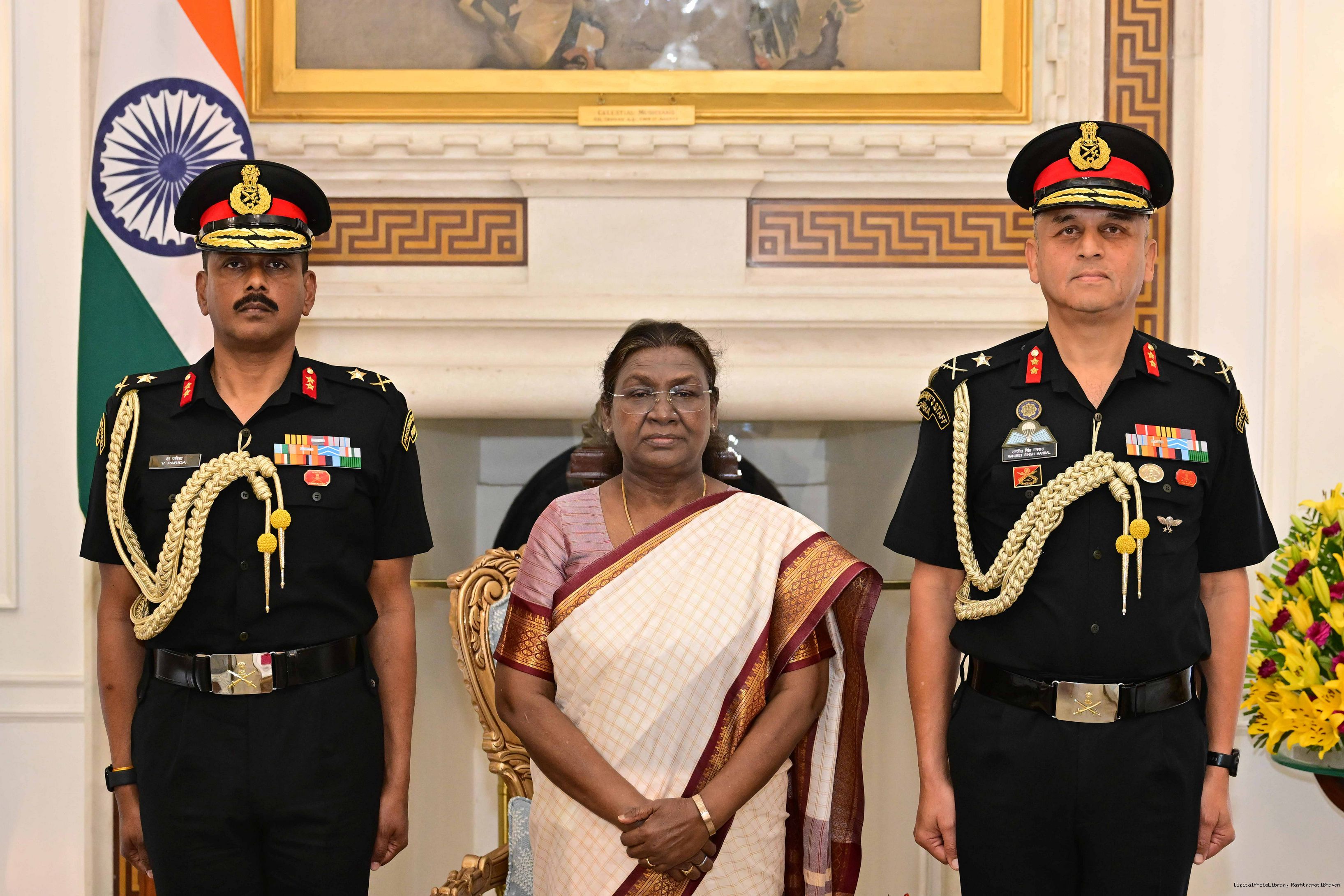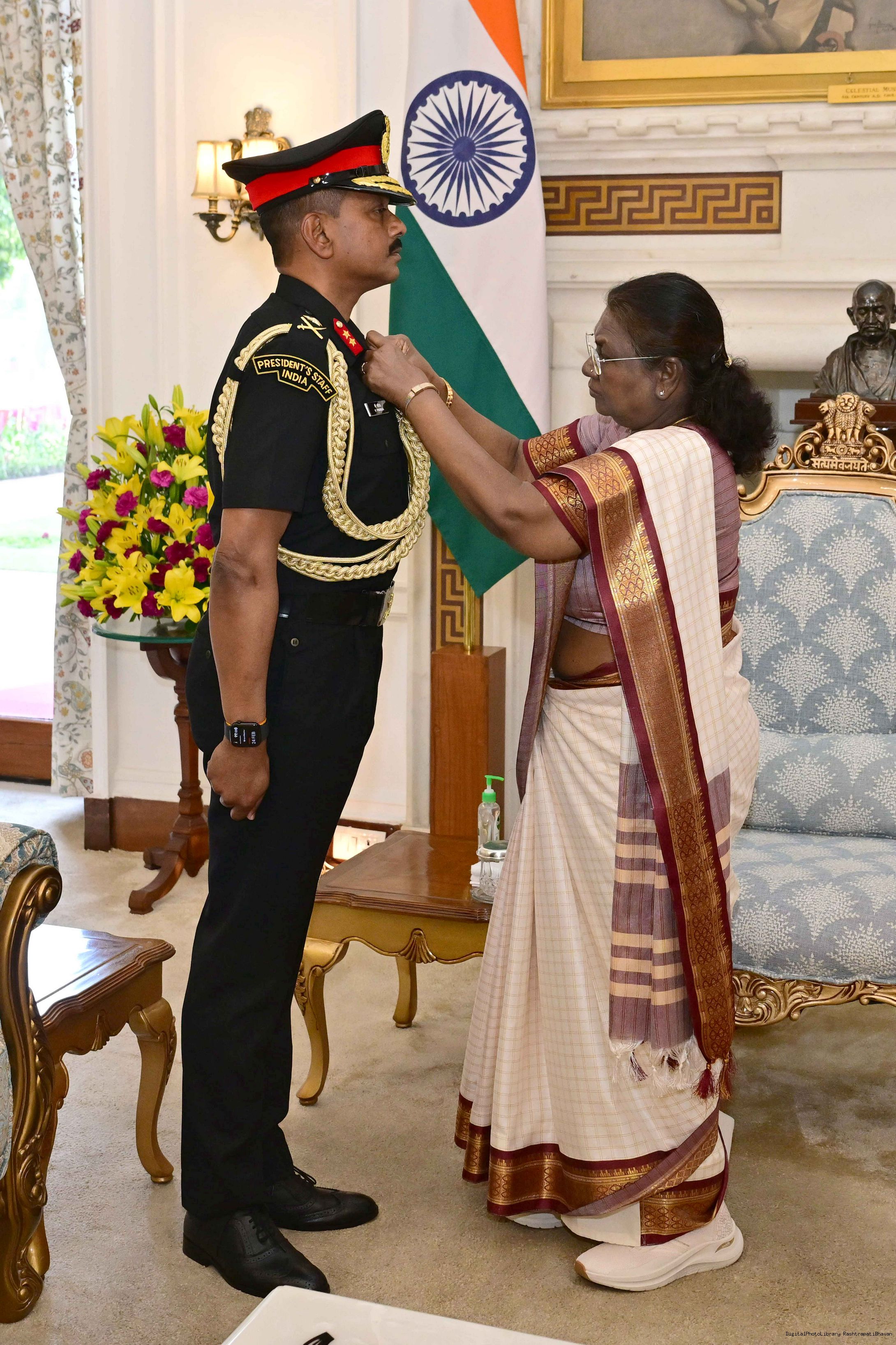 | Caption: | The President of India, Smt Droupadi Murmu presents the aiguillette to Maj Gen Voodev Parida, VSM, Military Secretary to the President at Rashtrapati Bhavan on February 24, 2025. |