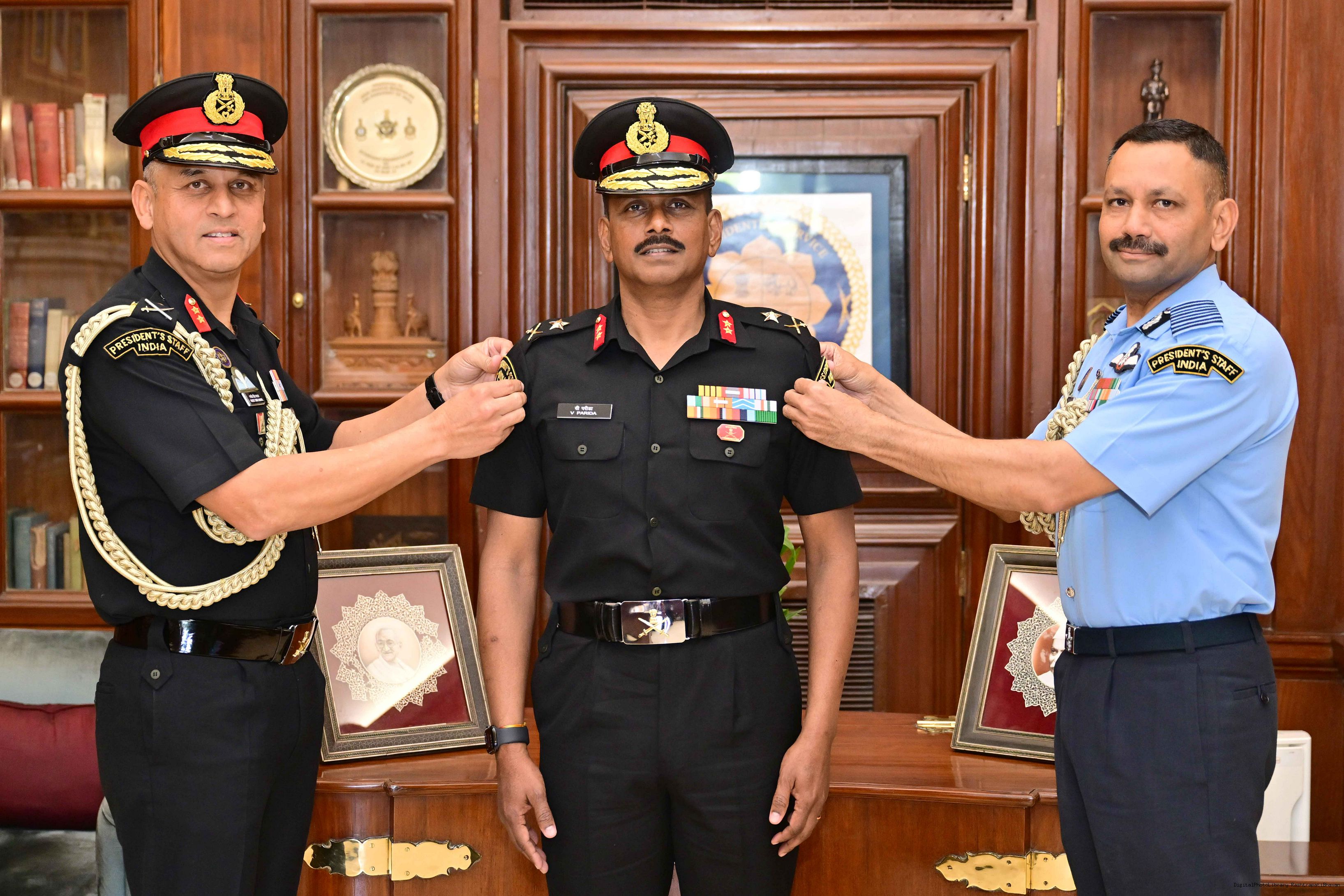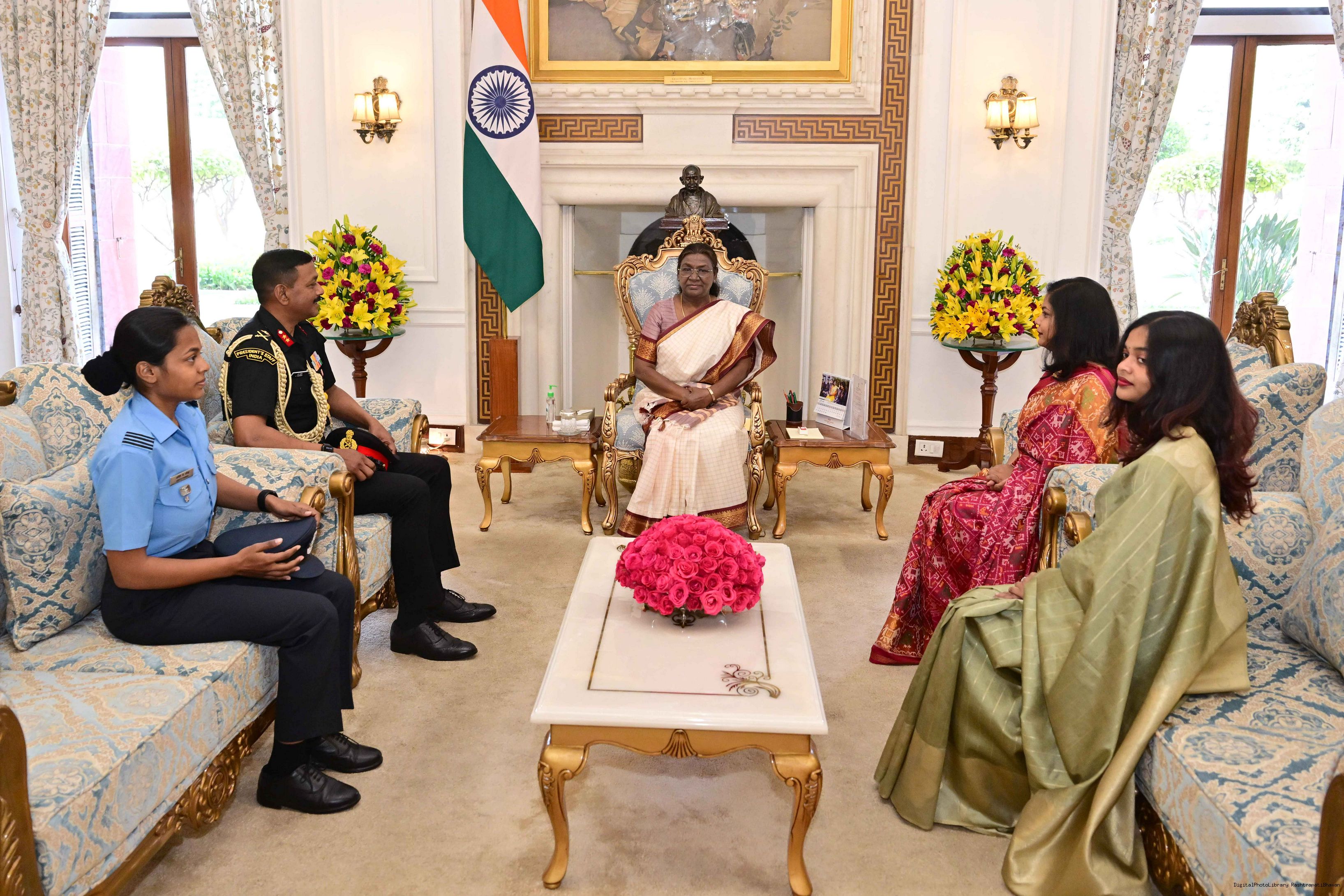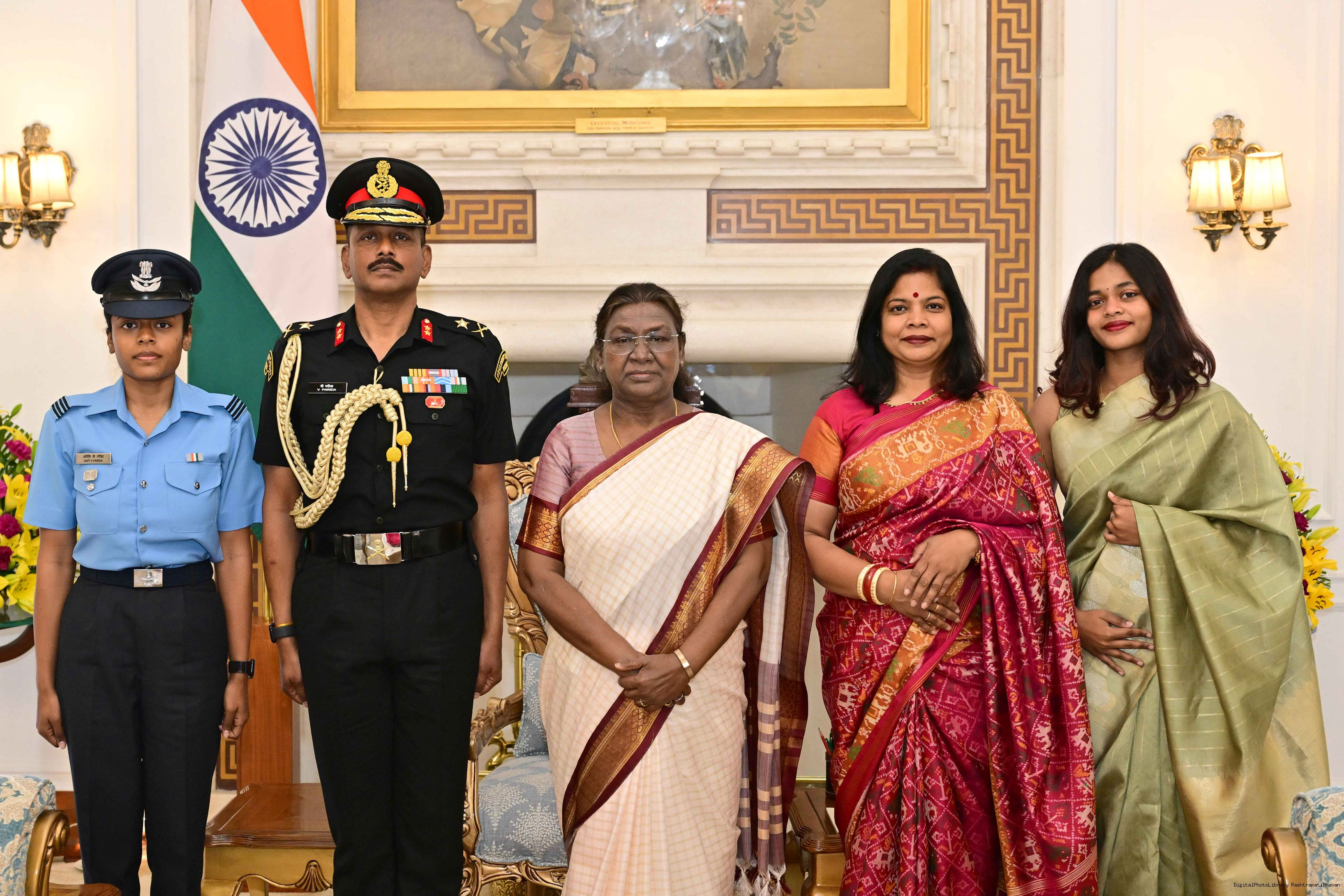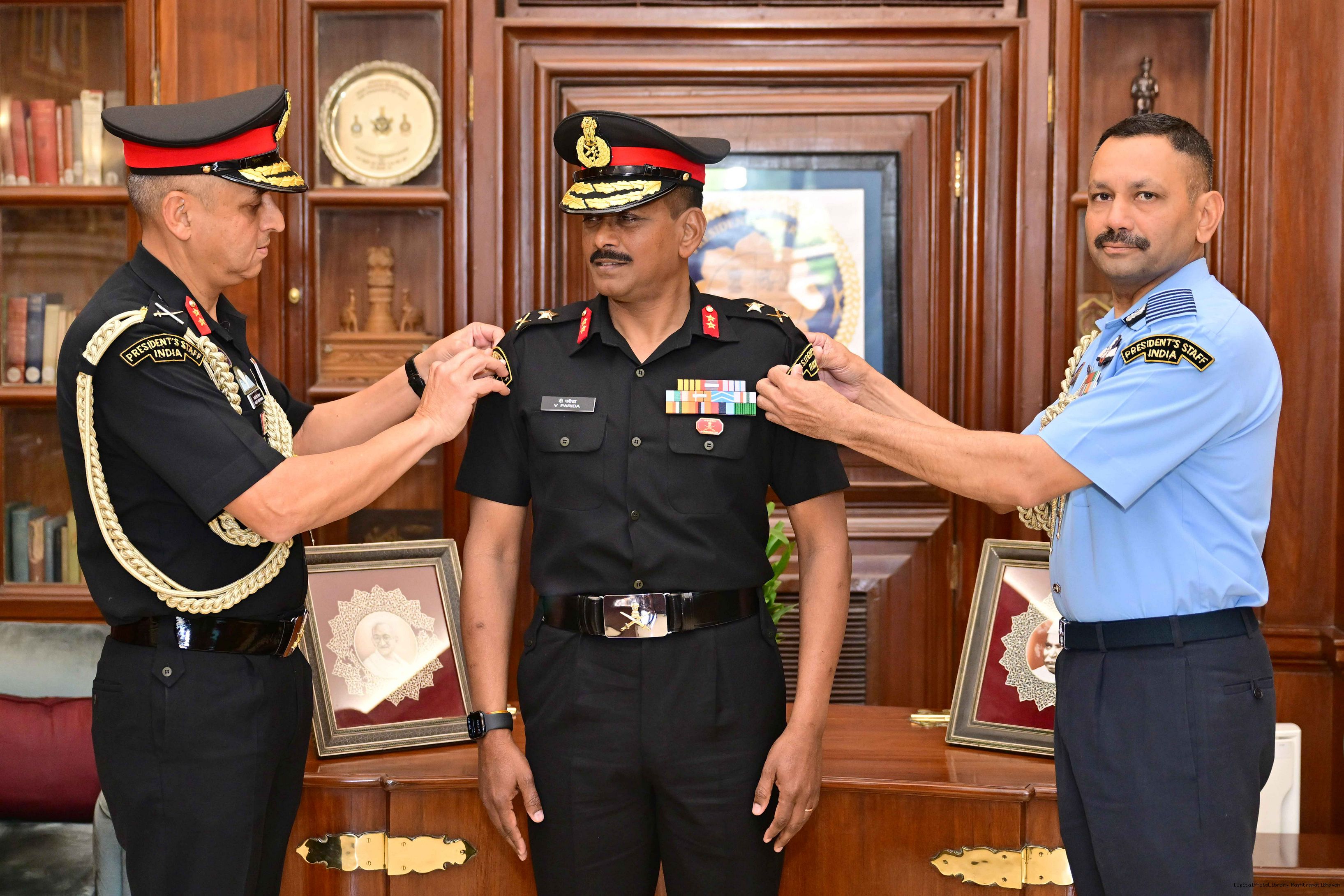| Caption: | The President of India, Smt Droupadi Murmu presents the aiguillette to Maj Gen Voodev Parida, VSM, Military Secretary to the President at Rashtrapati Bhavan on February 24, 2025. |