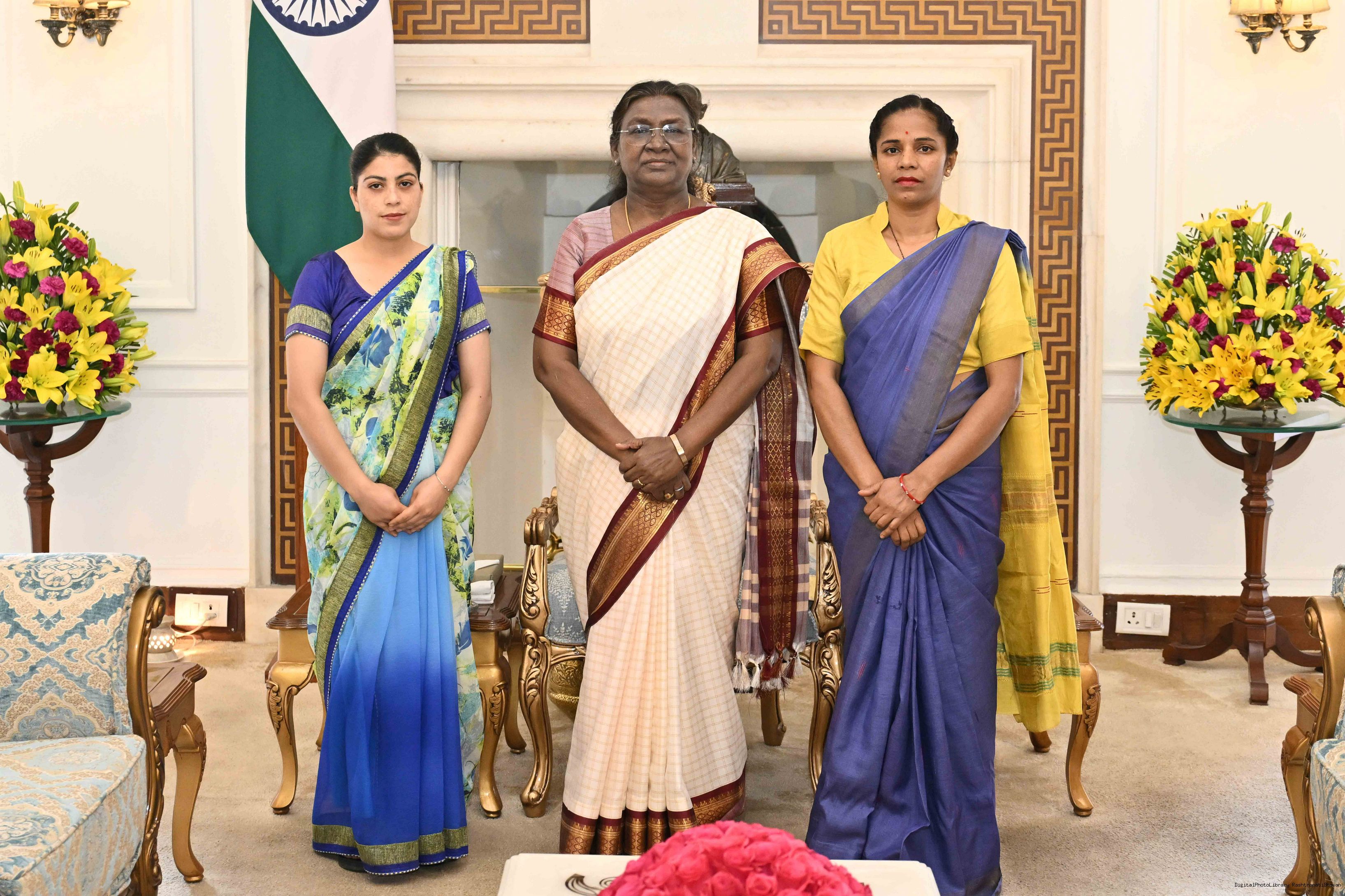 | Caption: | Ms. Kiran Singh and Ms. Jyothi, Therapists from Patanjali Yogapeeth meeting with the President of India Smt. Droupadi Murmu at Rashtrapati Bhavan on February 24, 2025. |