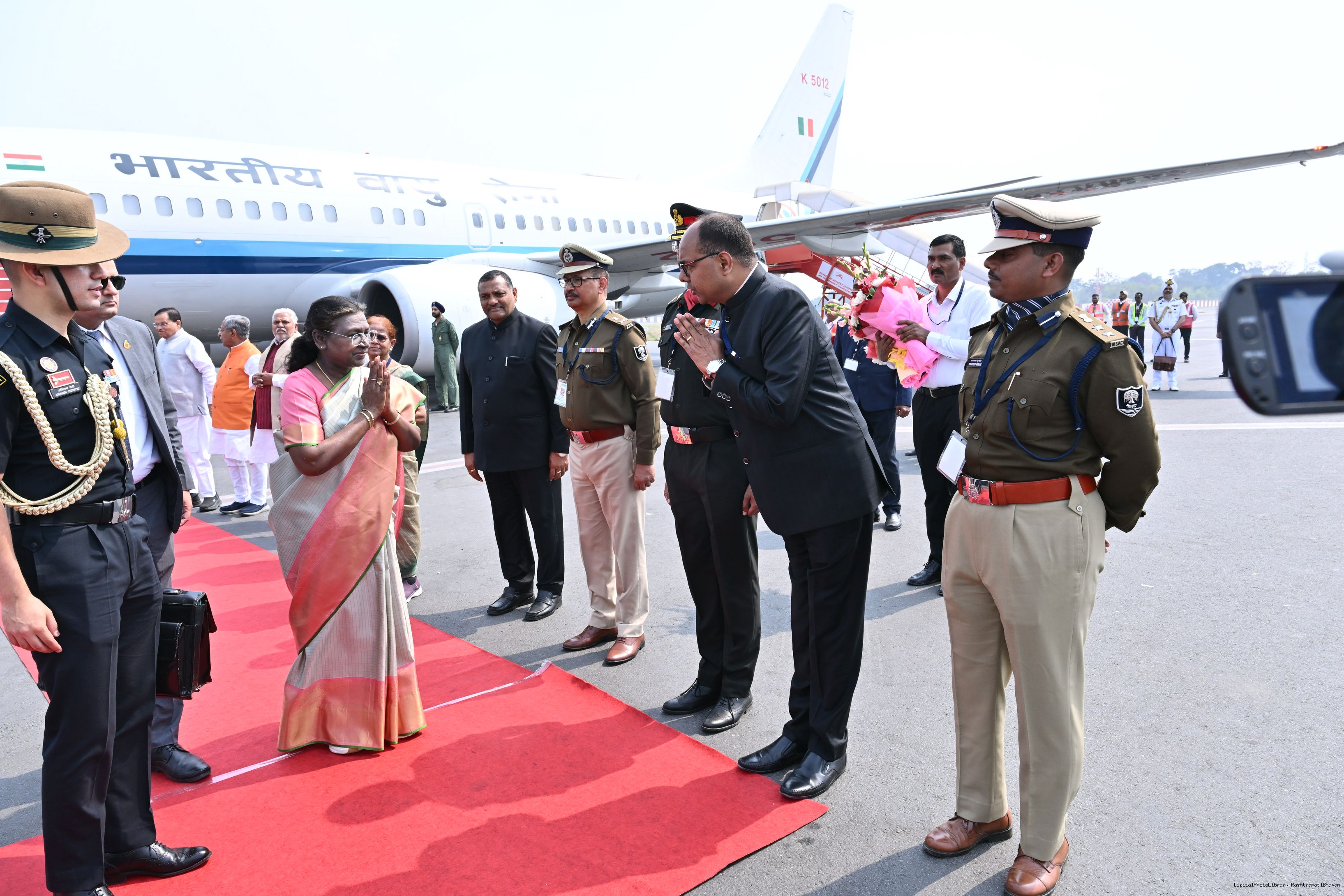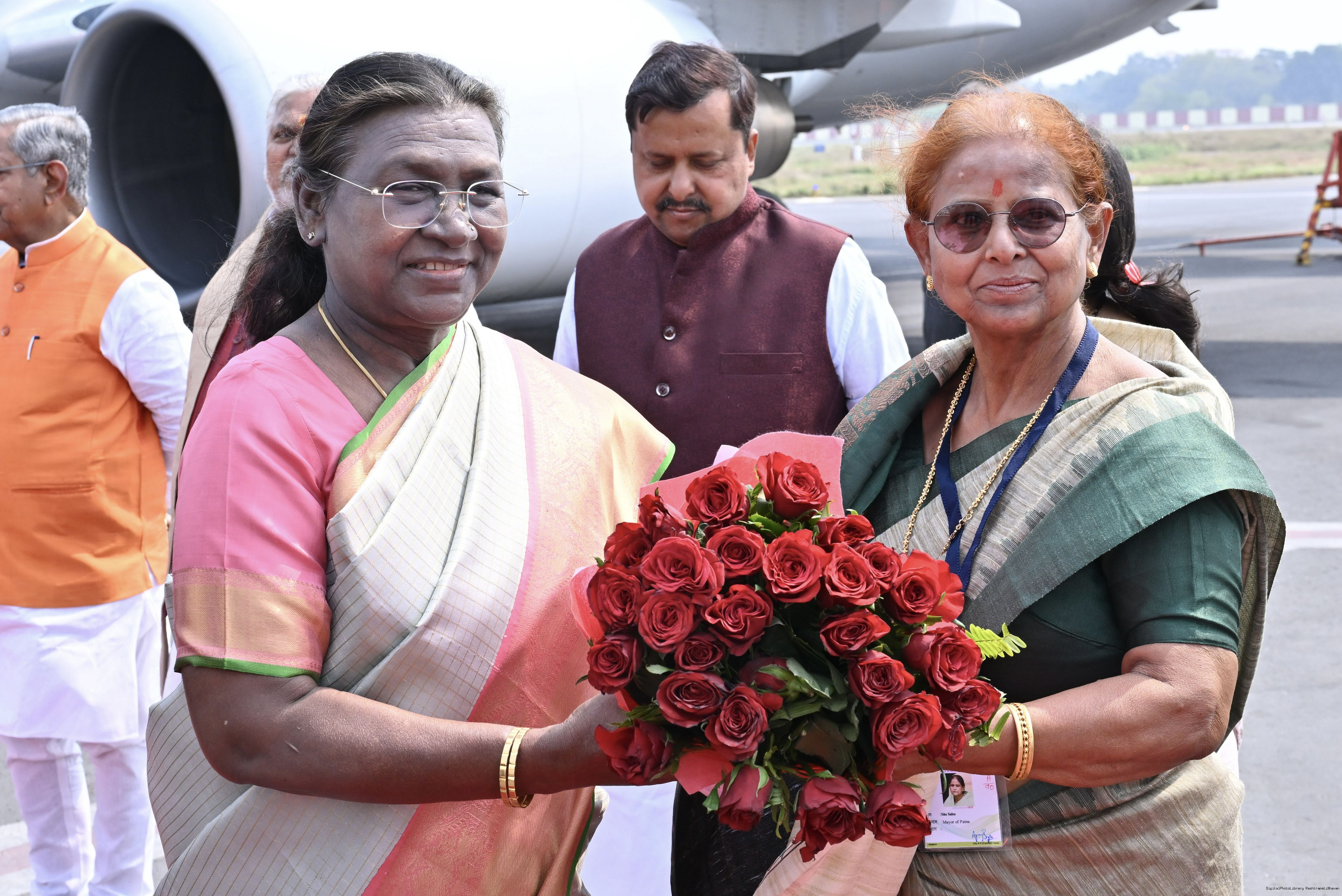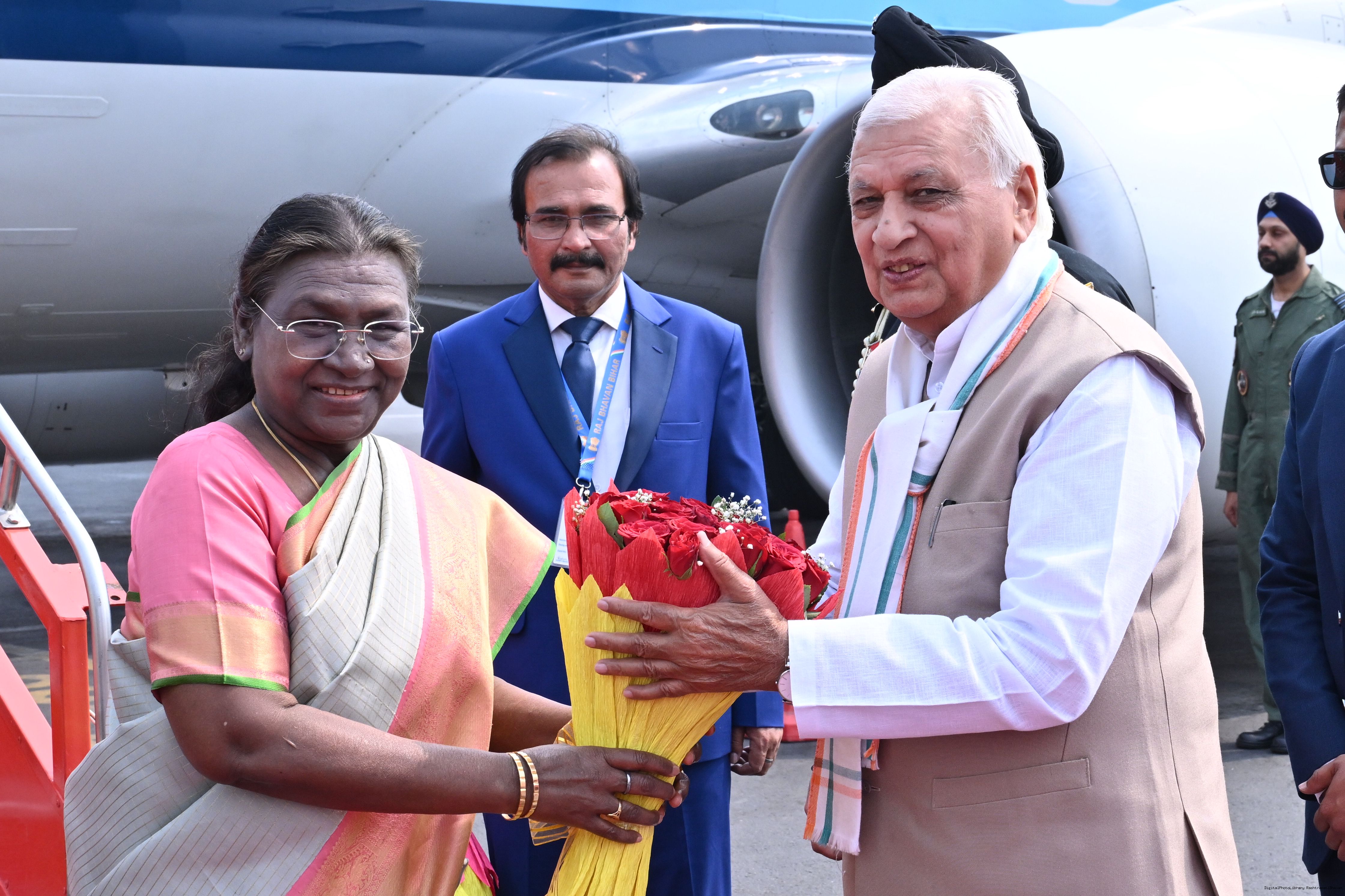 | Caption: | The Governor of Bihar, Shri Arif Mohammed Khan and Chief Minister Shri Nitish Kumar received the President of India Smt. Droupadi Murmu on her arrival at Patna on February 25, 2025. |