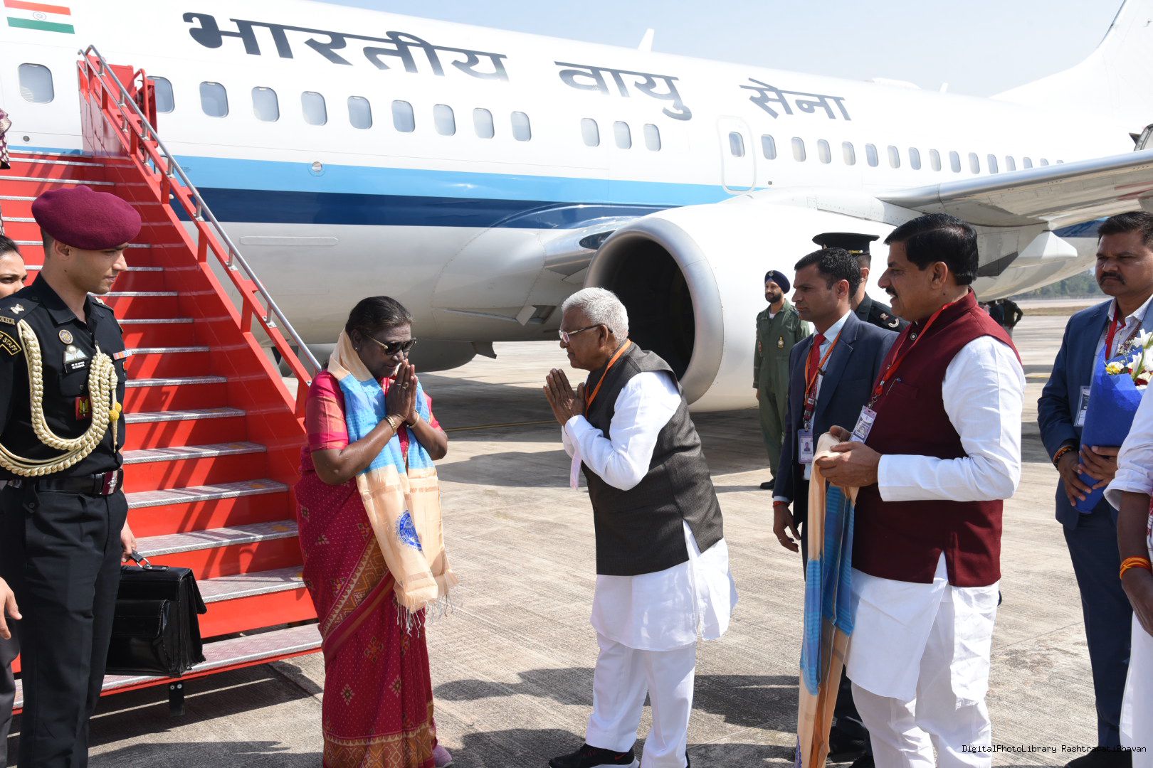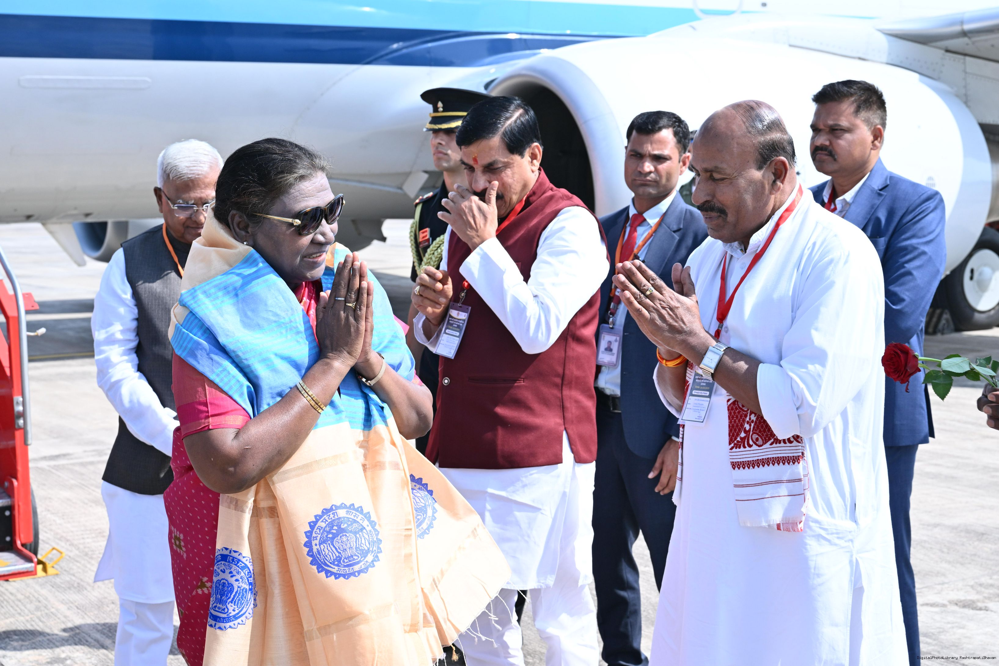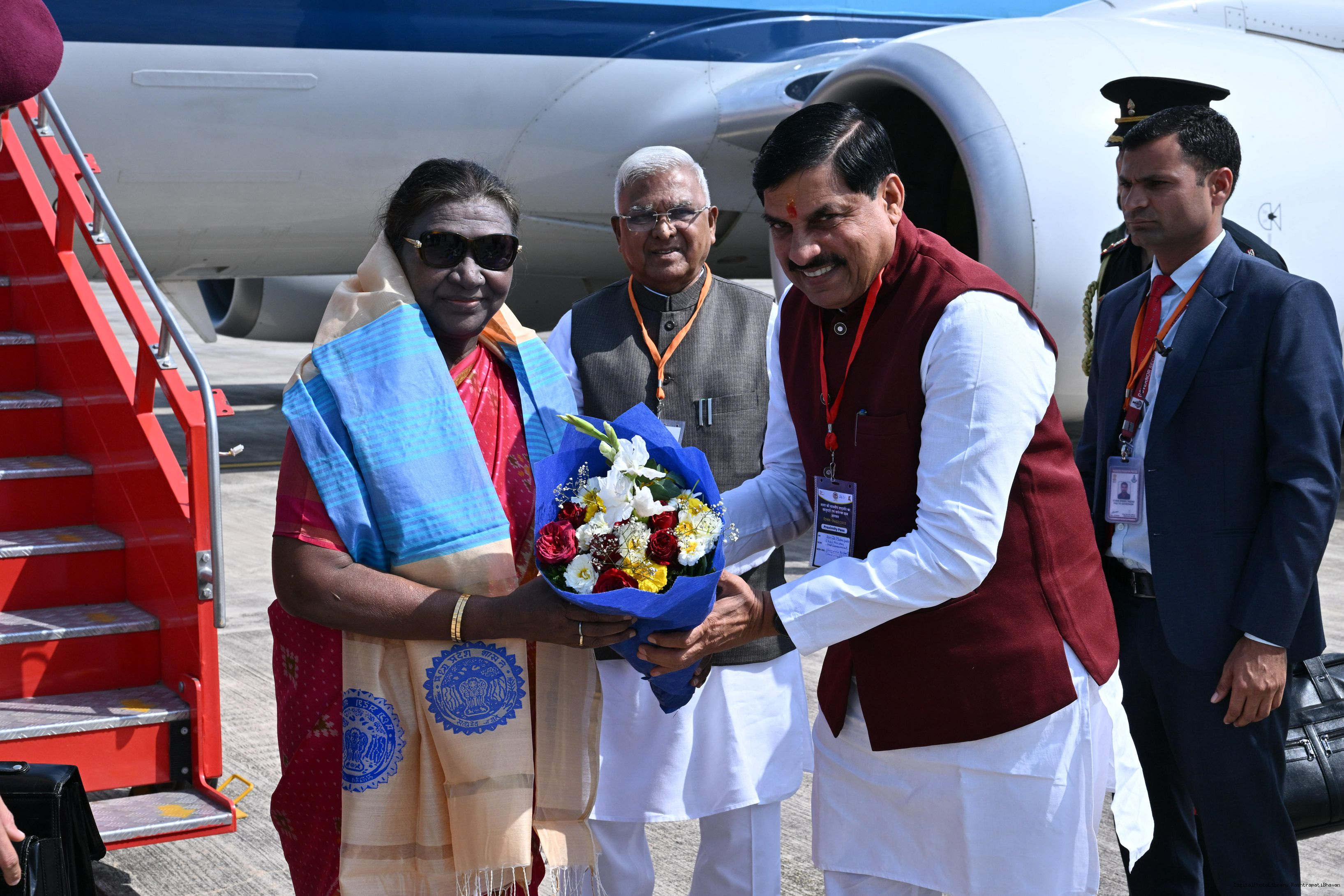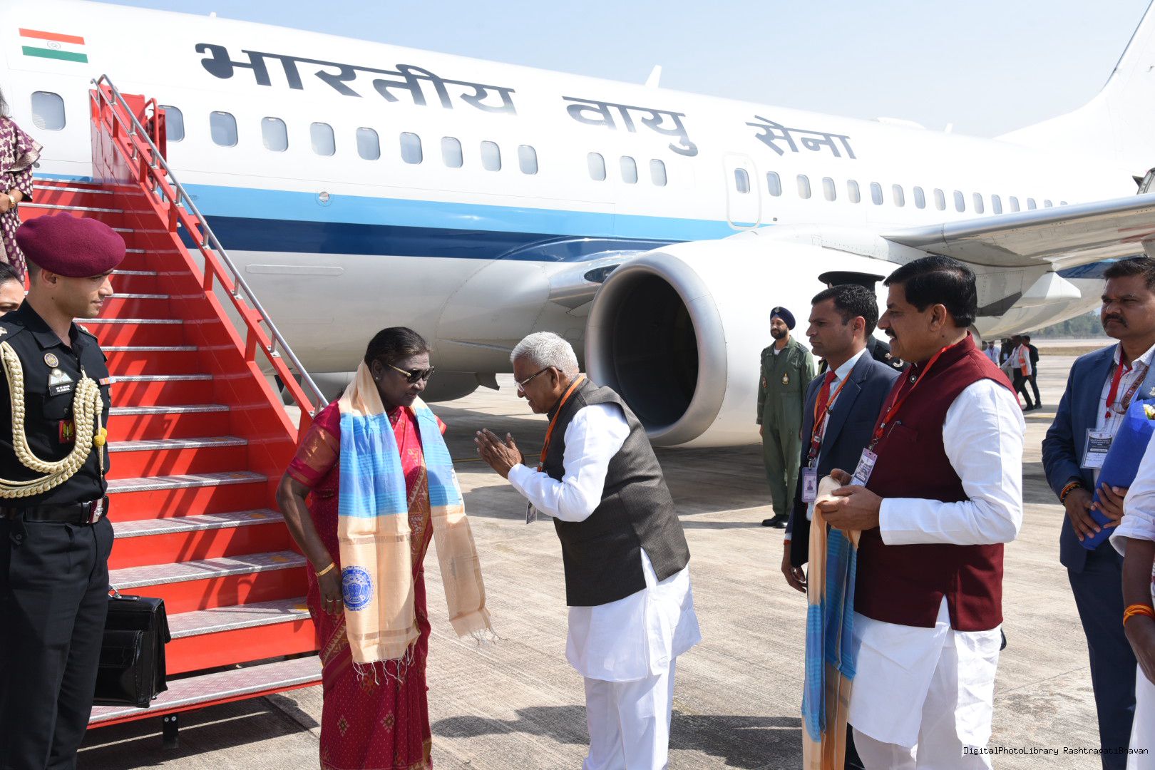 | Caption: | The Governor of Madhya Pradesh, Shri Mangubhai Patel and Chief Minister Dr Mohan Yadav received the President of India, Smt. Droupadi Murmu on her arrival at Khajuraho Airport on February 26, 2025. |