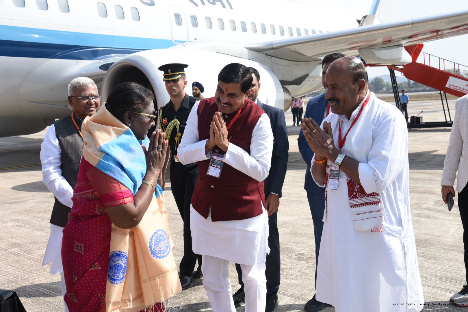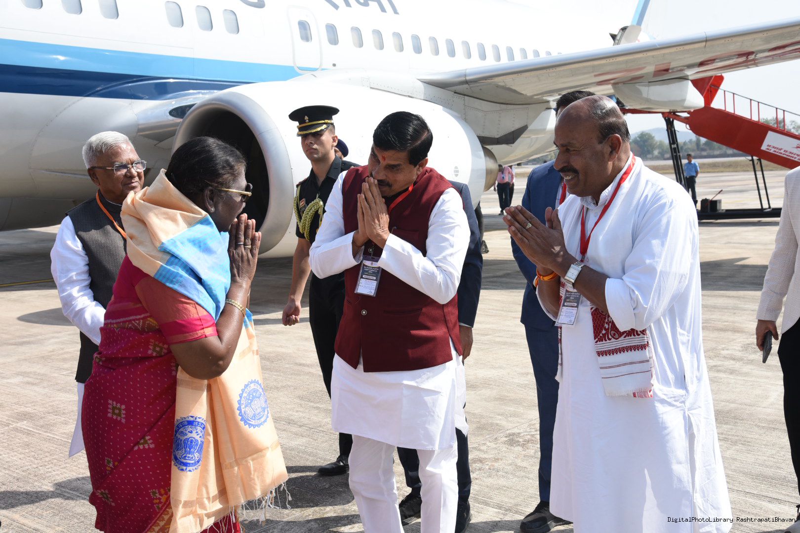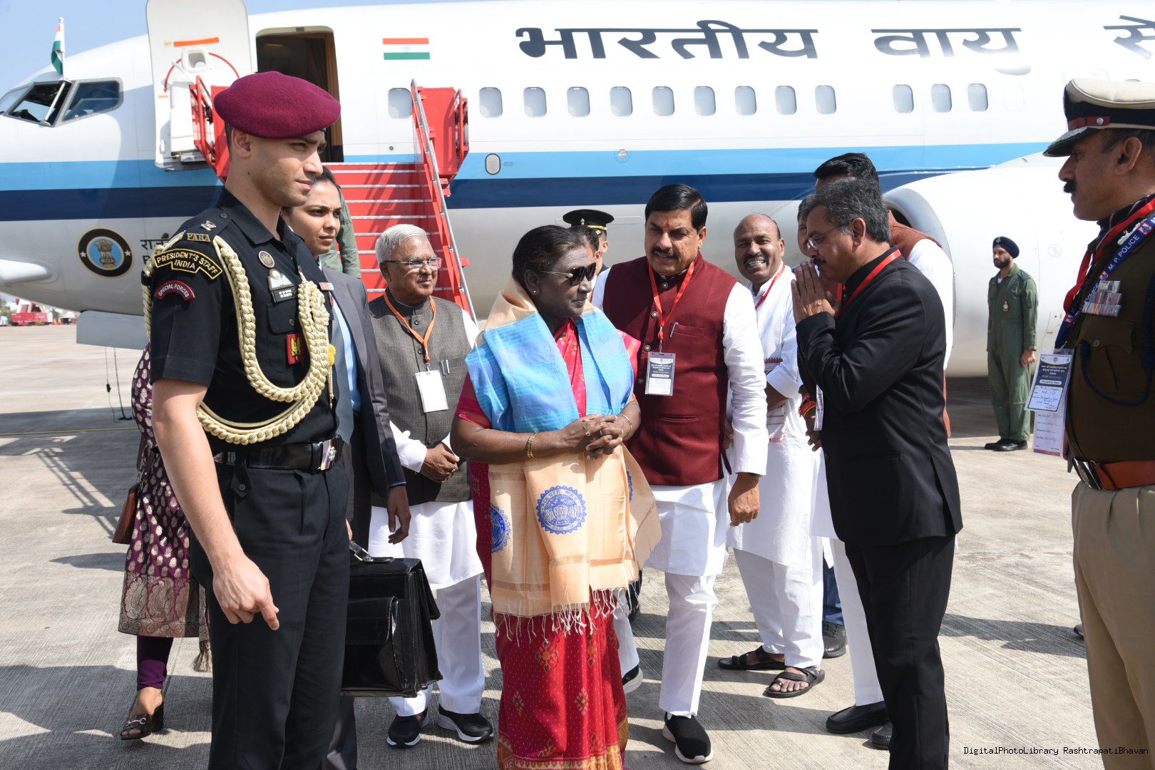 | Caption: | The Governor of Madhya Pradesh, Shri Mangubhai Patel and Chief Minister Dr Mohan Yadav received the President of India, Smt. Droupadi Murmu on her arrival at Khajuraho Airport on February 26, 2025. |