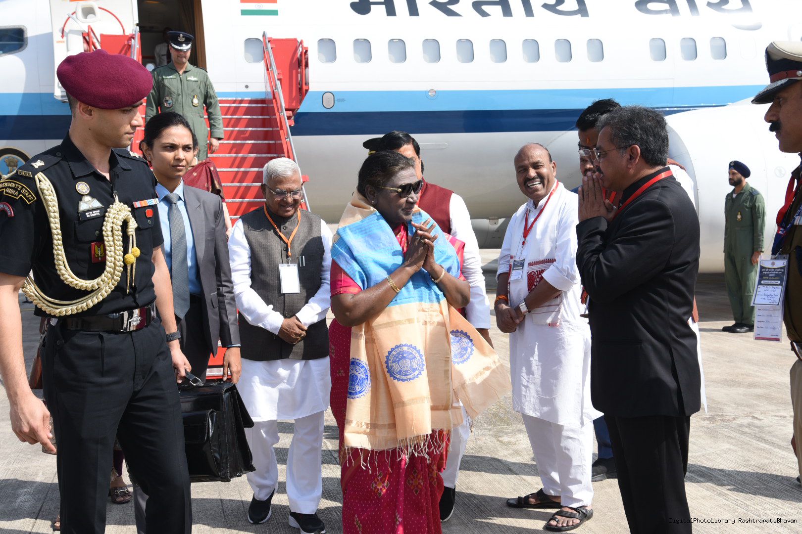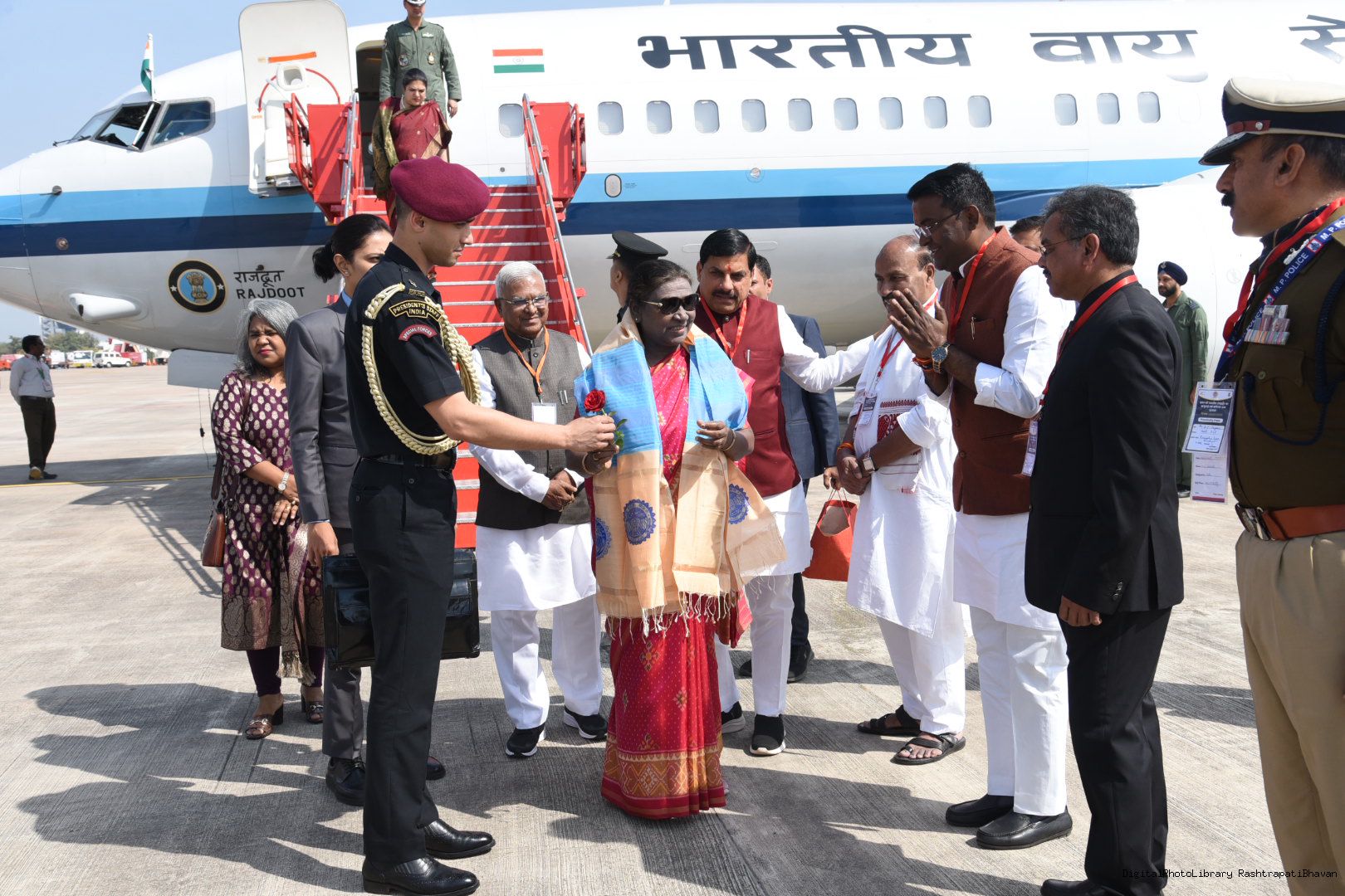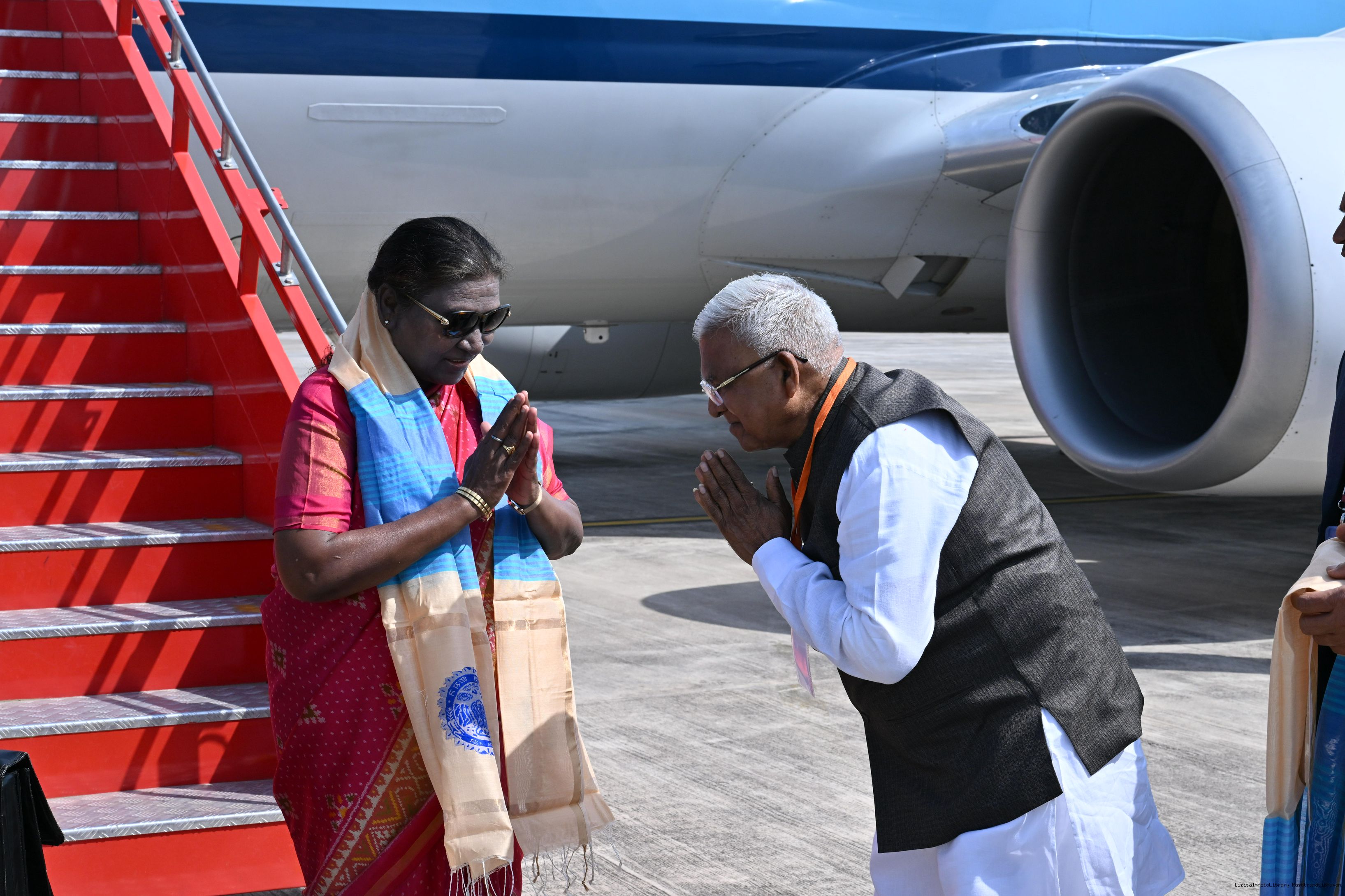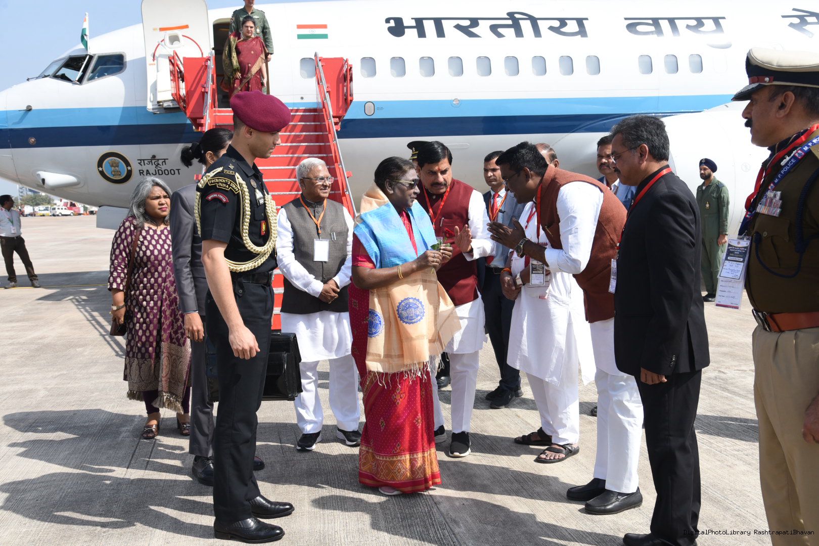 | Caption: | The Governor of Madhya Pradesh, Shri Mangubhai Patel and Chief Minister Dr Mohan Yadav received the President of India, Smt. Droupadi Murmu on her arrival at Khajuraho Airport on February 26, 2025. |