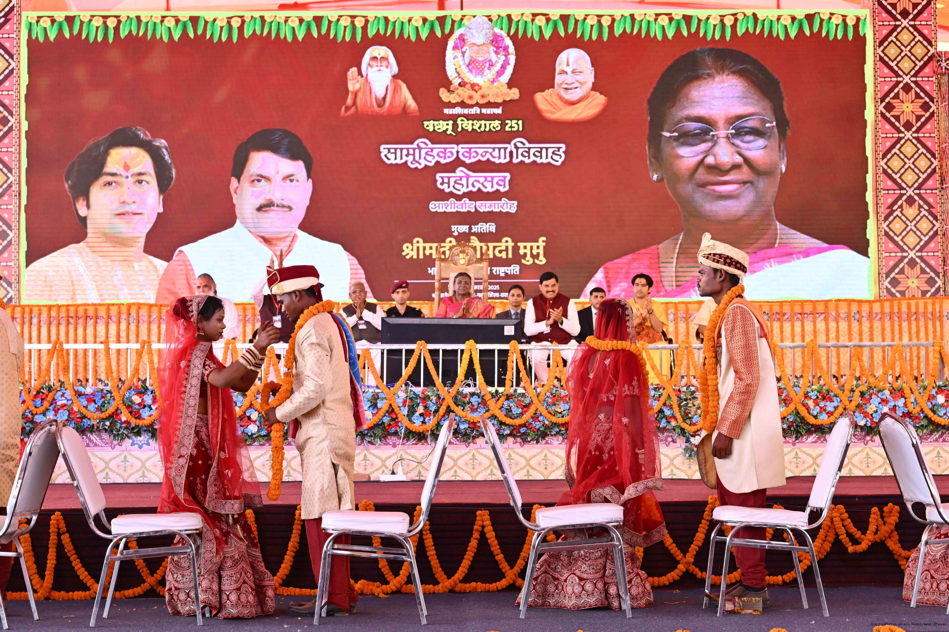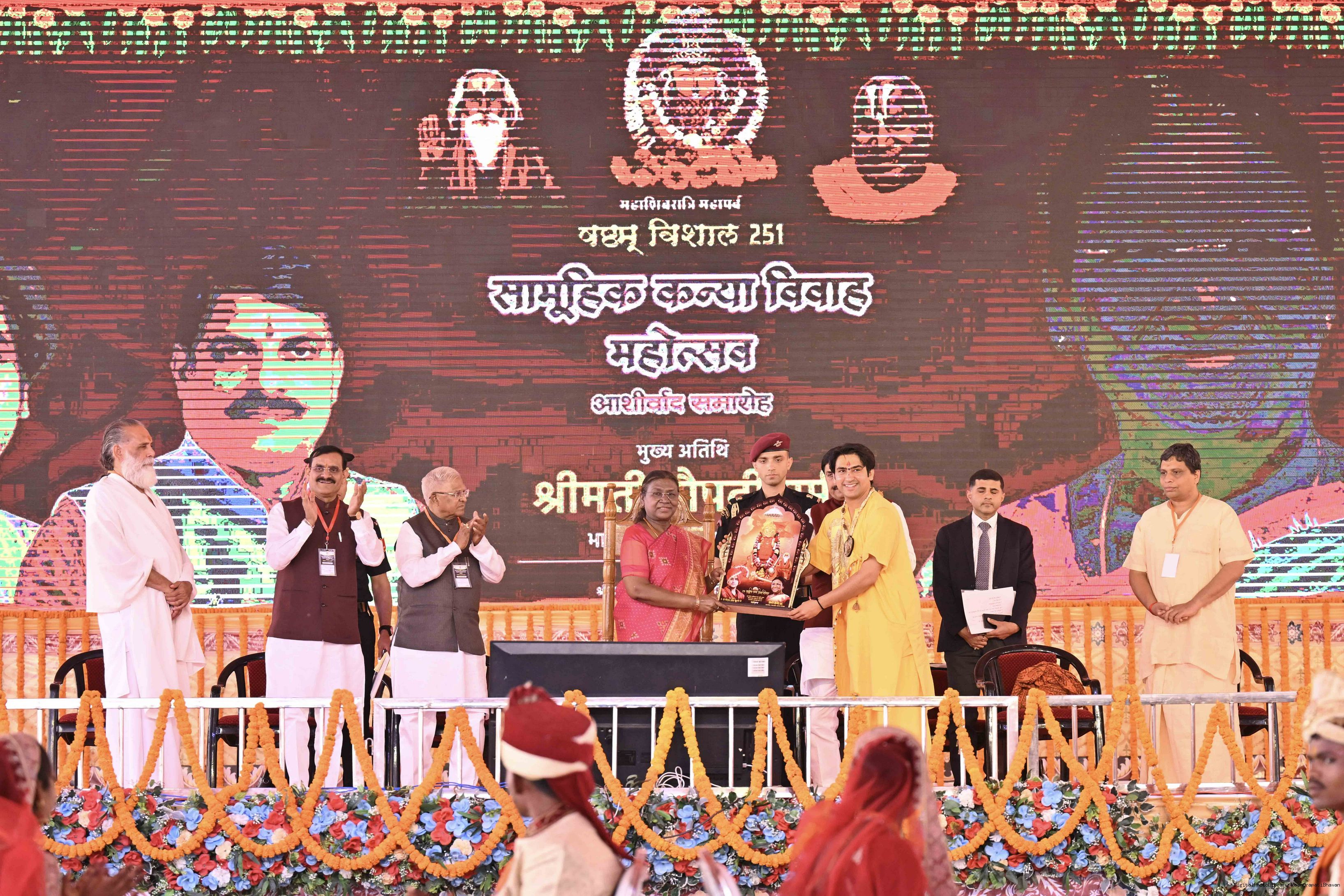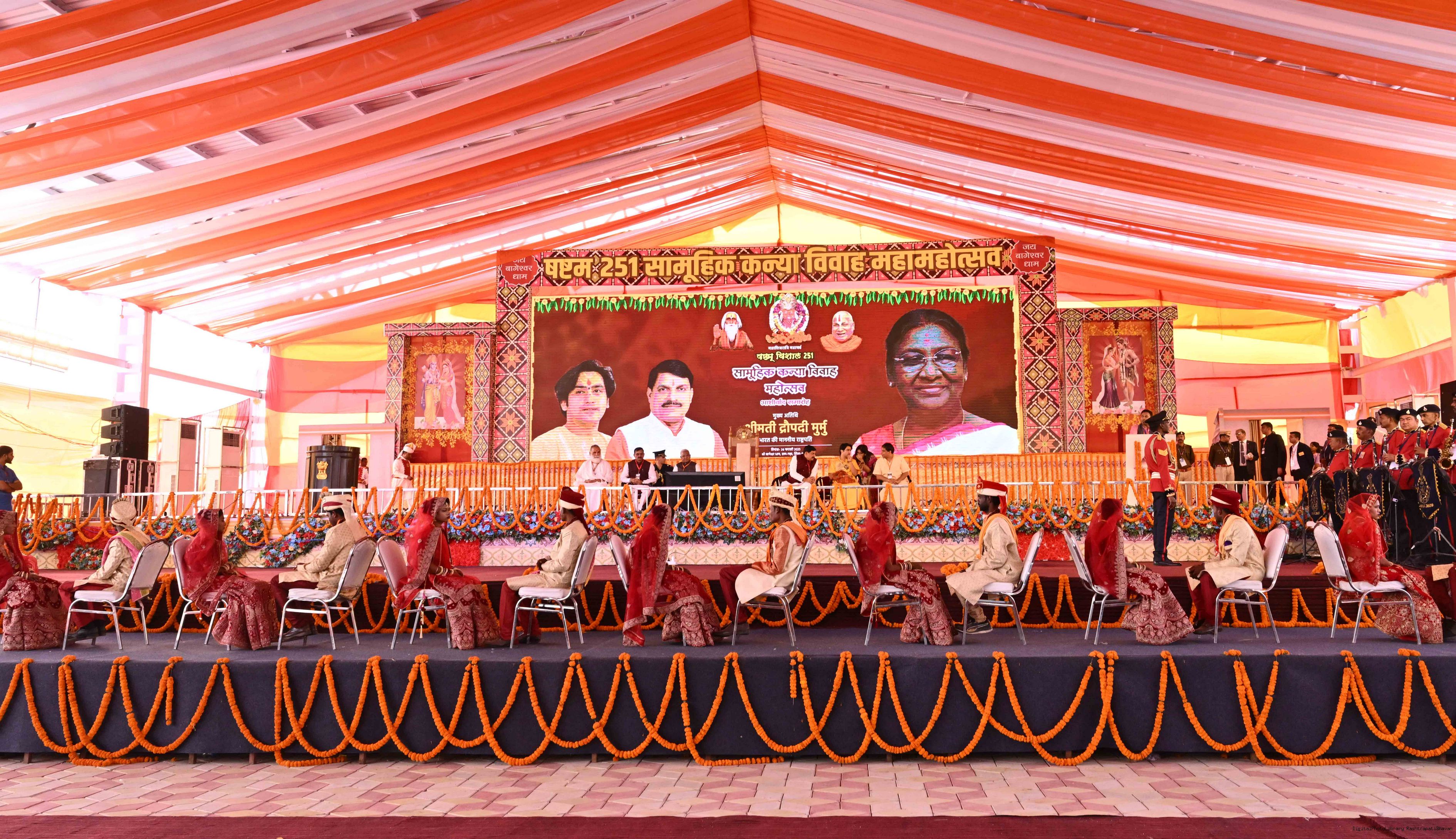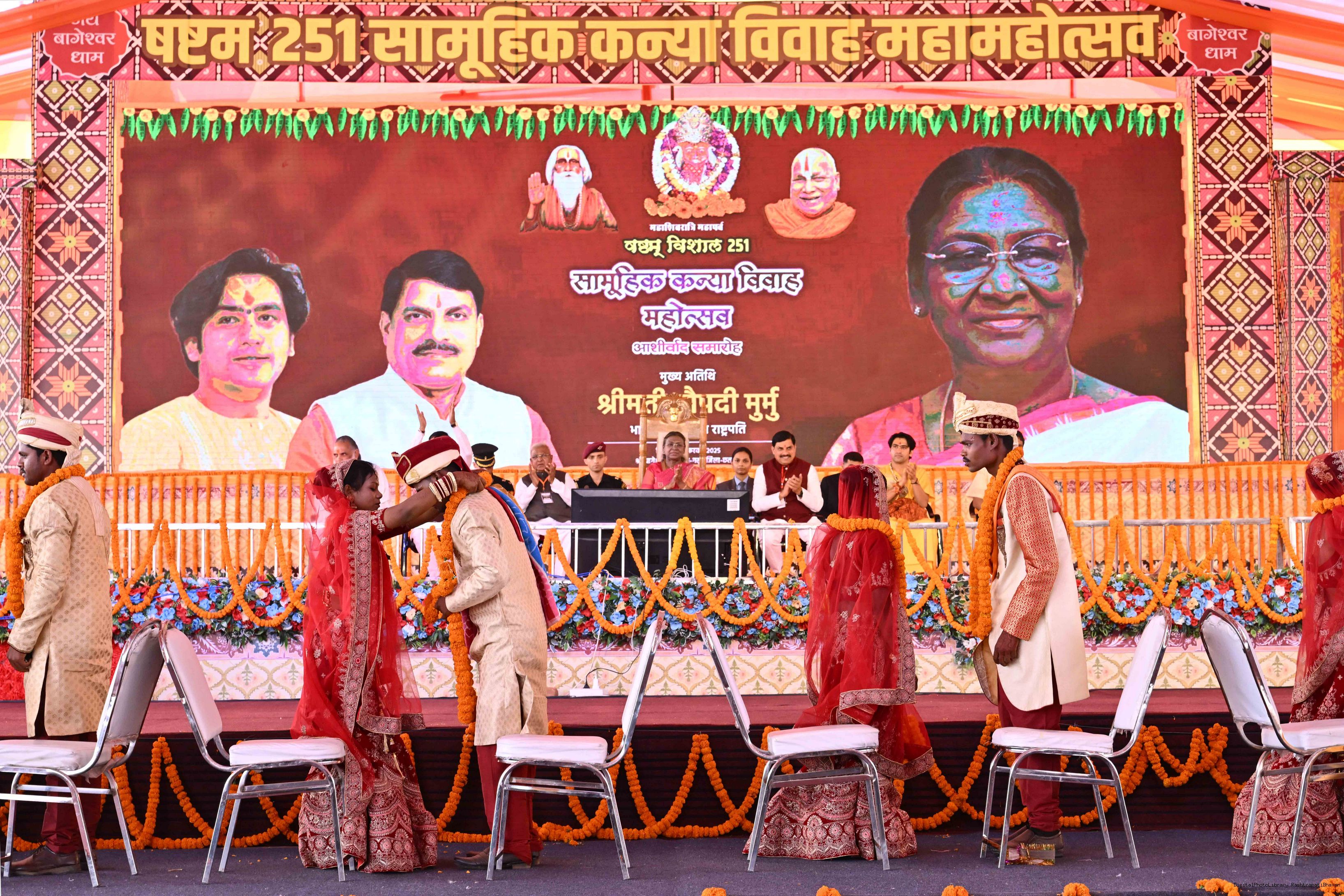 | Caption: | The President of India, Smt. Droupadi Murmu graced a Mass Wedding ceremony organised by Shri Bageshwar Jan Seva Samiti at Gadha, Chhatarpur, Madhya Pradesh on February 26, 2025. |
