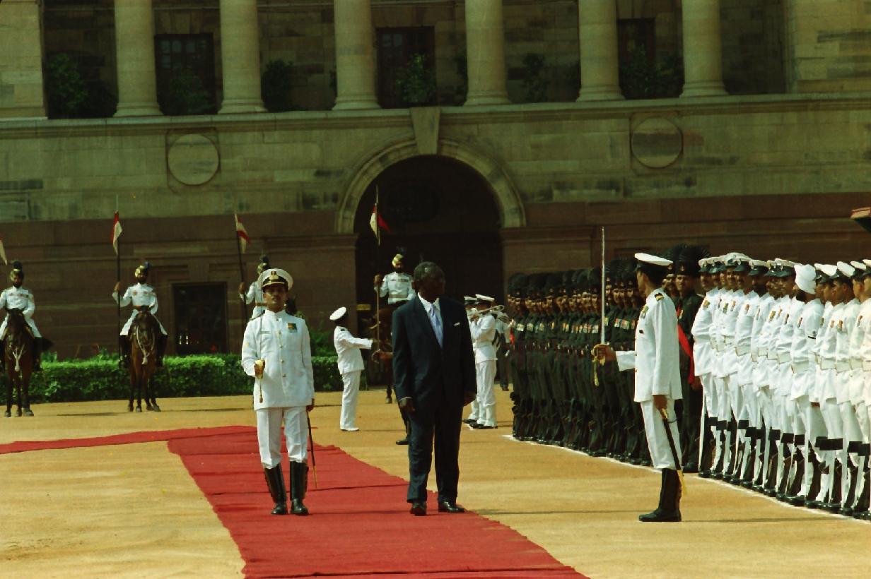 | Caption: | The President of India, Dr A P J Abdul Kalam at the Ceremonial Reception of the President of the Republic of Ghana, His Excellency Mr John Agyekum Kufuor and his wife Mrs Theresa Kufuor at the Forecourt of Rashtrapati Bhavan in New Delhi on Aug 05, 2002 |