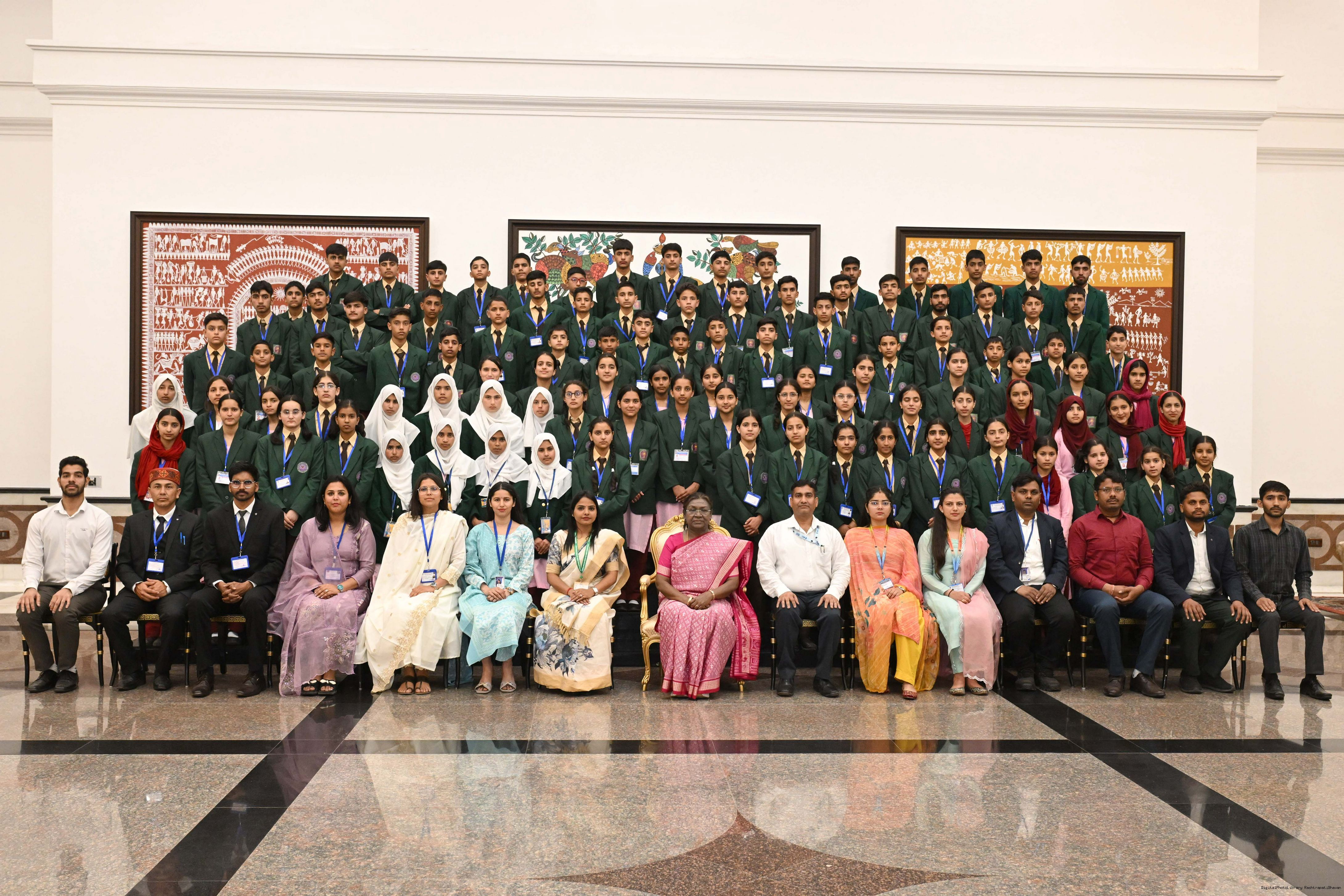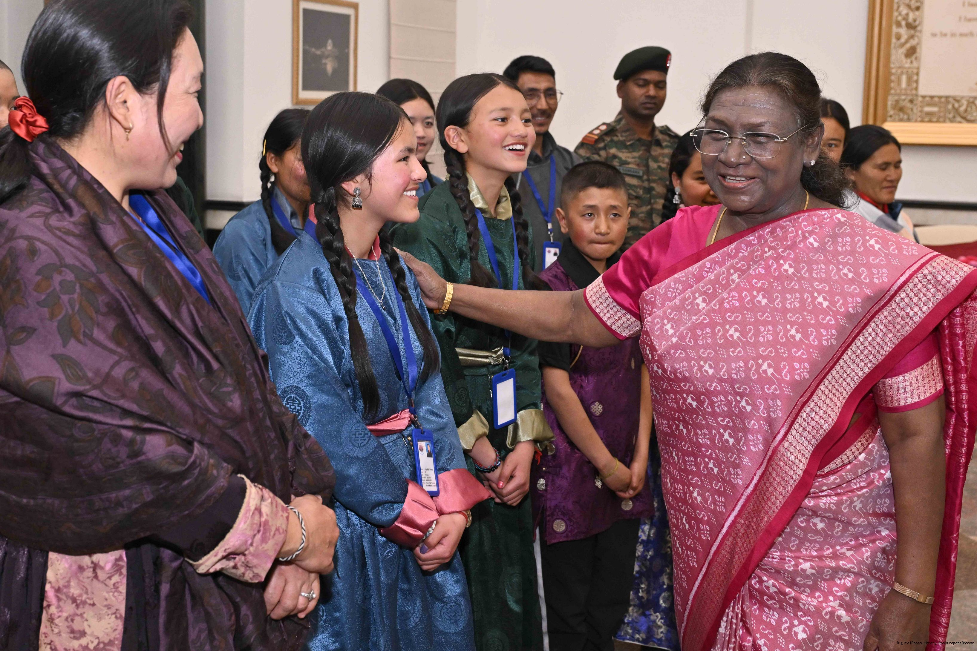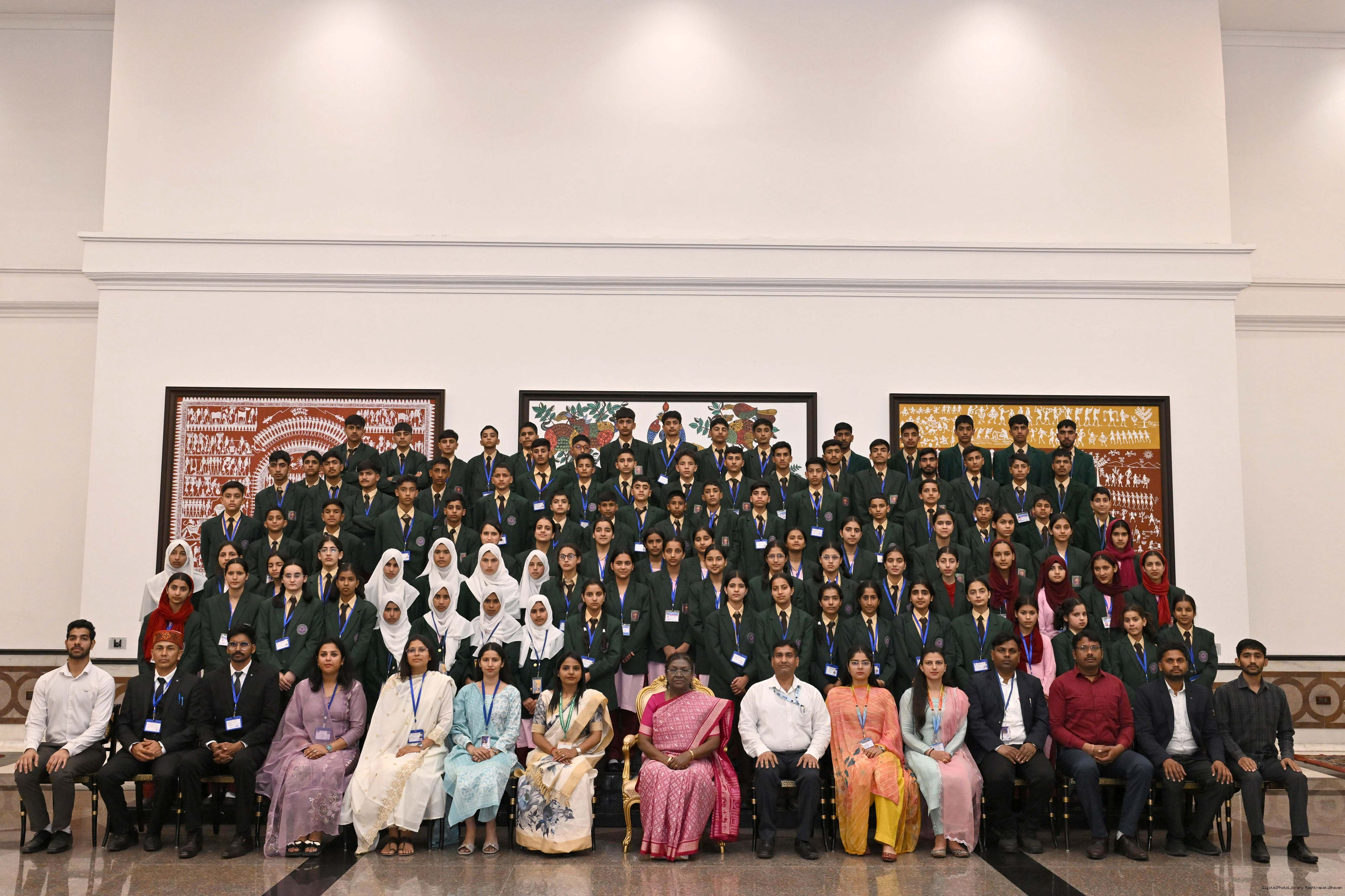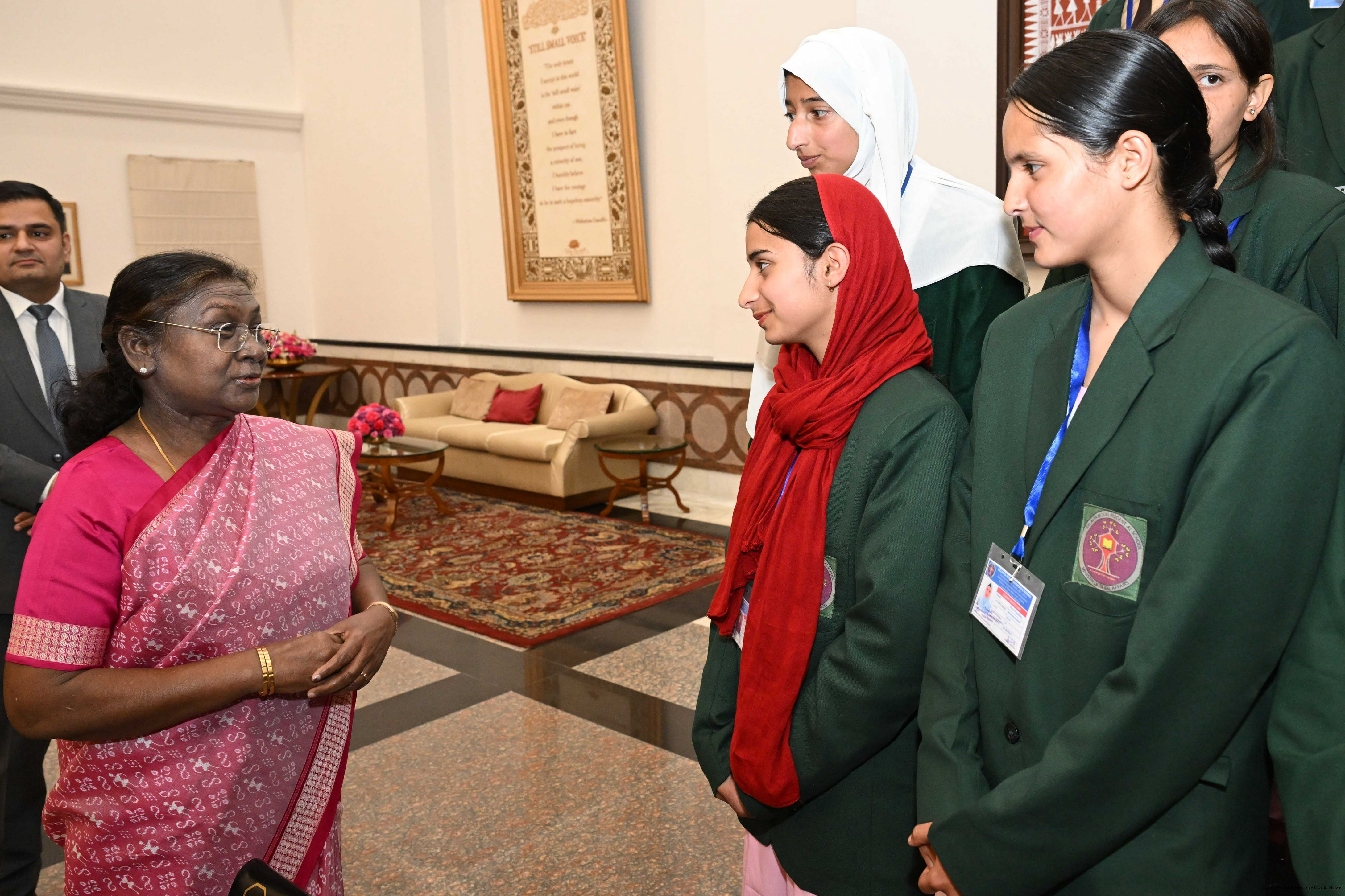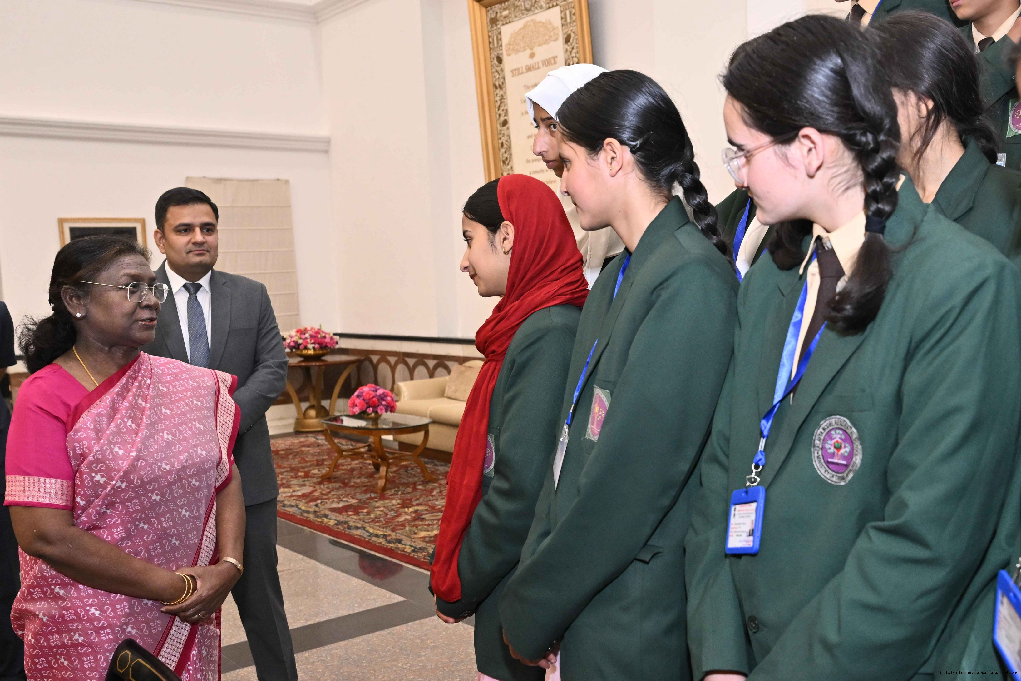 | Caption: | The President of India, Smt. Droupadi Murmu met group of students from Ladakh attending the National Integration Tour and students from various Eklavya Model Residential Schools of Jammu Kashmir at Rashtrapati Bhavan on March 18, 2025. |