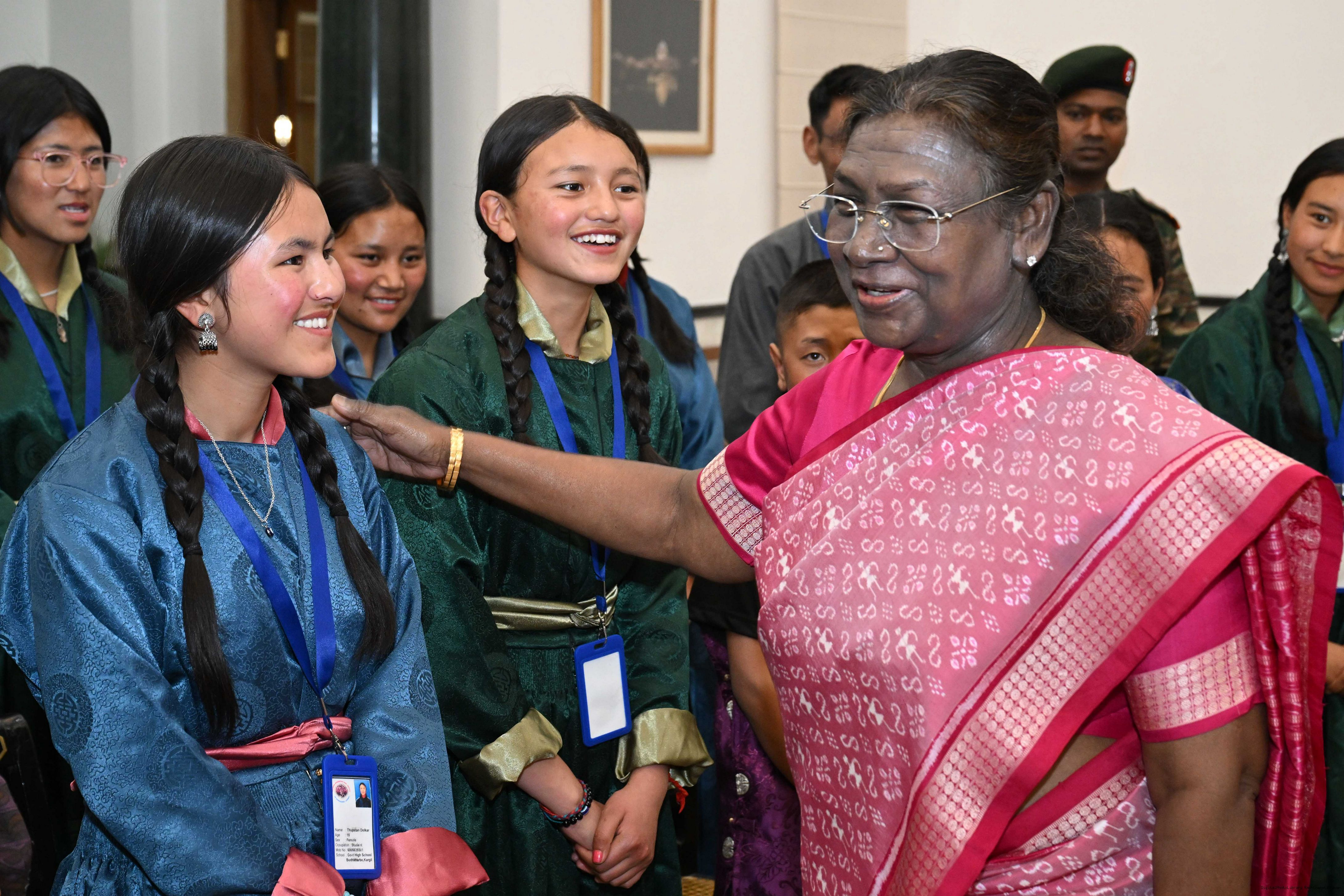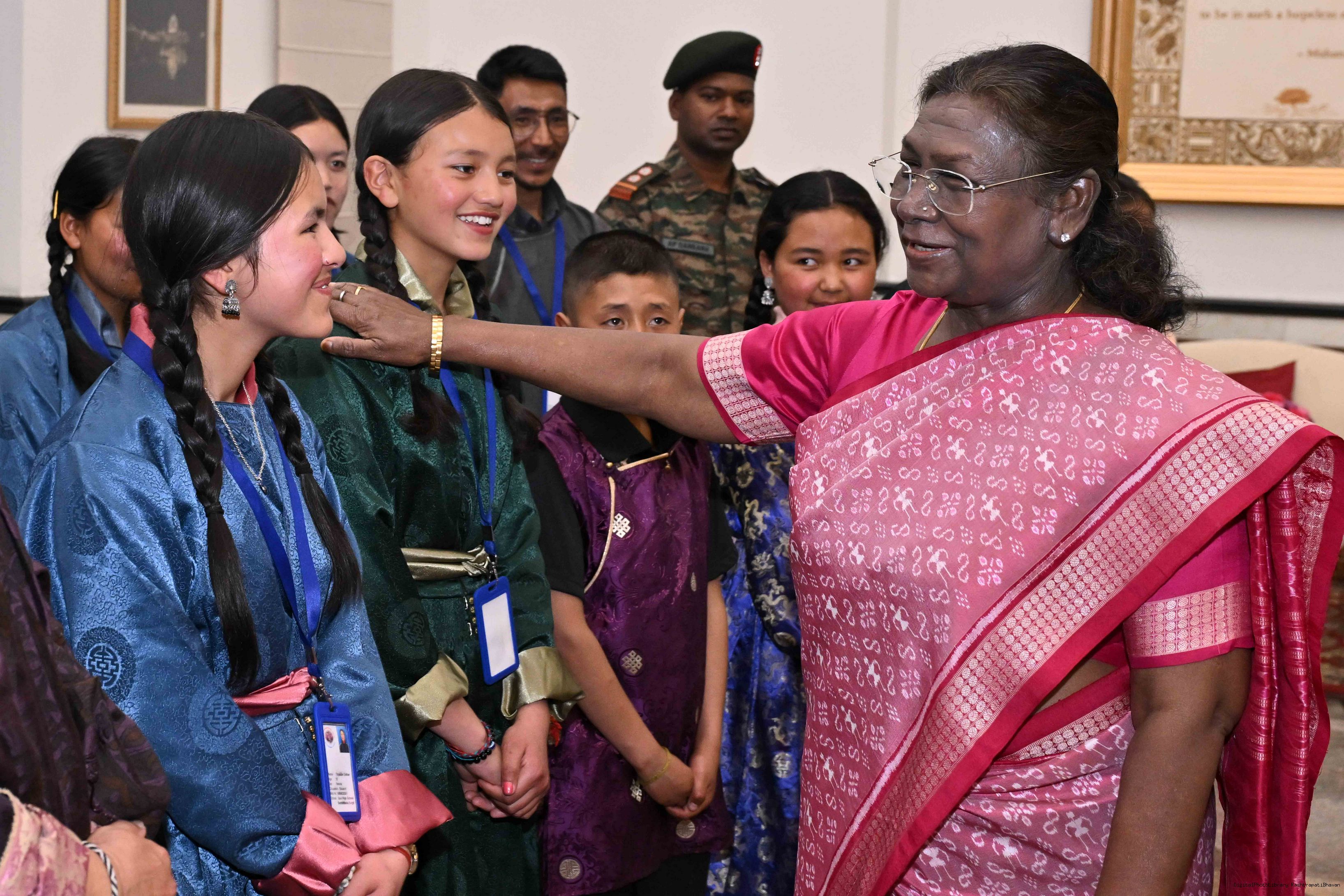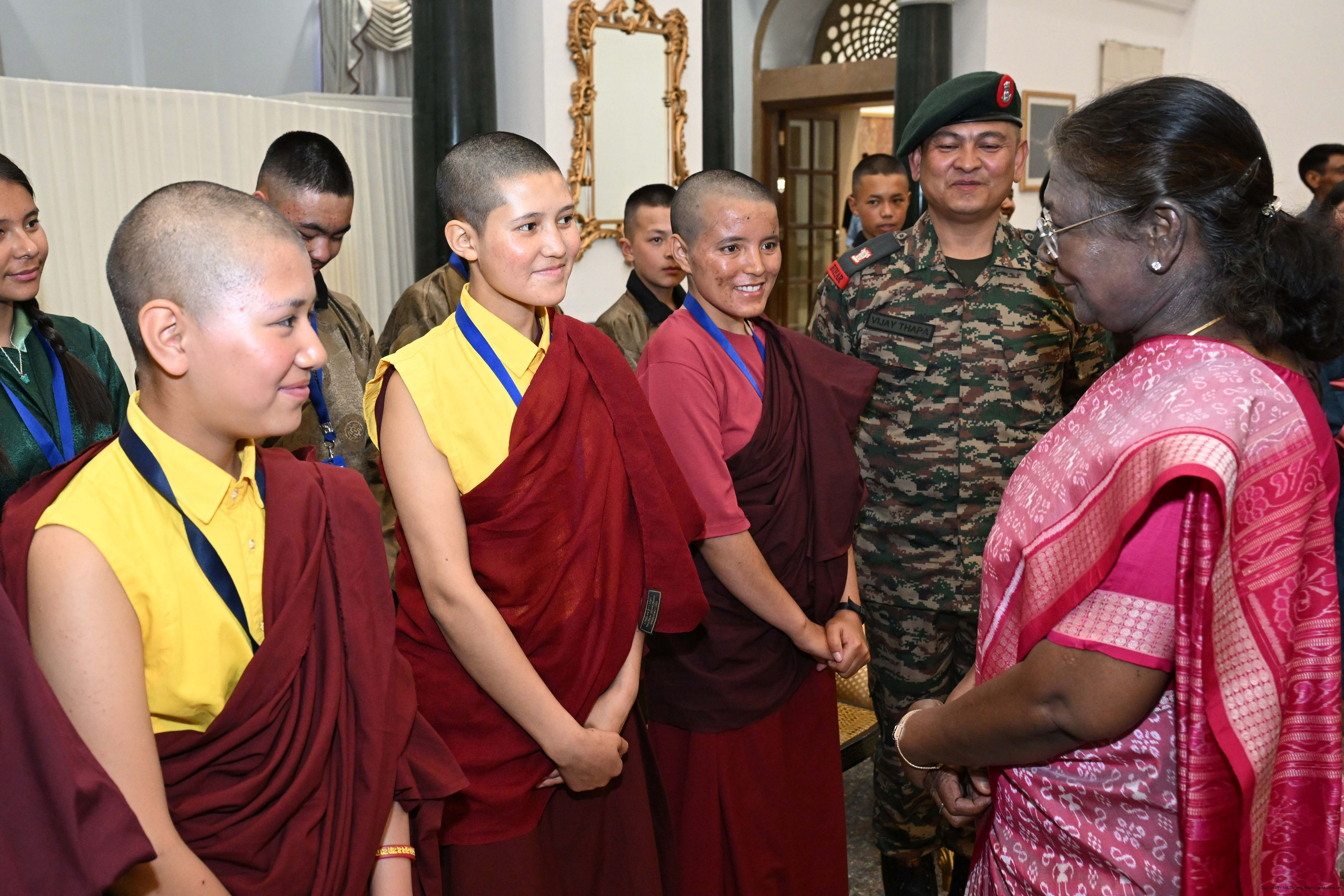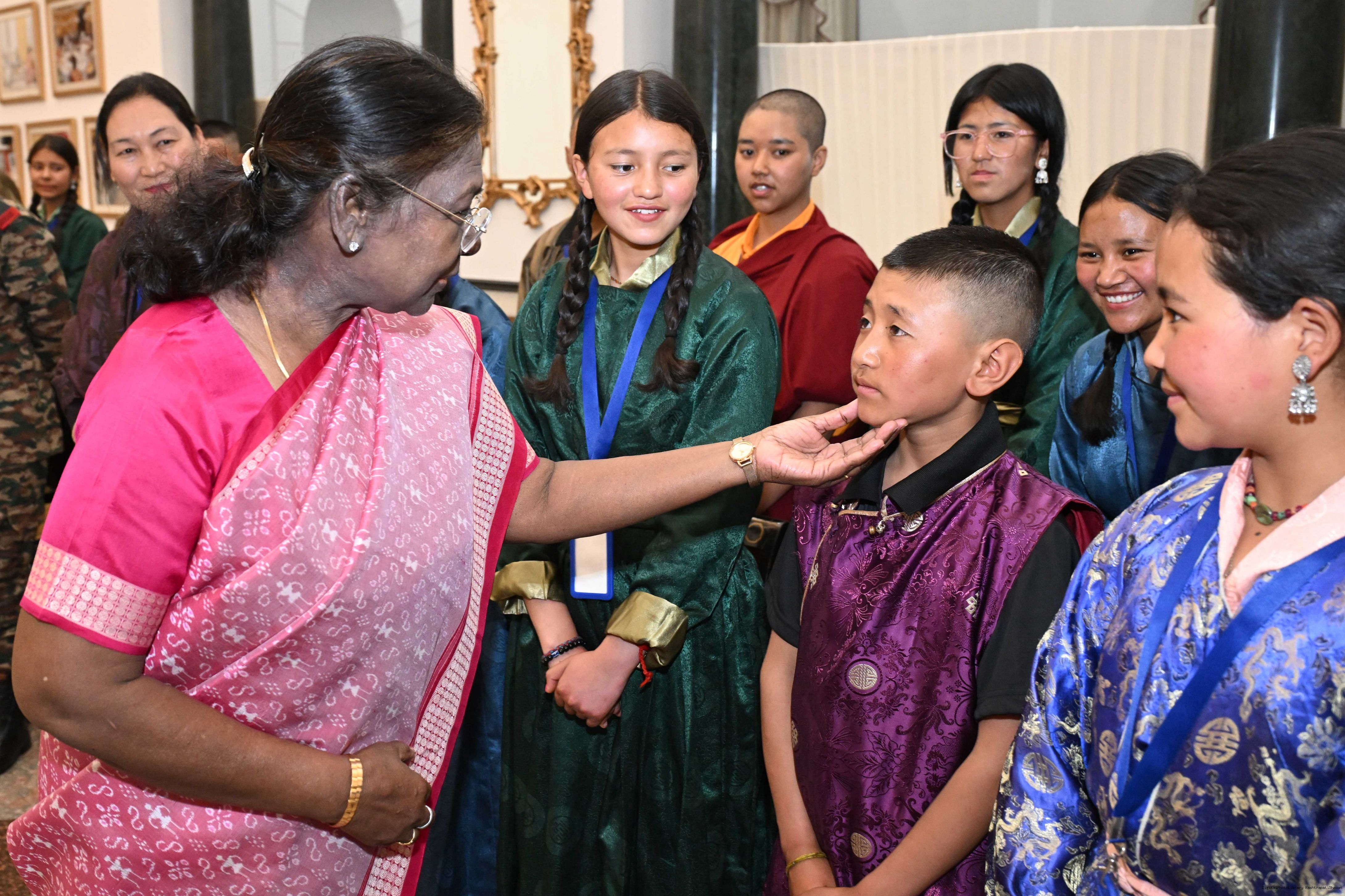 | Caption: | The President of India, Smt. Droupadi Murmu met group of students from Ladakh attending the National Integration Tour and students from various Eklavya Model Residential Schools of Jammu Kashmir at Rashtrapati Bhavan on March 18, 2025. |
