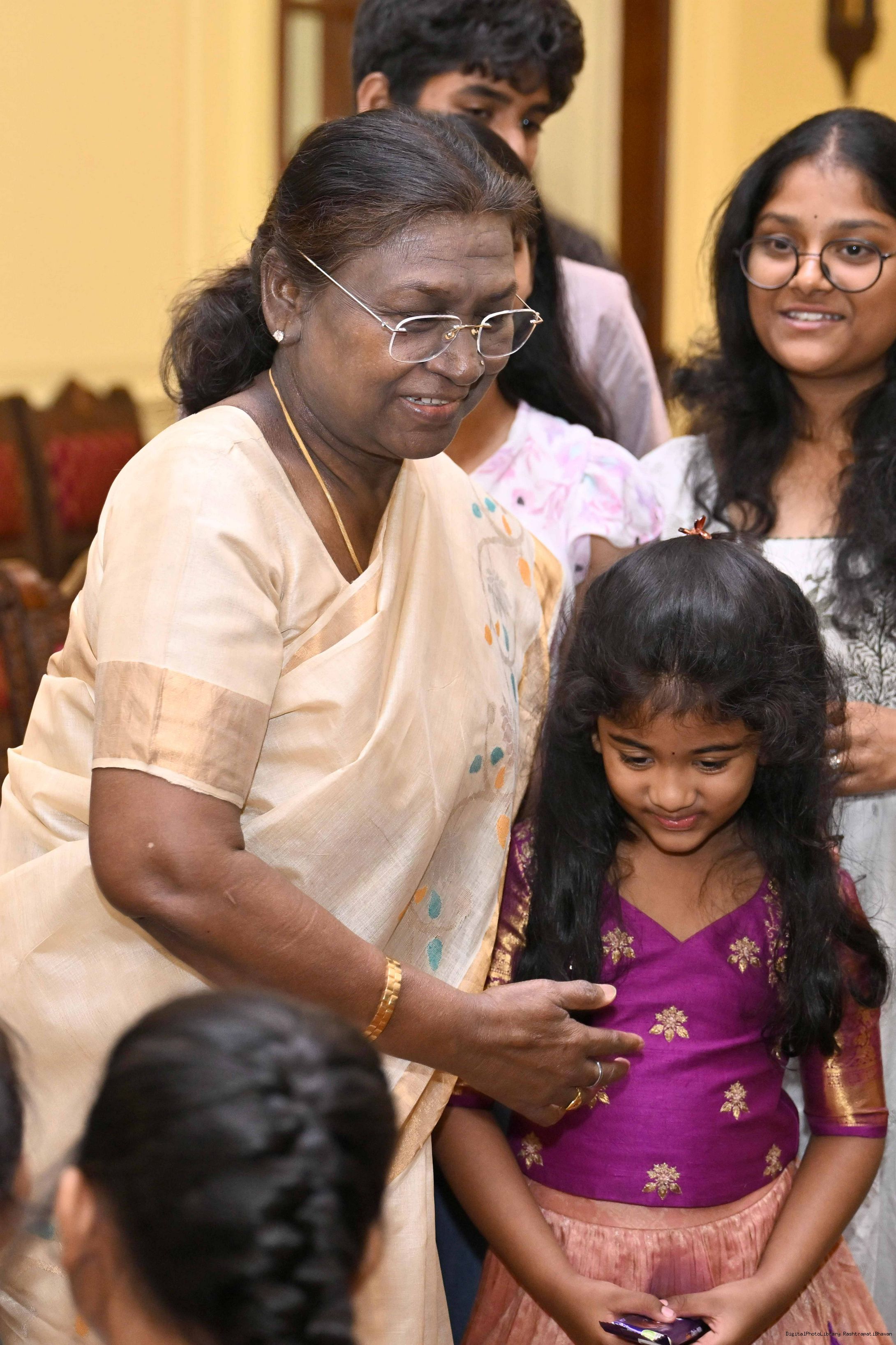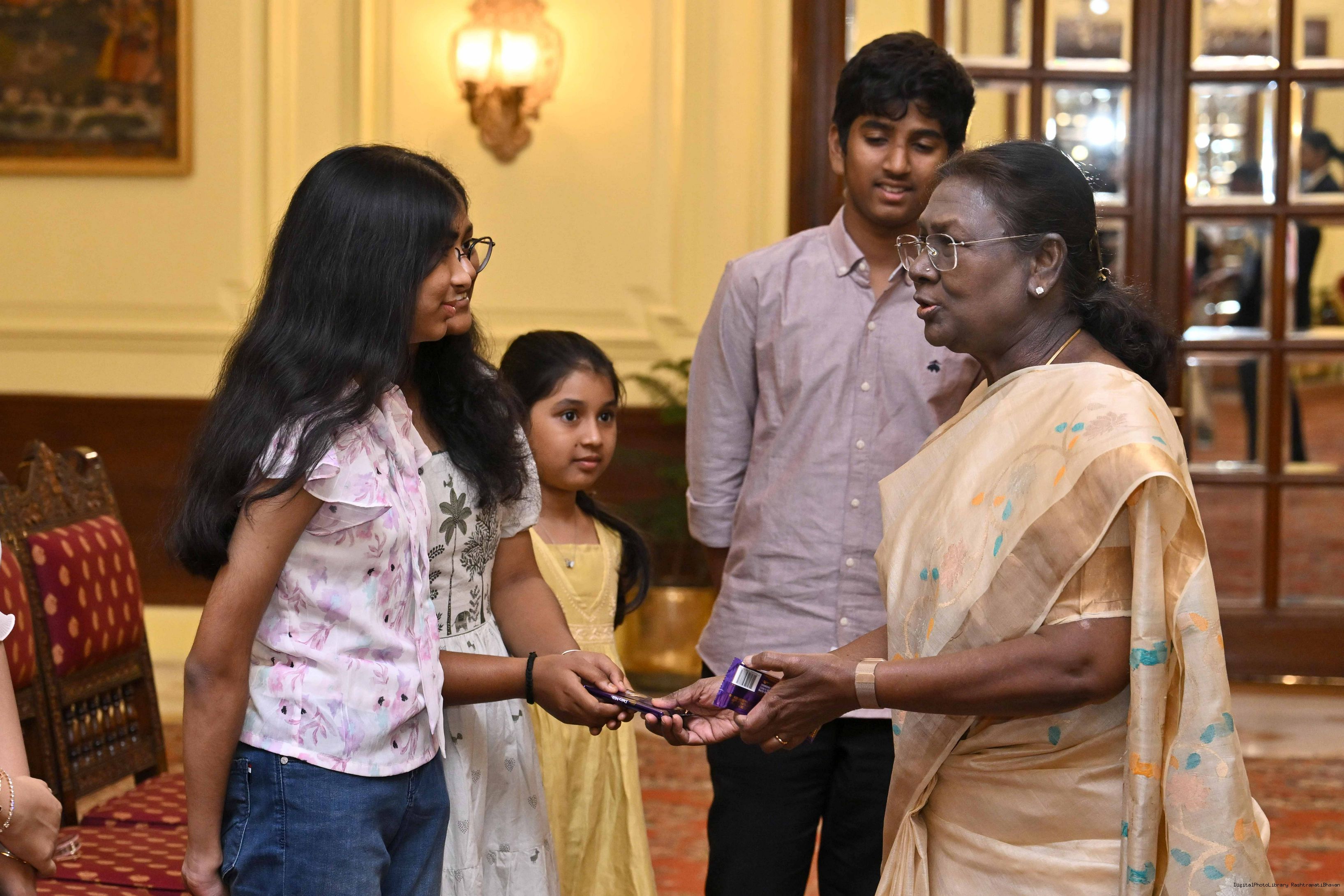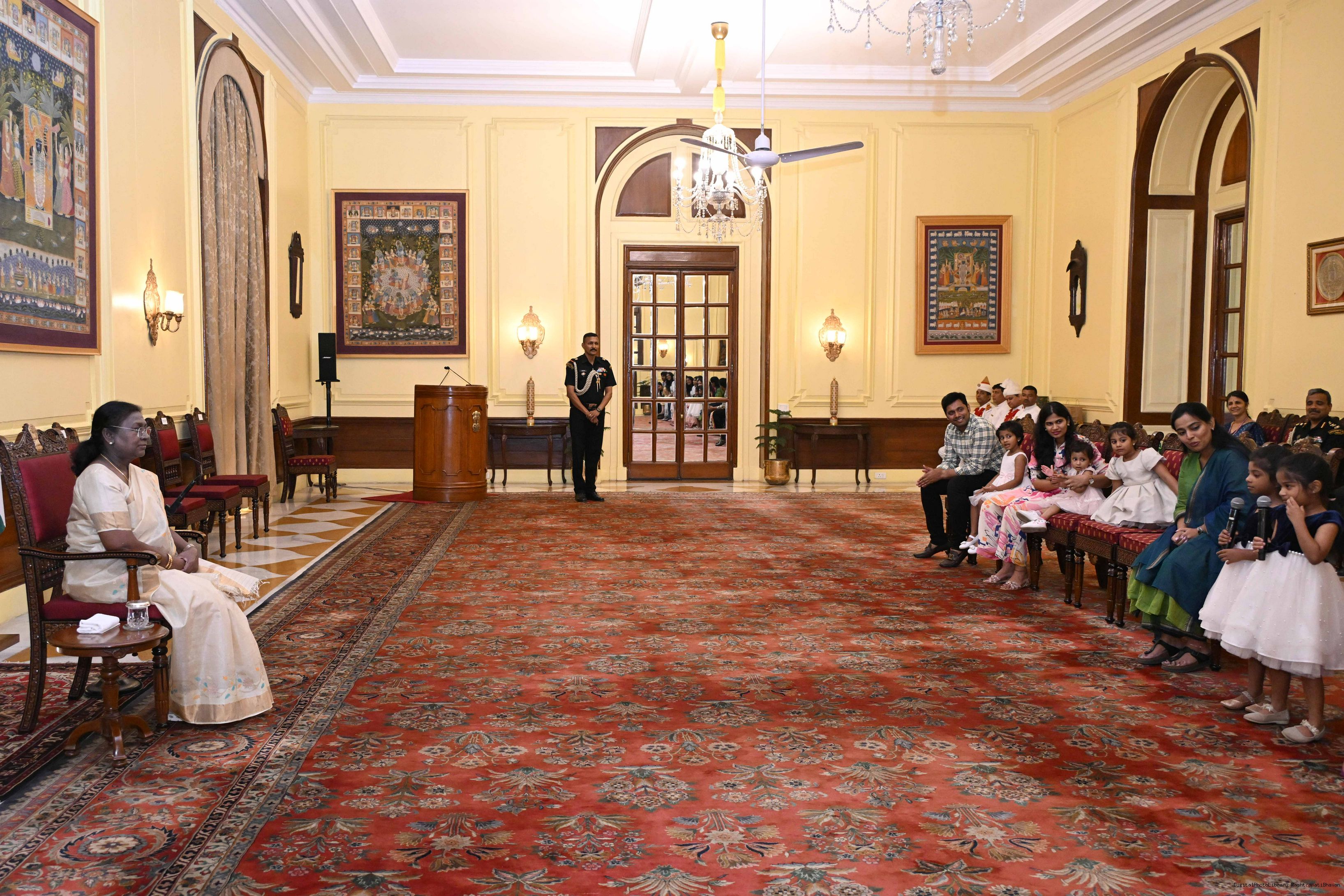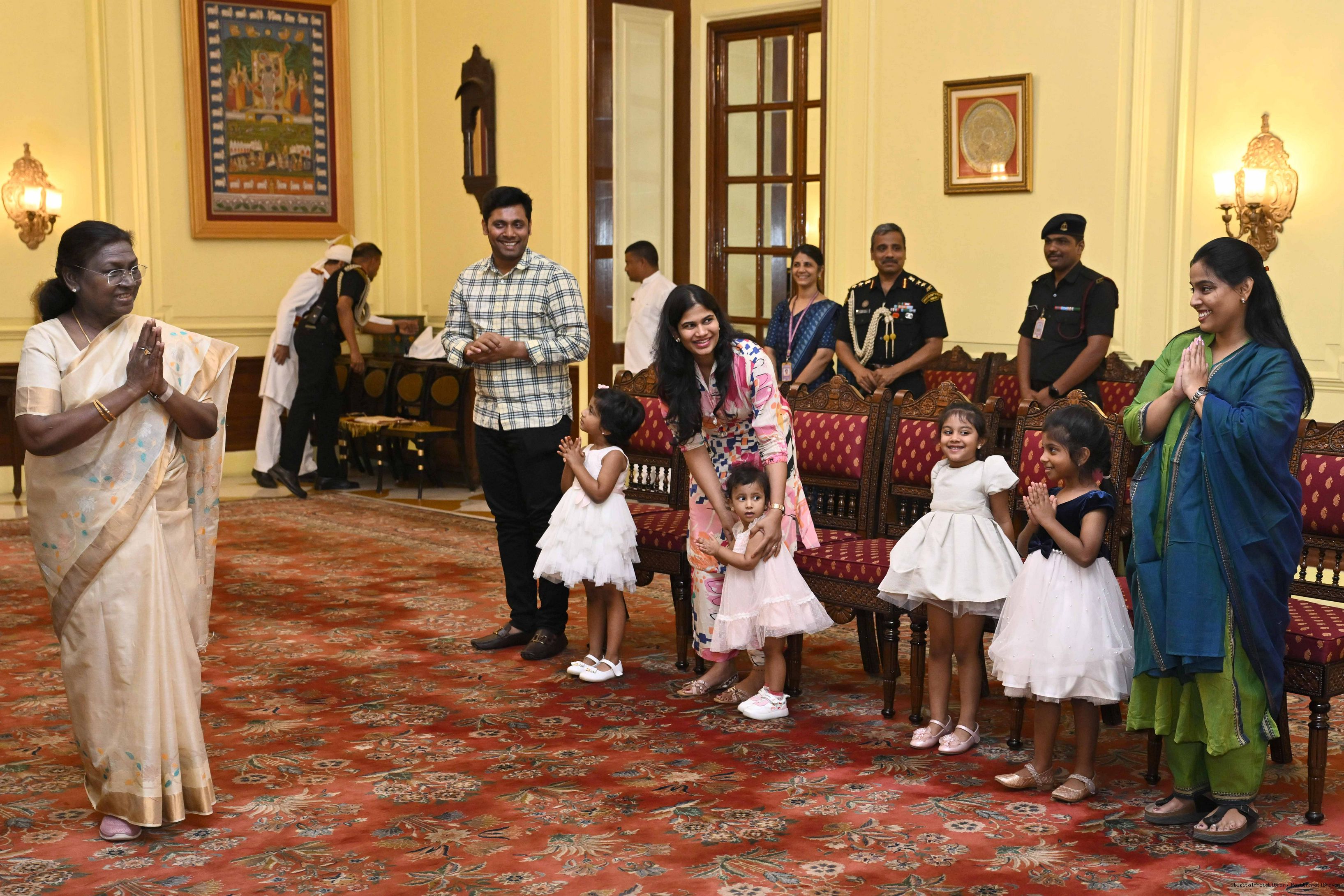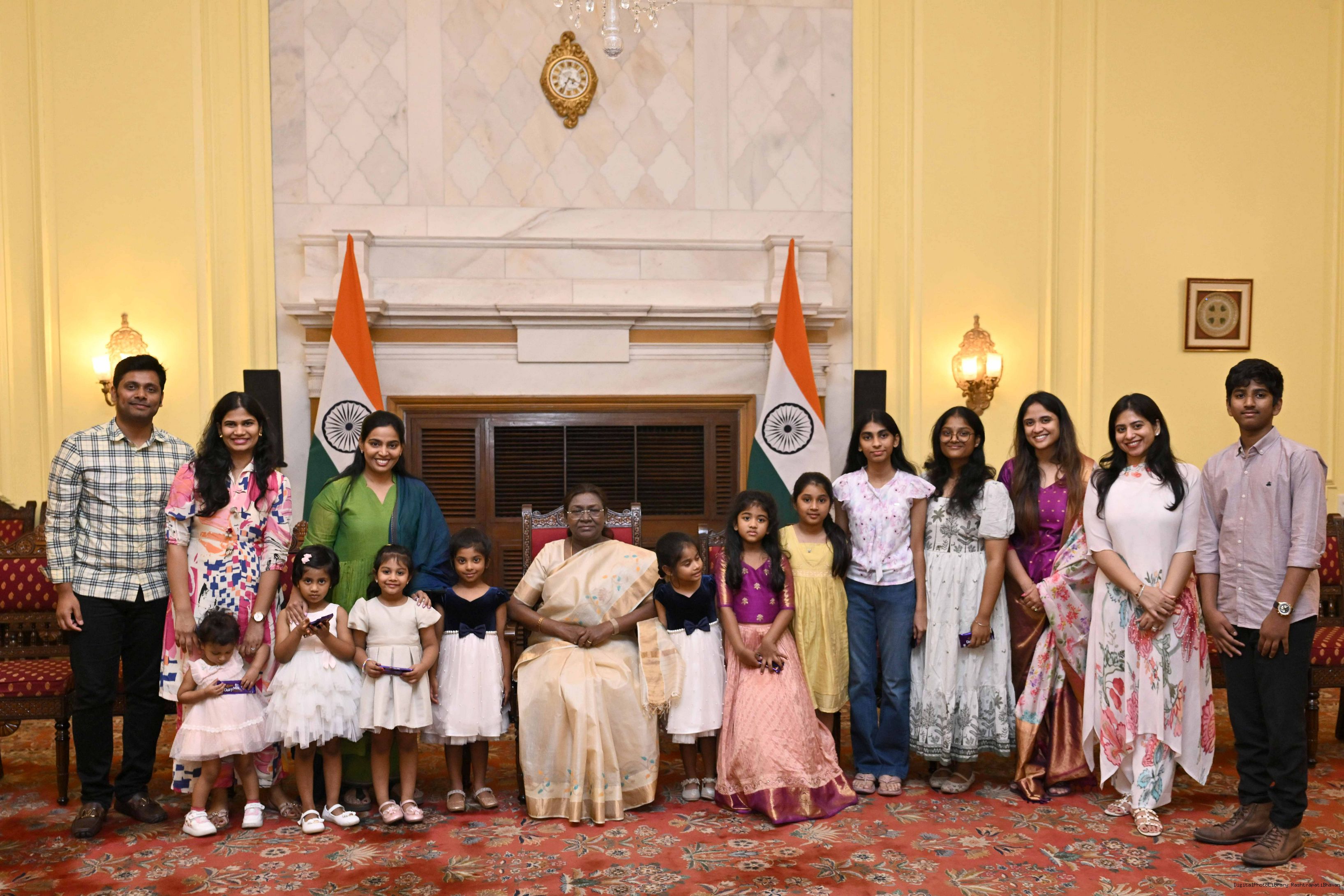 | Caption: | Smt. Bandaru Vijaya Laxmi along with 16 Family Members meeting with the President of India, Smt. Droupadi Murmu at Rashtrapati Bhavan on March 21, 2025. |