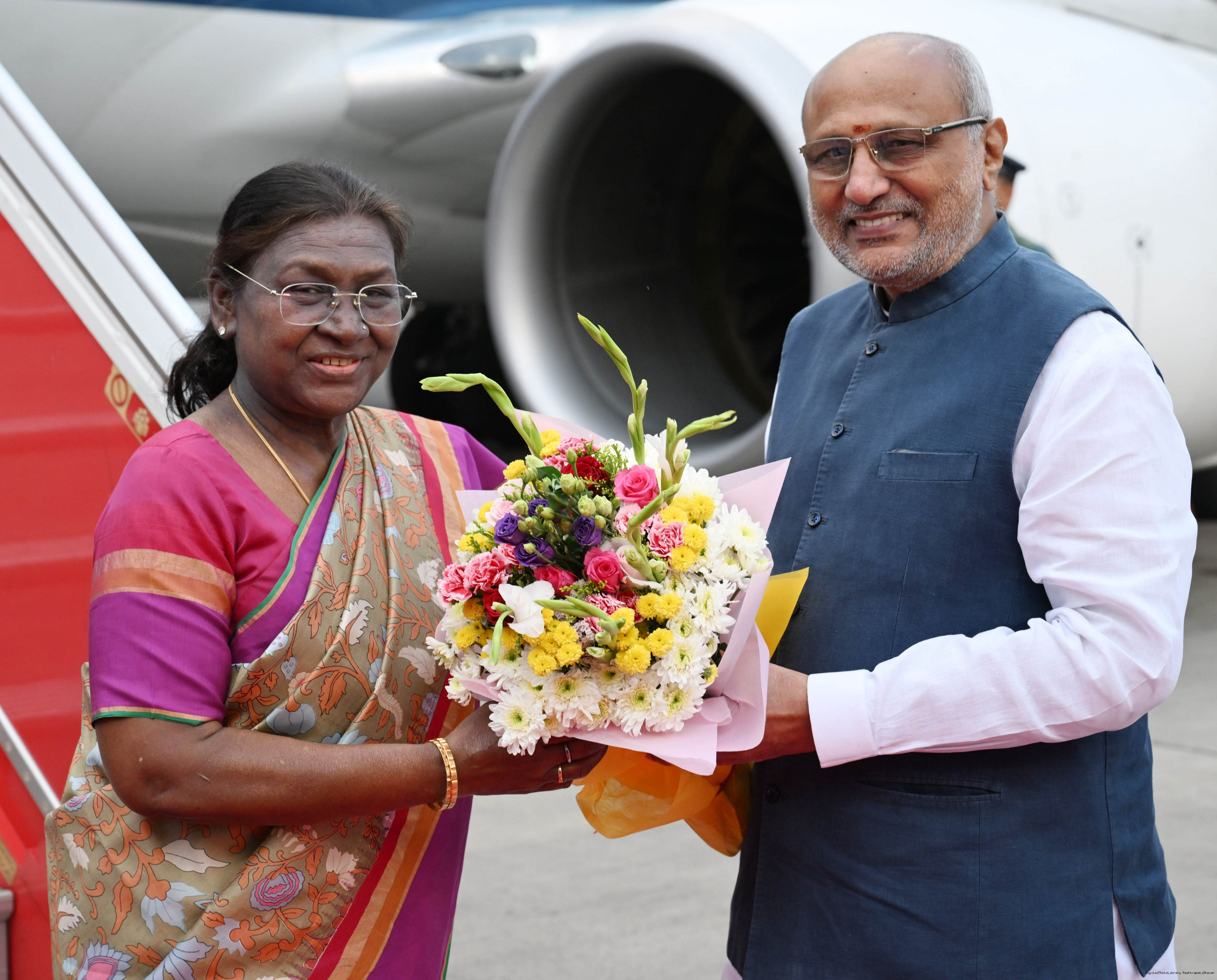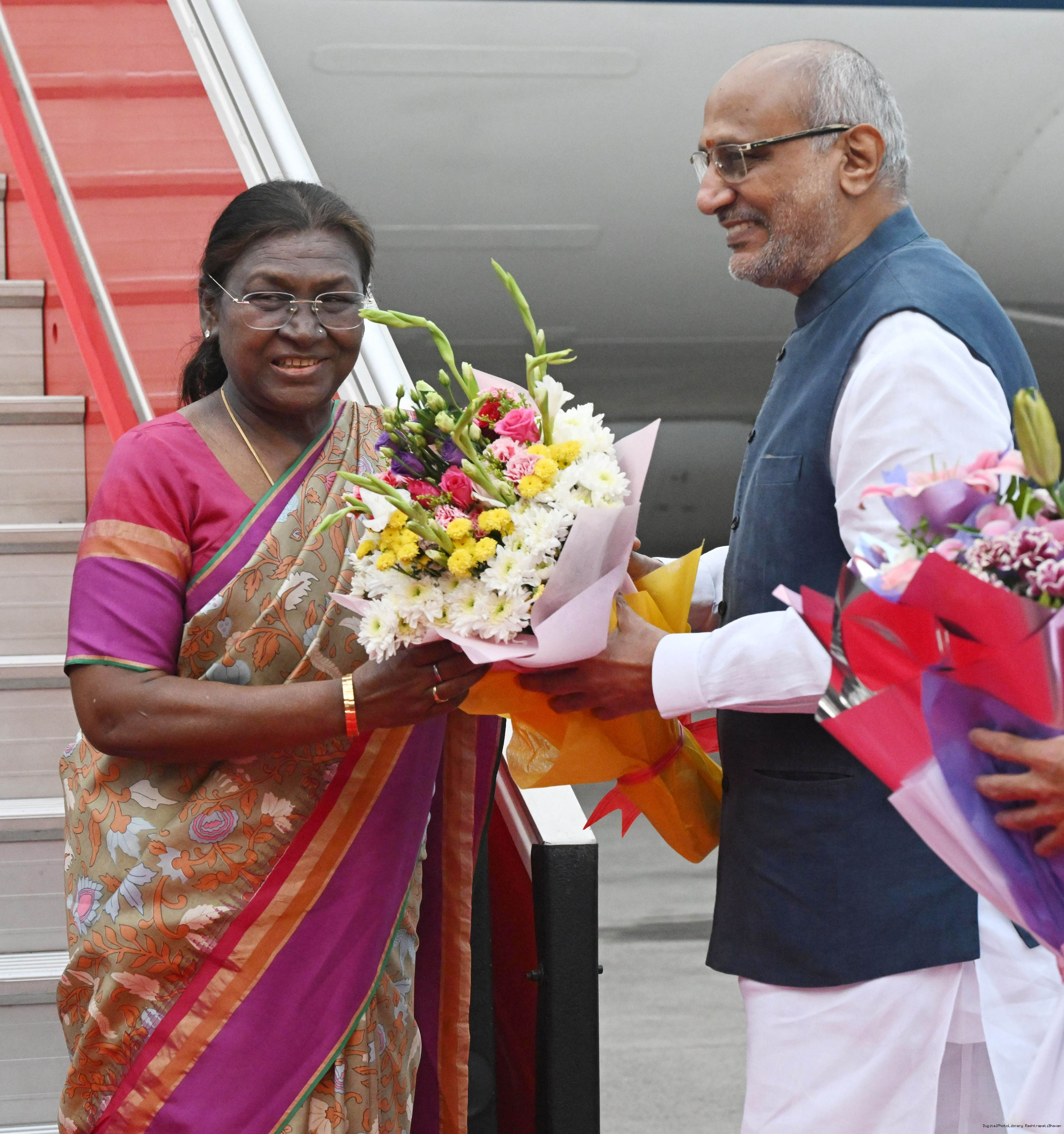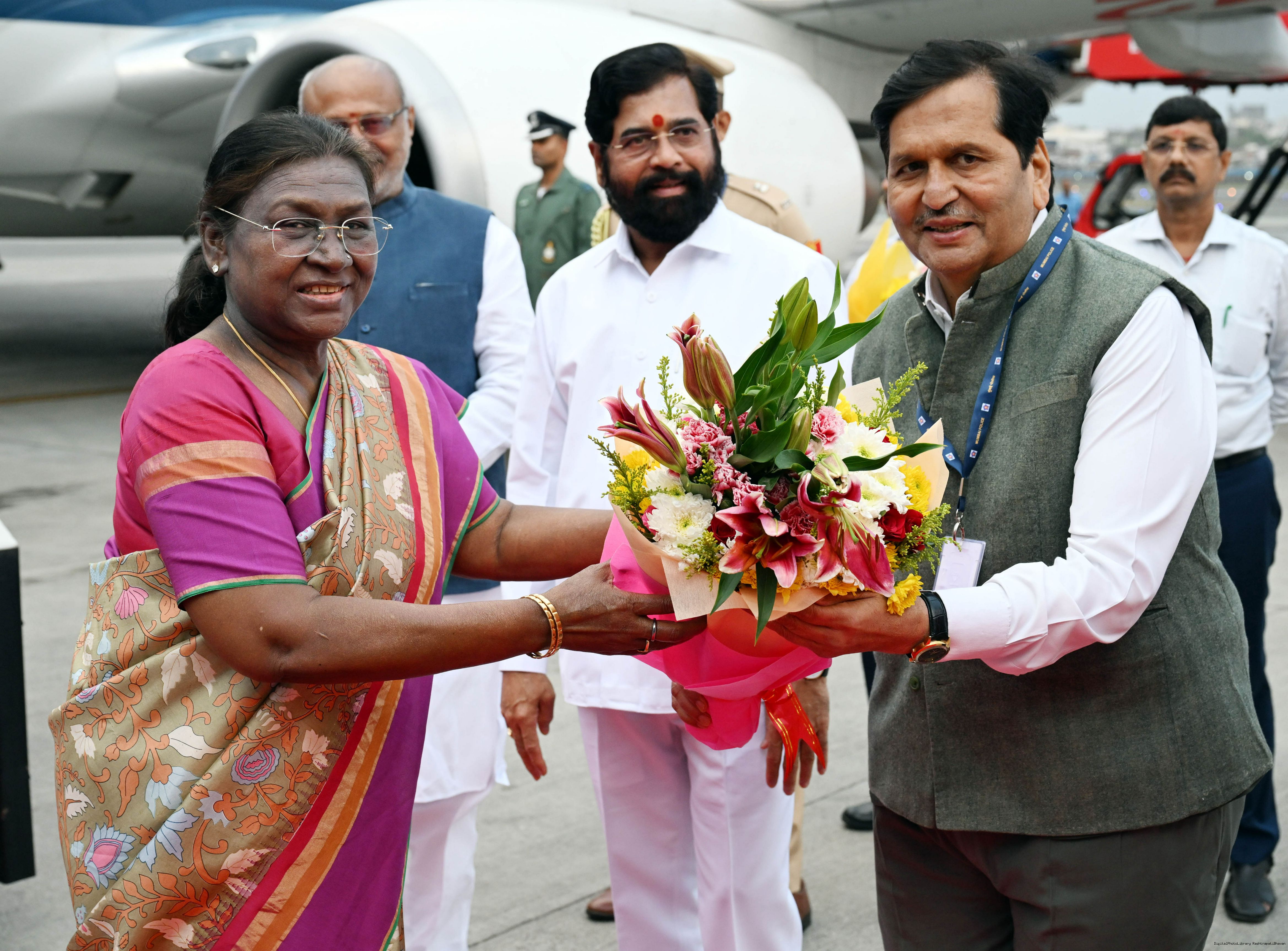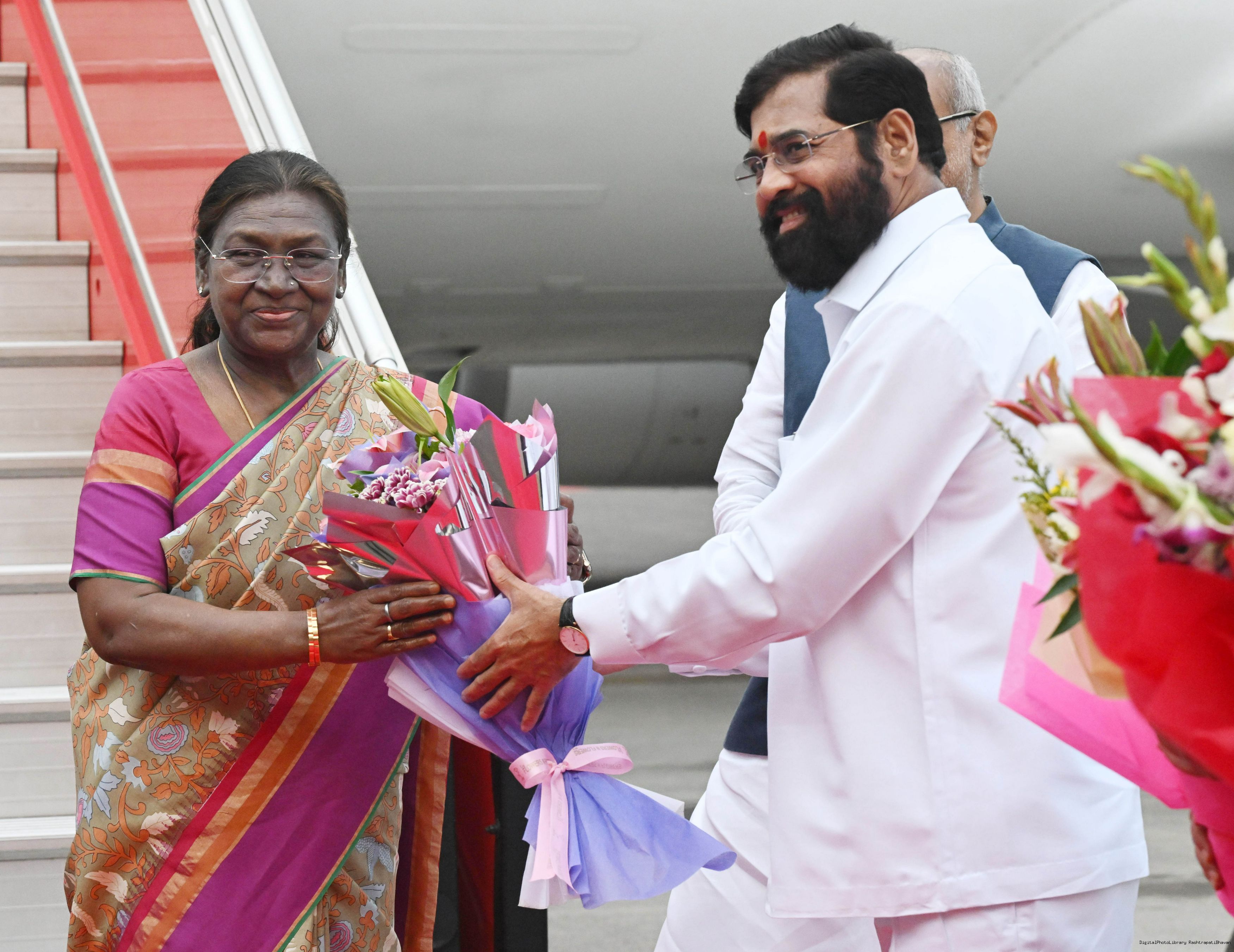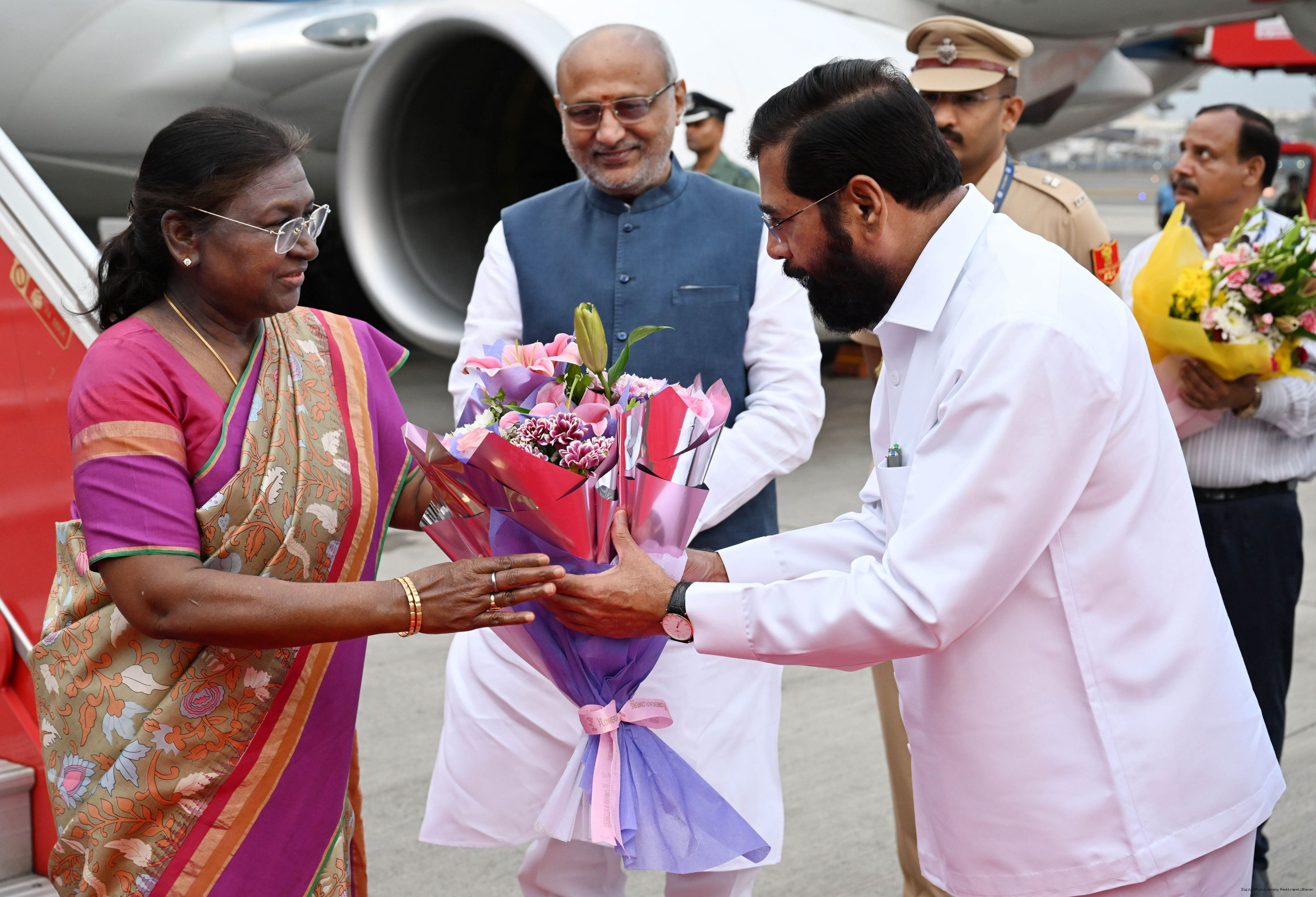 | Caption: | The Governor of Maharashtra, Shri C.P. Radhakrishnan and Deputy Chief Minister, Shri Eknath Shinde received the President of India, Smt. Droupadi Murmu on her arrival in Mumbai on April 1, 2025 |