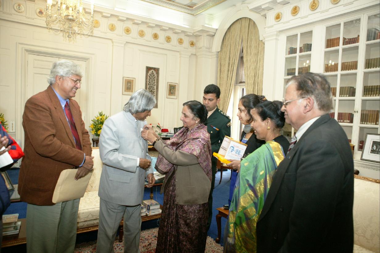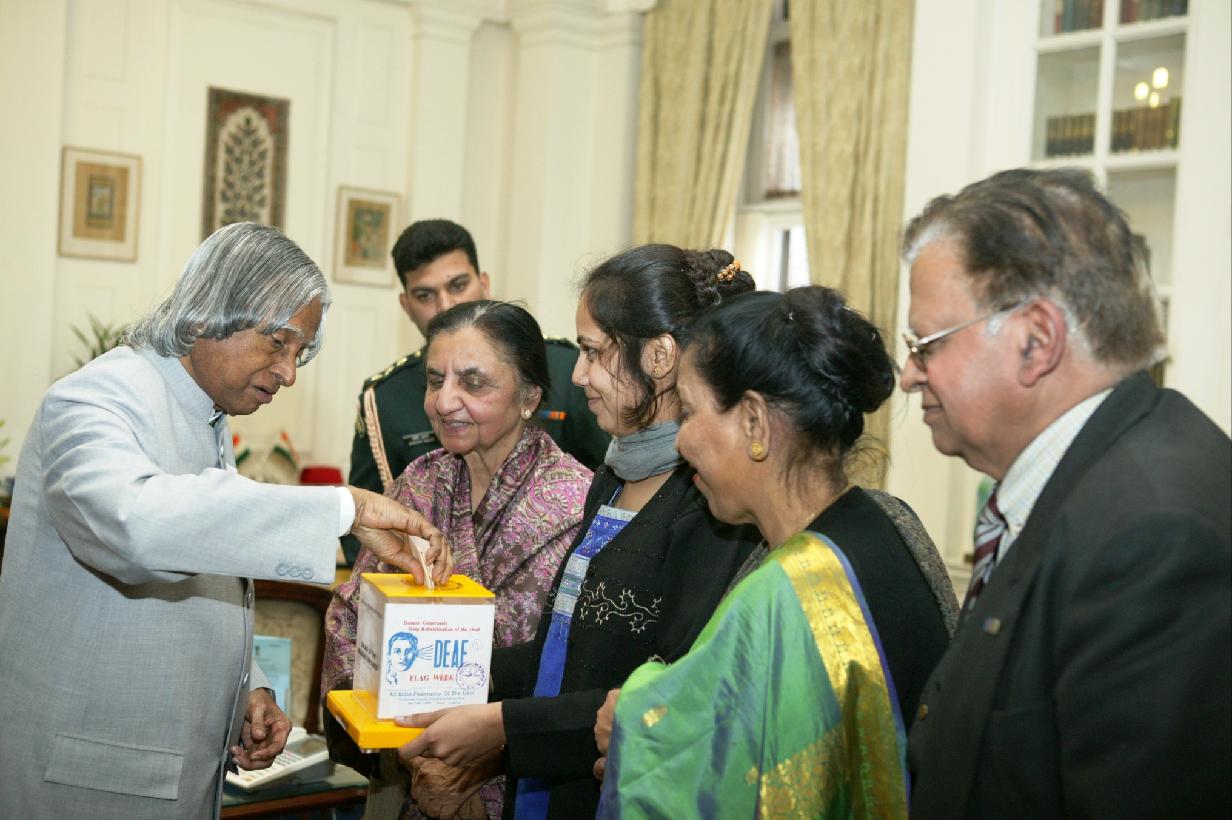 | Caption: | The President of India, Dr A P J Abdul Kalam with the Members of All India Federation of the Deaf to pining a Flag to the President at Rashtrapati Bhavan in New Delhi on Jan 30, 2004 |