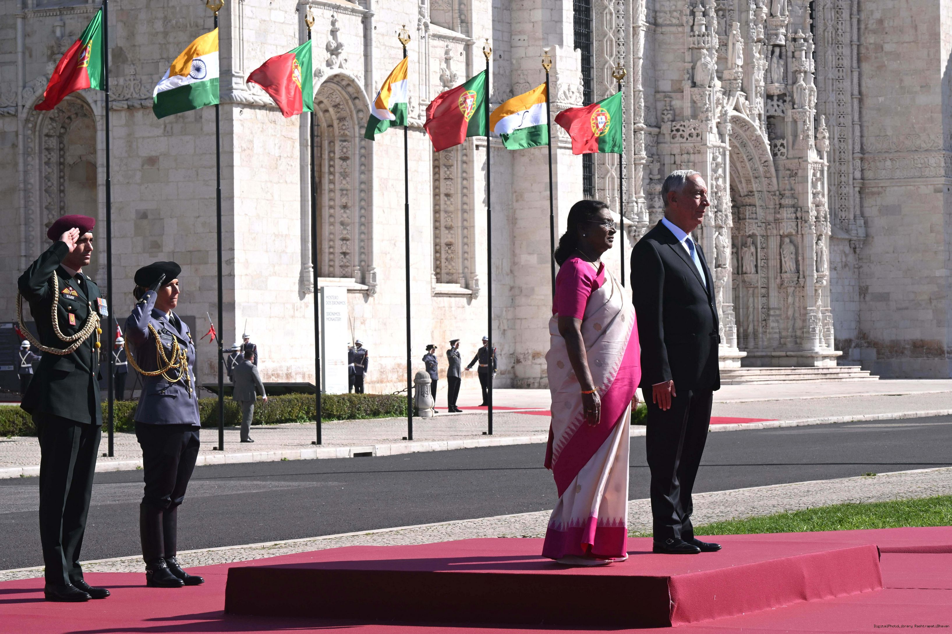 | Caption: | The President of India, Smt. Droupadi Murmu was received by President Marcelo Rebelo de Sousa of Portugal at the historic ‘Praca do Imperio’ in Lisbon on April 7, 2025. She was accorded a ceremonial welcome with the Guard of Honour. |