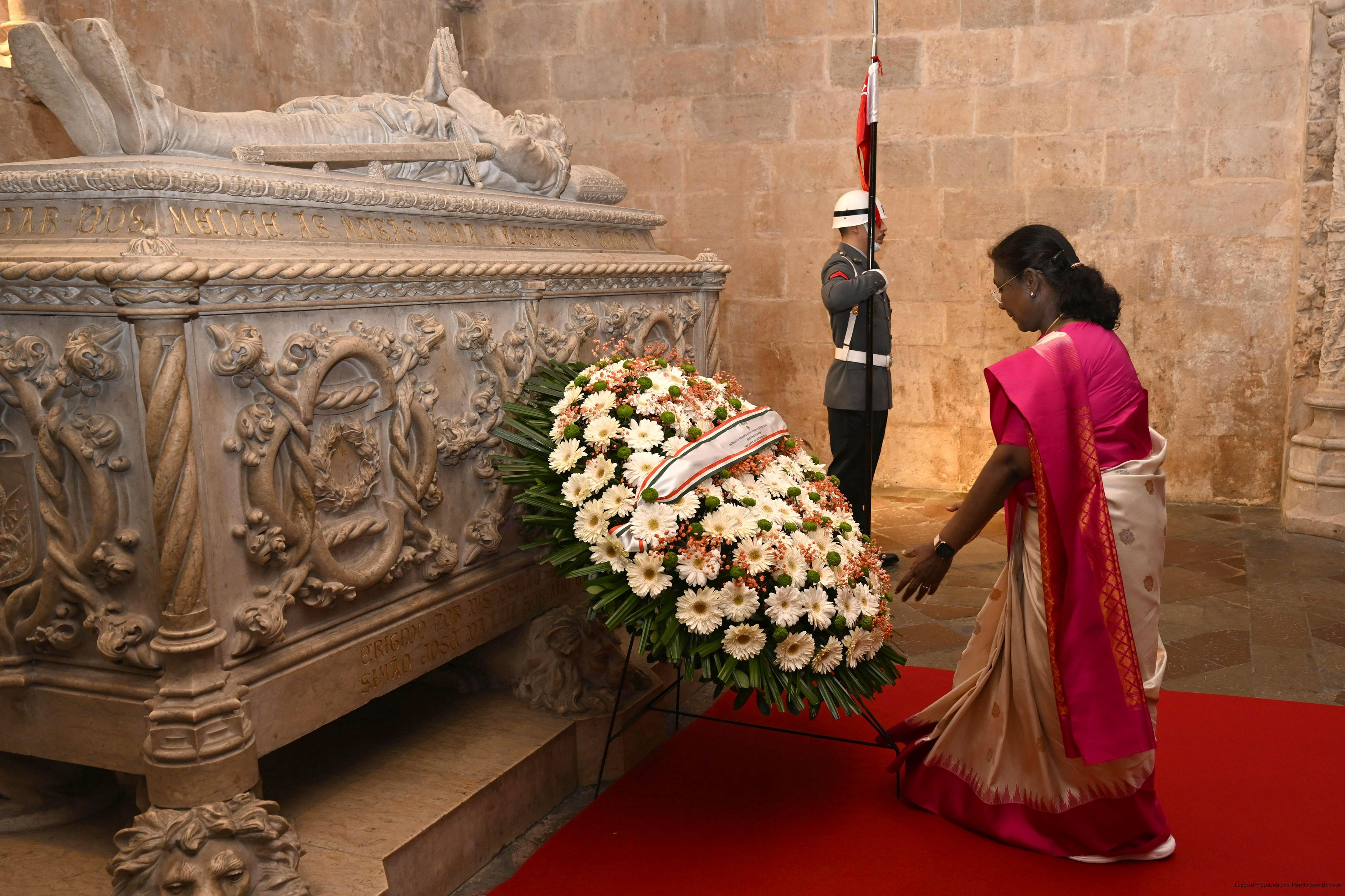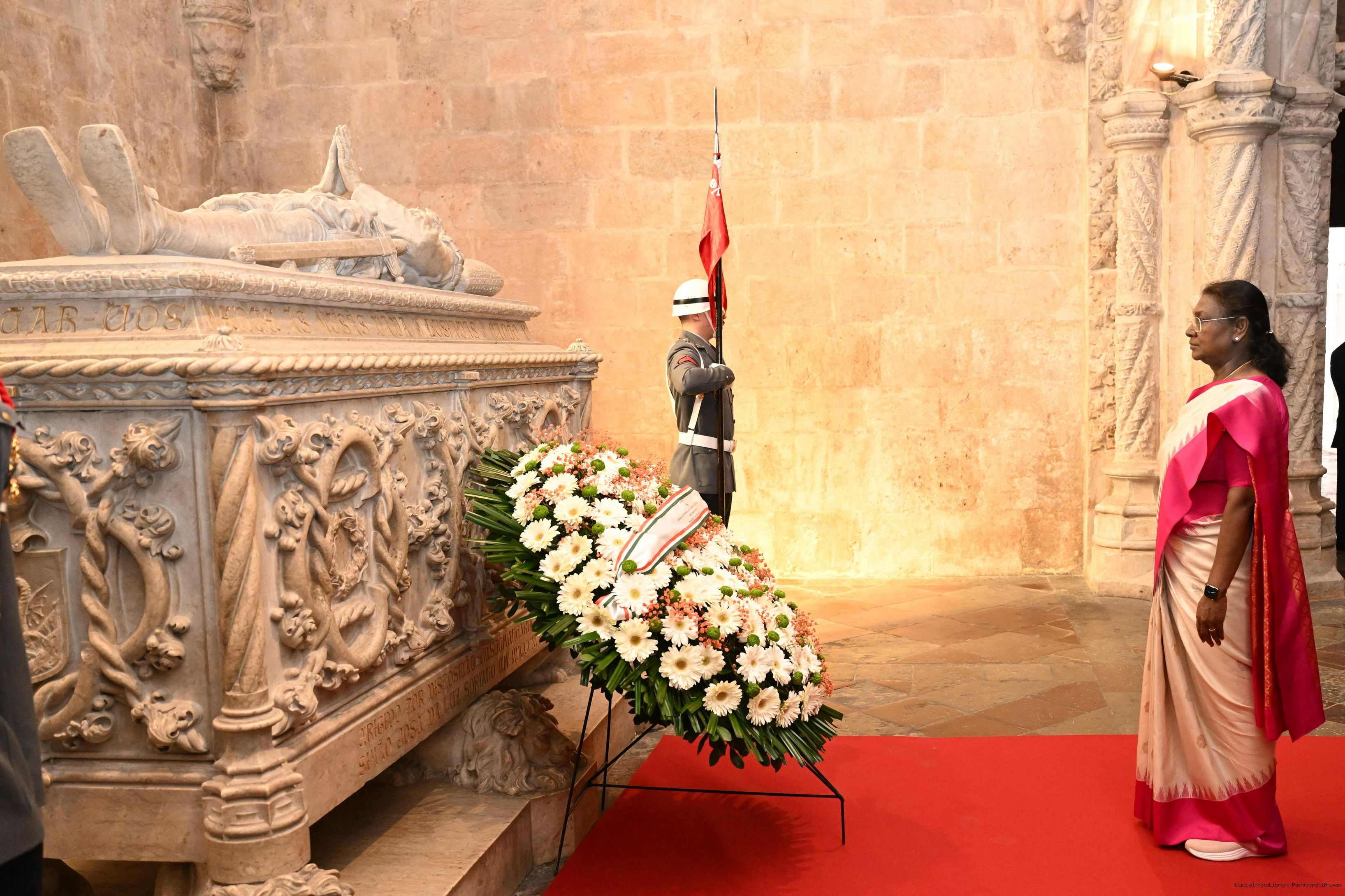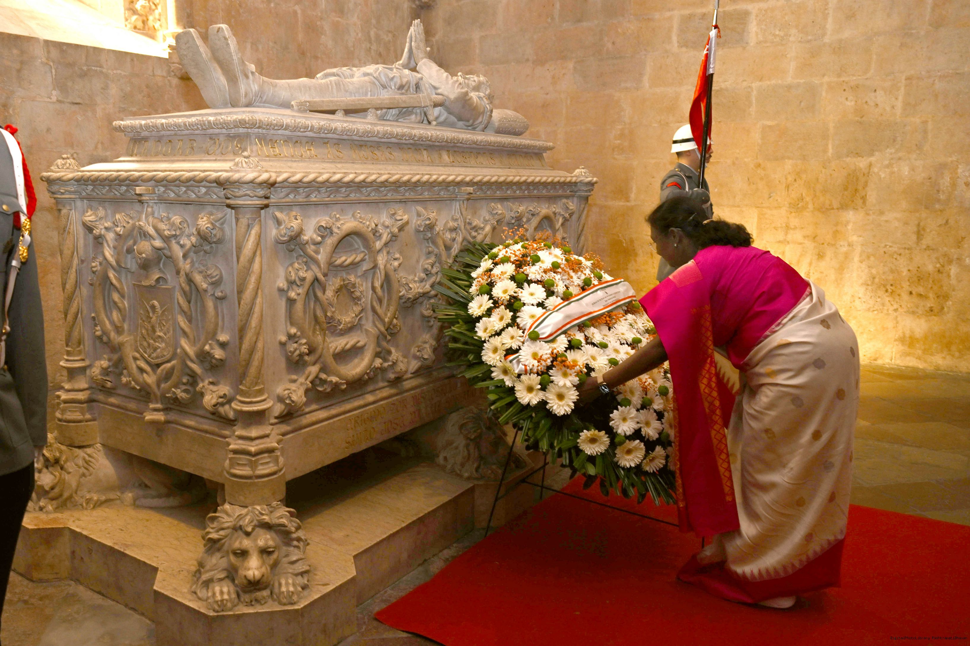 | Caption: | The President of India, Smt. Droupadi Murmu laid wreath at the tomb of Luis Vaz de Camoes – the national poet of Portugal on April 7, 2025. |