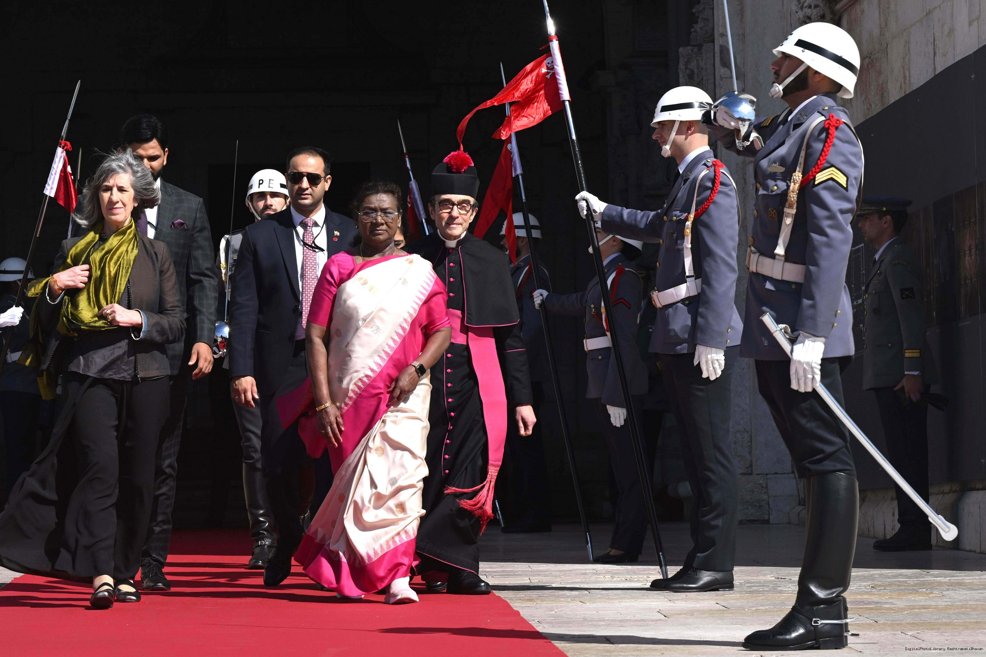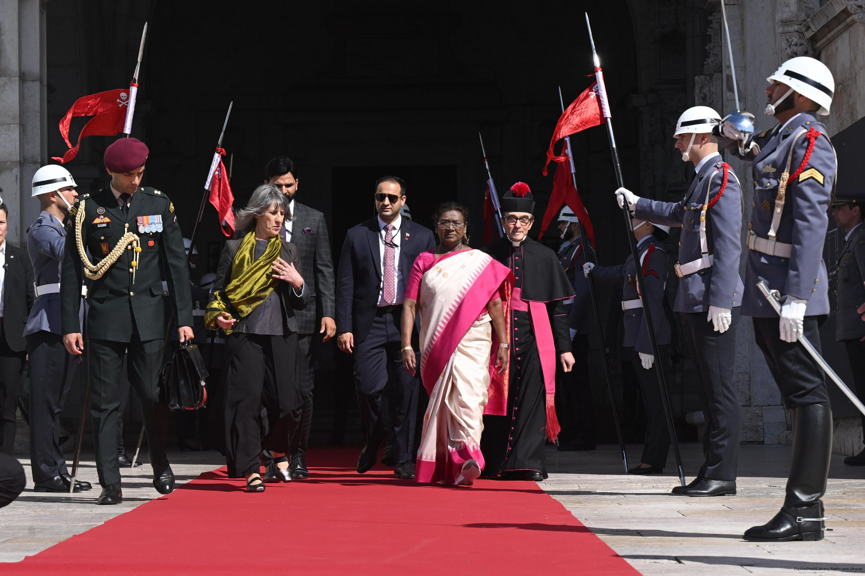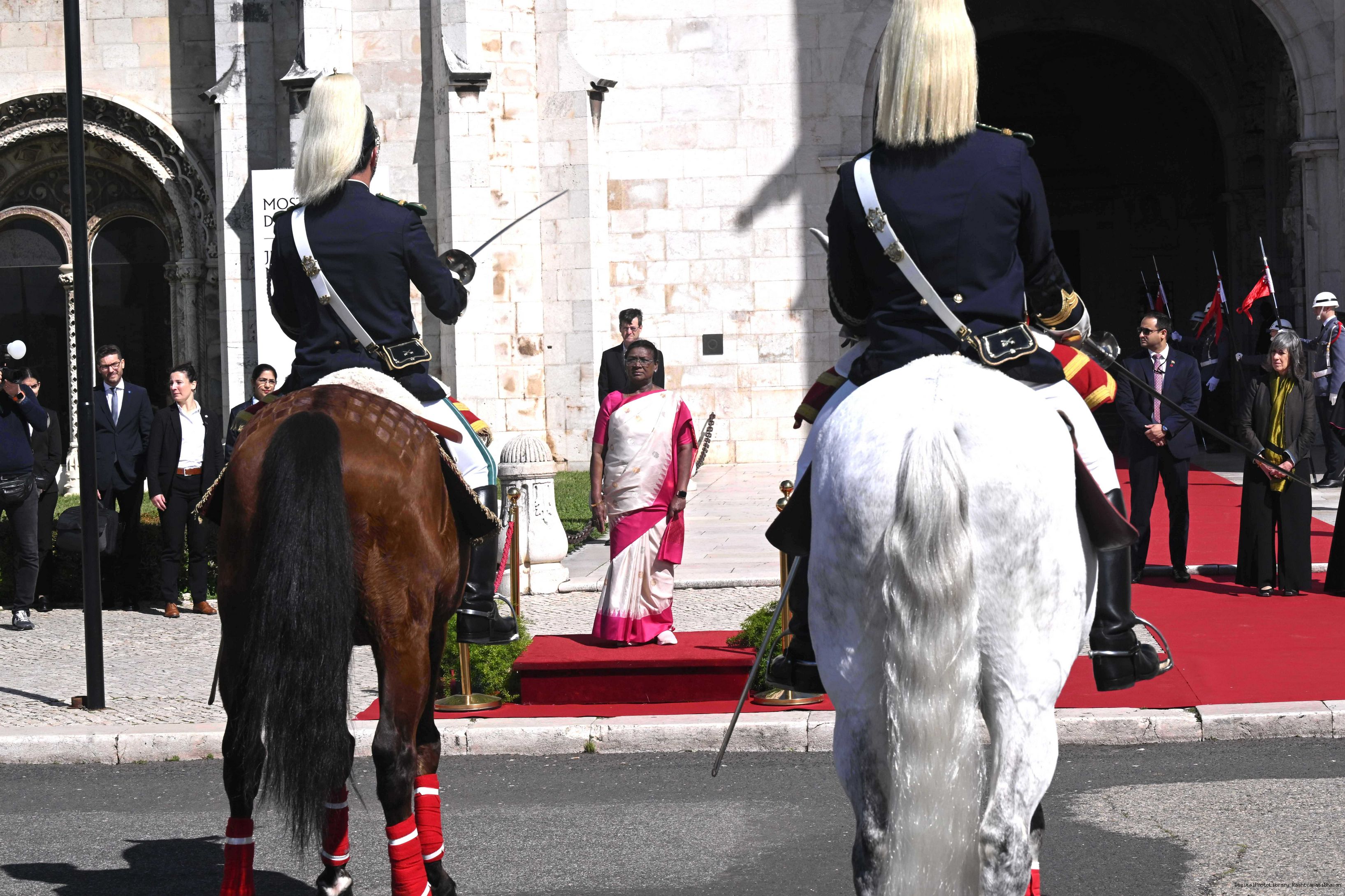 | Caption: | The President of India, Smt. Droupadi Murmu posing a Photo-Opportunity in Front of the Flags in 'Sala das Bicas' at Palacio de Belem Portugal on April 7, 2025. |