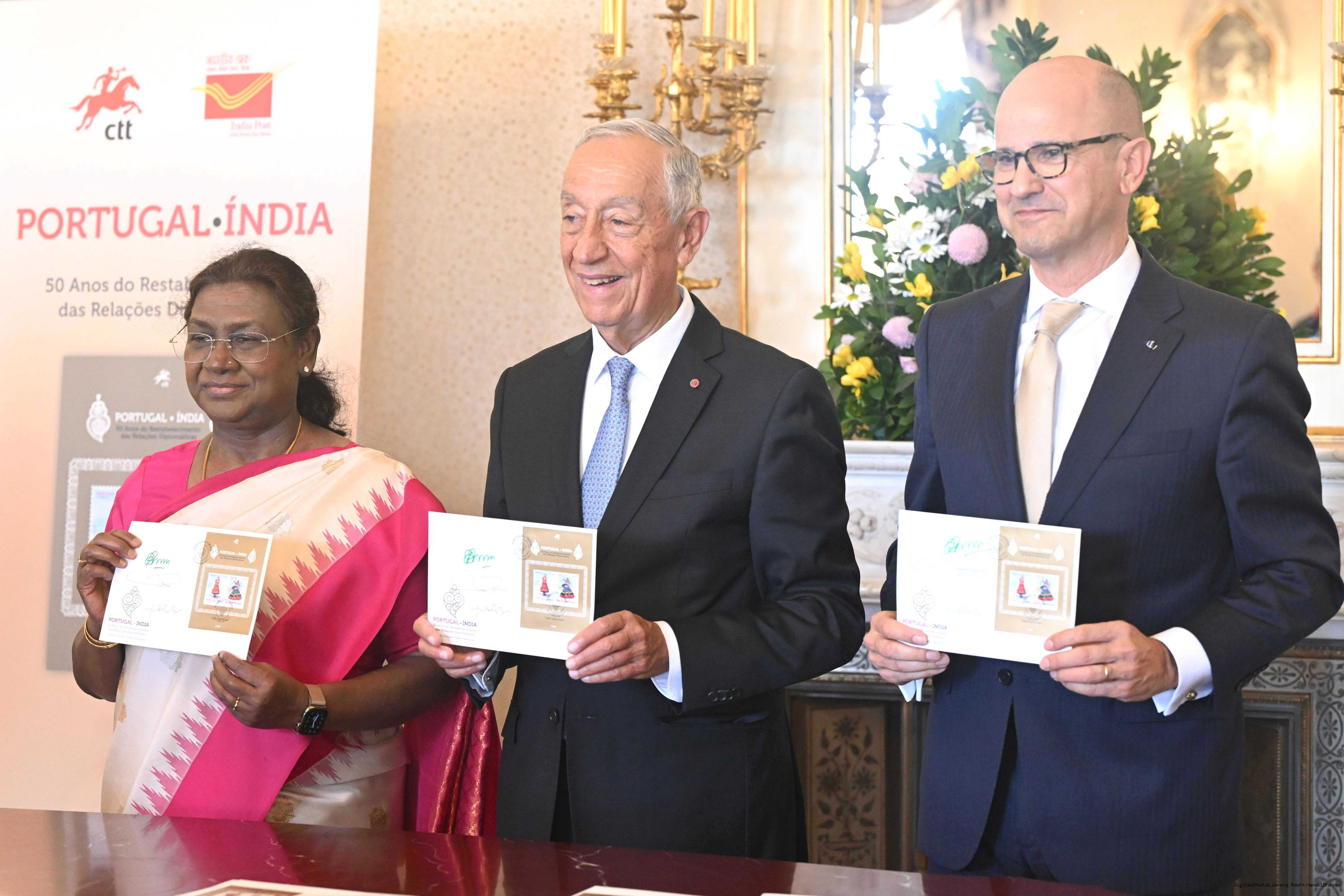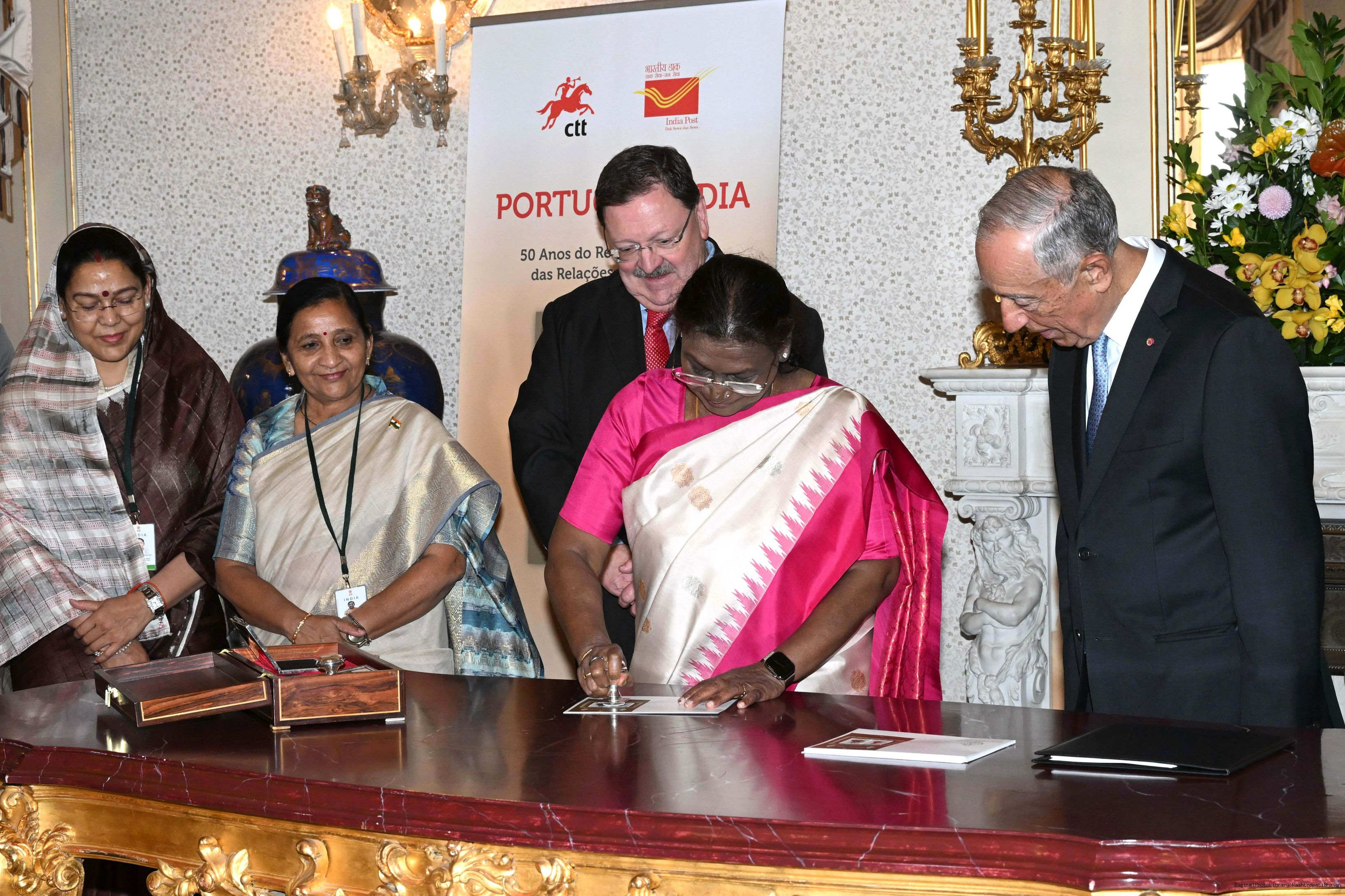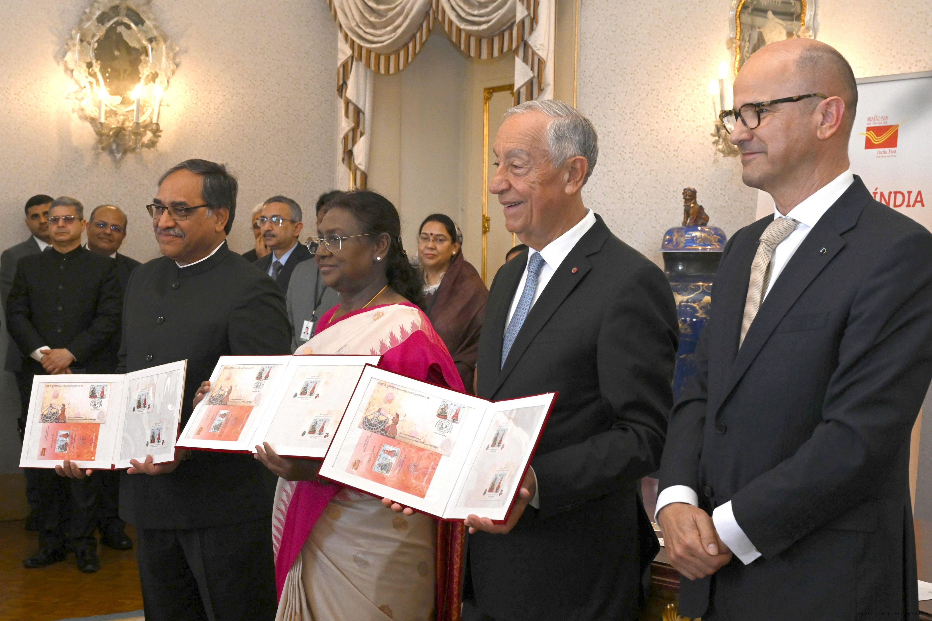 | Caption: | The President of India, Smt Droupadi Murmu and President Marcelo Rebelo de Sousa of Portugal graced the launch of postage stamps commemorating 50 years of diplomatic relations between the two countries in Portugal on April 7, 2025. |