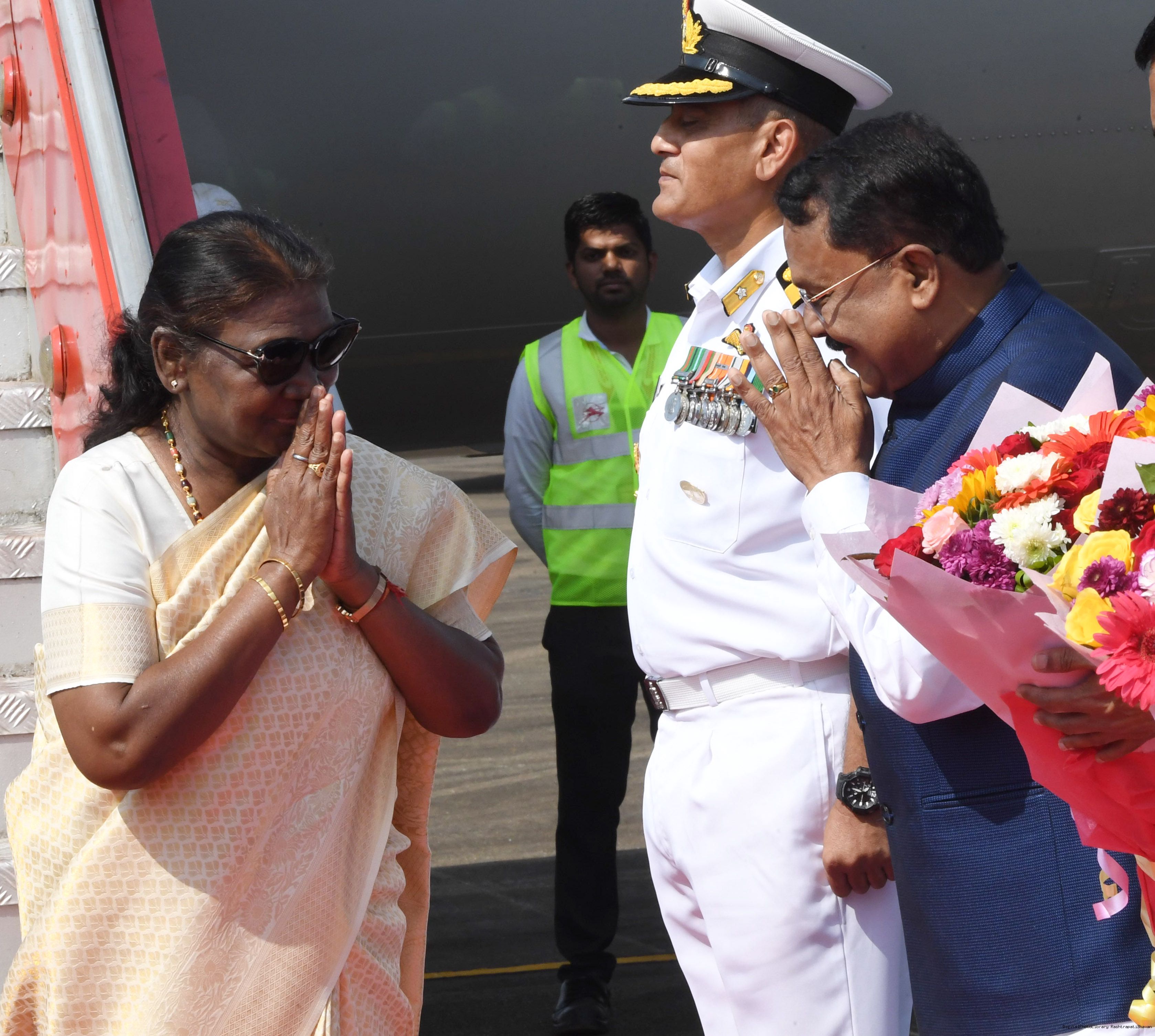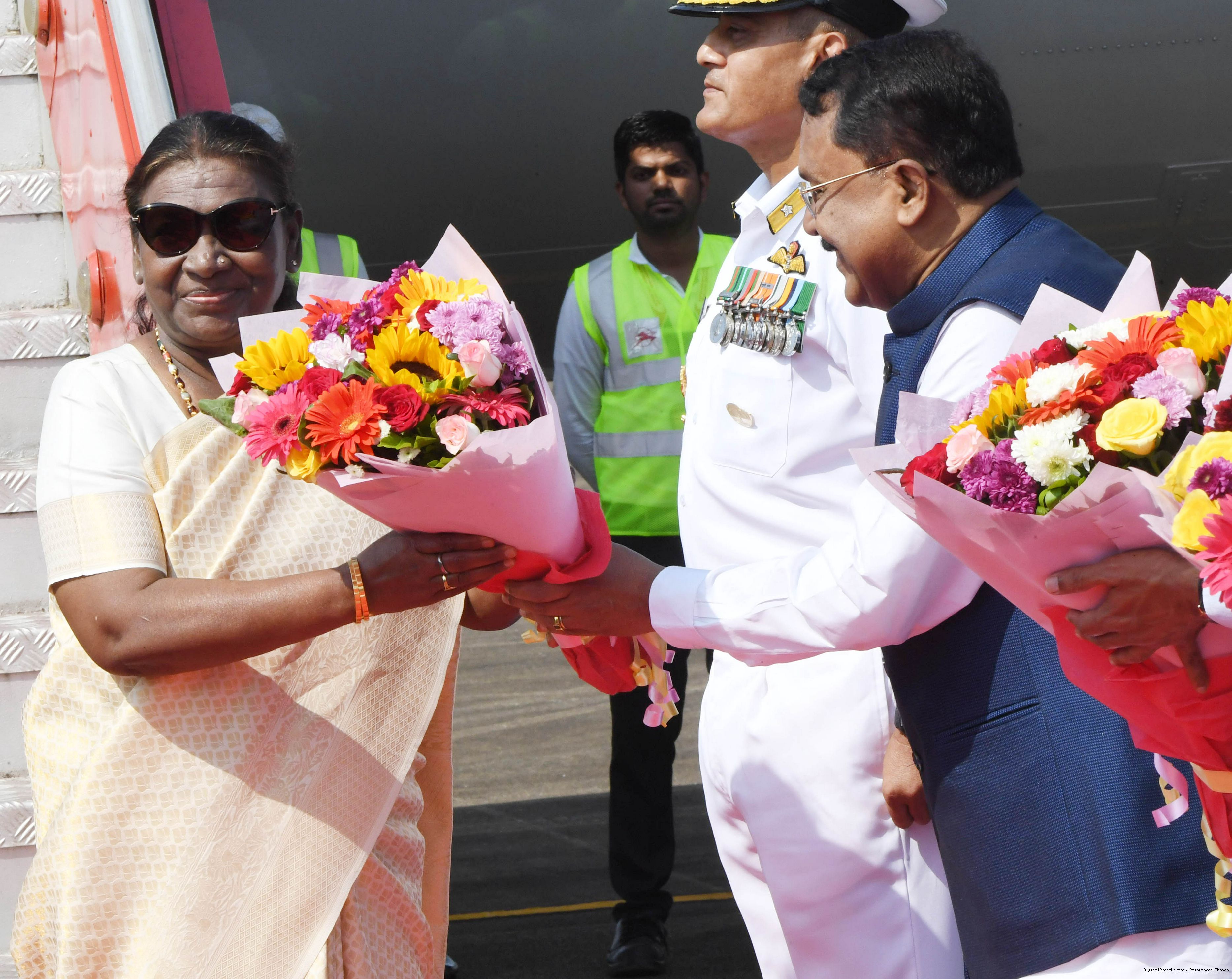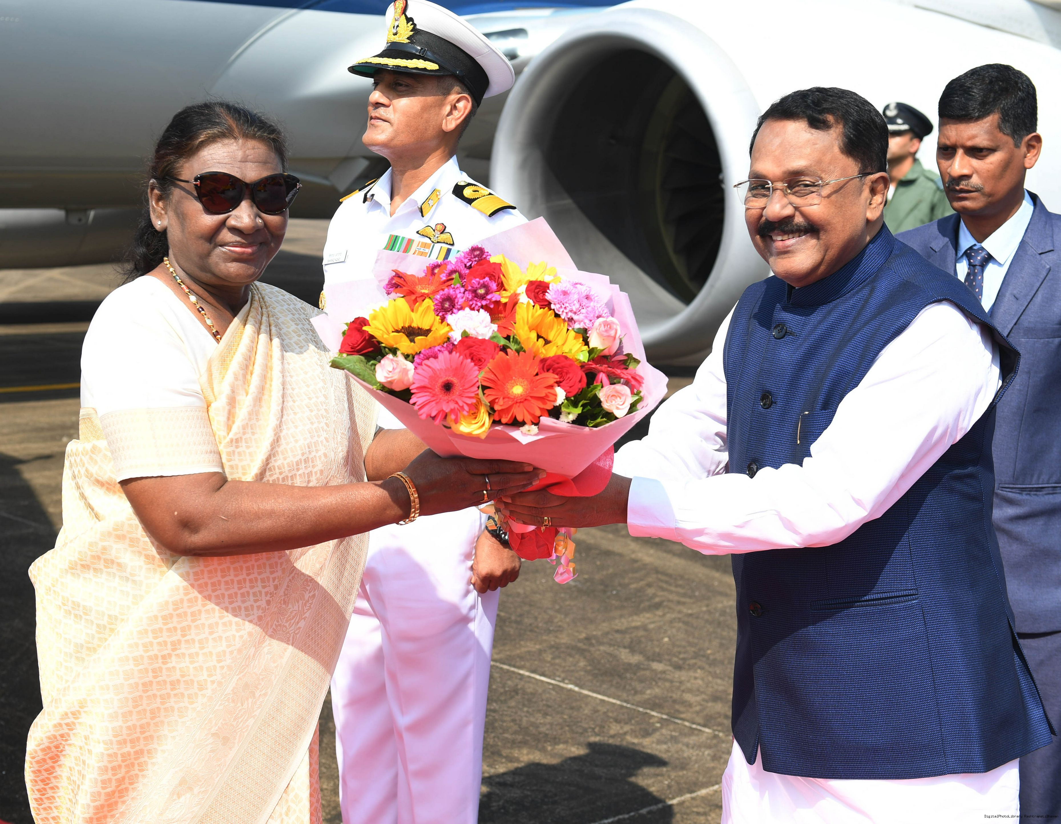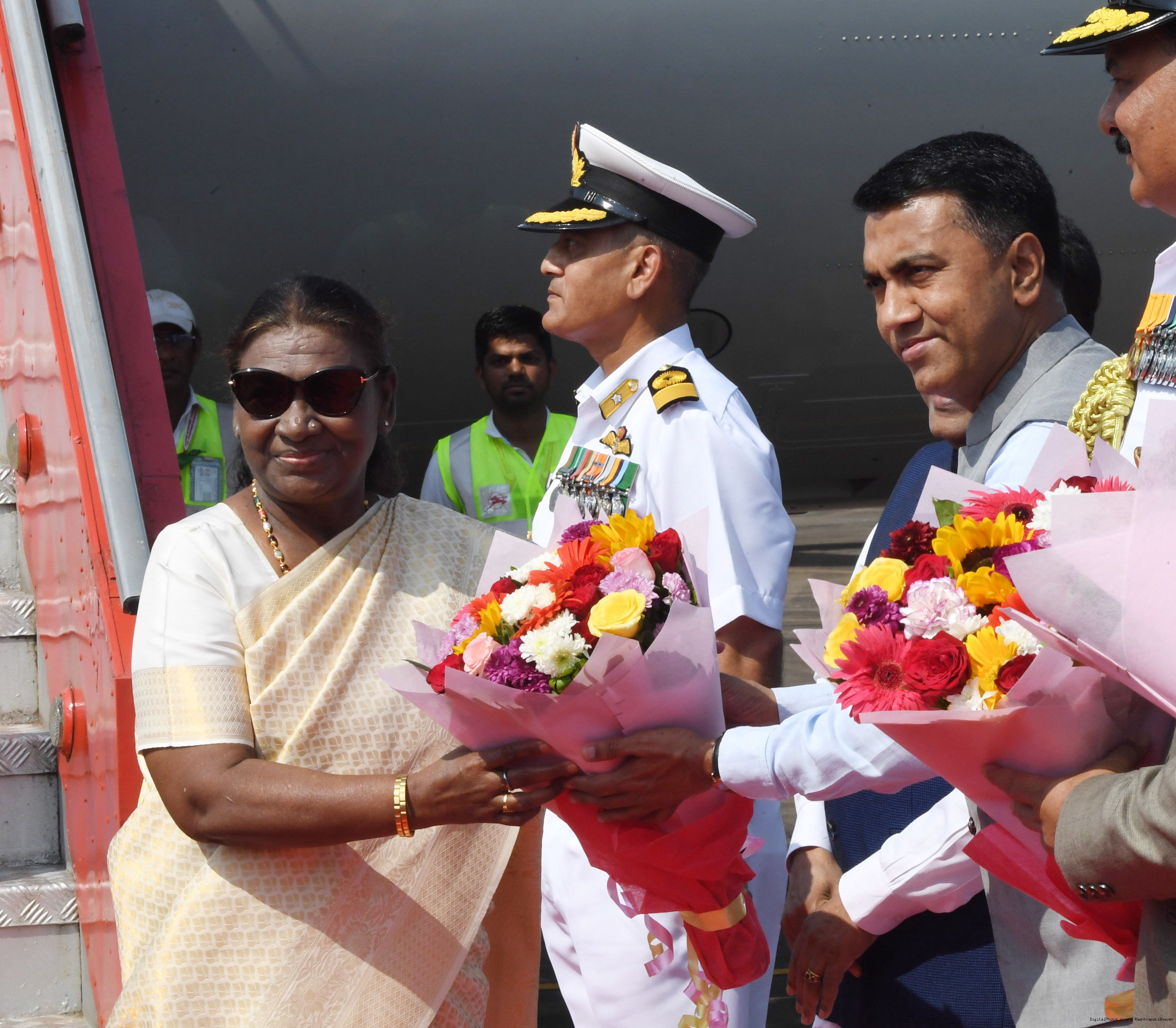 | Caption: | The Governor of Goa, Shri P. S. Sreedharan Pillai and Chief Minister, Dr. Pramod Sawant received the President of India Smt. Droupadi Murmu on her arrival at Dabolim airport, Goa on November 7, 2024. |