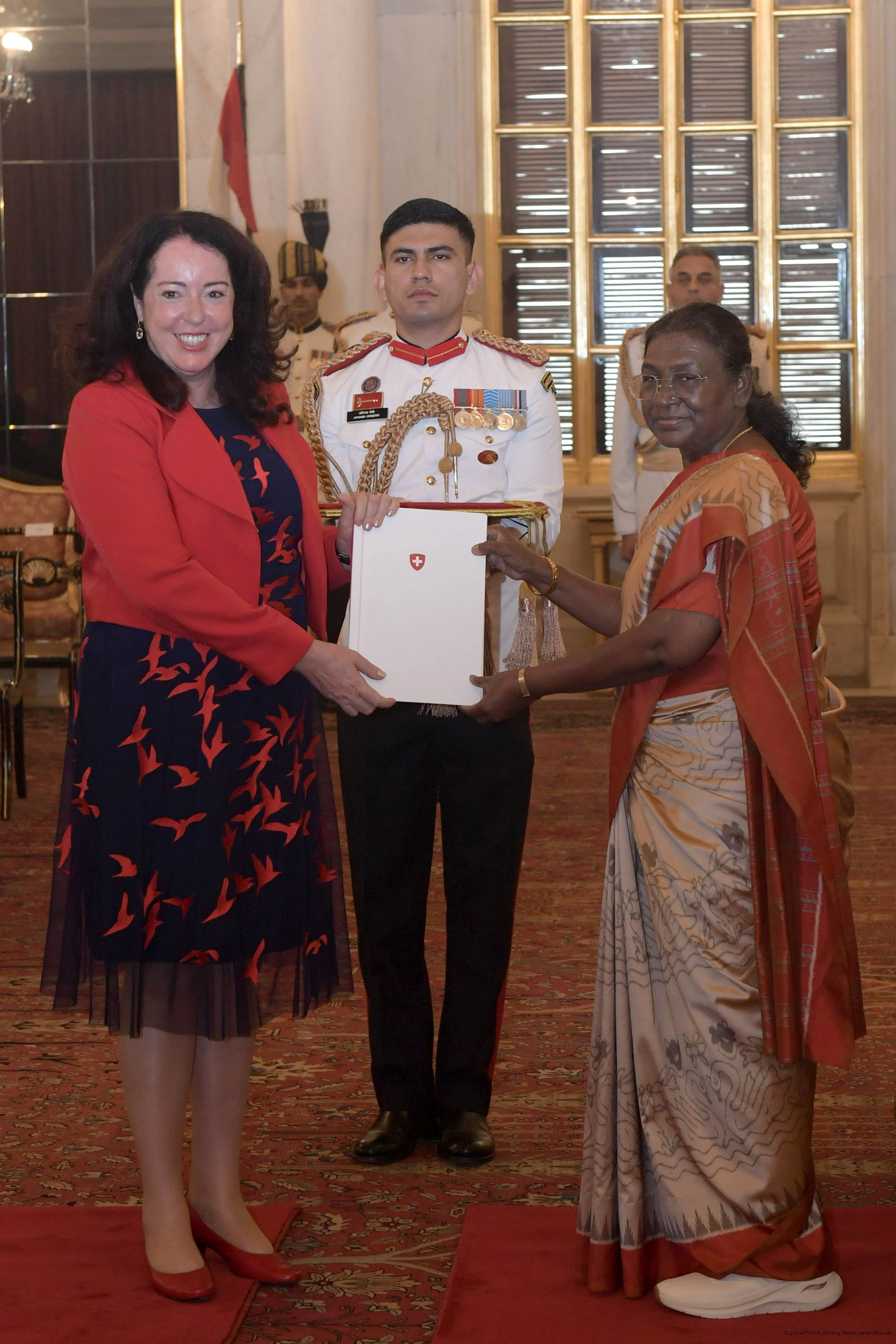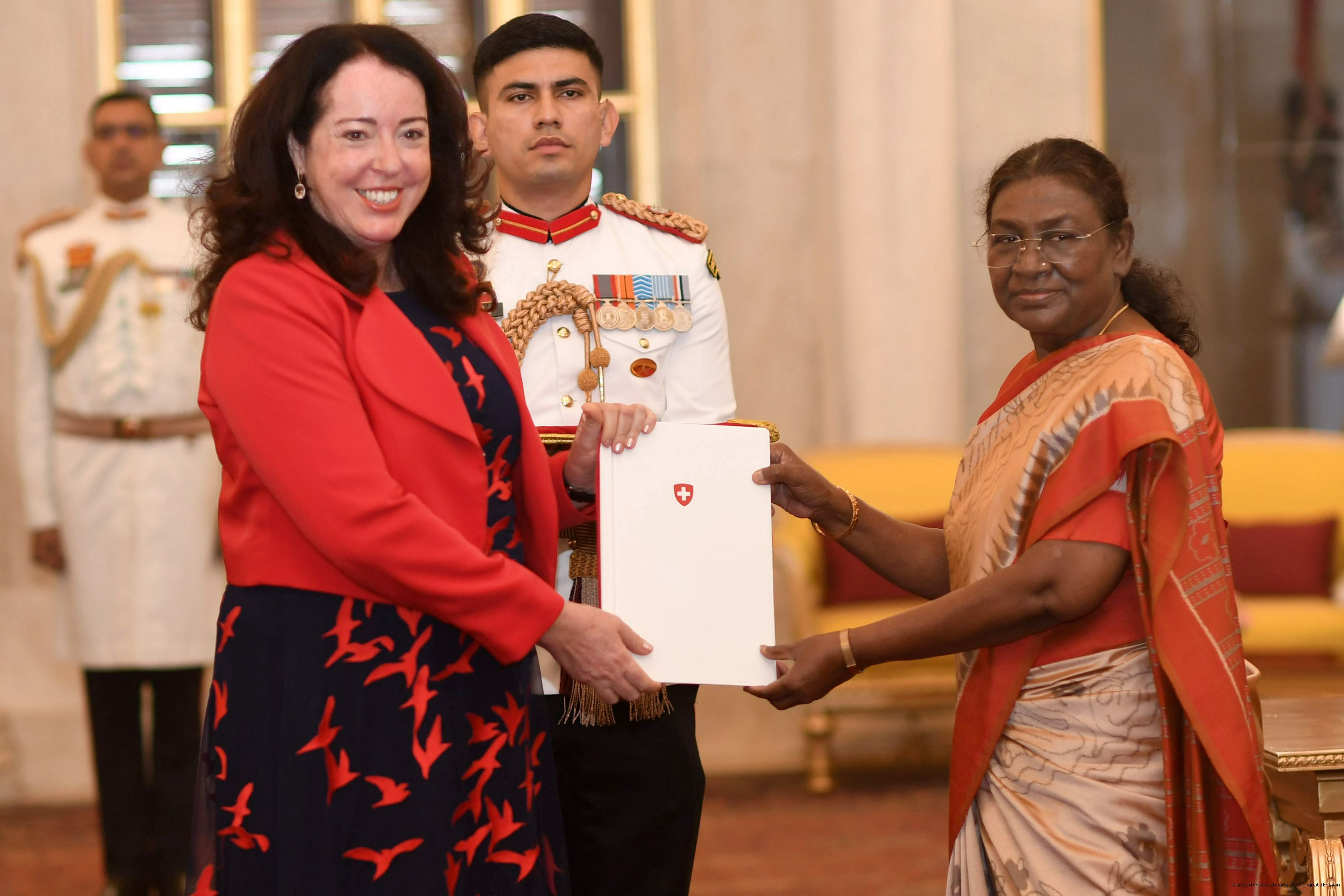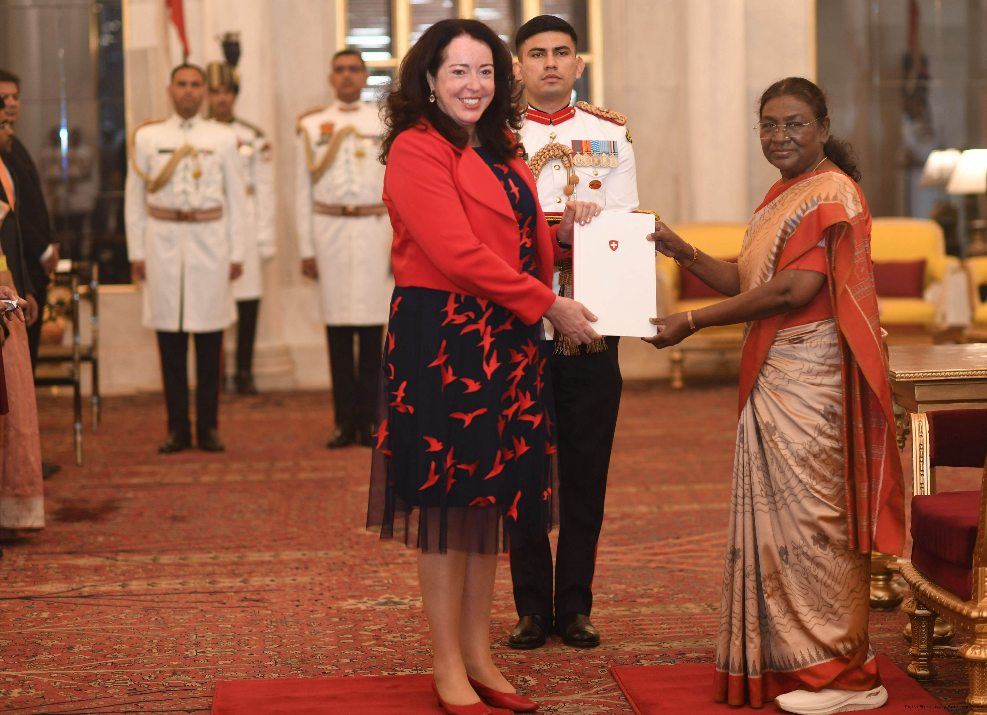 | Caption: | The Ambassador-designate of Switzerland, H.E. Mrs. Maya Tissafi presenting her credentials to the President of India, Smt Droupadi Murmu at Rashtrapati Bhavan in New Delhi on November 18, 2024. |