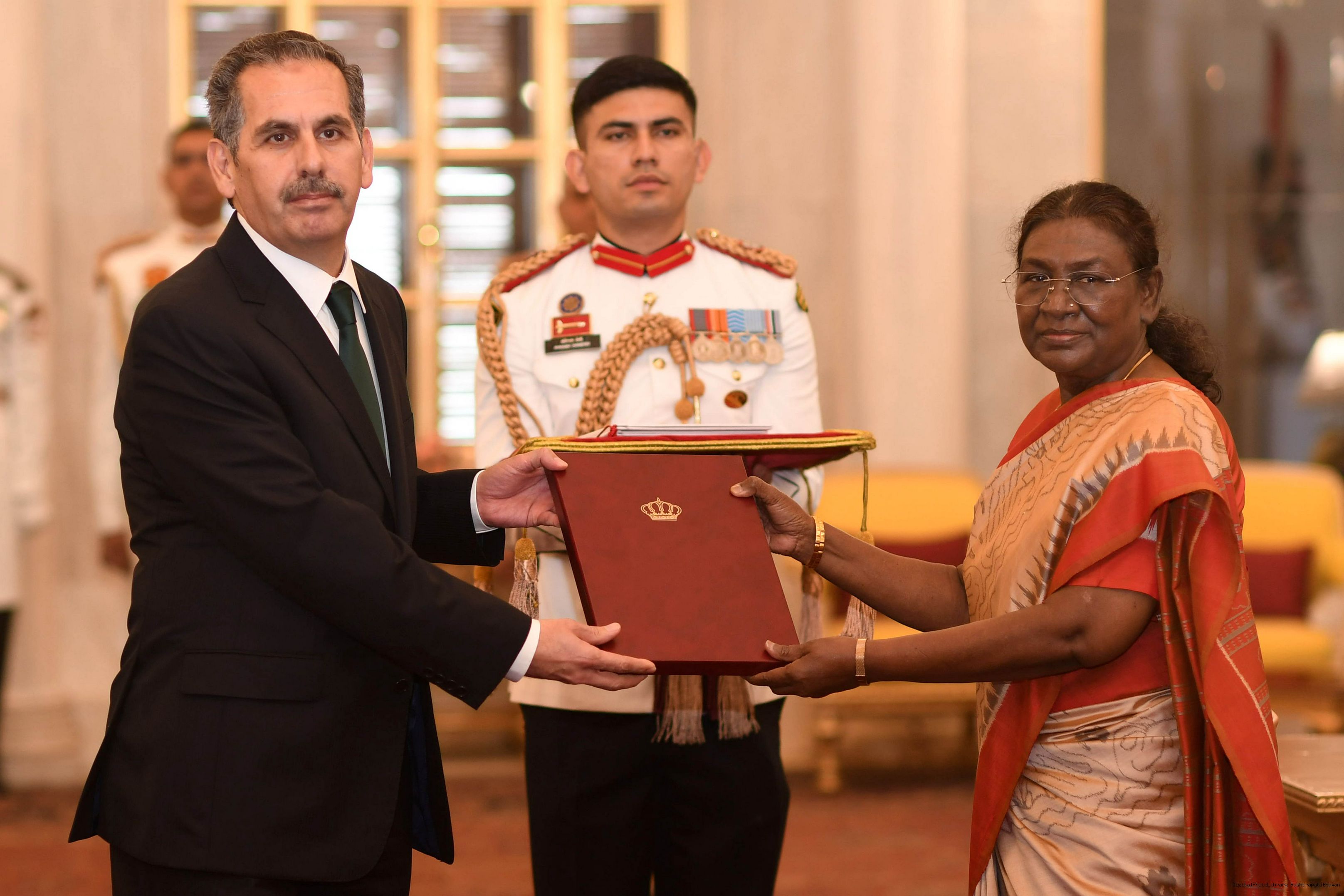 | Caption: | The Ambassador-designate of Hashemite Kingdom of Jordan, H.E. Mr. Yousef Mustafa Ali Abdel Ghani presenting his credentials to the President of India, Smt Droupadi Murmu at Rashtrapati Bhavan in New Delhi on November 18, 2024. |