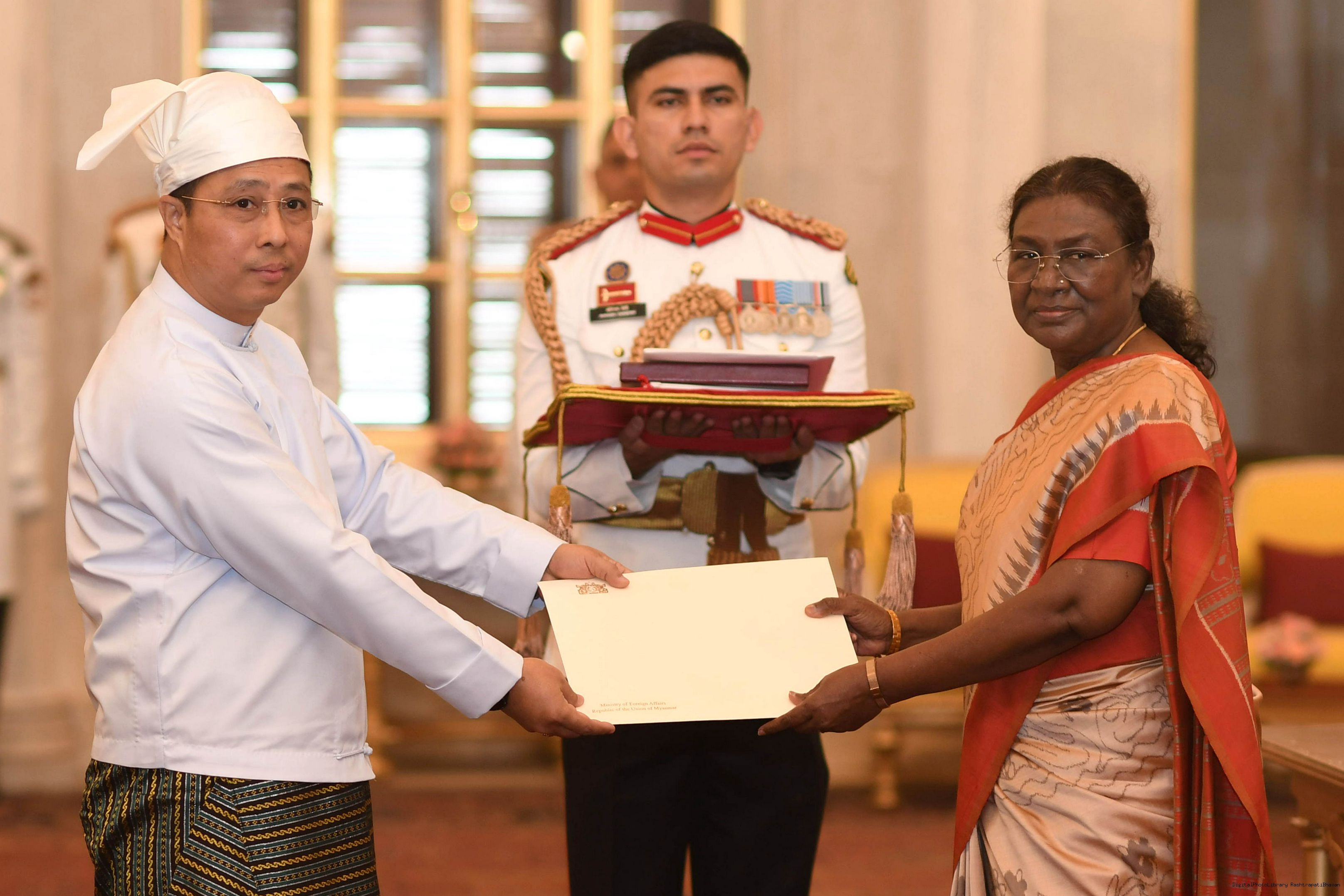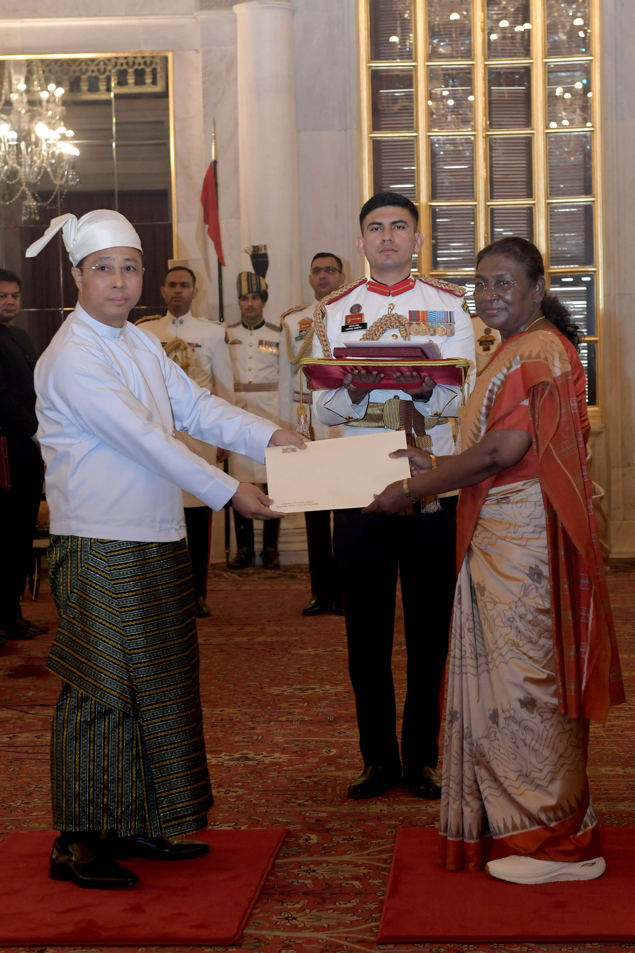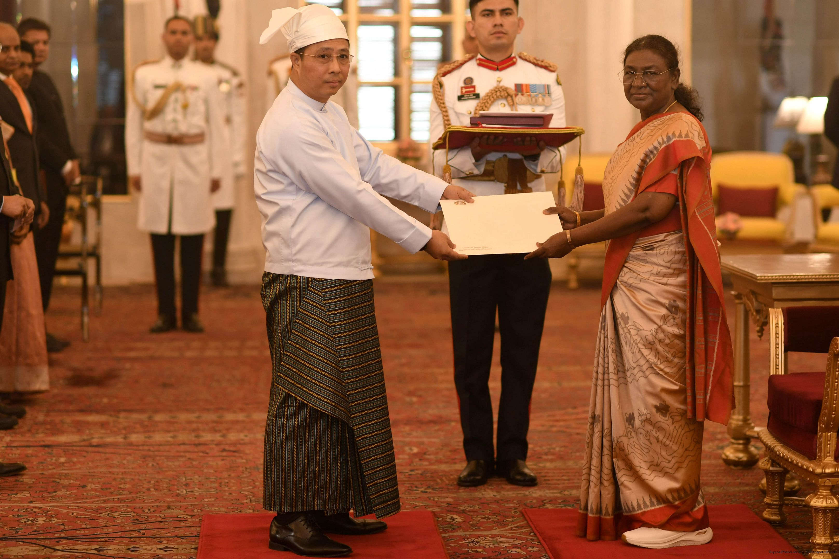 | Caption: | The Ambassador-designate of Republic of Union of Myanmar, H.E. Mr. Zaw Oo presenting his credentials to the President of India, Smt Droupadi Murmu at Rashtrapati Bhavan in New Delhi on November 18, 2024. |