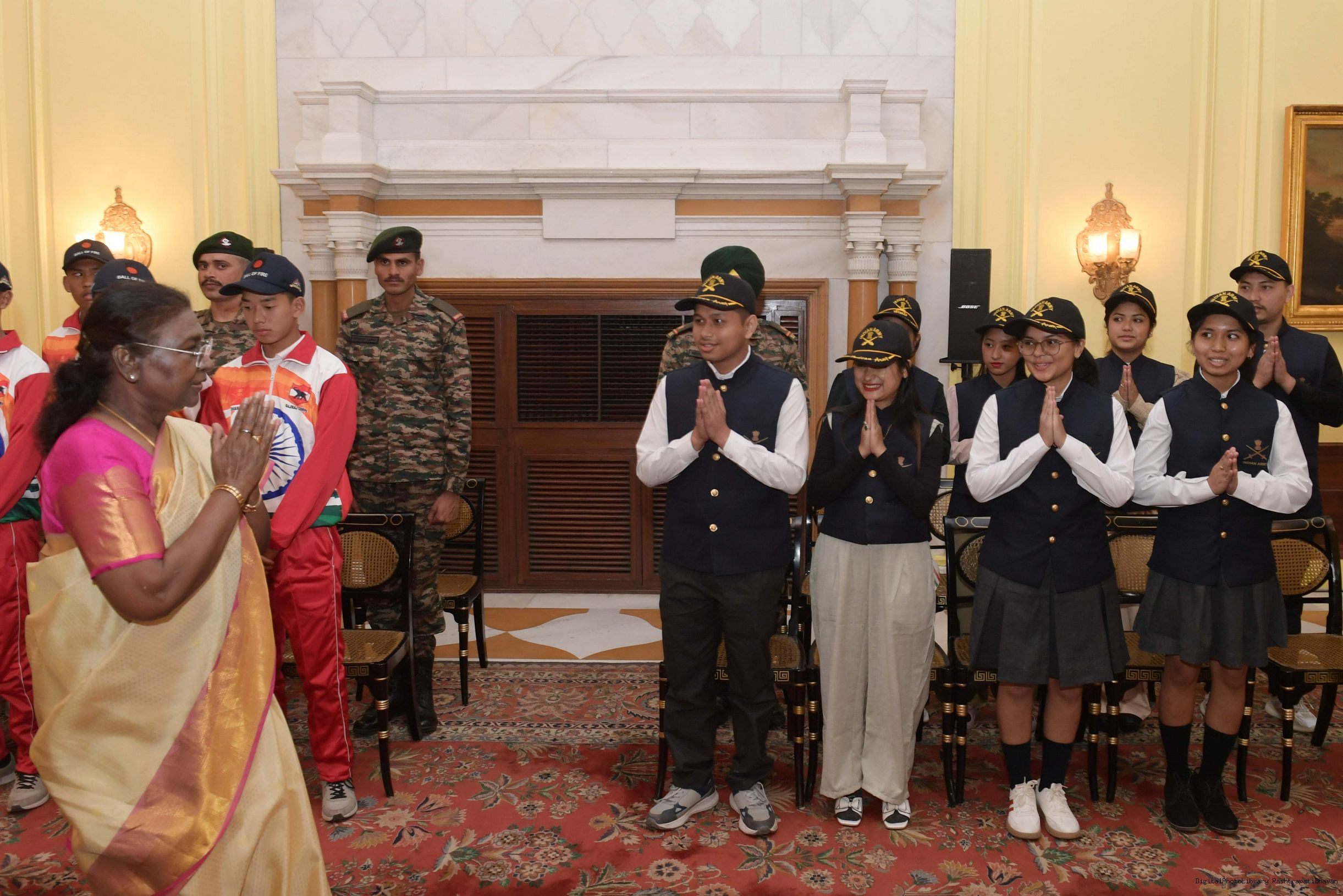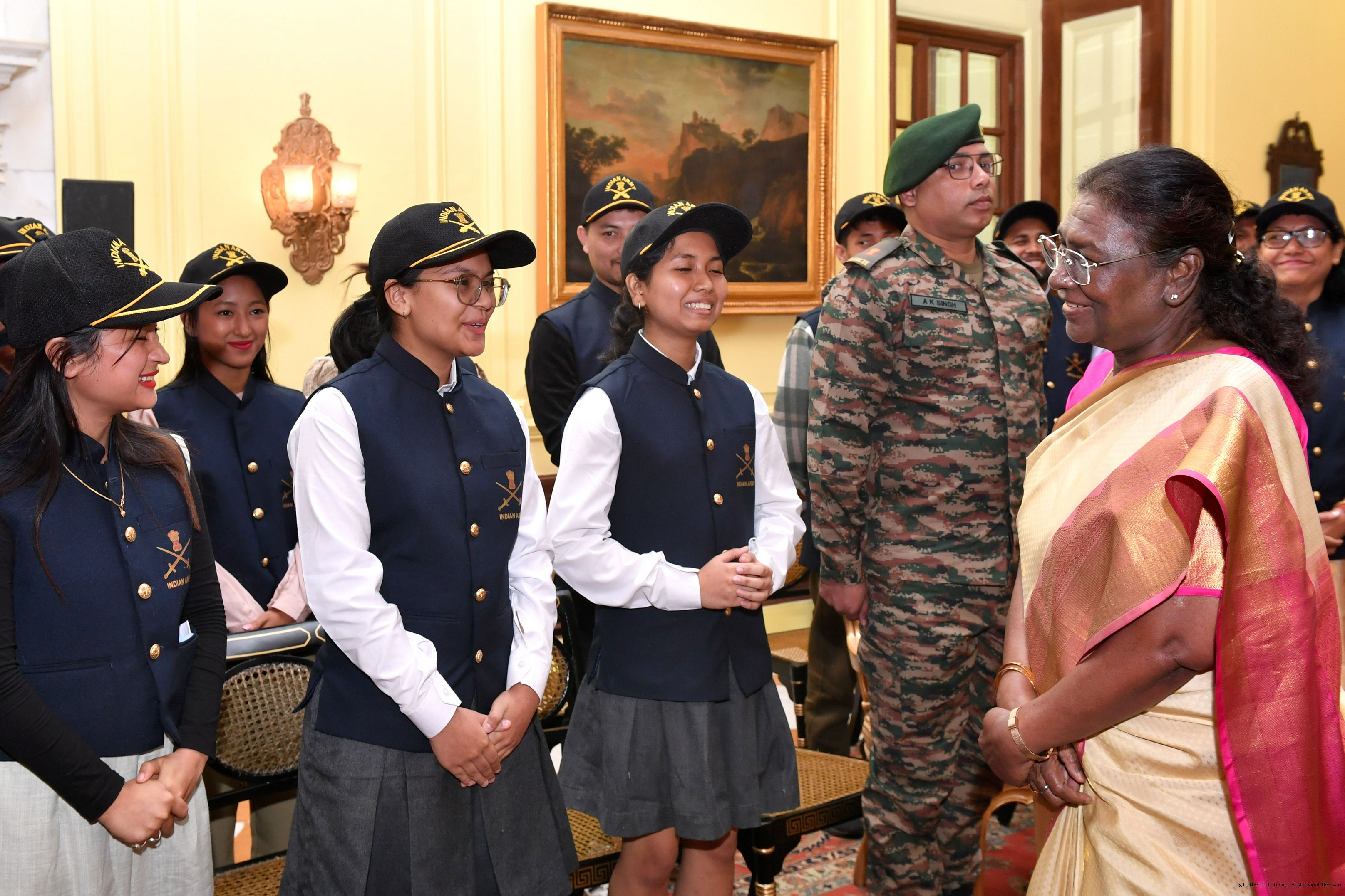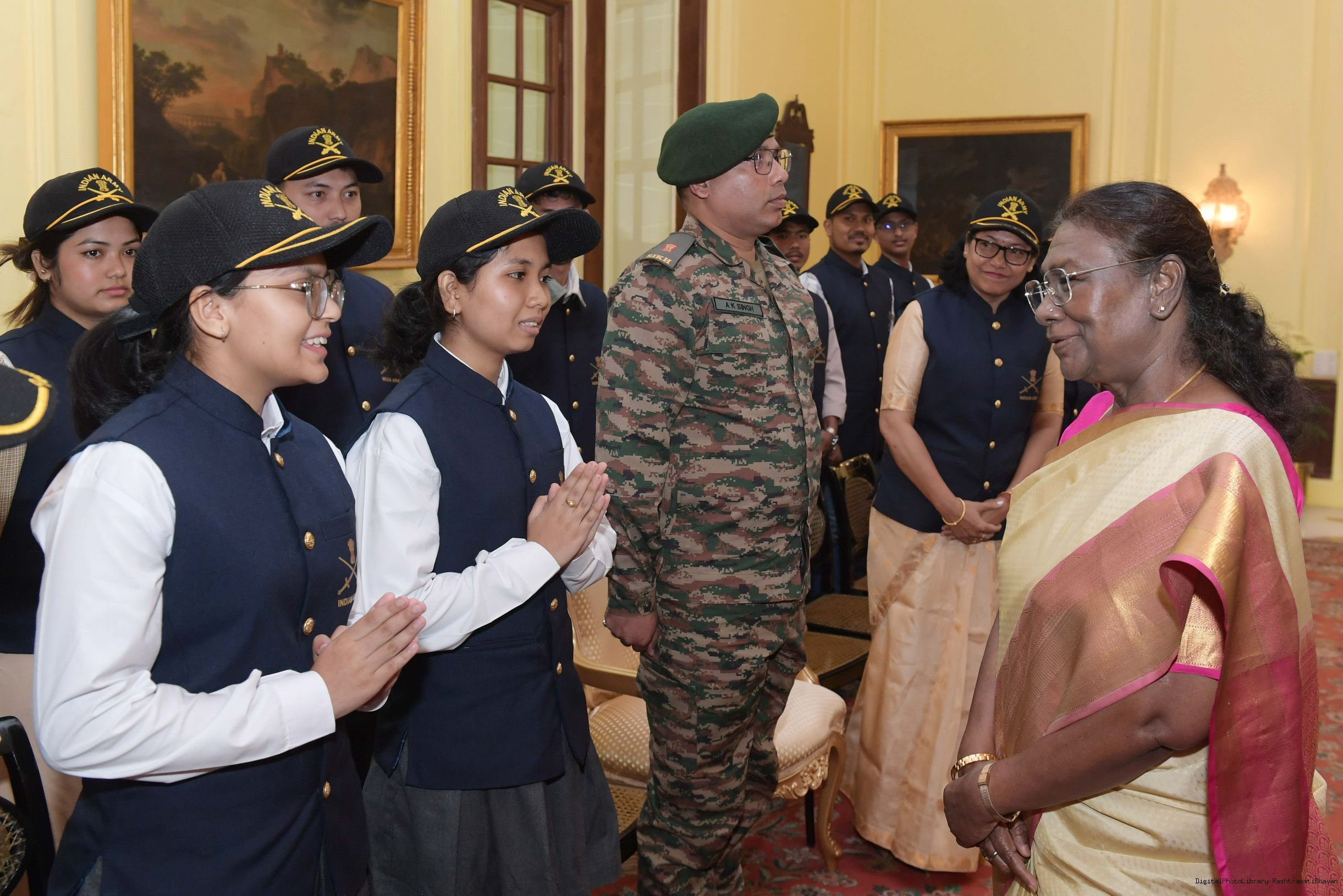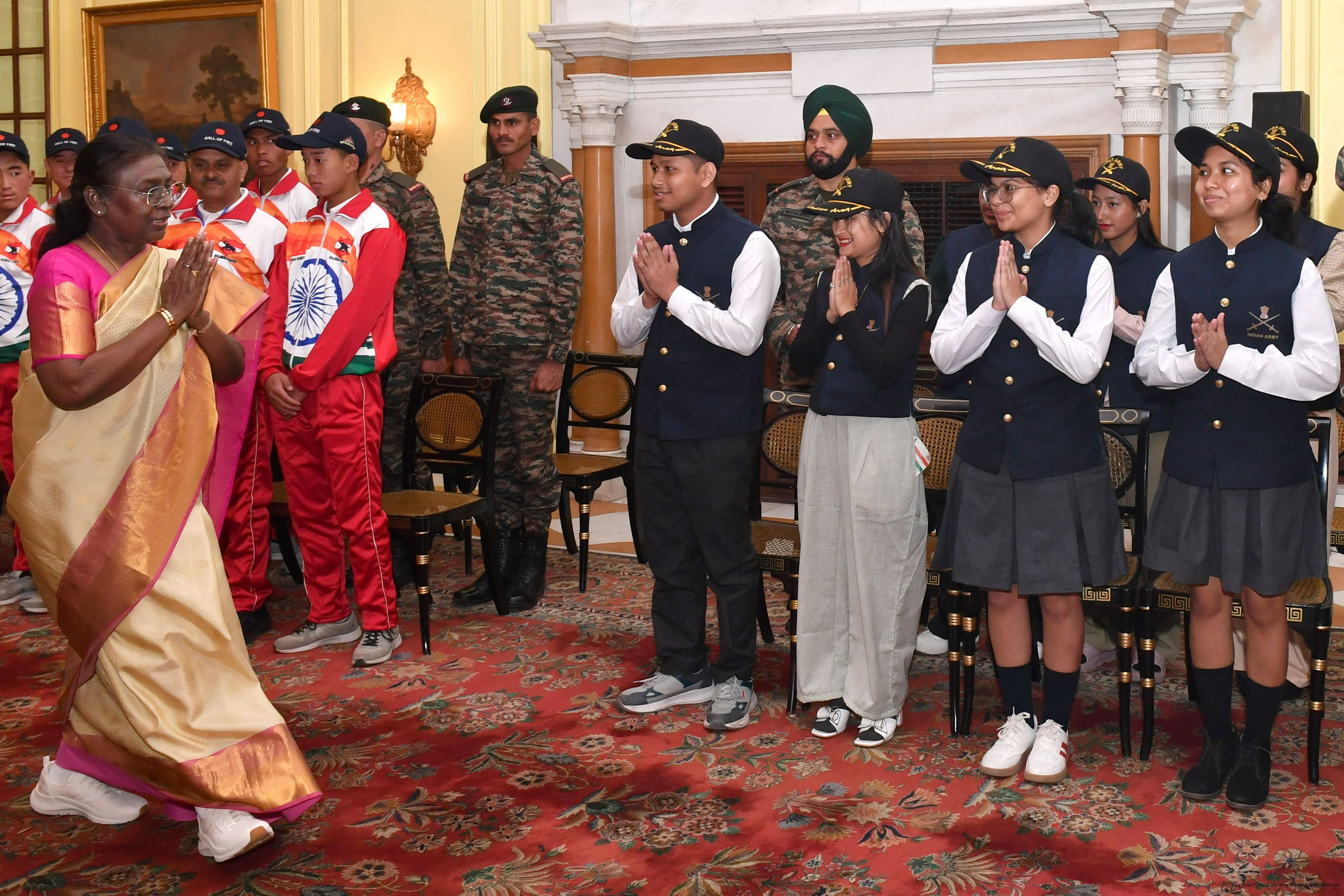 | Caption: | The President of India Smt. Droupadi Murmu mets a group of students from Assam and Arunachal Pradesh at Rashtrapati Bhavan on November 20, 2024. |