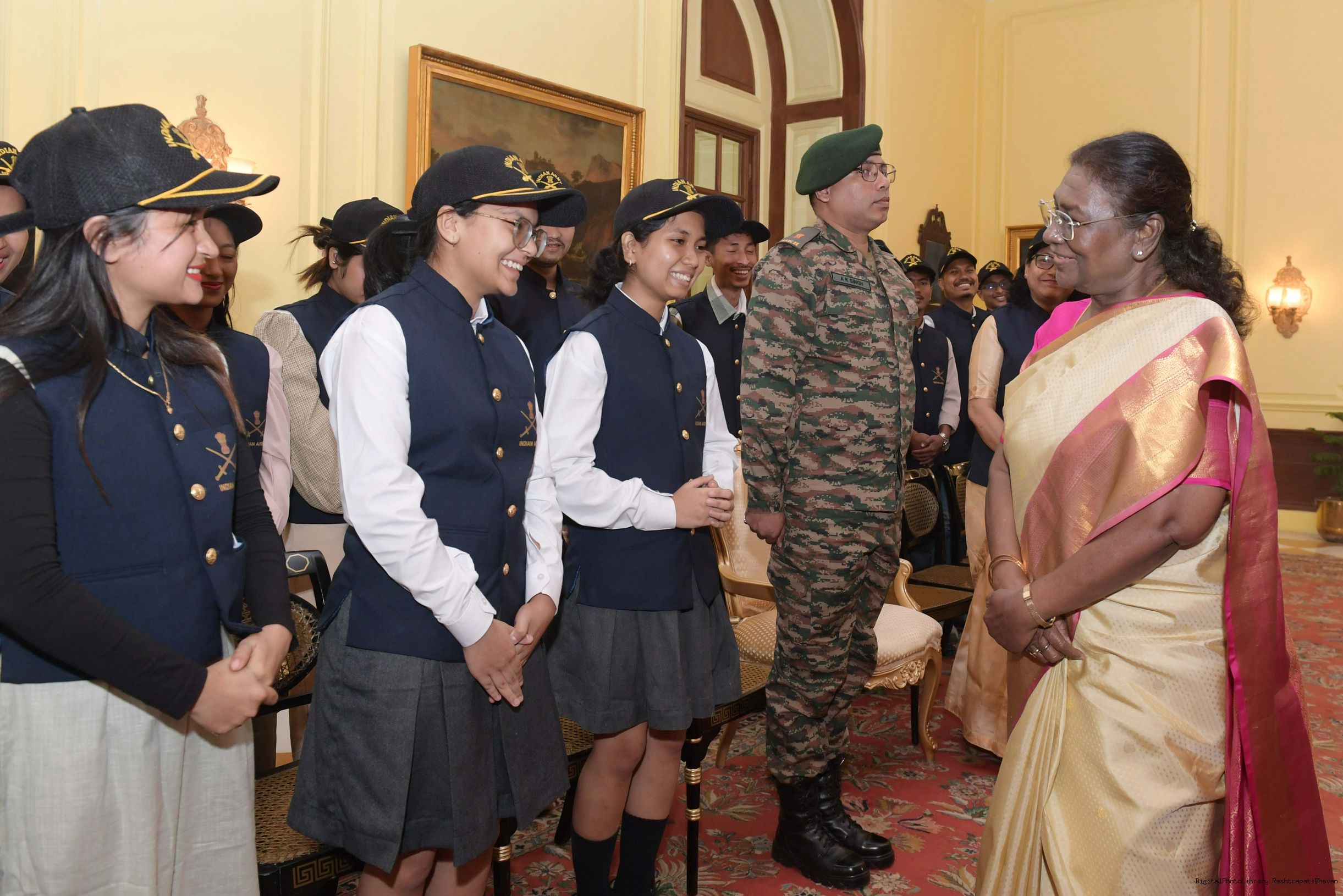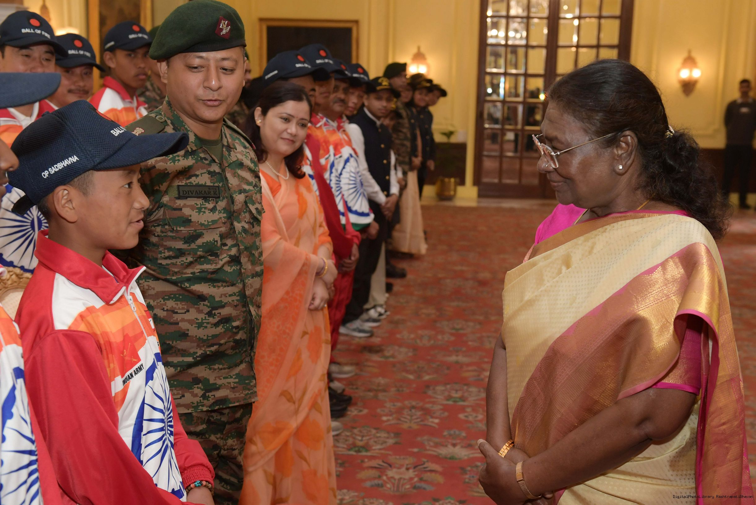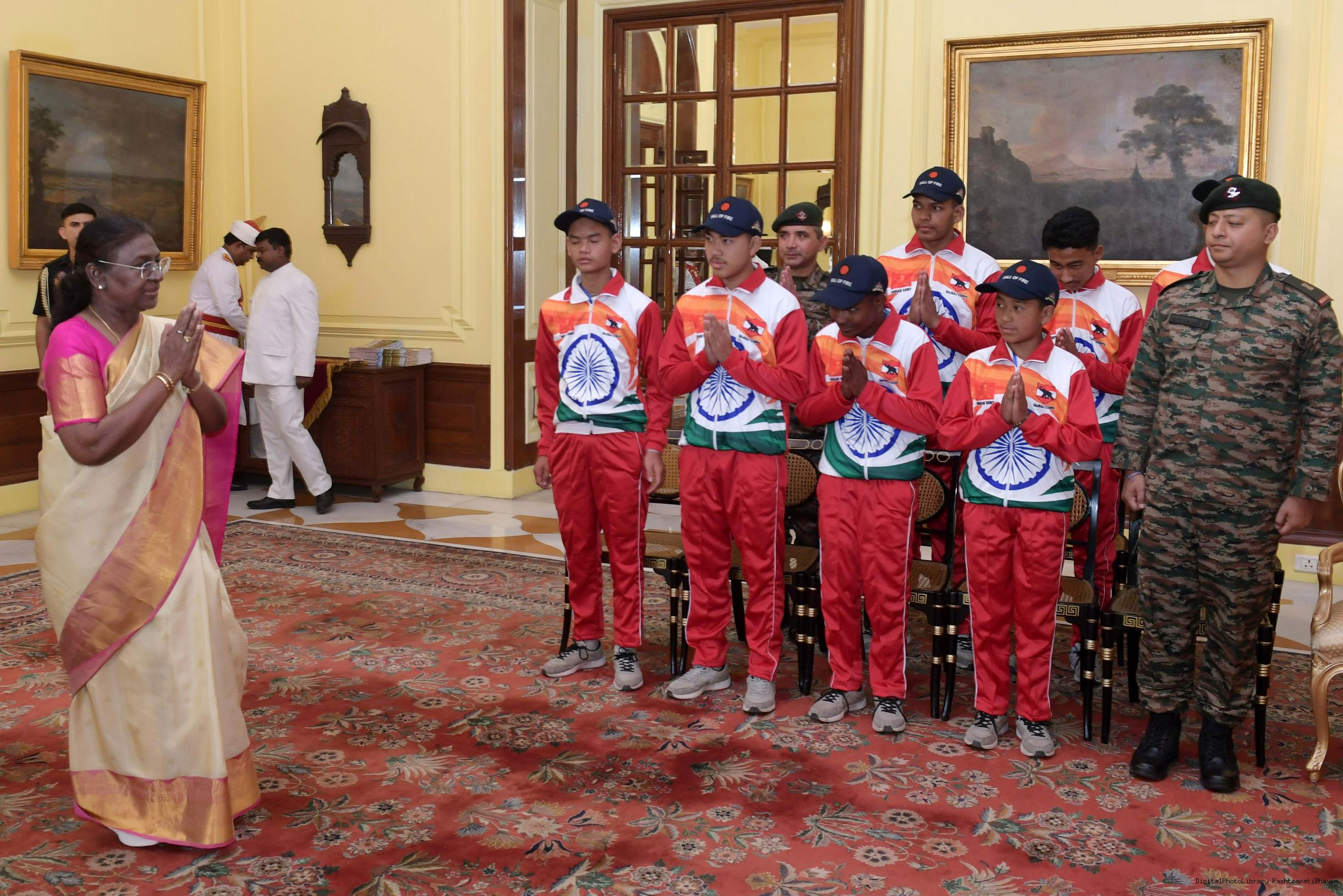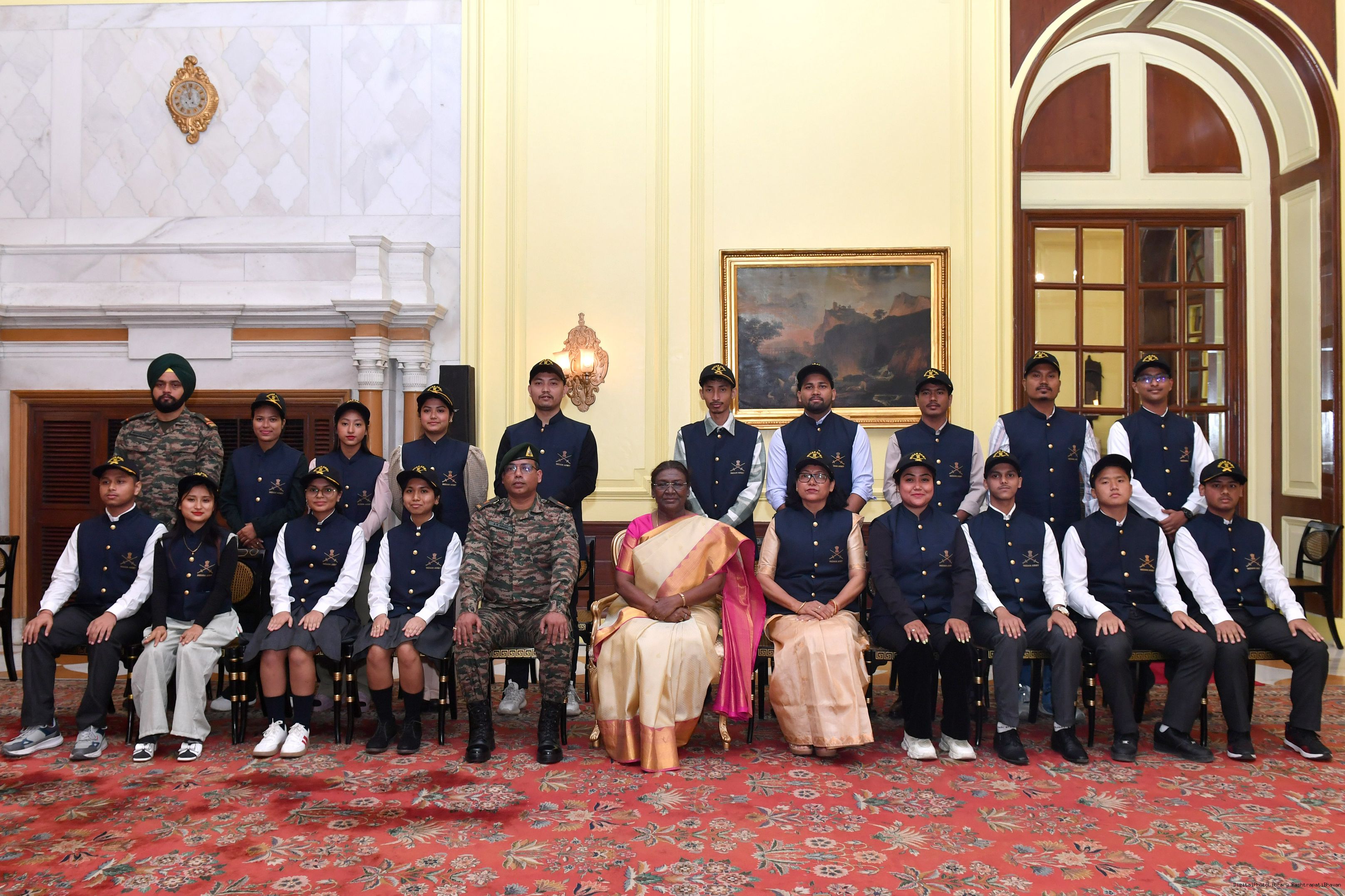 | Caption: | The President of India Smt. Droupadi Murmu mets a group of students from Assam and Arunachal Pradesh at Rashtrapati Bhavan on November 20, 2024. |