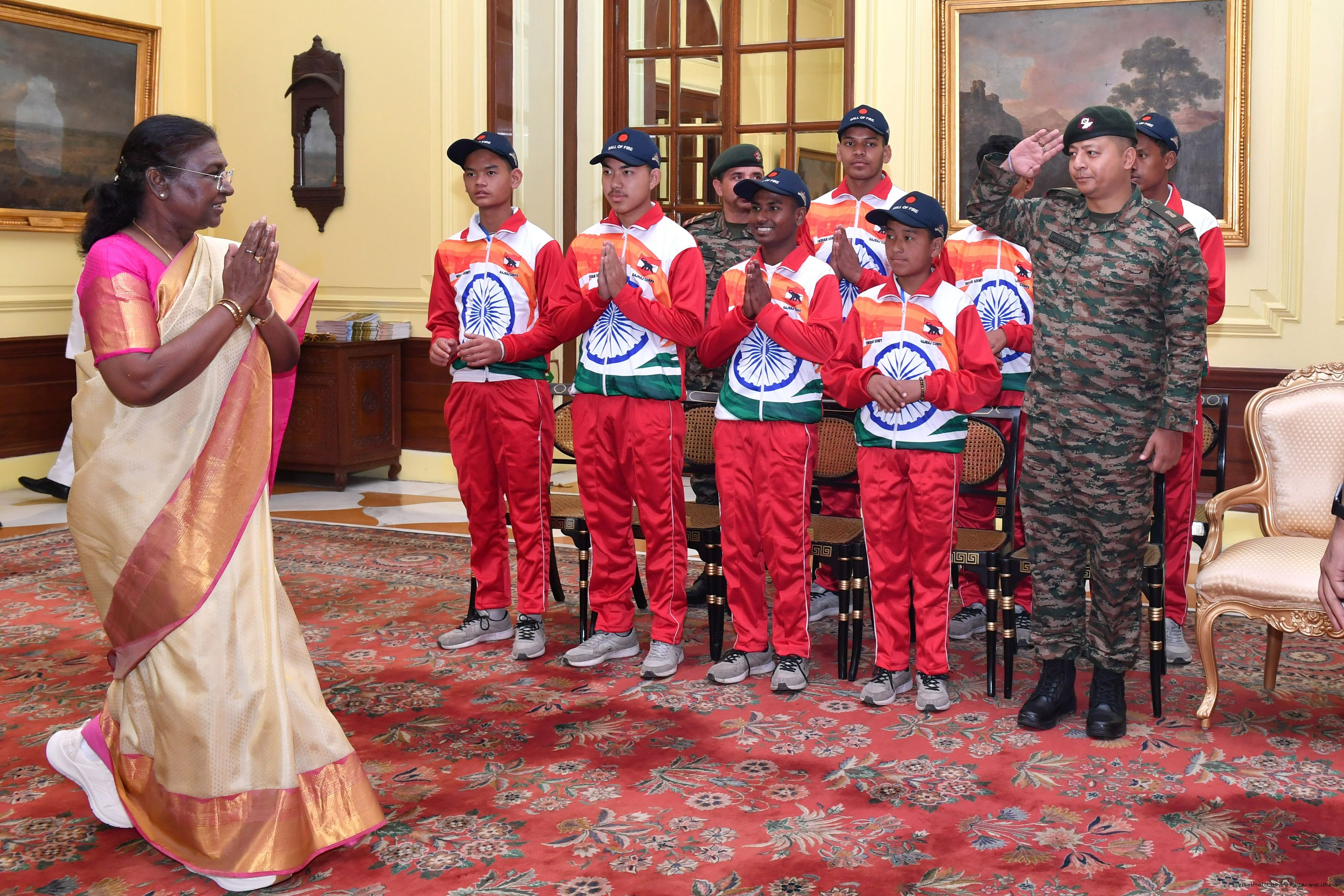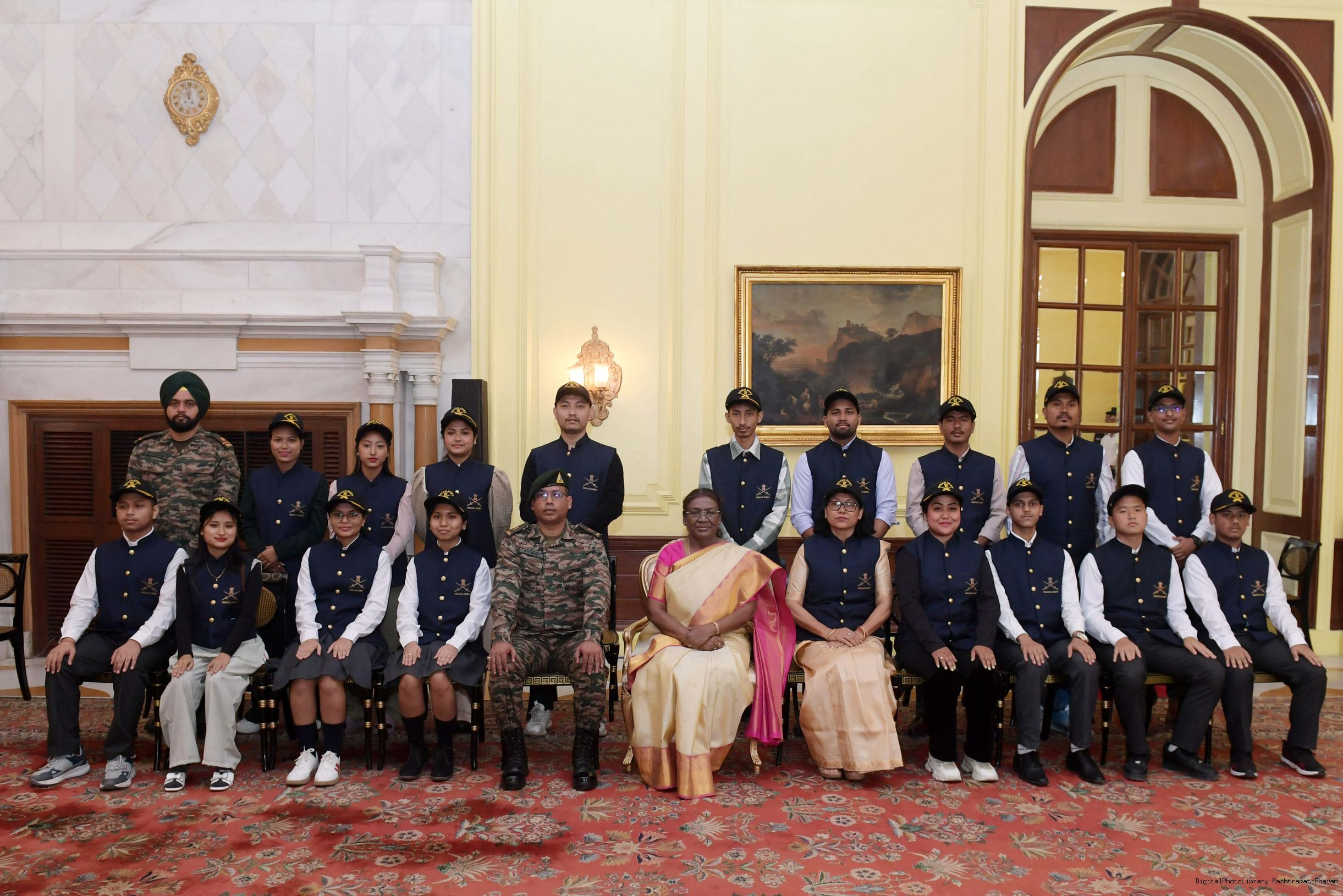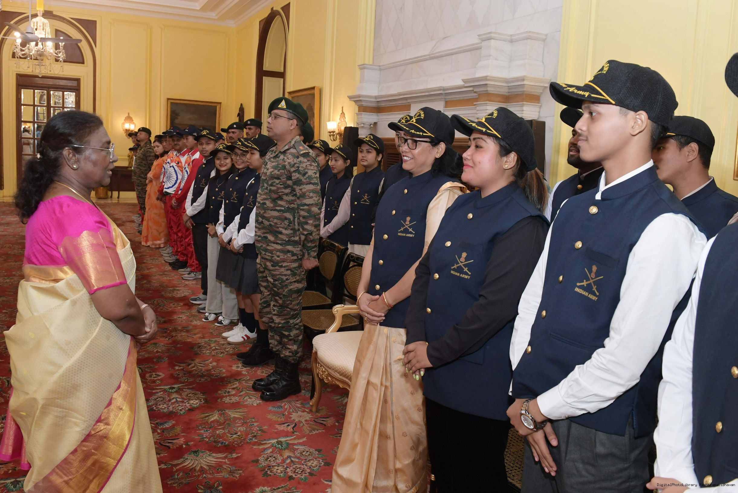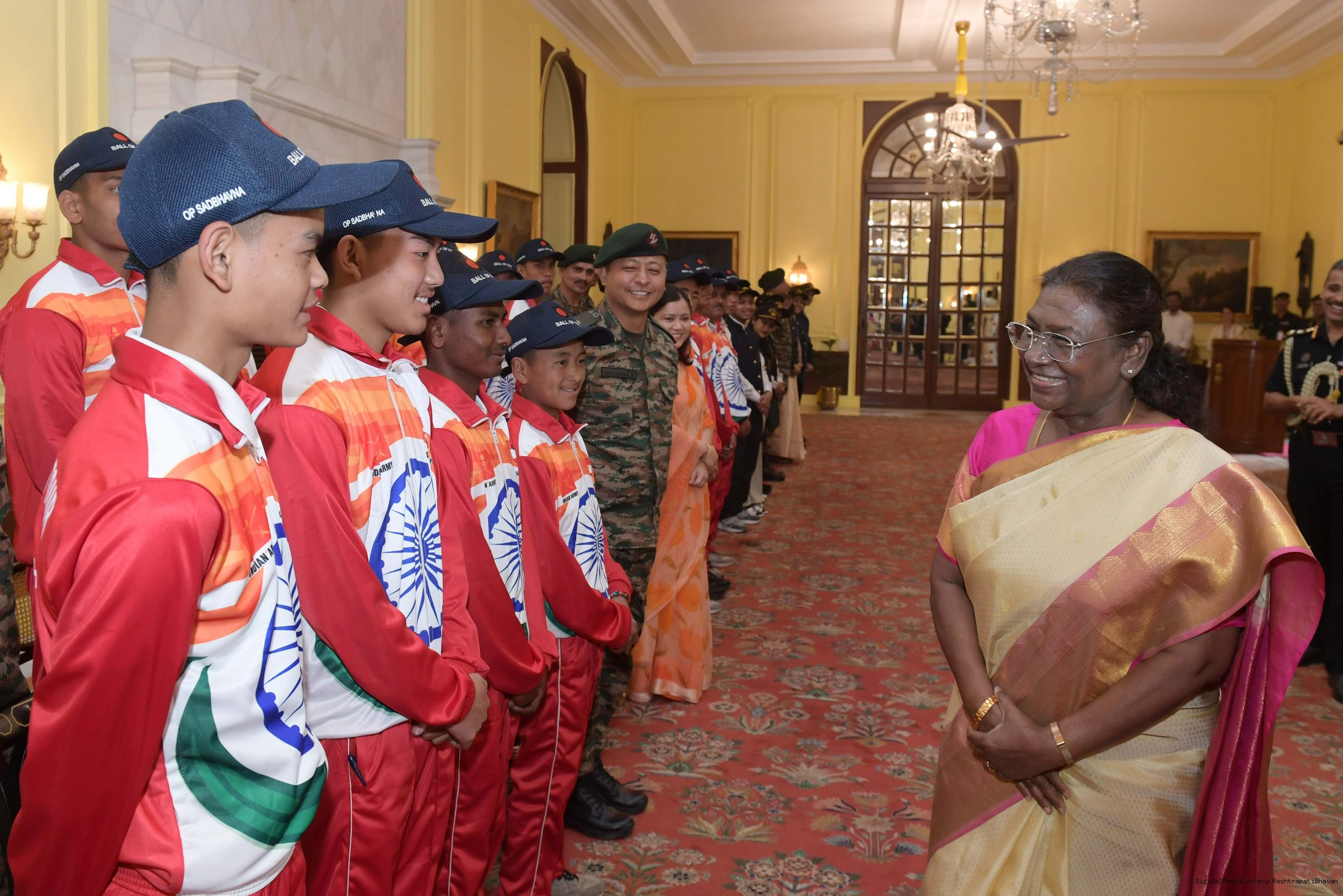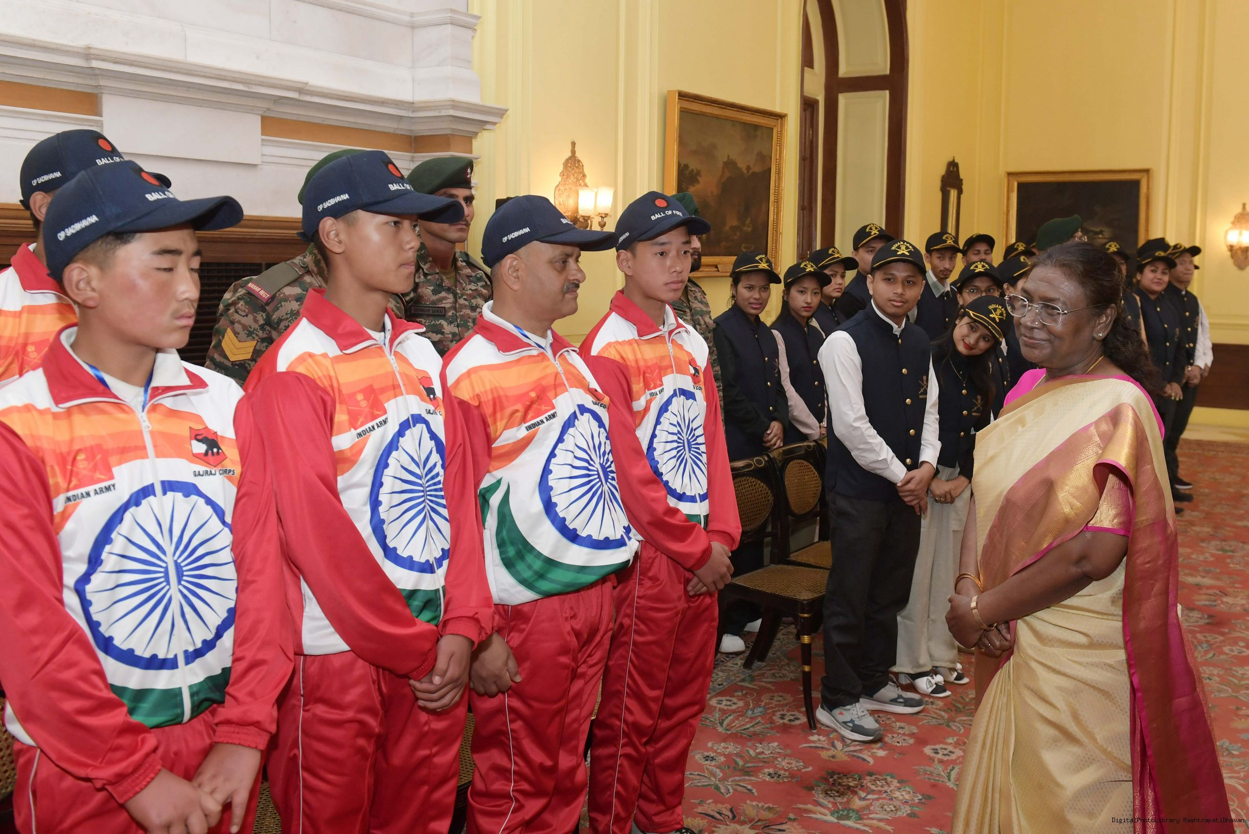 | Caption: | The President of India Smt. Droupadi Murmu mets a group of students from Assam and Arunachal Pradesh at Rashtrapati Bhavan on November 20, 2024. |