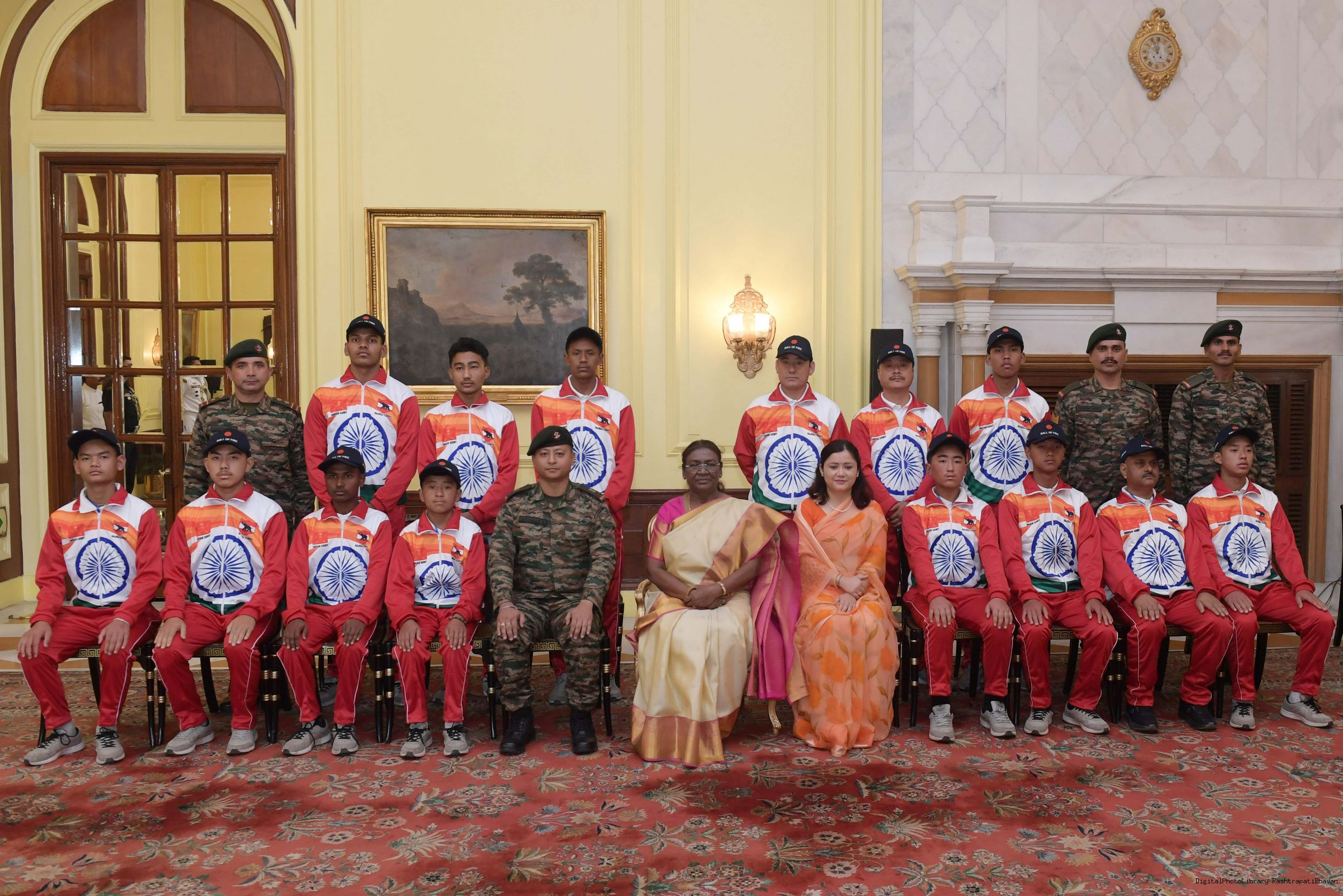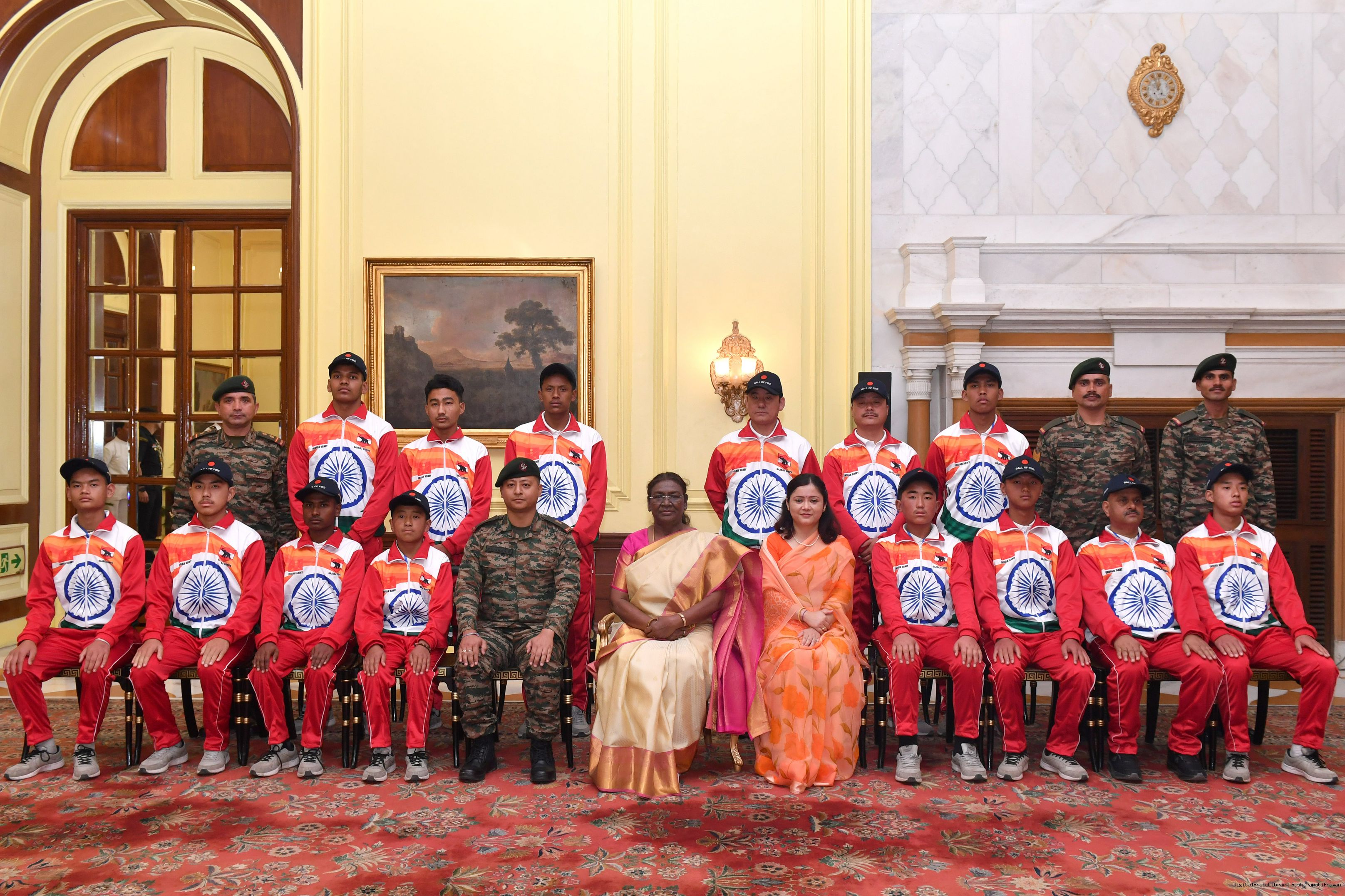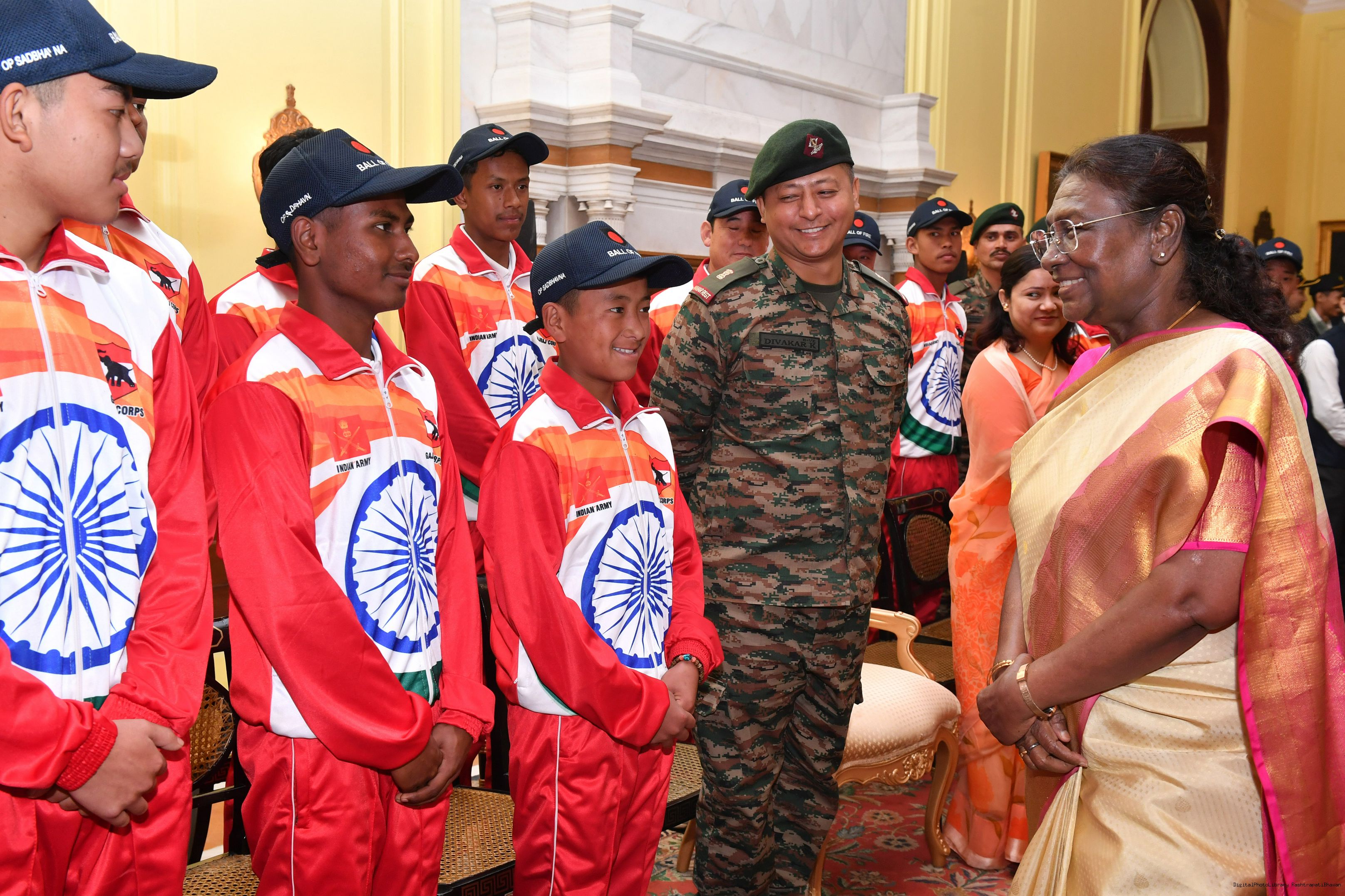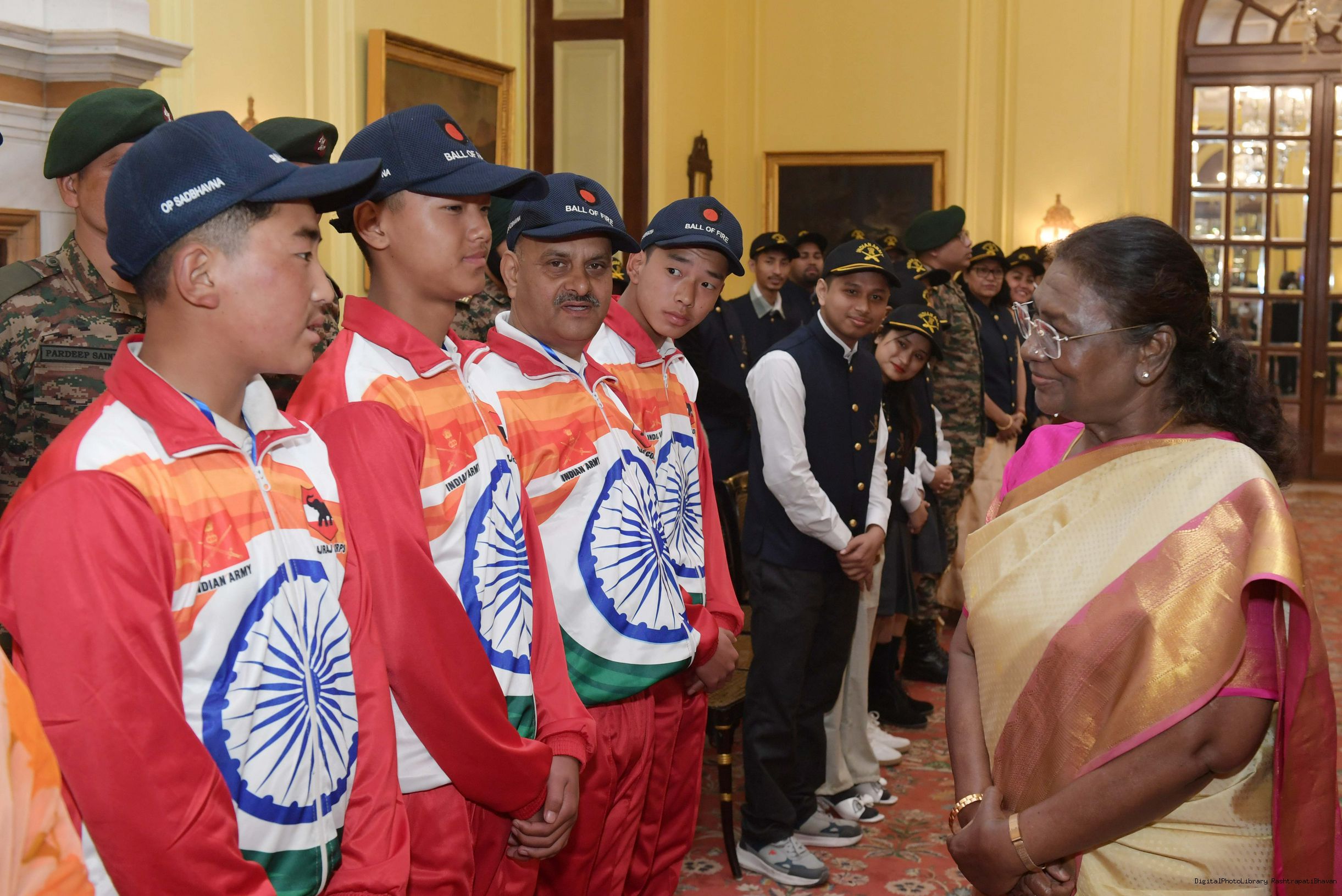 | Caption: | The President of India Smt. Droupadi Murmu mets a group of students from Assam and Arunachal Pradesh at Rashtrapati Bhavan on November 20, 2024. |