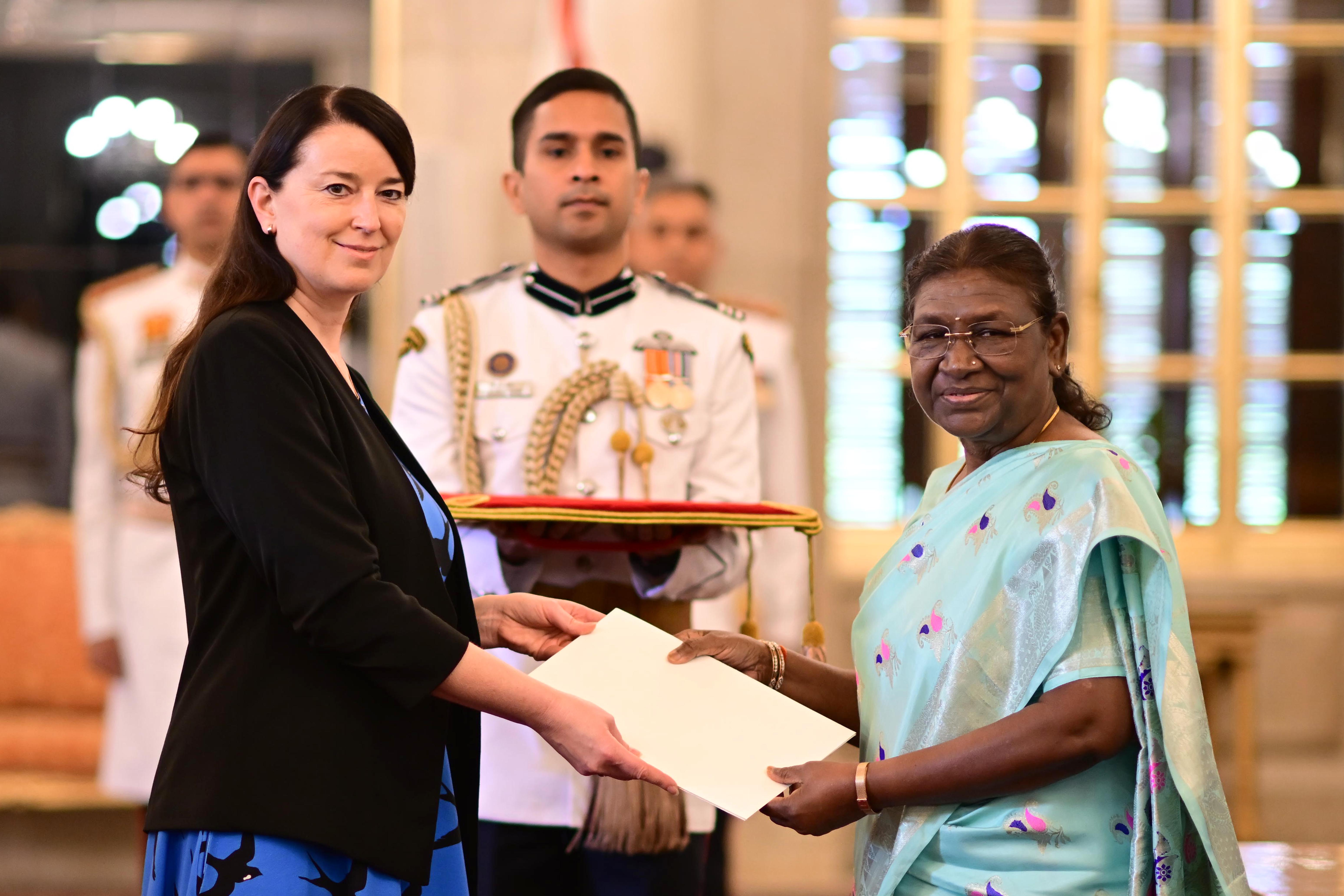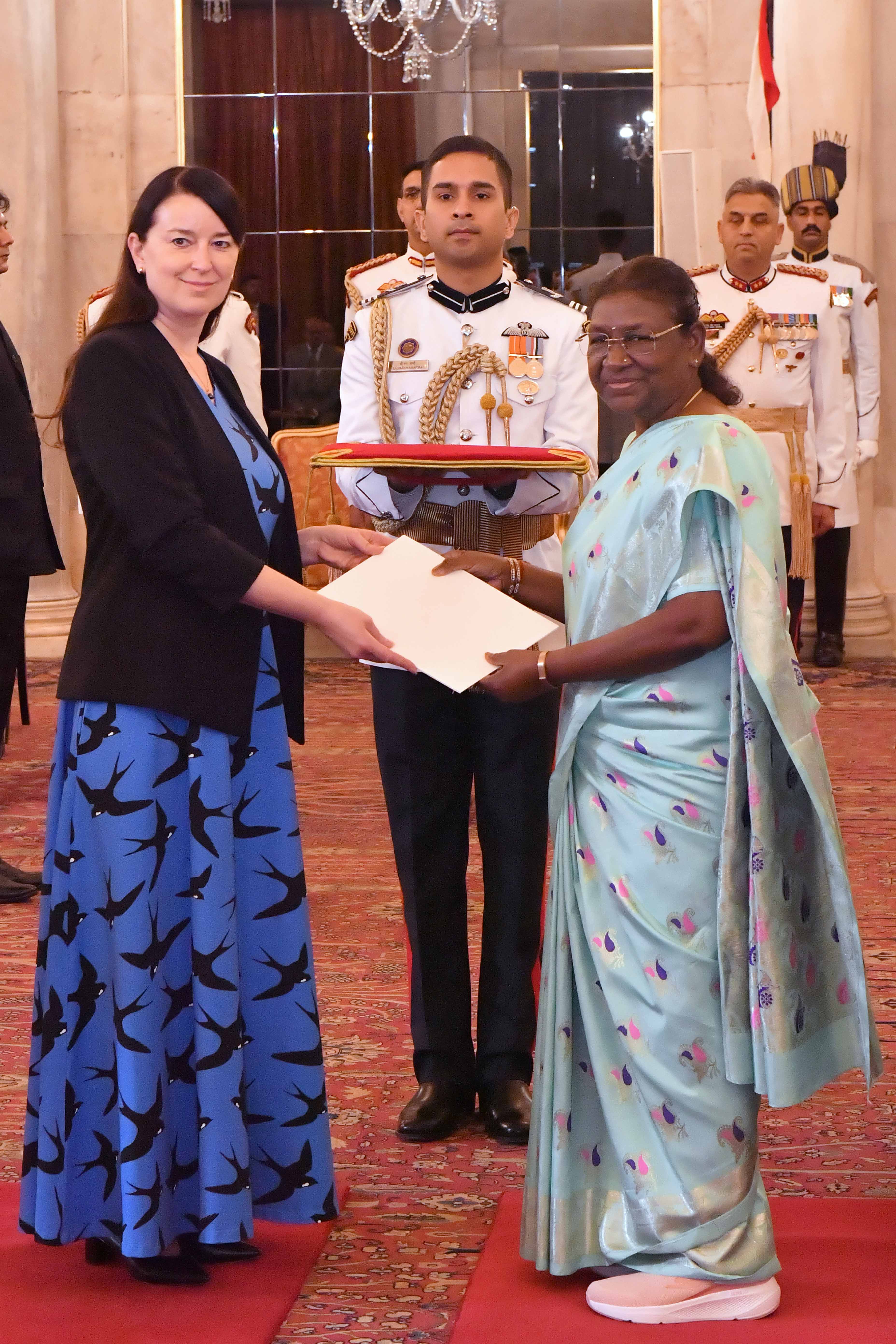 | Caption: | The Ambassador-designate of the Republic of Estonia H.E. Mrs Marje Luup, presenting her credentials to the President of India, Smt Droupadi Murmu at Rashtrapati Bhavan on August 29, 2023. |