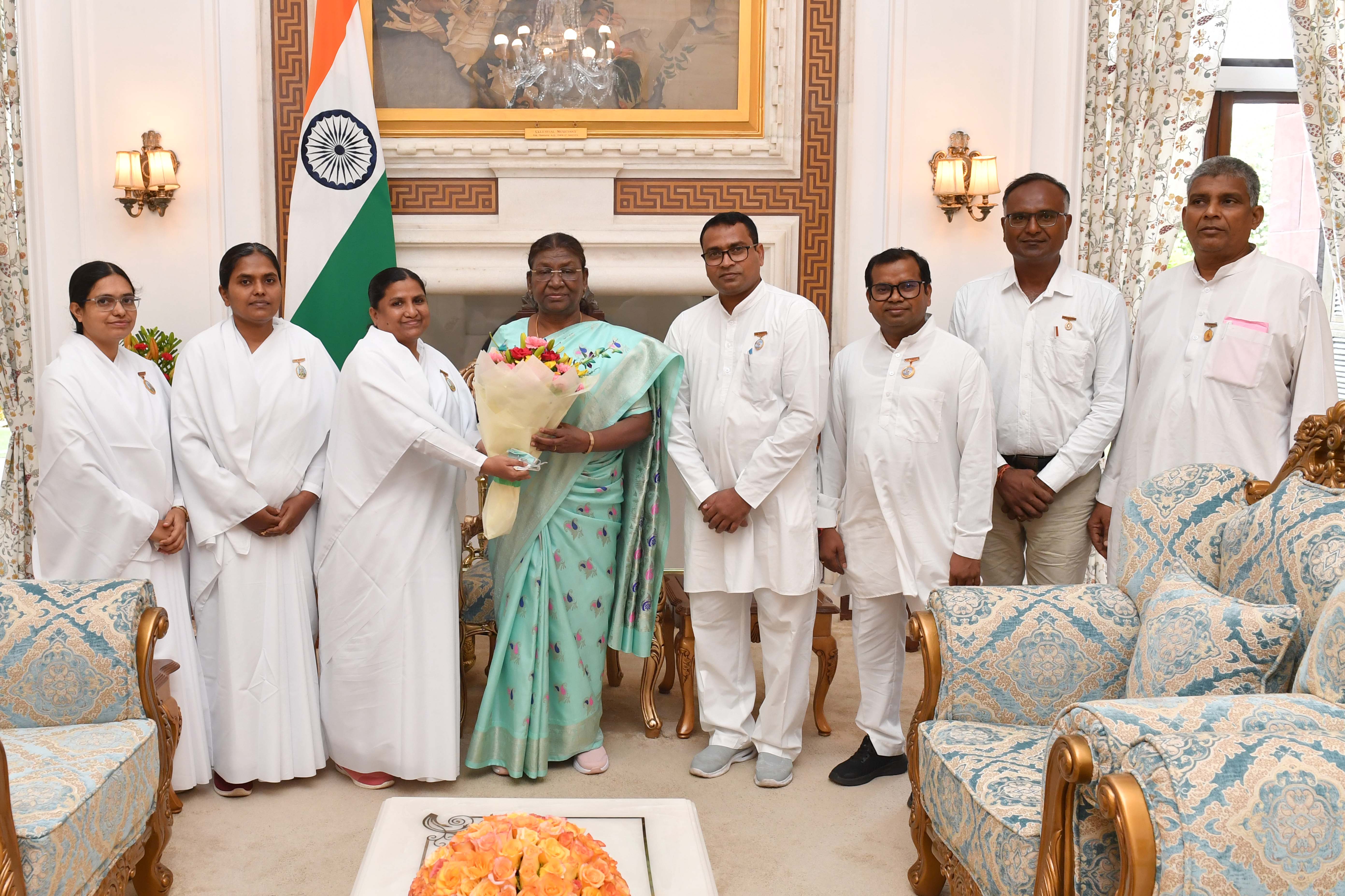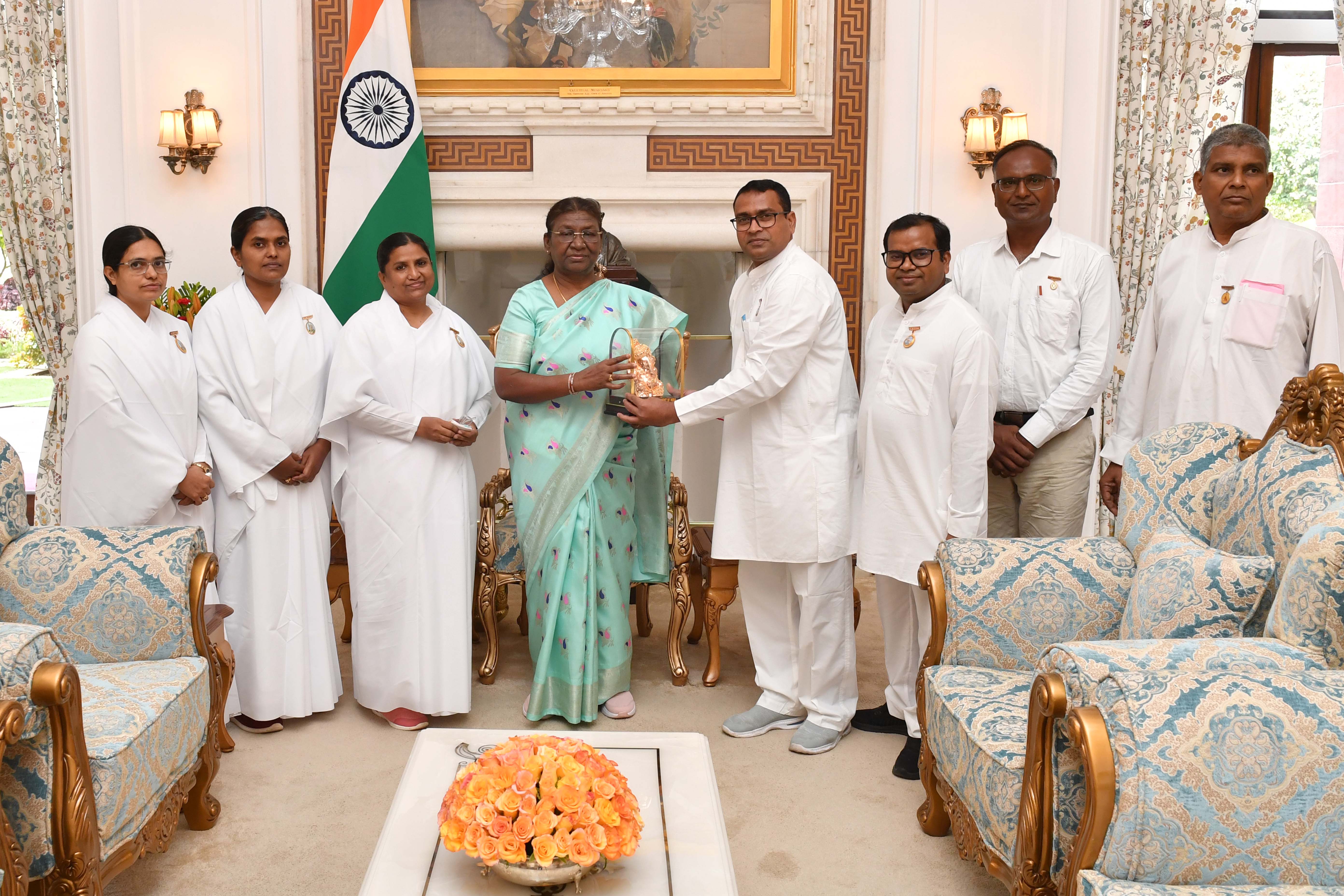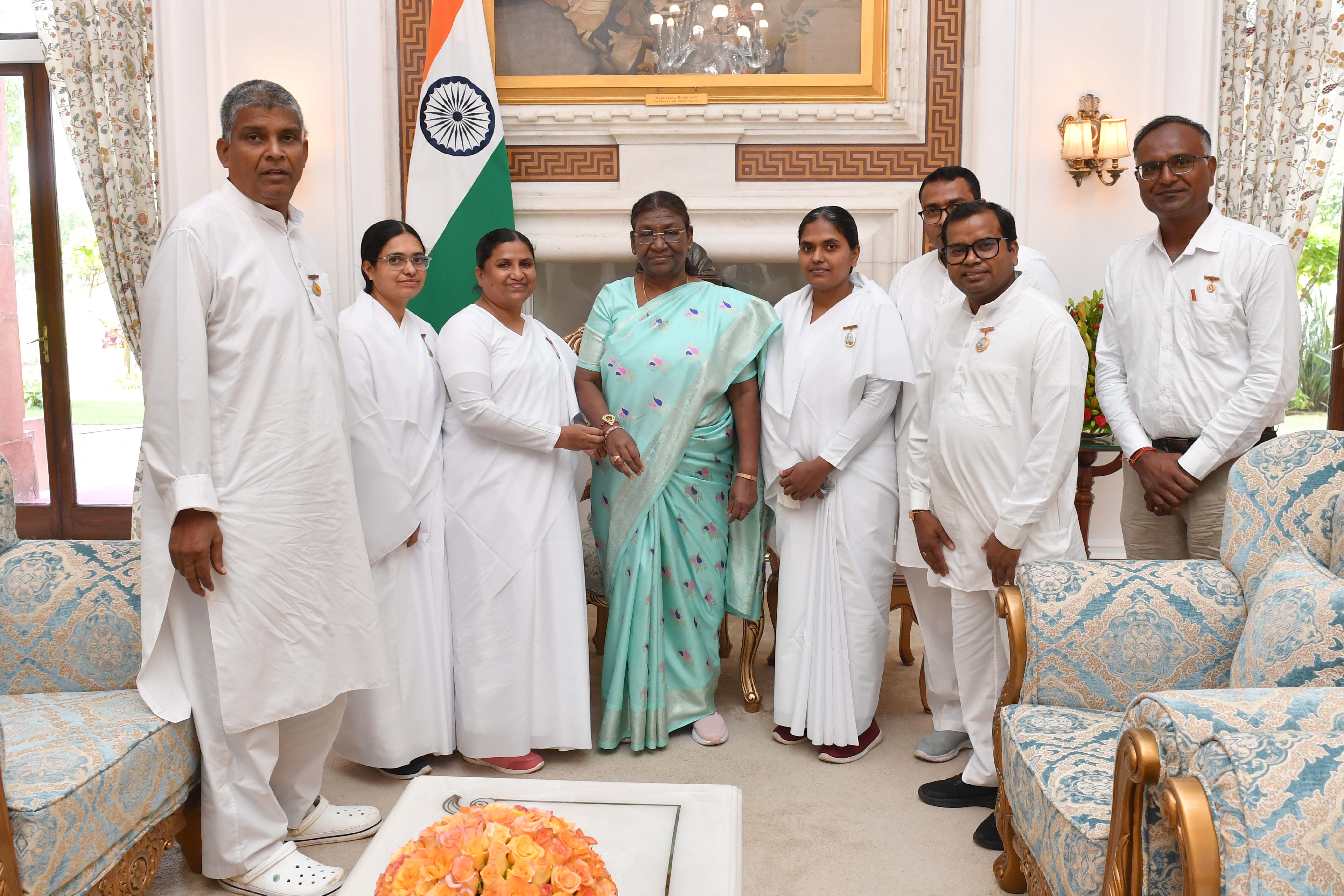 | Caption: | BK Neelima, Centre in Charge, Brahma Kumaris, Miyapur, Hyderabad along with others meeting with the President of India Smt Droupadi Murmu at Rashtrapati Bhavan on August 29, 2023. |