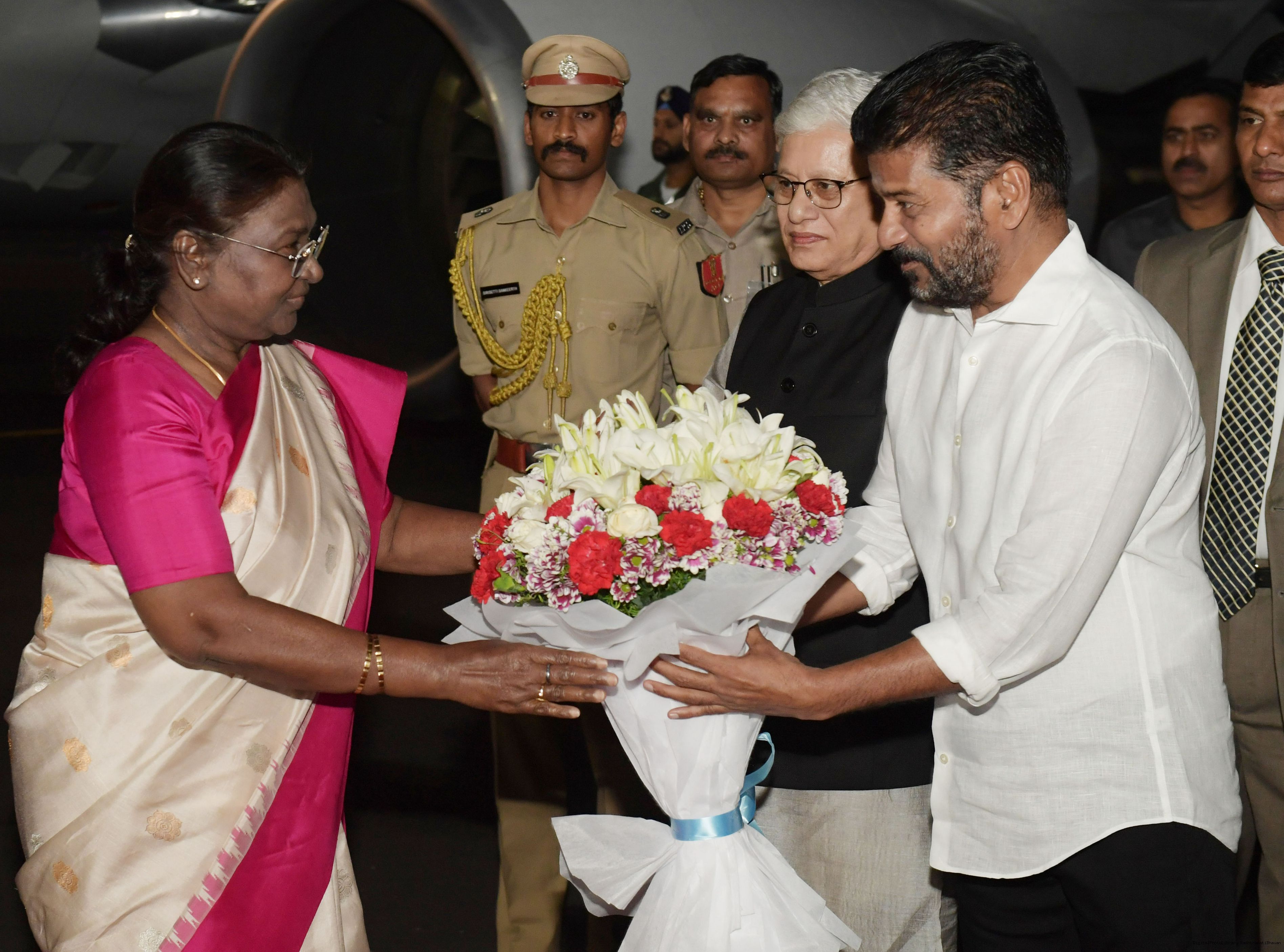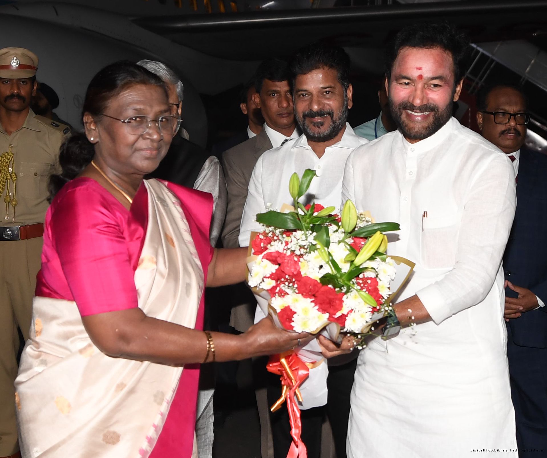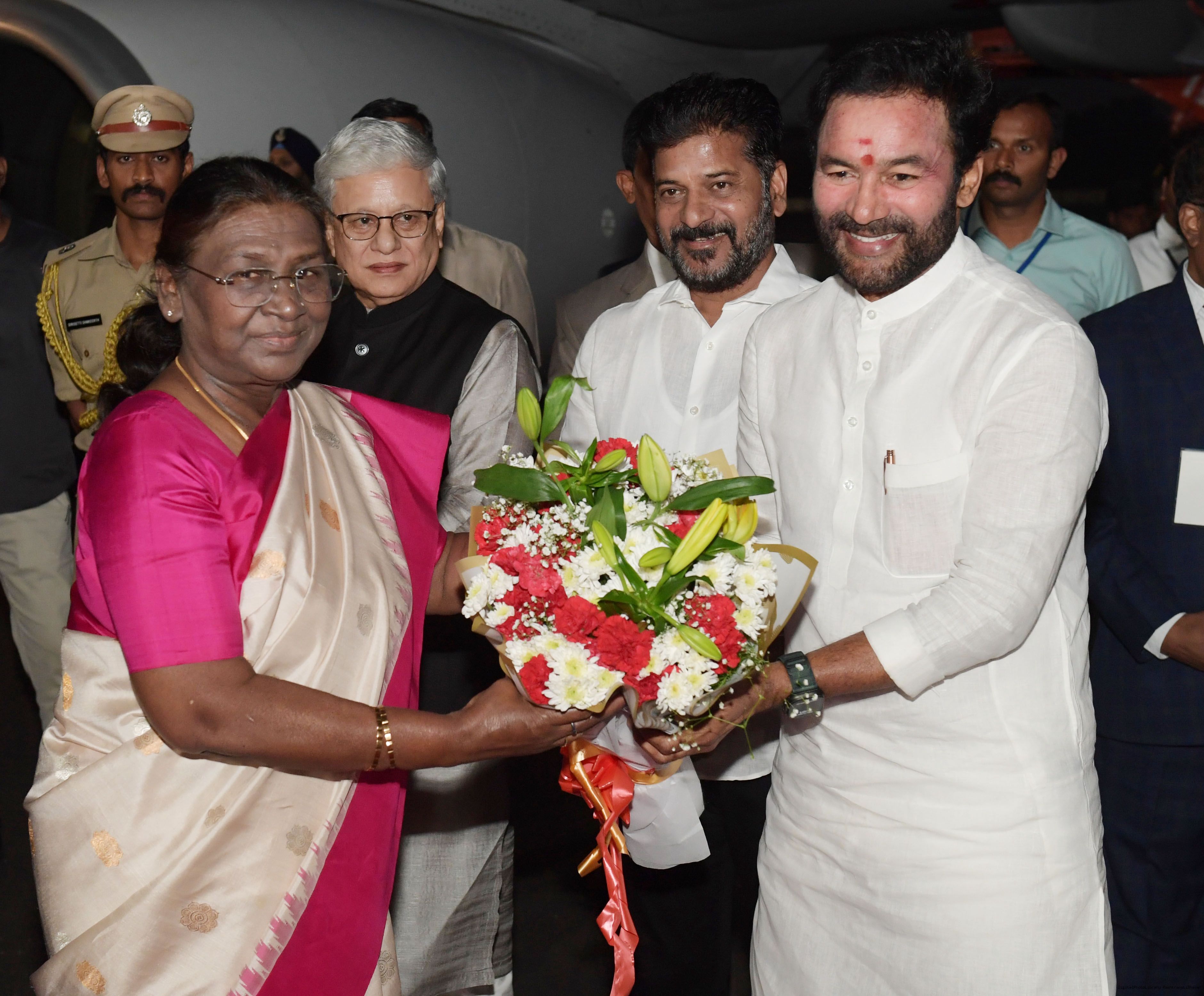| Caption: | The Governor of Telangana, Shri Jishnu Dev Varma, Chief Minister Shri A. Revanth Reddy, Union Minister for Coal and Mines, Shri G. Kishan Reddy and Minister of State for Home Affairs, Shri Bandi Sanjay Kumar received the President of India Smt. Droupadi Murmu on her arrival at Hyderabad on November 21, 2024. |