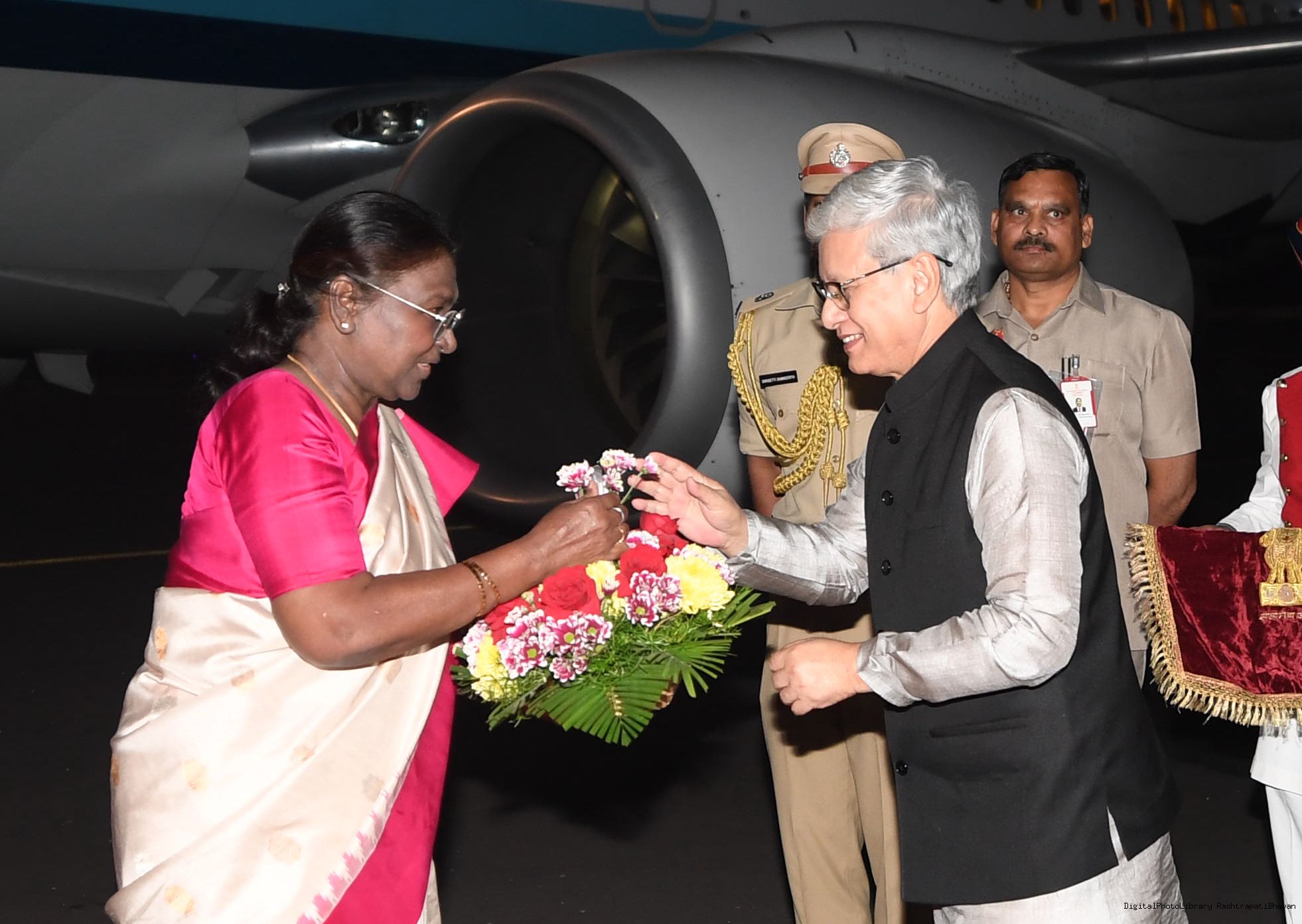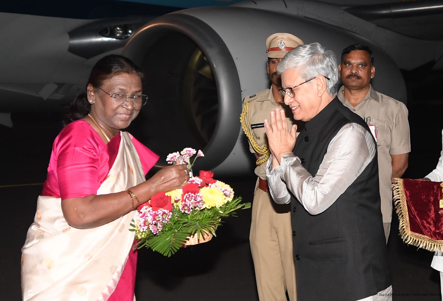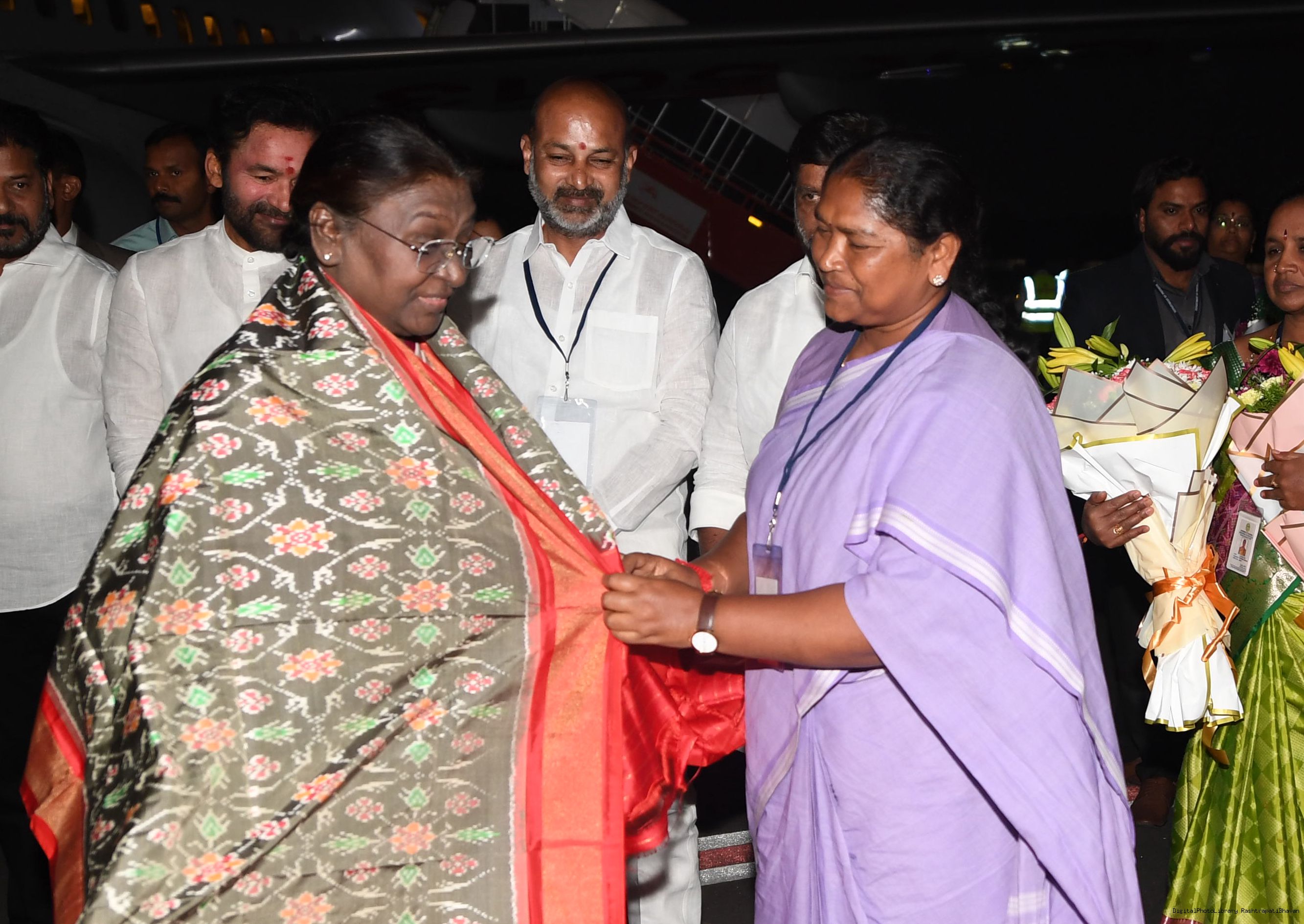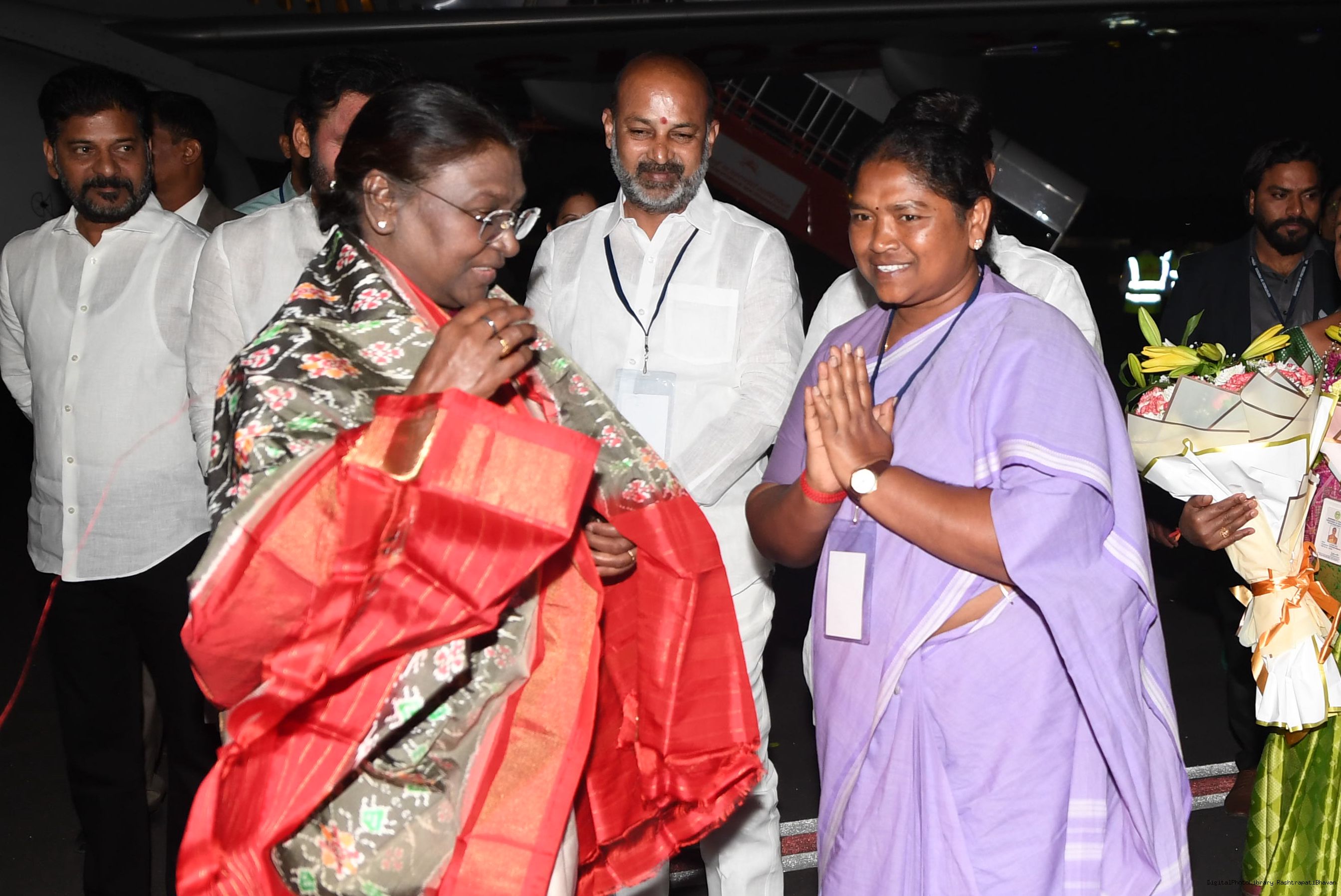 | Caption: | The Governor of Telangana, Shri Jishnu Dev Varma, Chief Minister Shri A. Revanth Reddy, Union Minister for Coal and Mines, Shri G. Kishan Reddy and Minister of State for Home Affairs, Shri Bandi Sanjay Kumar received the President of India Smt. Droupadi Murmu on her arrival at Hyderabad on November 21, 2024. |