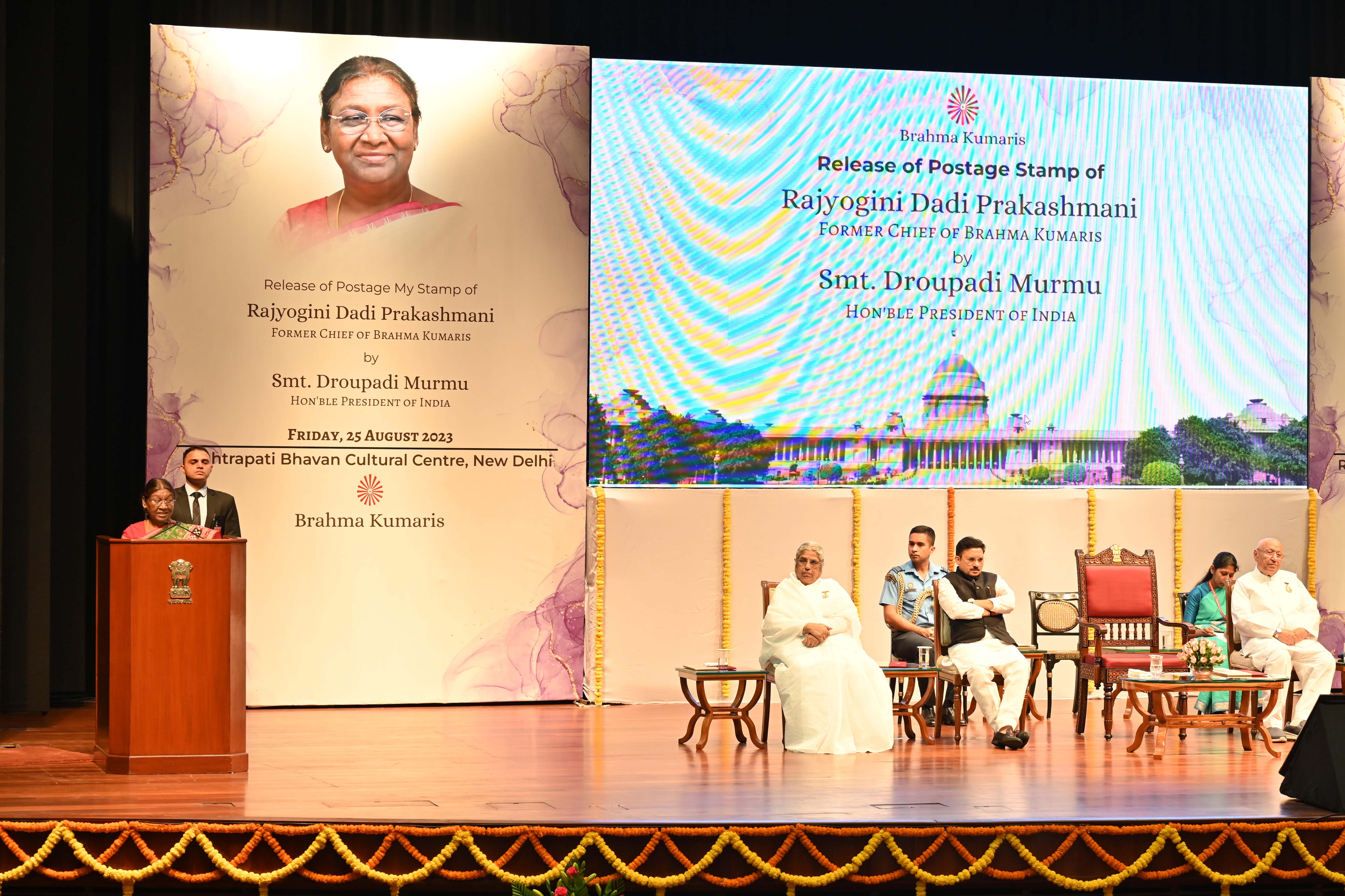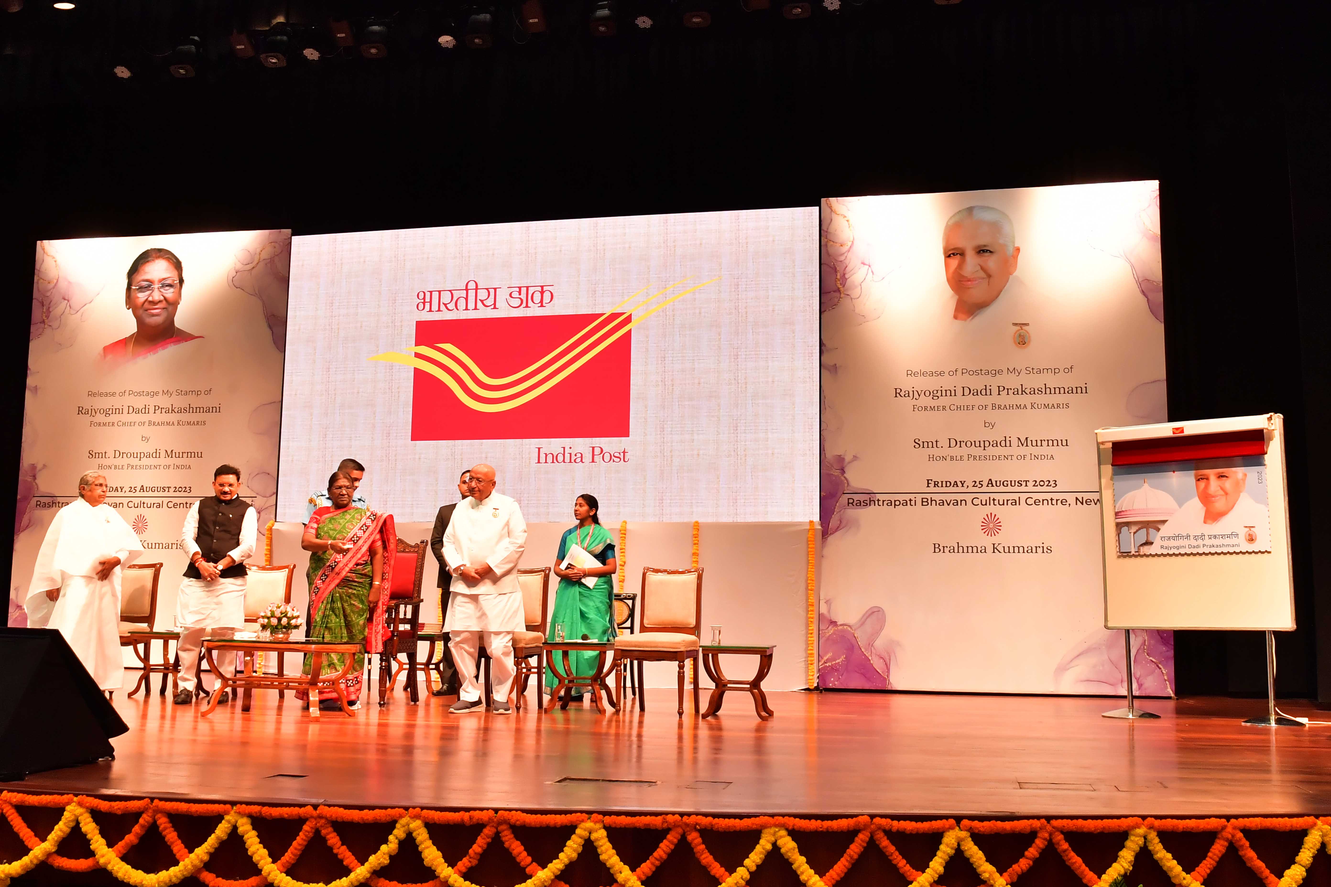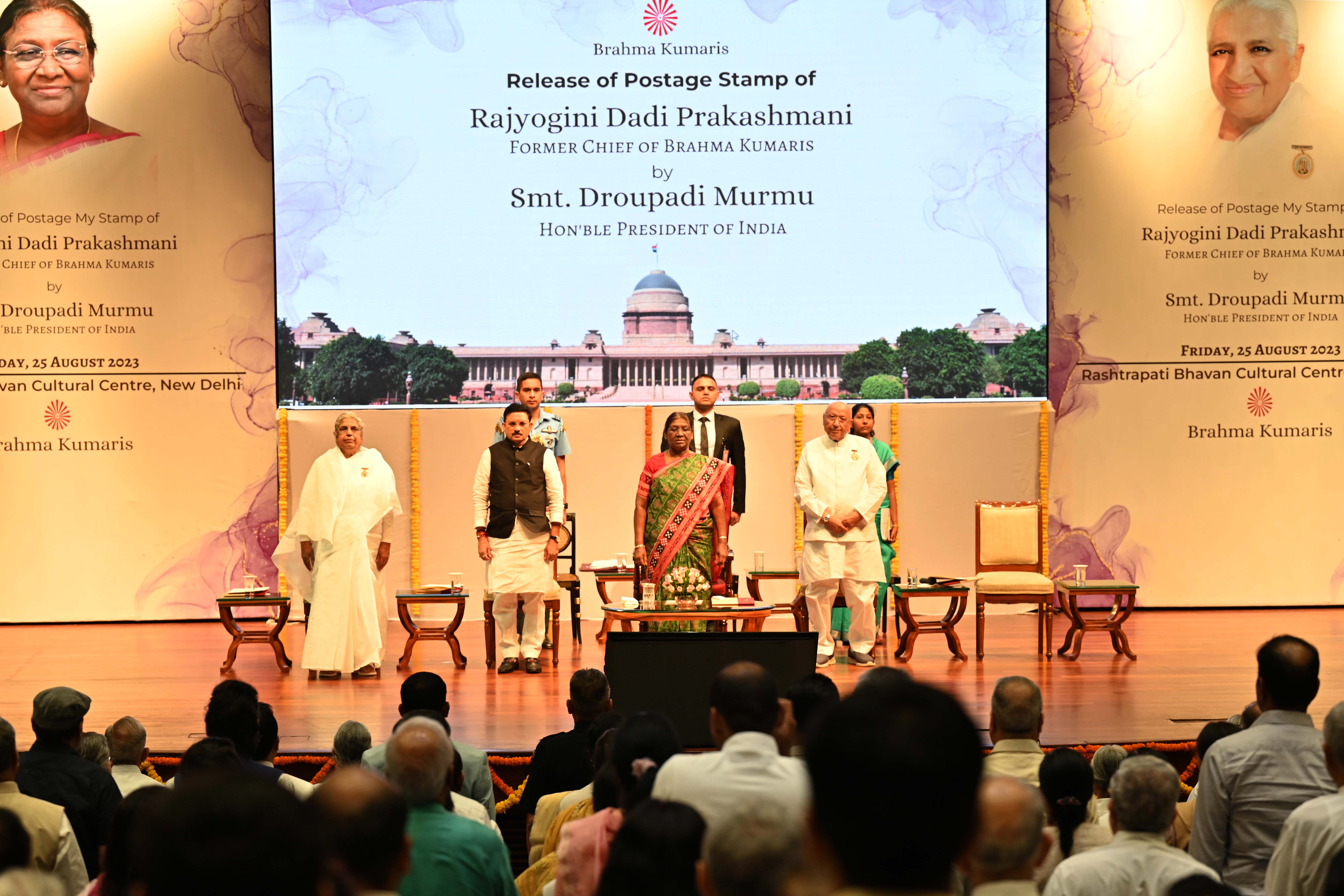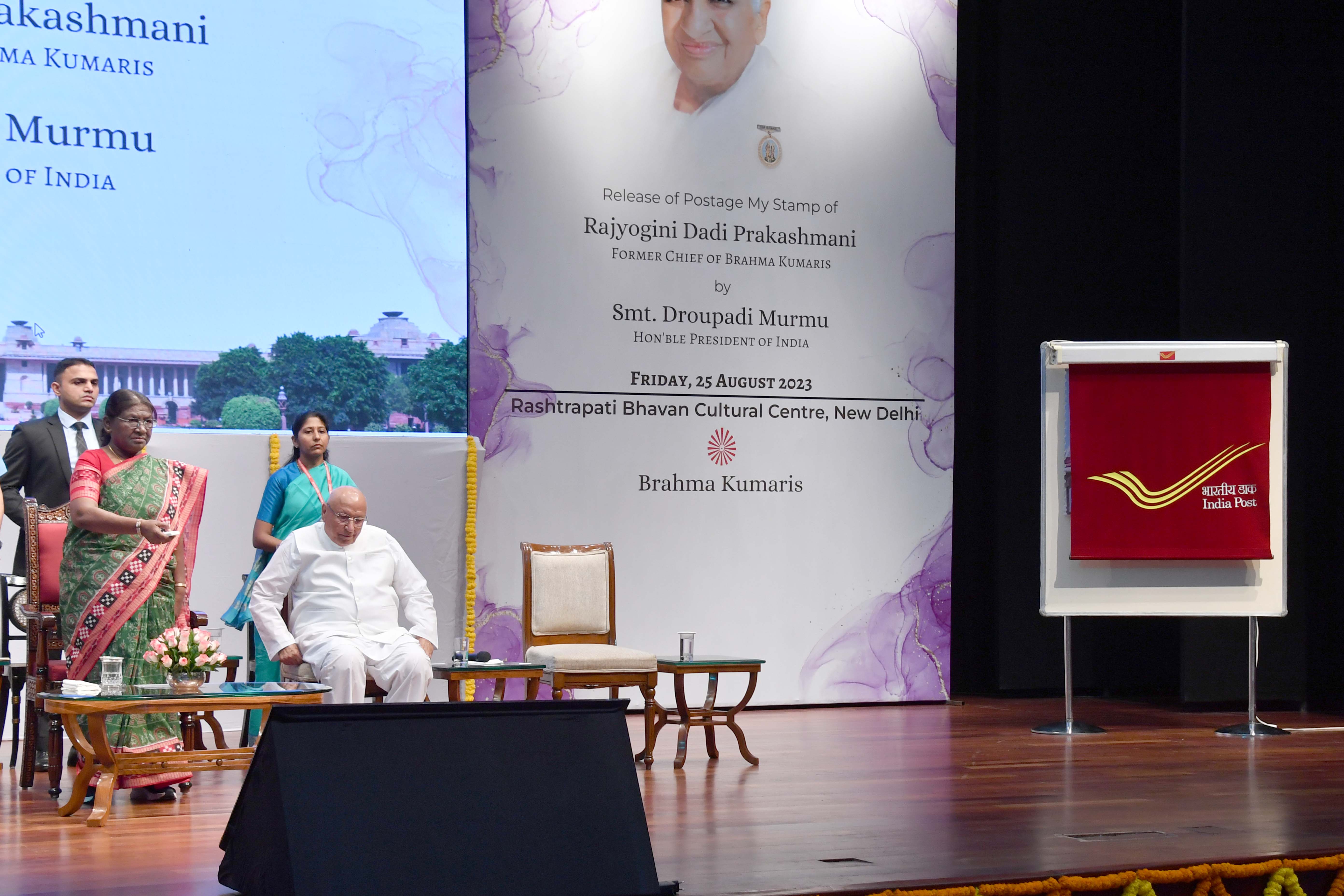 | Caption: | The President of India, Smt Droupadi Murmu released a postage stamp in memory of Dadi Prakashmani, former chief of Brahma Kumaris at Rashtrapati Bhavan Cultural Centre on August 25, 2023. |