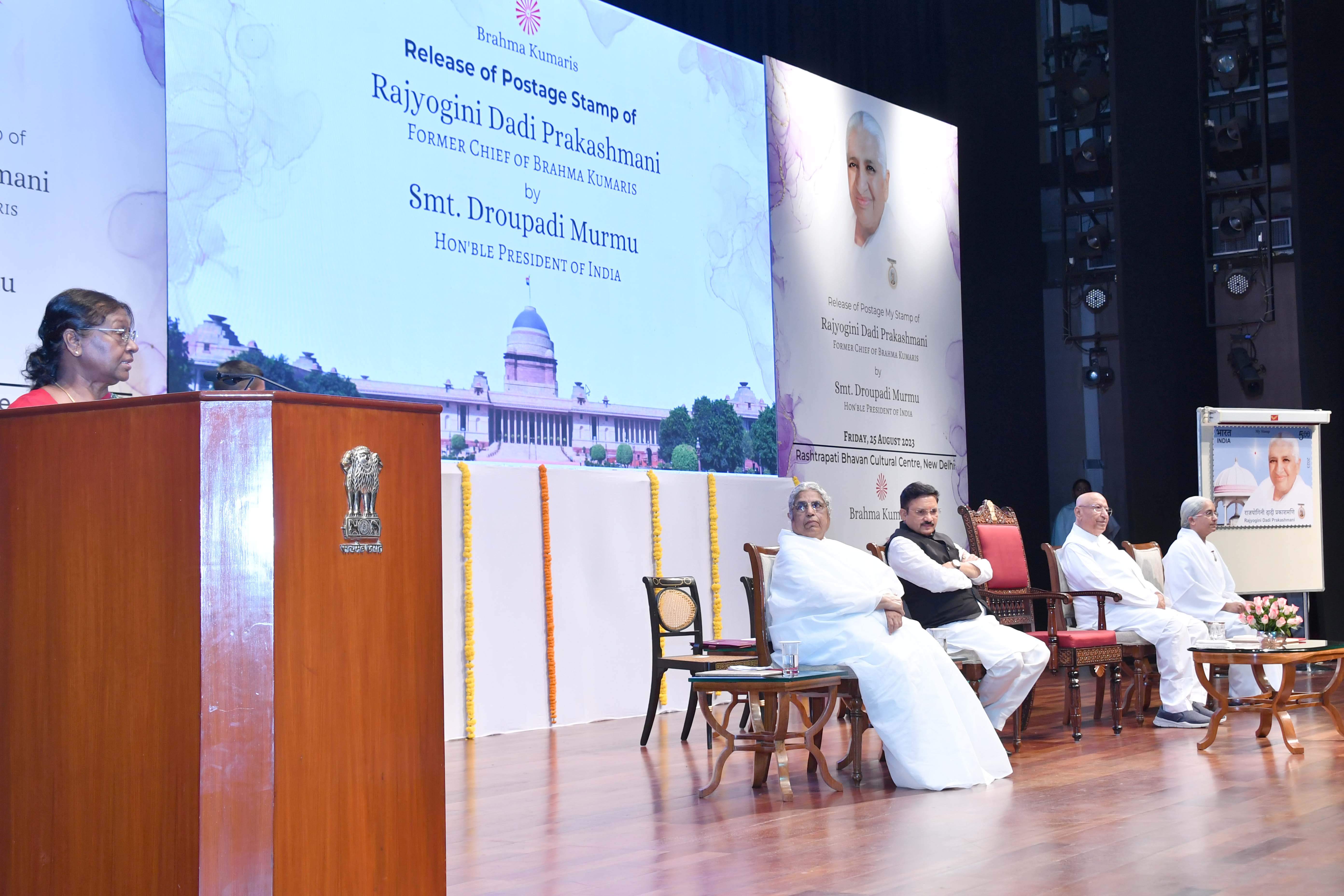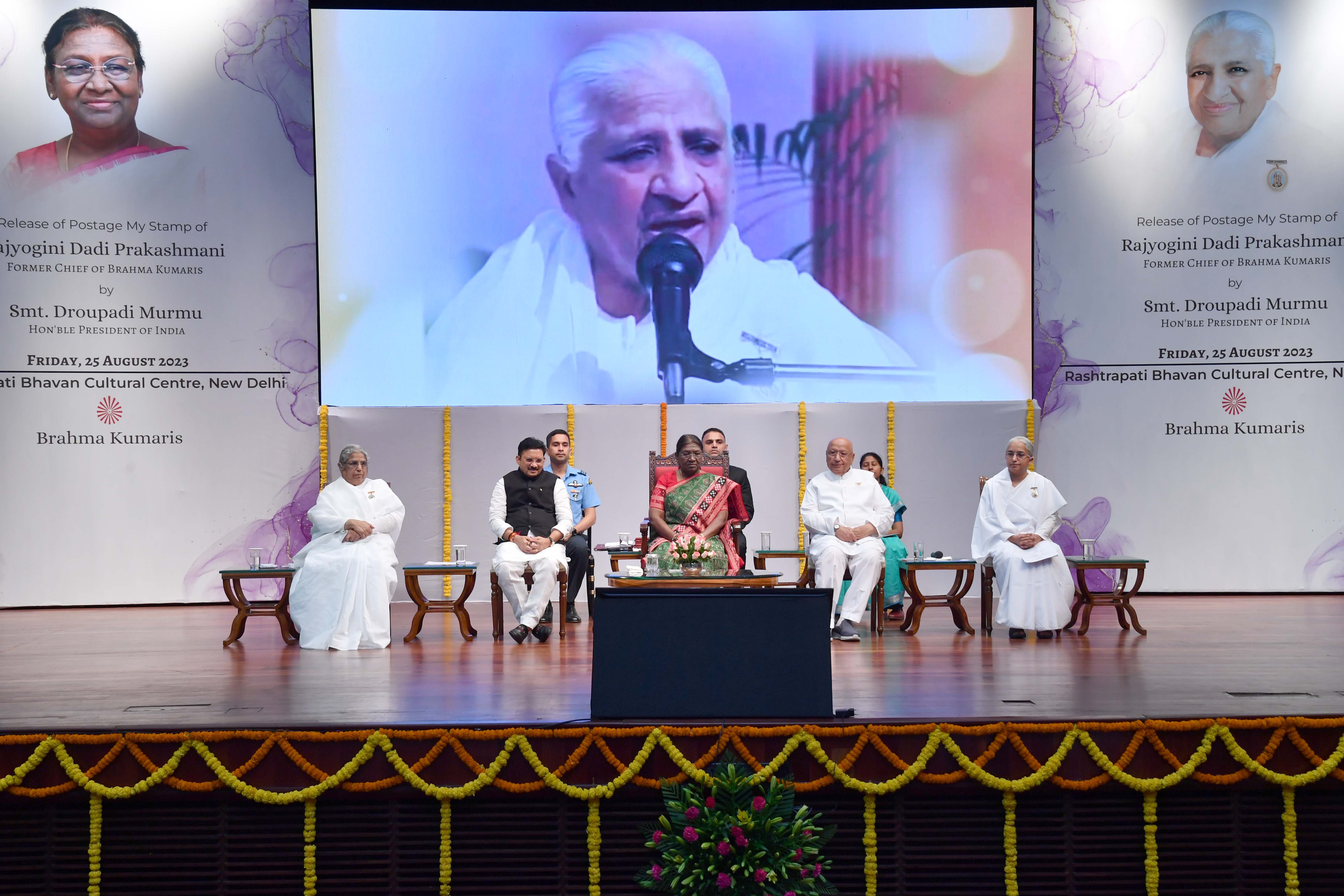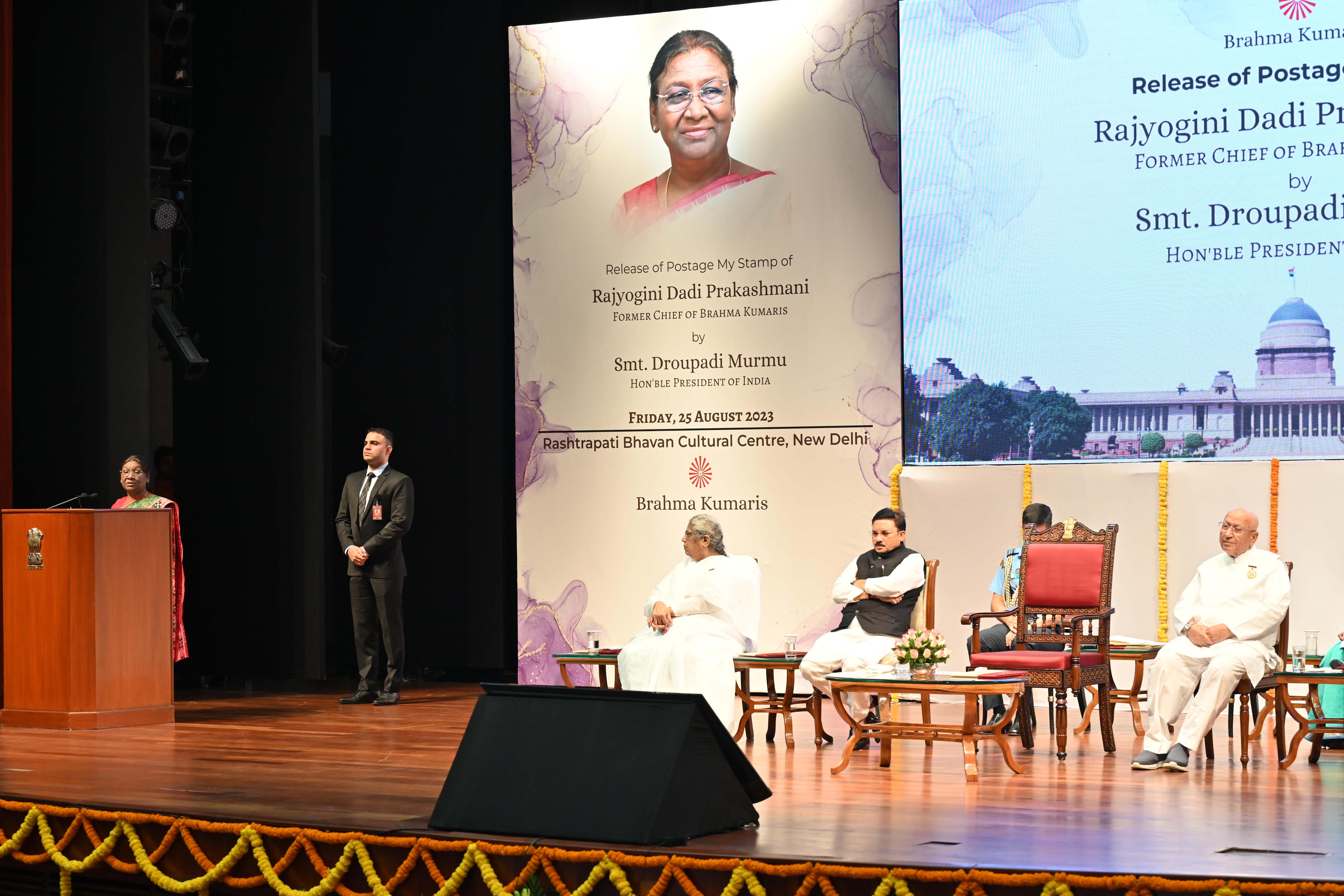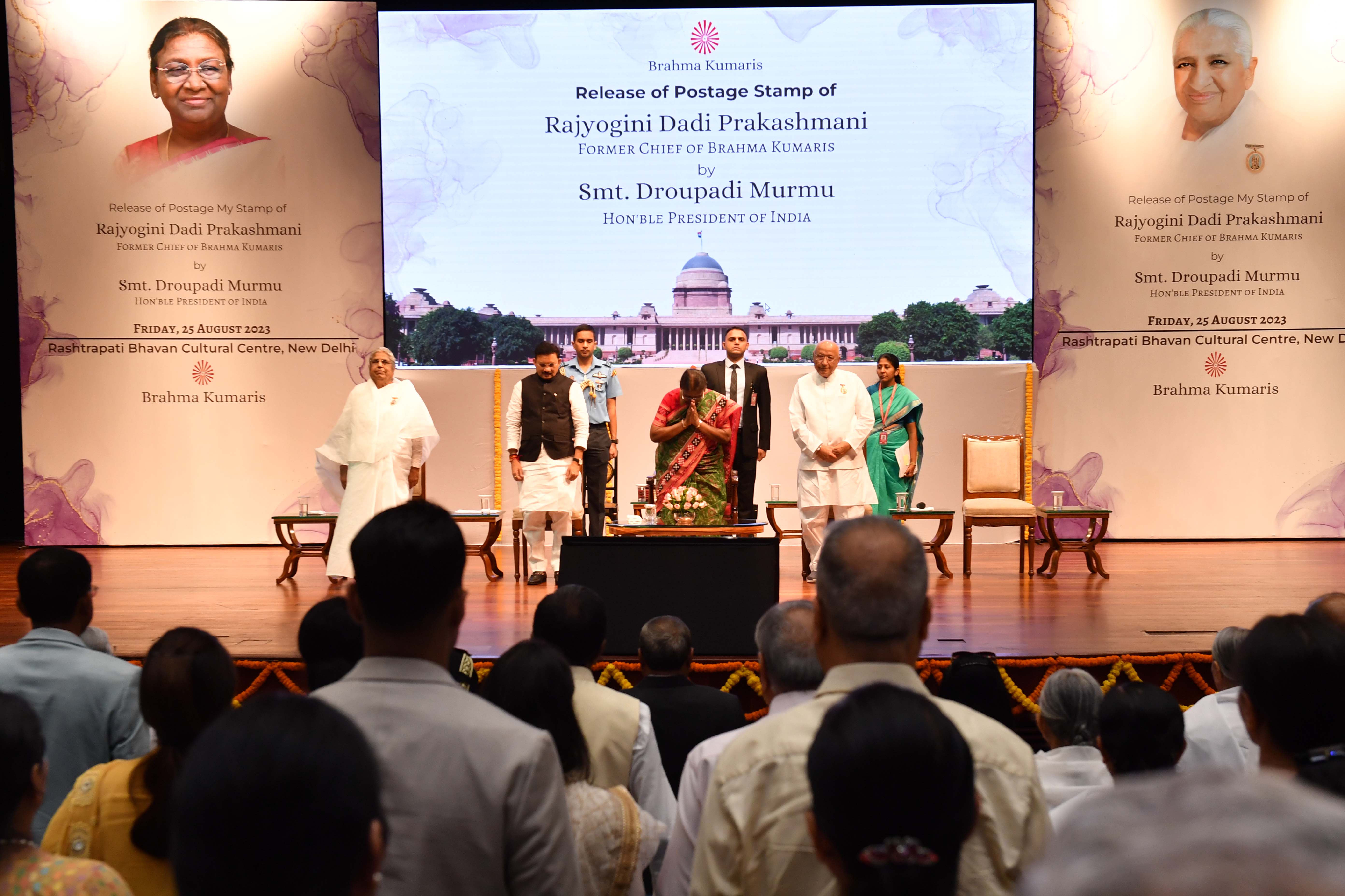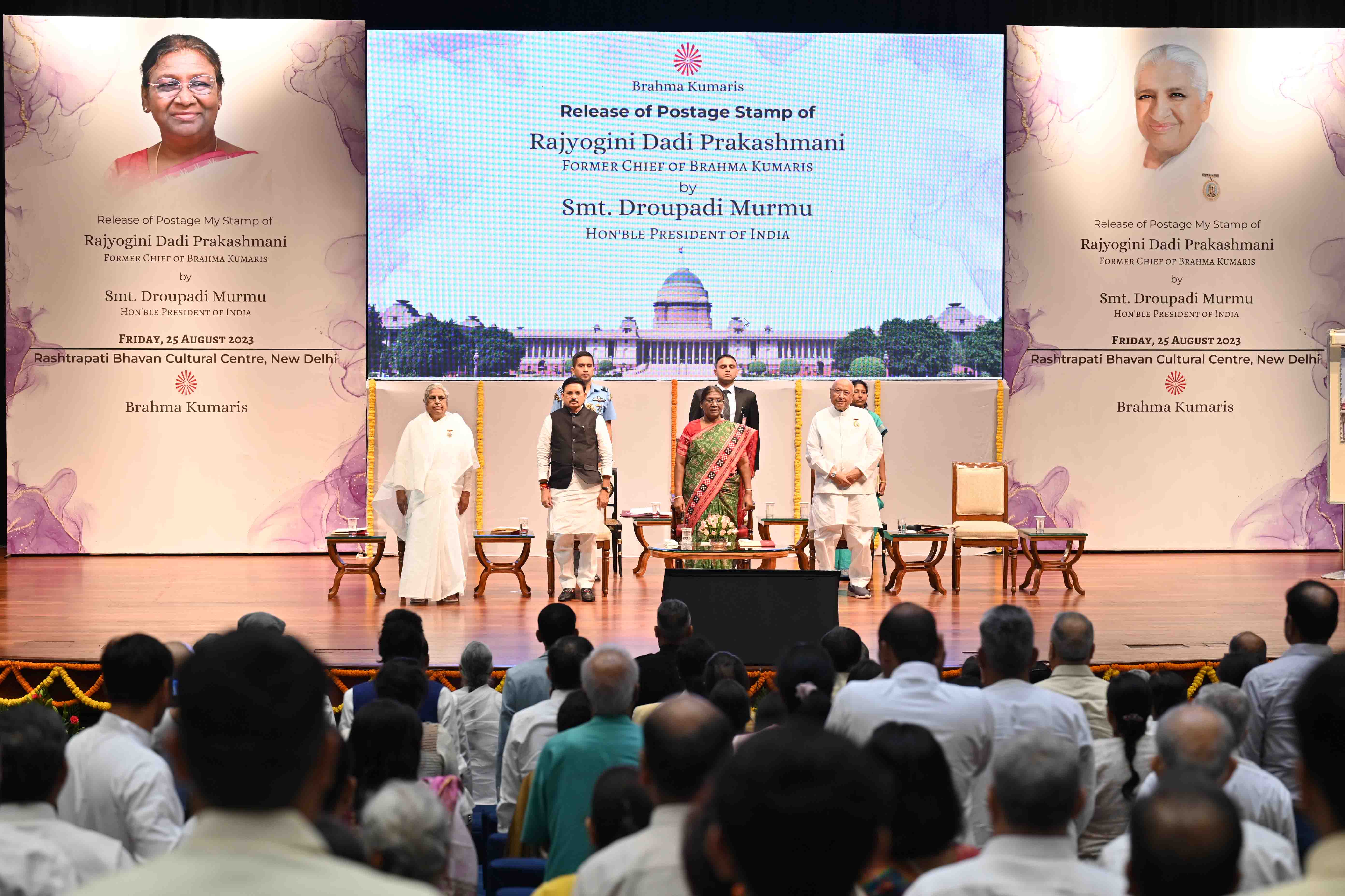 | Caption: | The President of India, Smt Droupadi Murmu released a postage stamp in memory of Dadi Prakashmani, former chief of Brahma Kumaris at Rashtrapati Bhavan Cultural Centre on August 25, 2023. |