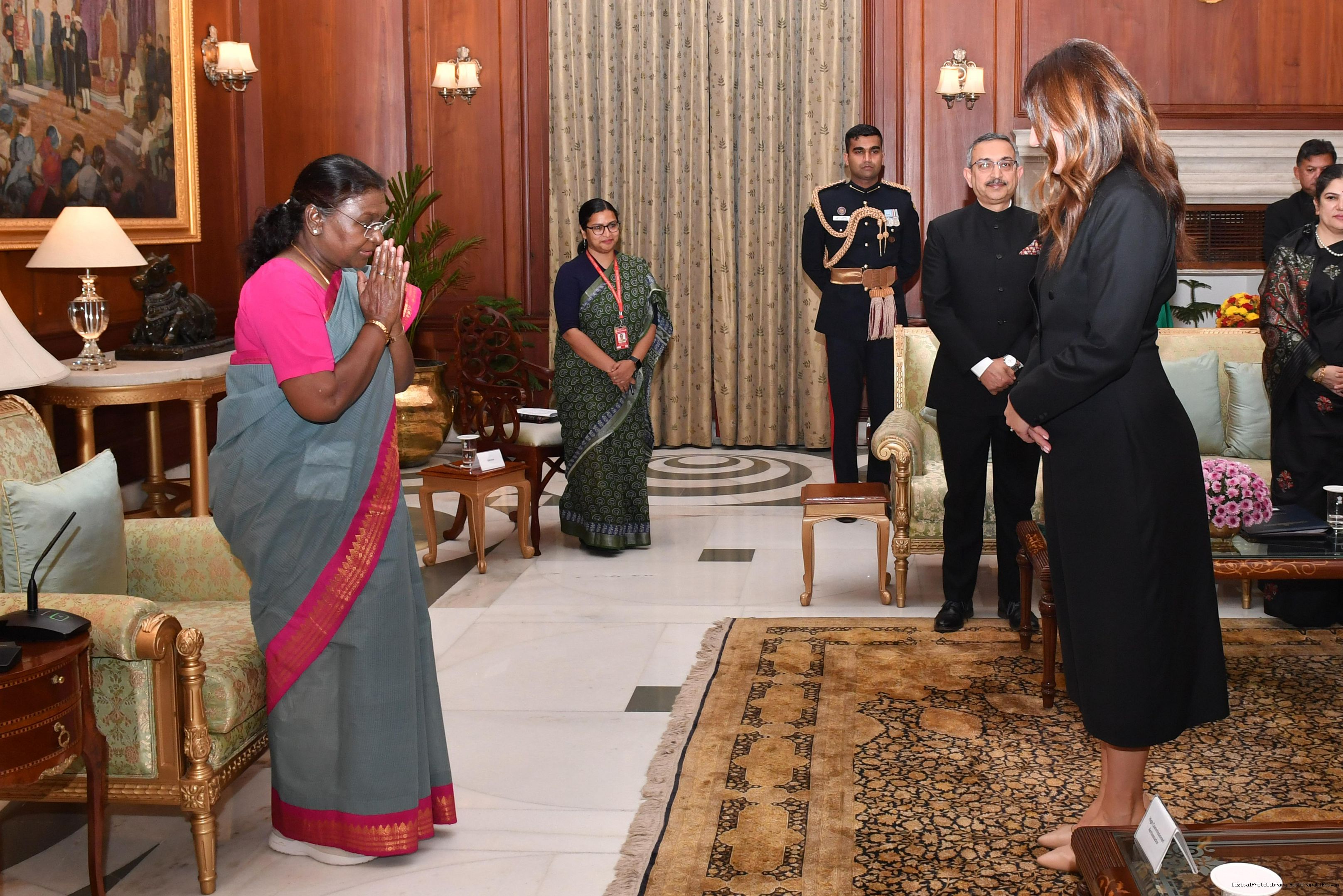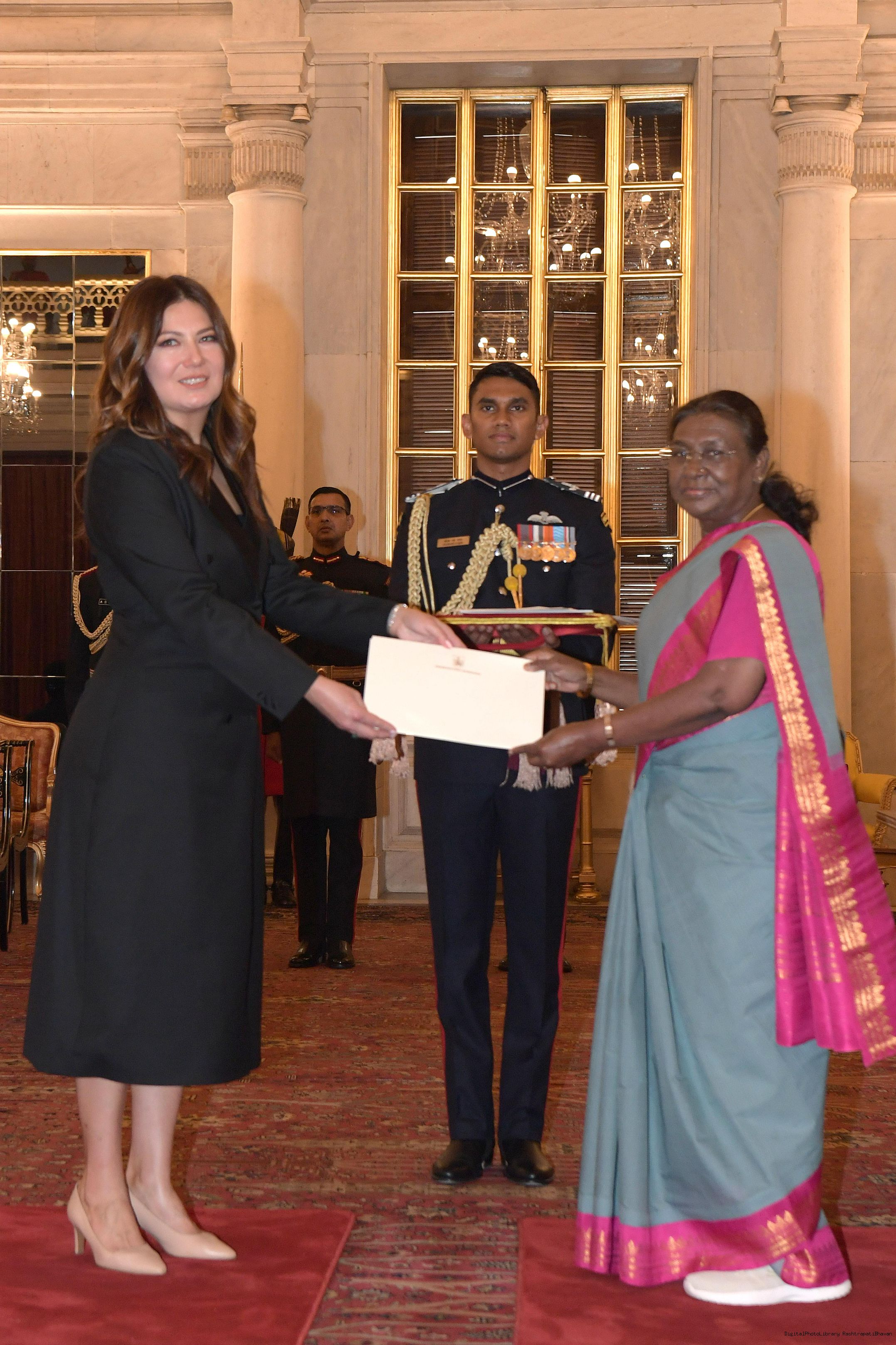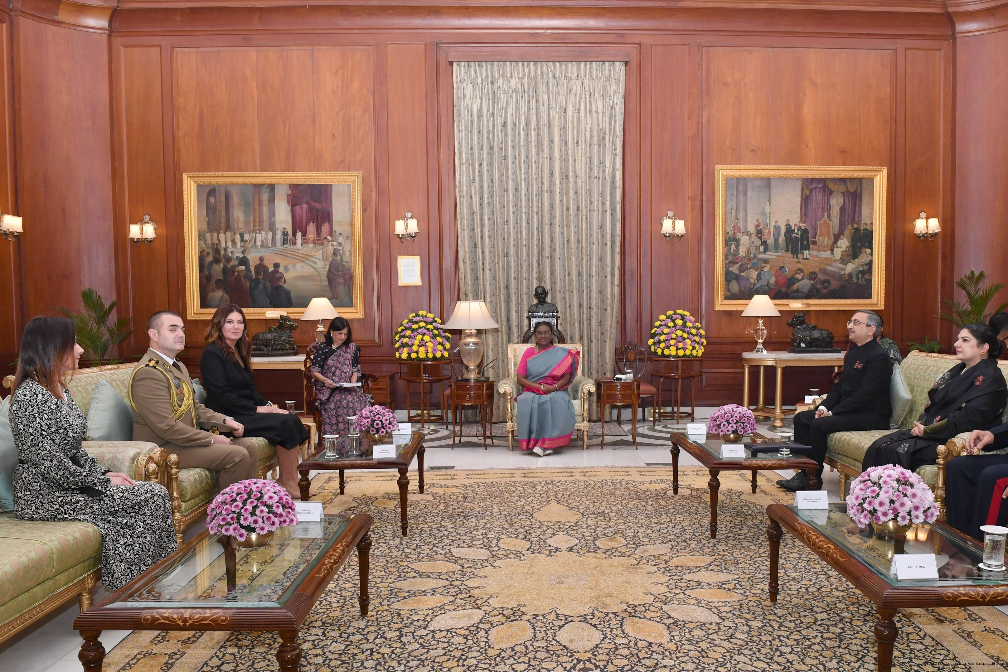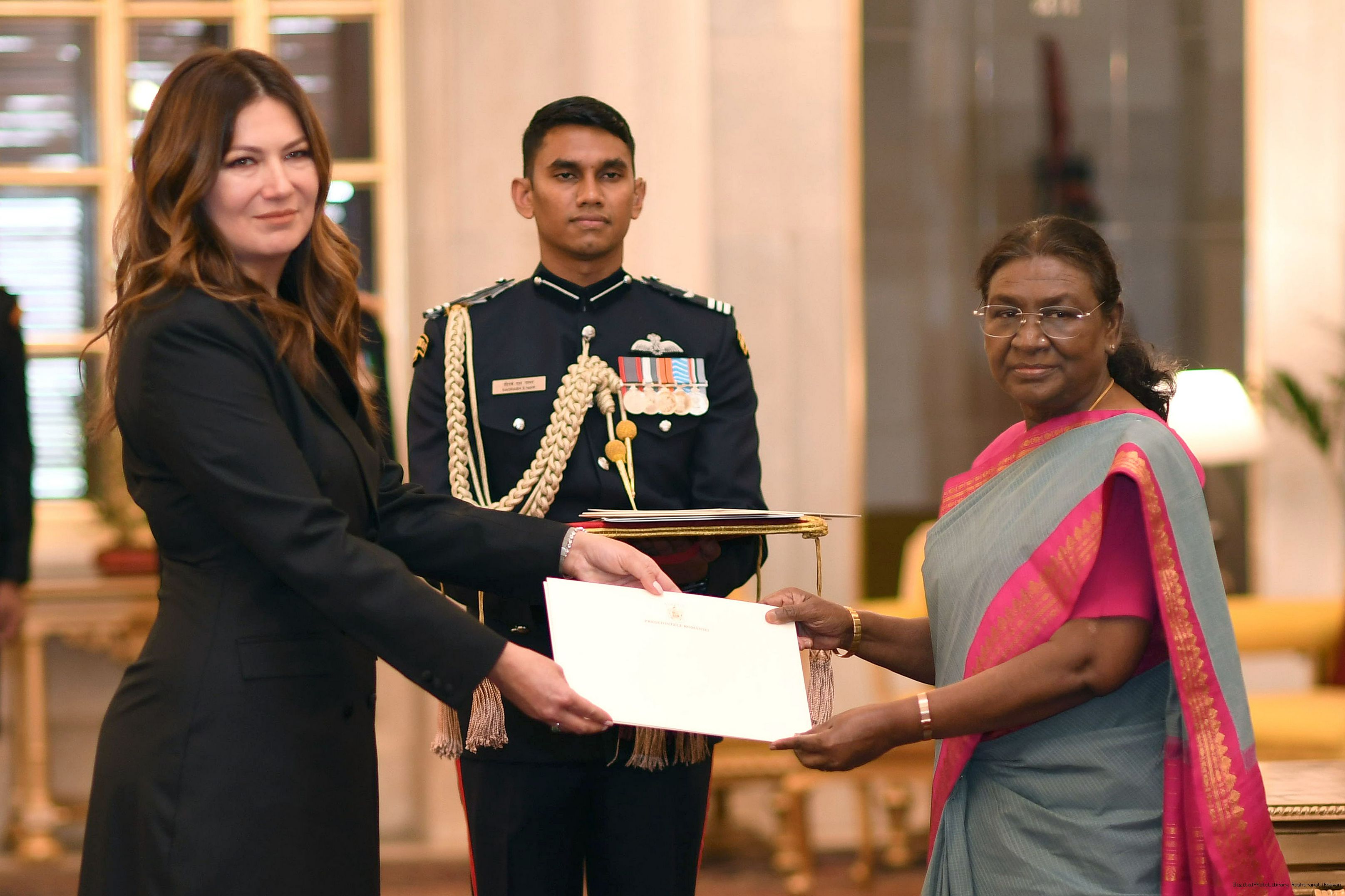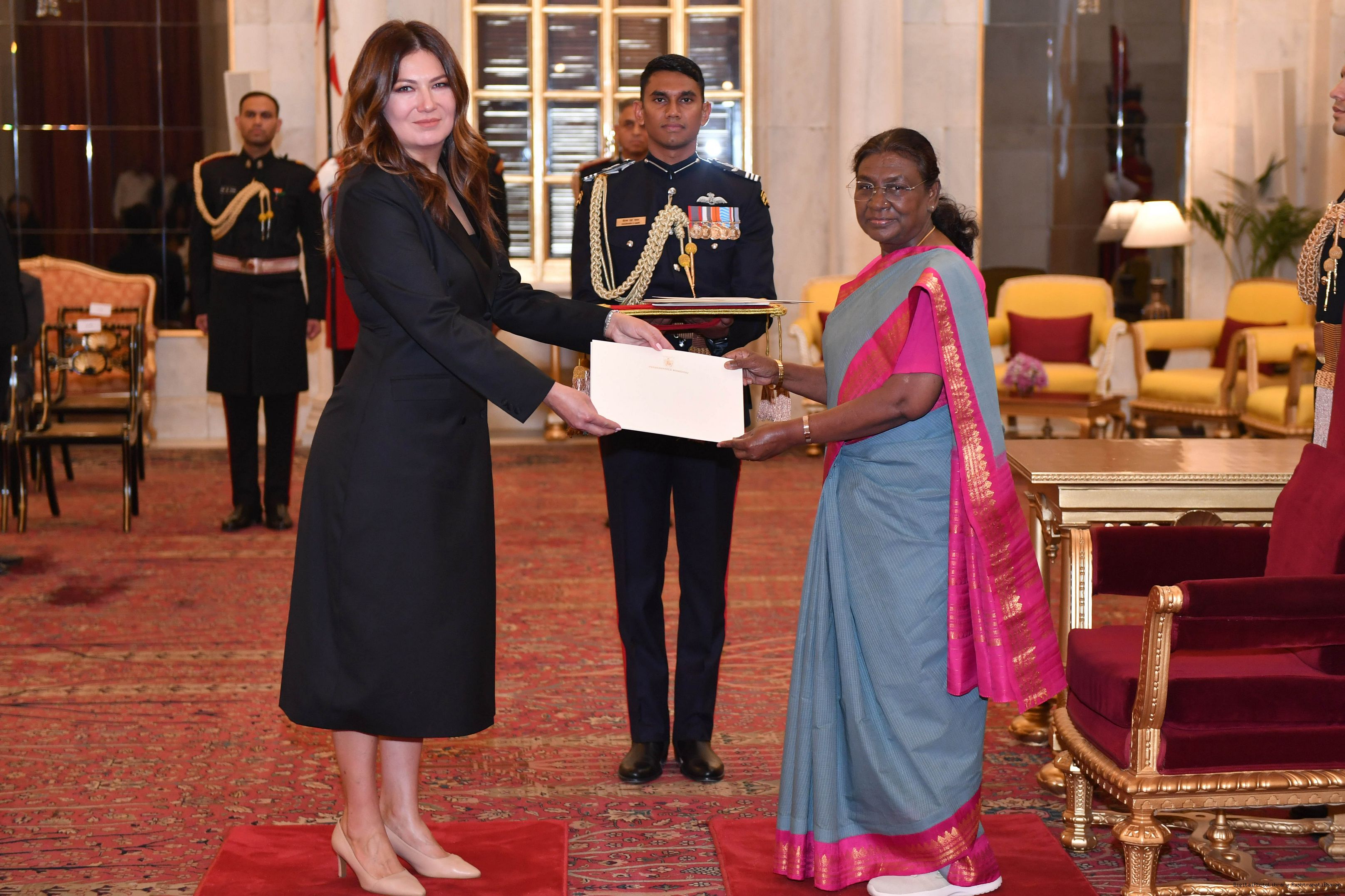 | Caption: | The Ambassador-designate of Romania, H.E. Ms. Sena Latif presenting her credentials to the President of India, Smt. Droupadi Murmu at Rashtrapati Bhavan in New Delhi on November 25, 2024. |