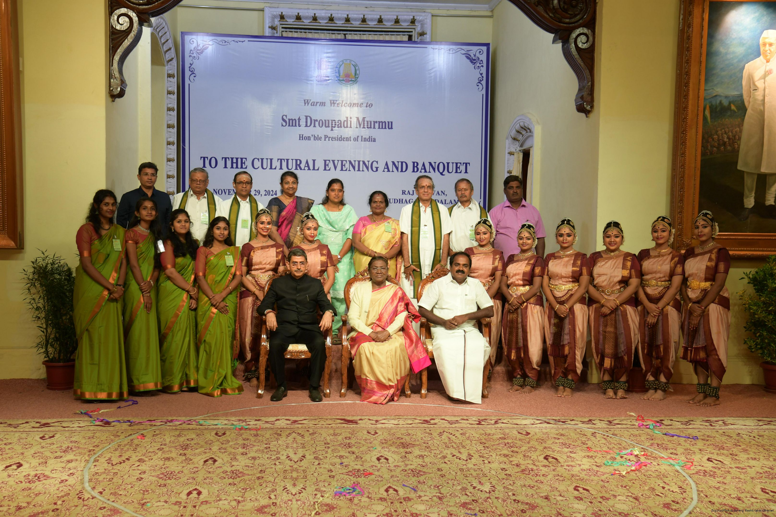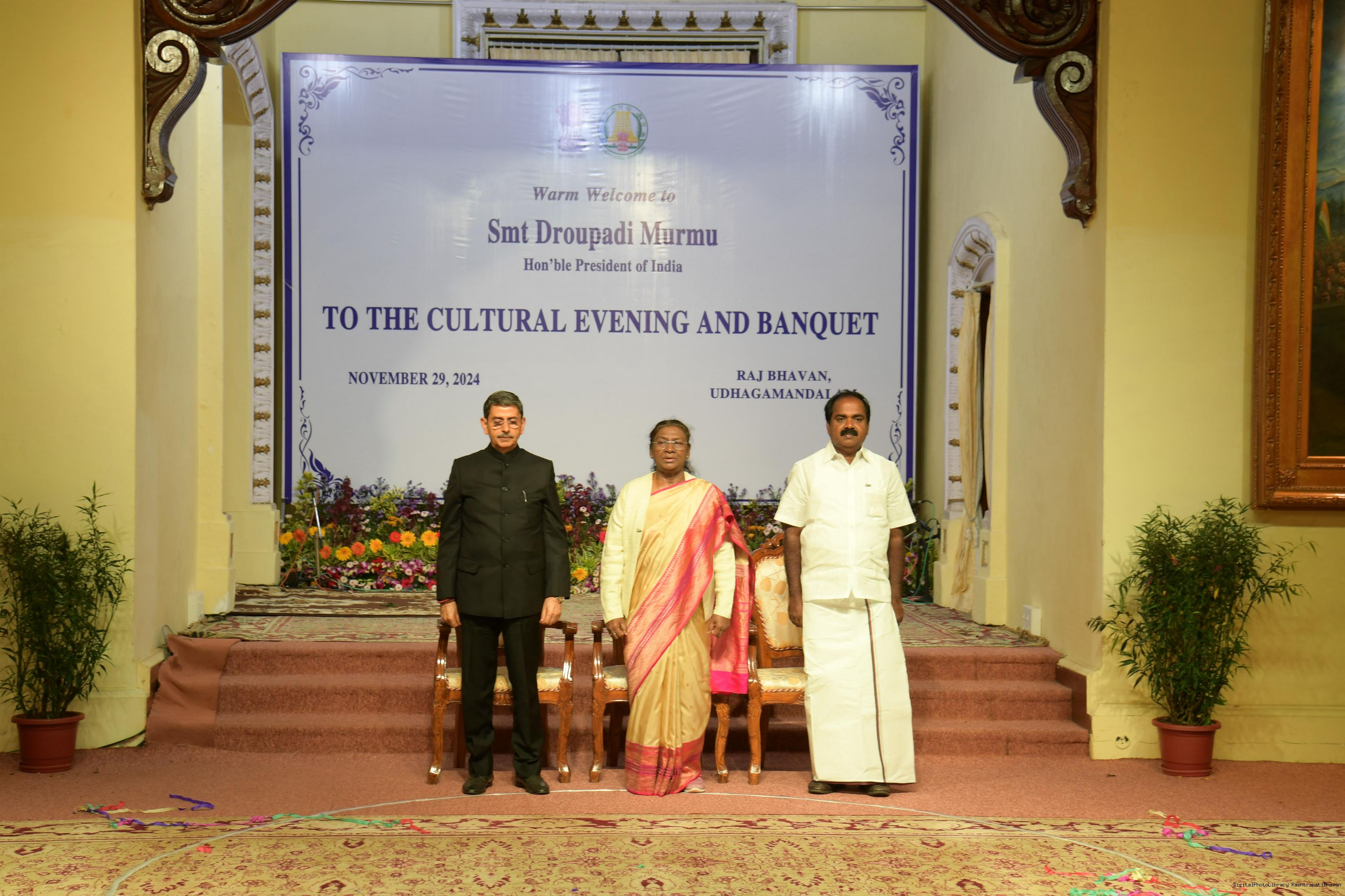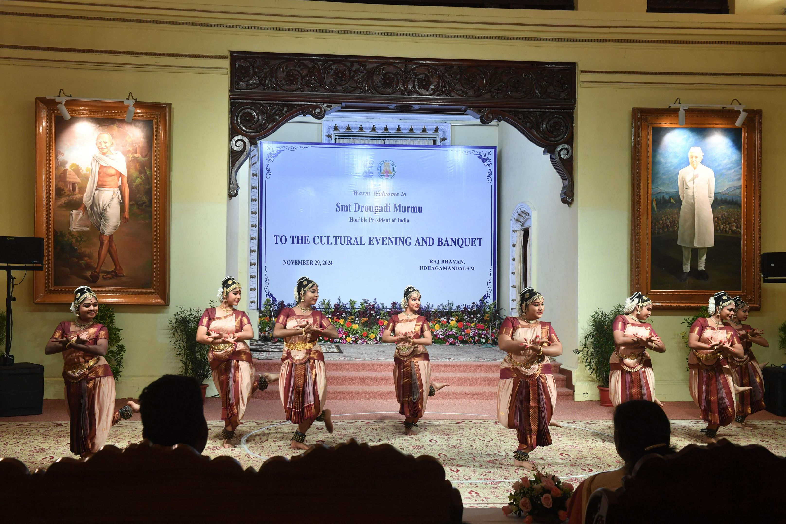 | Caption: | The President of India Smt. Droupadi Murmu witnessing Cultural Programme in Ballroom of at Raj Bhavan Ooty, Tamil Nadu on November 29, 2024. |