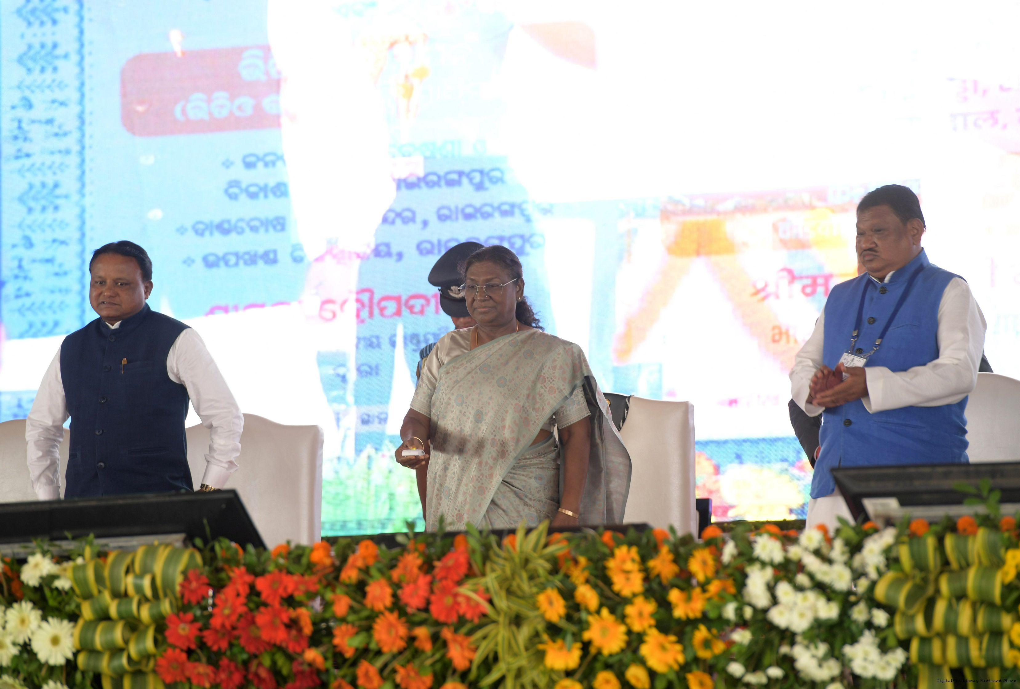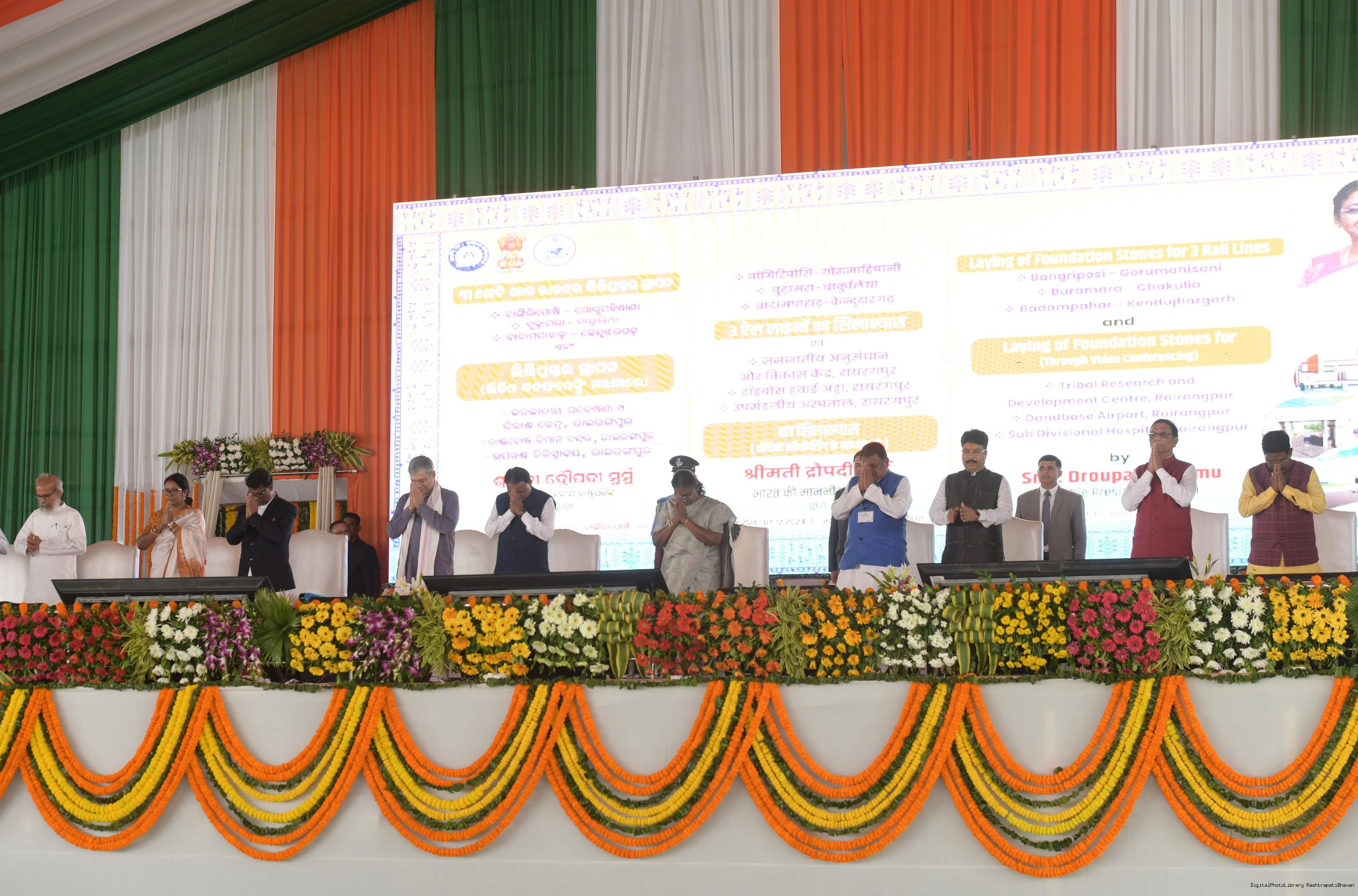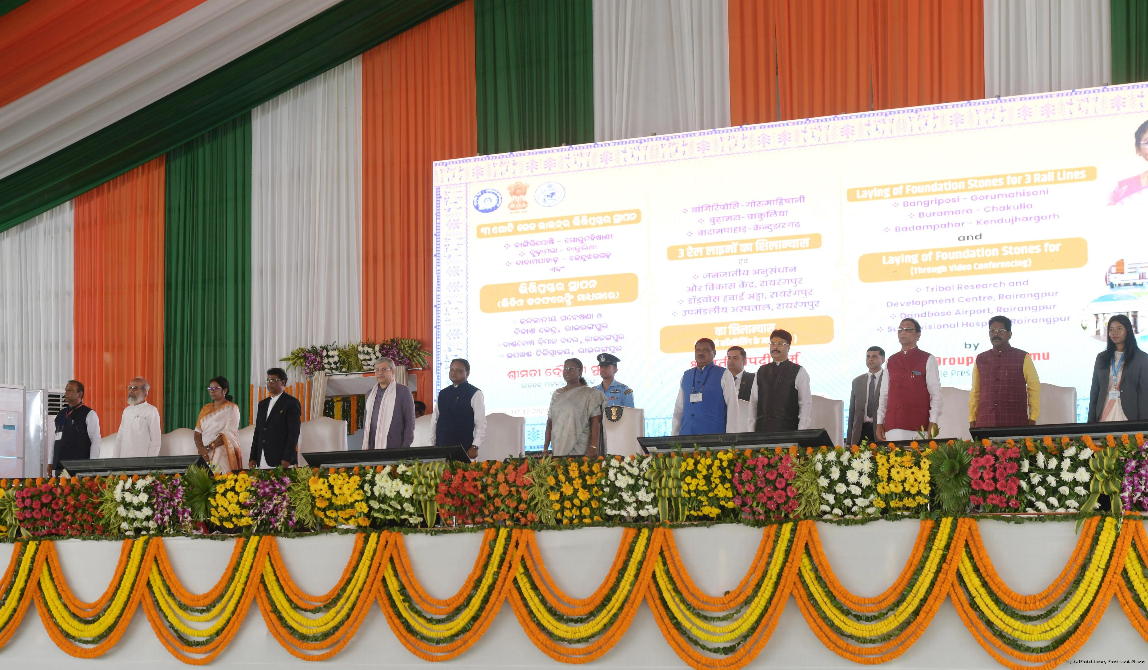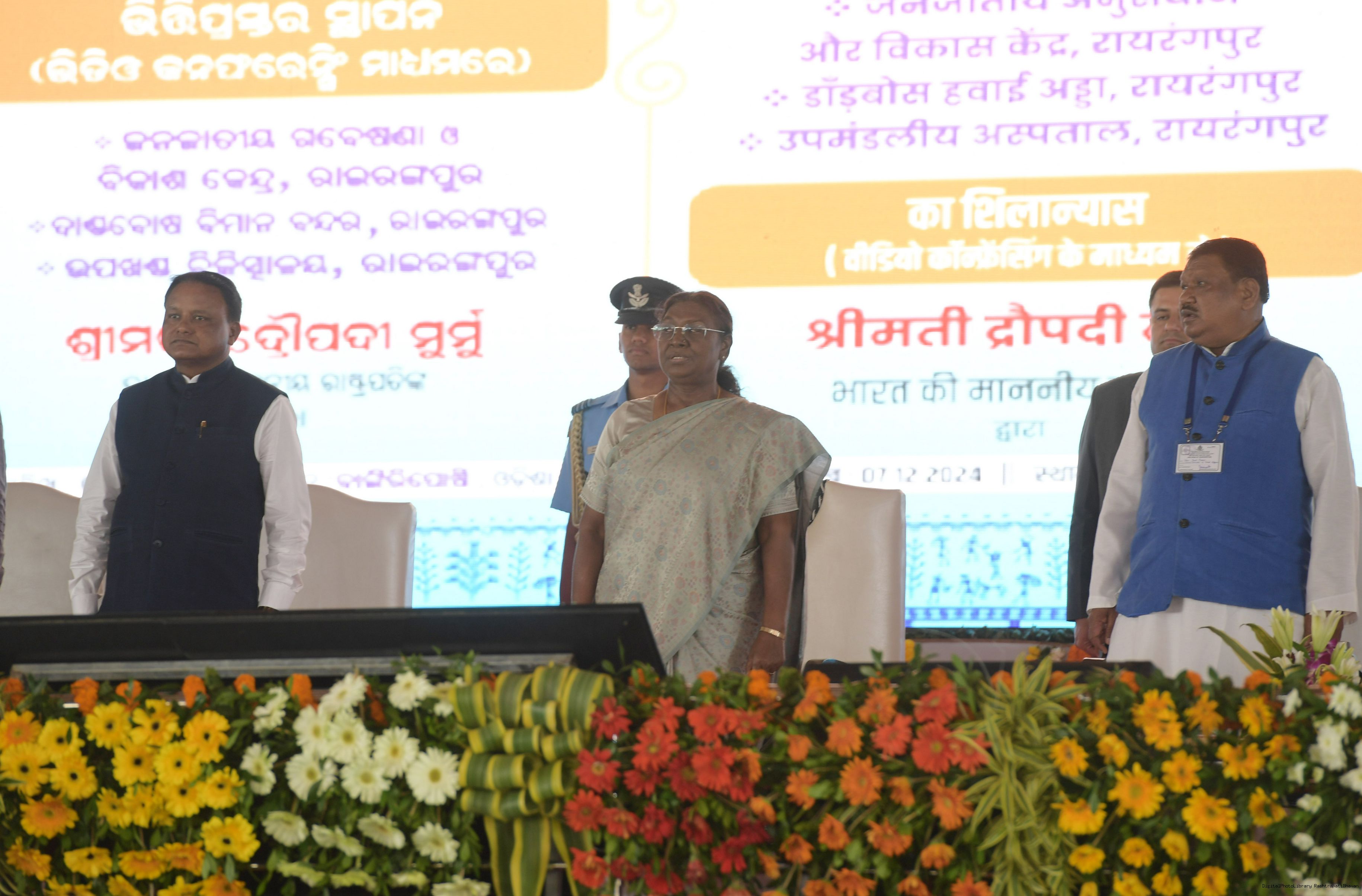 | Caption: | The President of India Smt. Droupadi Murmu laid the foundation stones for various developmental projects at Rairangpur, Odisha on December 7, 2024. |