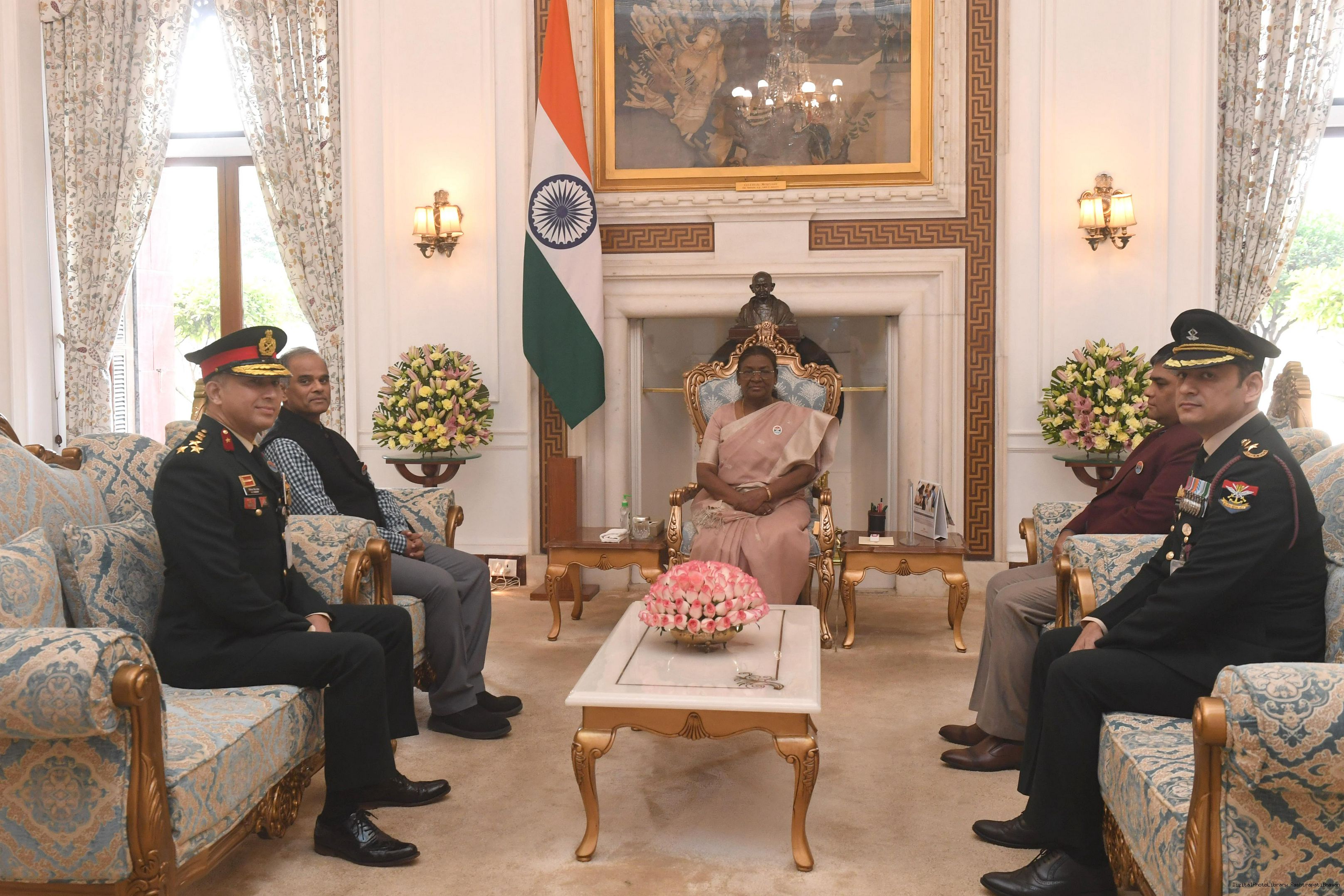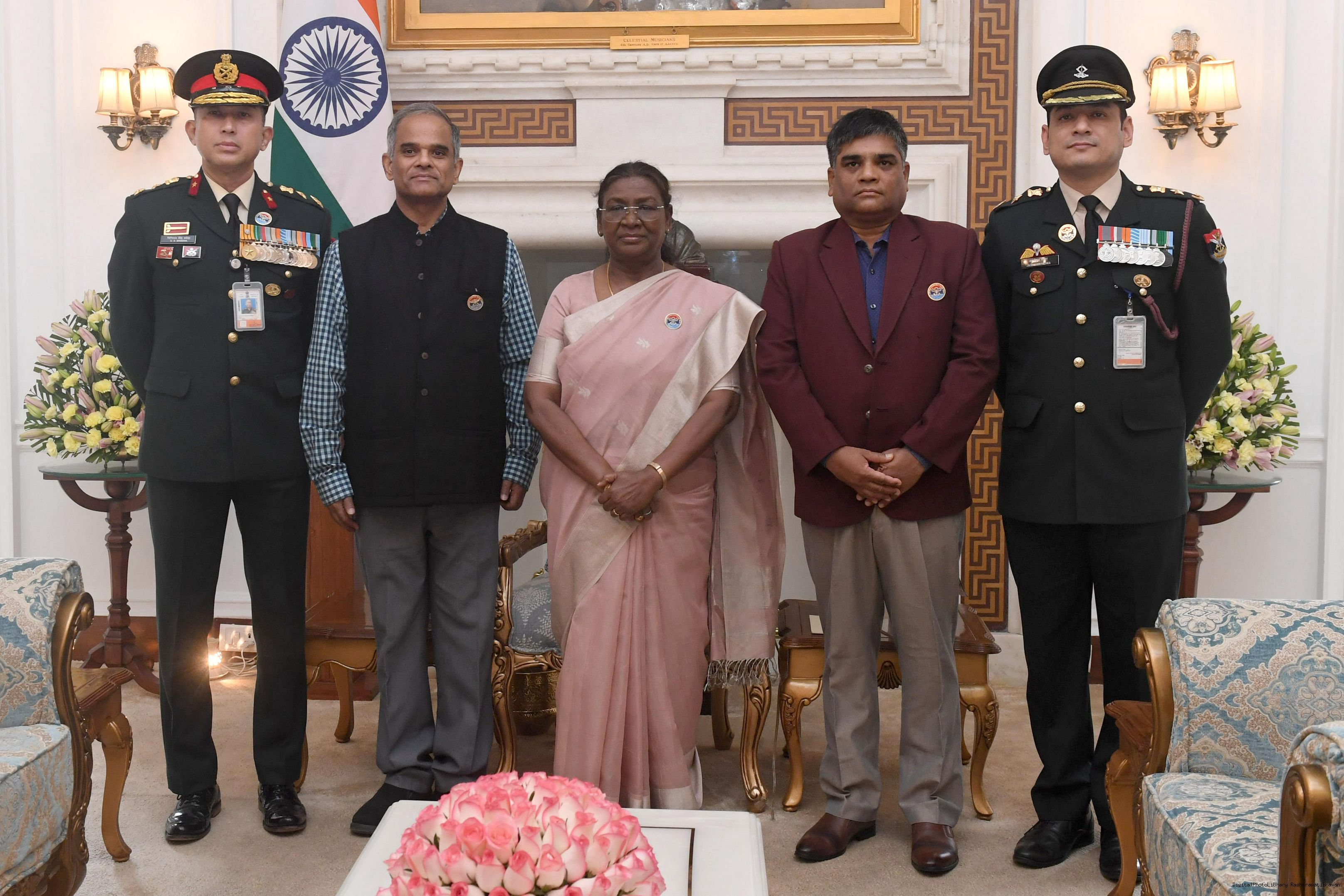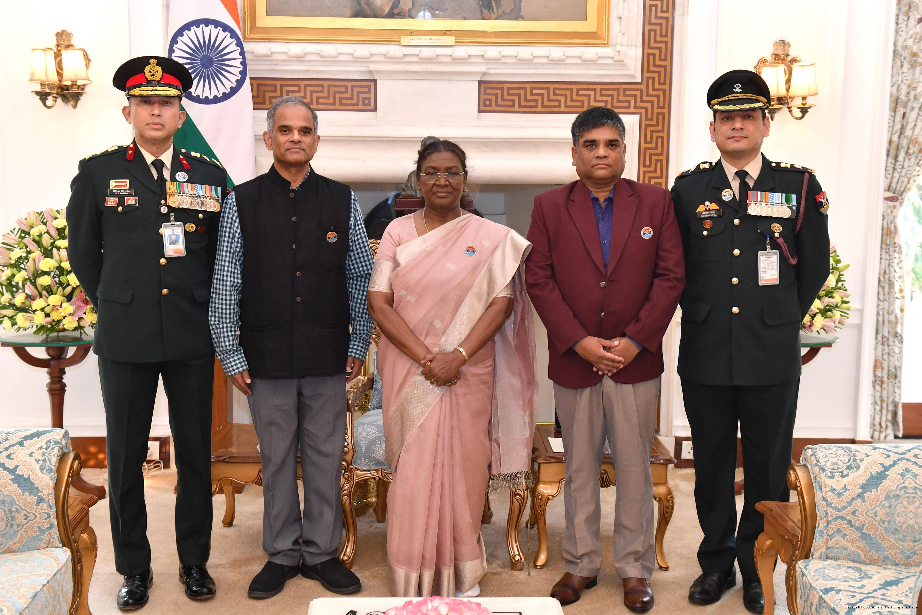 | Caption: | Shri Niten Chandra, Secretary, D/o Ex Servicemen Welfare, Ministry of Defence along with Dr. Pudi Hari Prasad, JS (ESW), Brig DS Basera, VSM** Secretary KSM and Lt Col Jagmohan Mehra, JD (Adm Coord) meeting with the President of India Smt. Droupadi Murmu at Rashtrapati Bhavan on December 9, 2024. |
