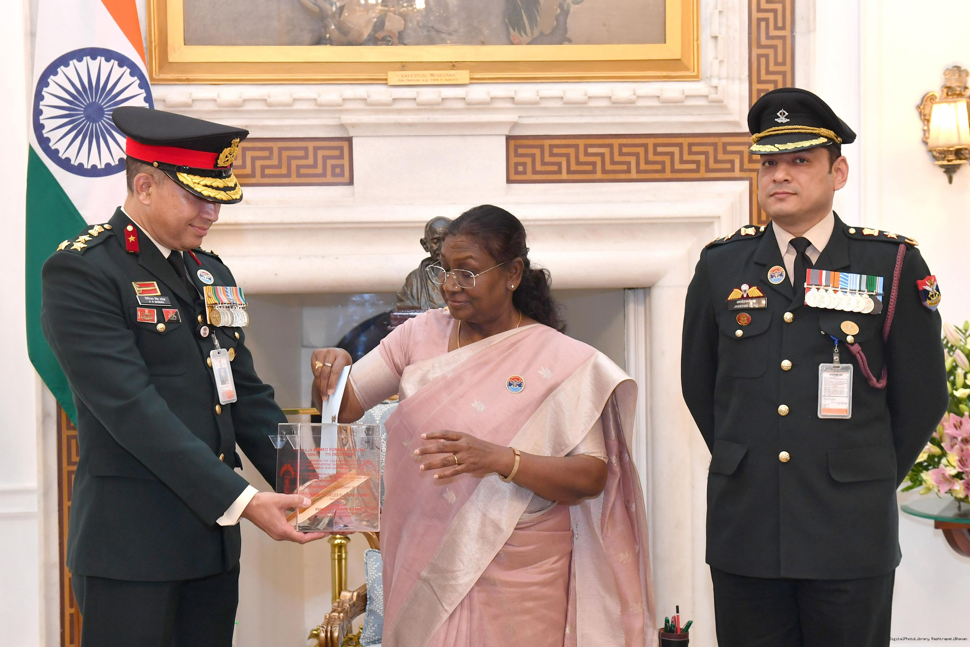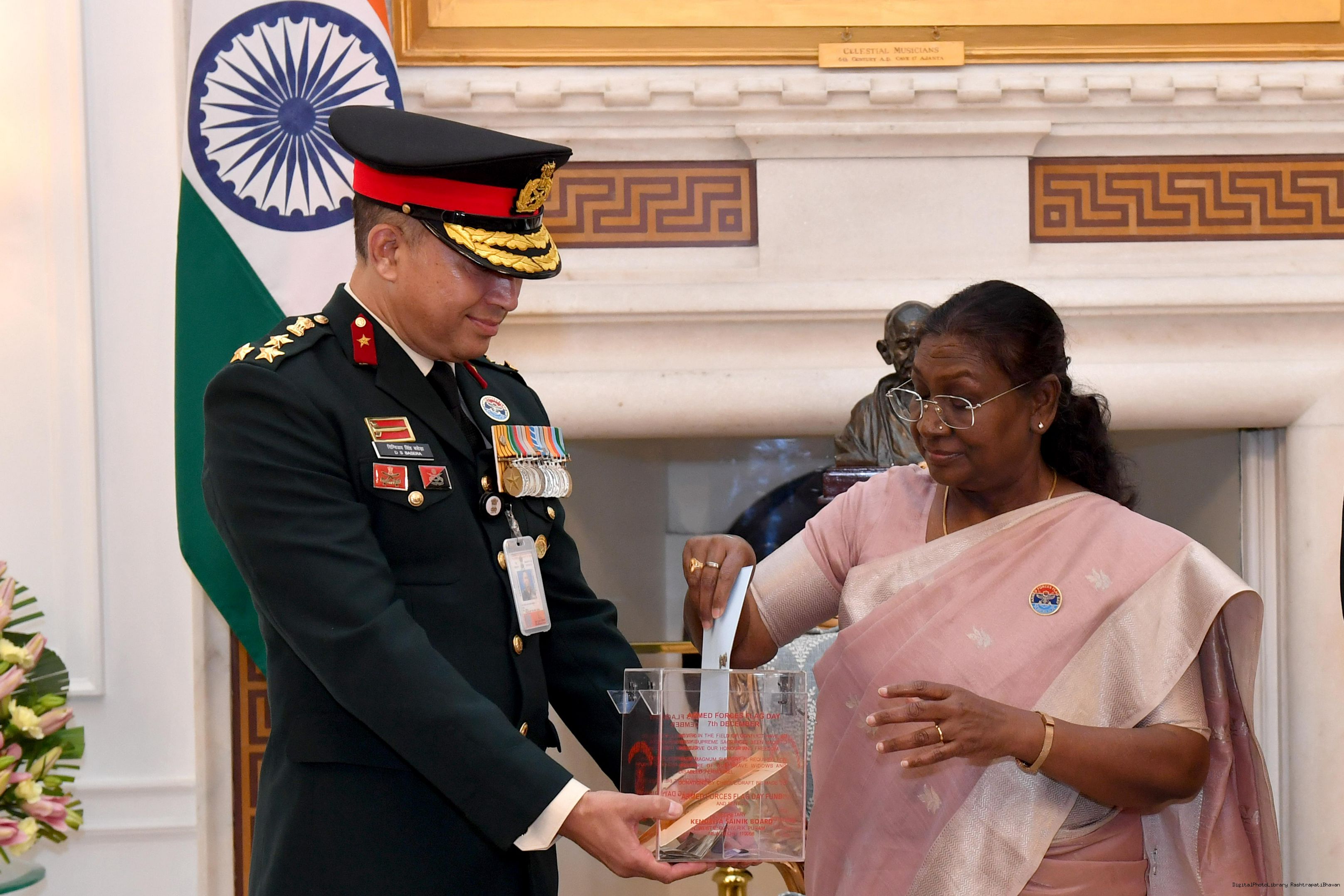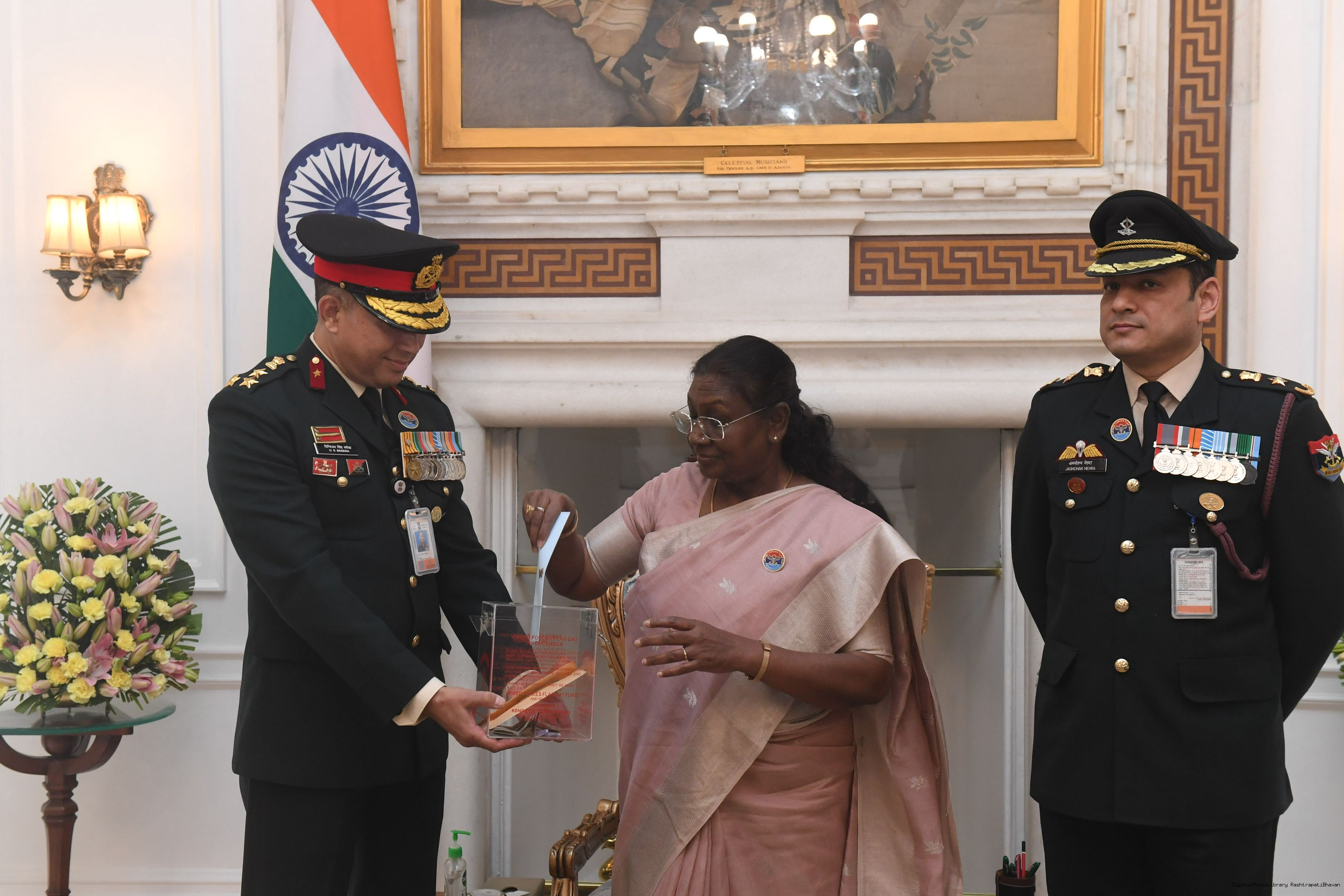 | Caption: | Shri Niten Chandra, Secretary, D/o Ex Servicemen Welfare, Ministry of Defence along with Dr. Pudi Hari Prasad, JS (ESW), Brig DS Basera, VSM** Secretary KSM and Lt Col Jagmohan Mehra, JD (Adm Coord) meeting with the President of India Smt. Droupadi Murmu at Rashtrapati Bhavan on December 9, 2024. |