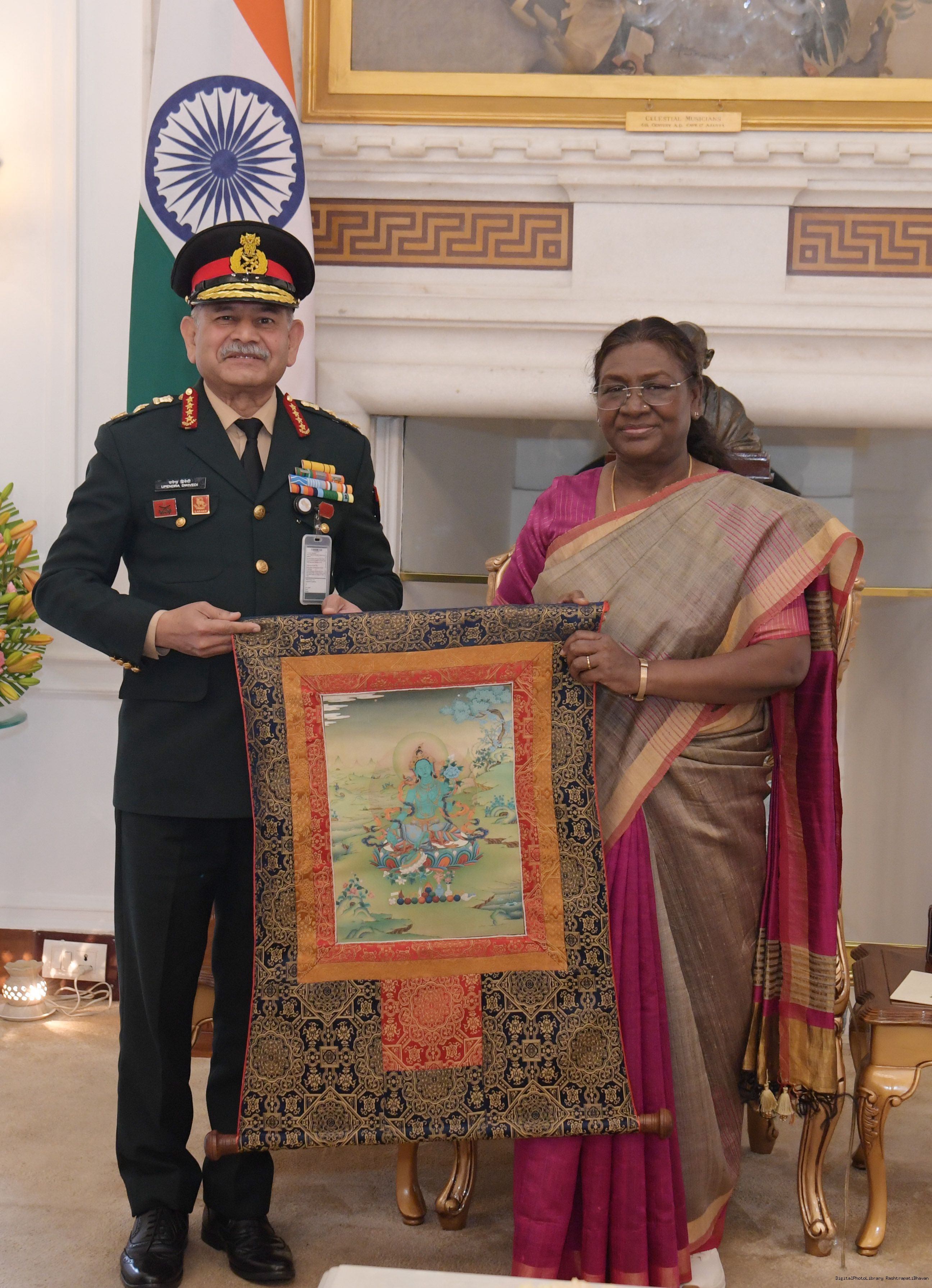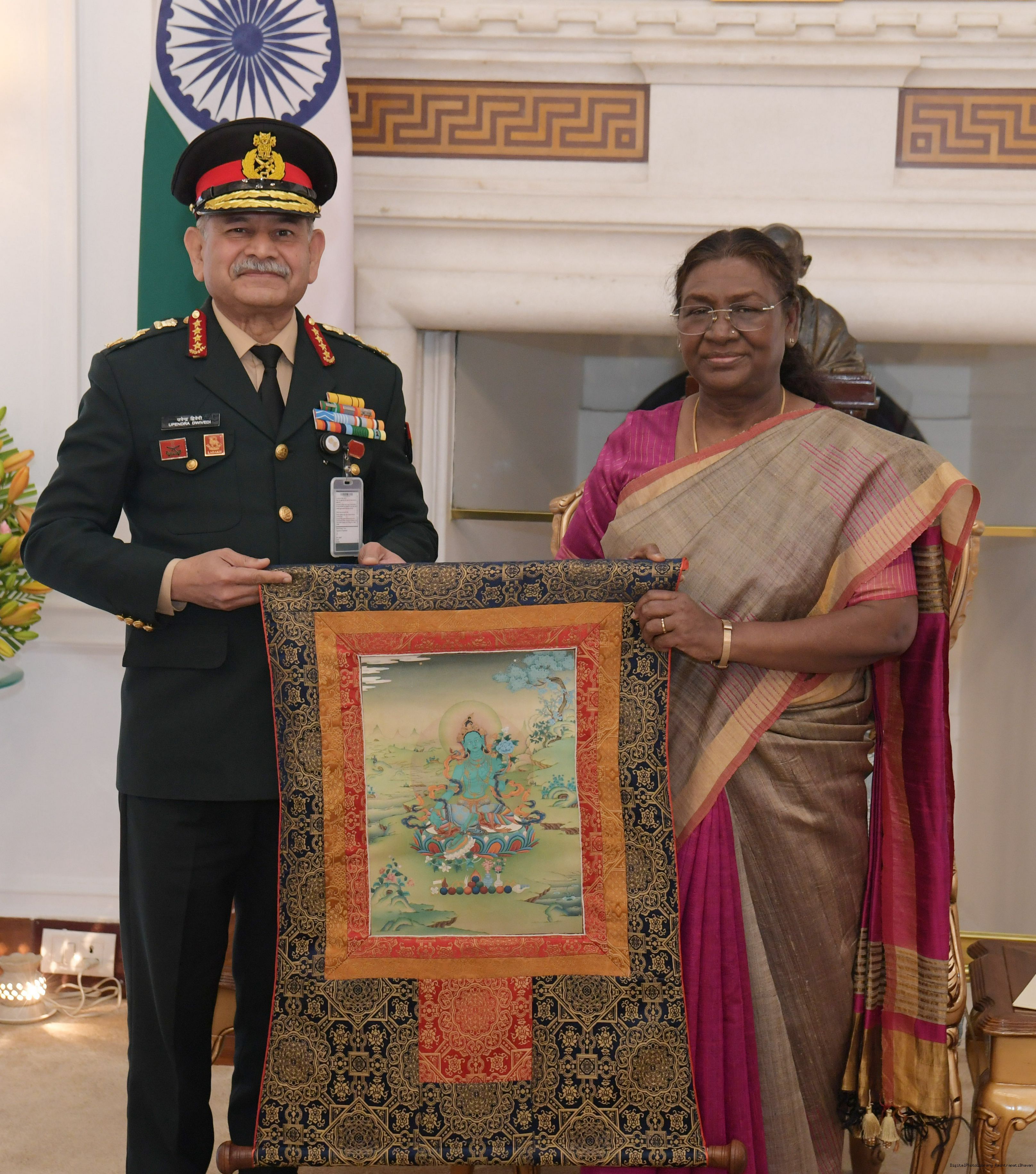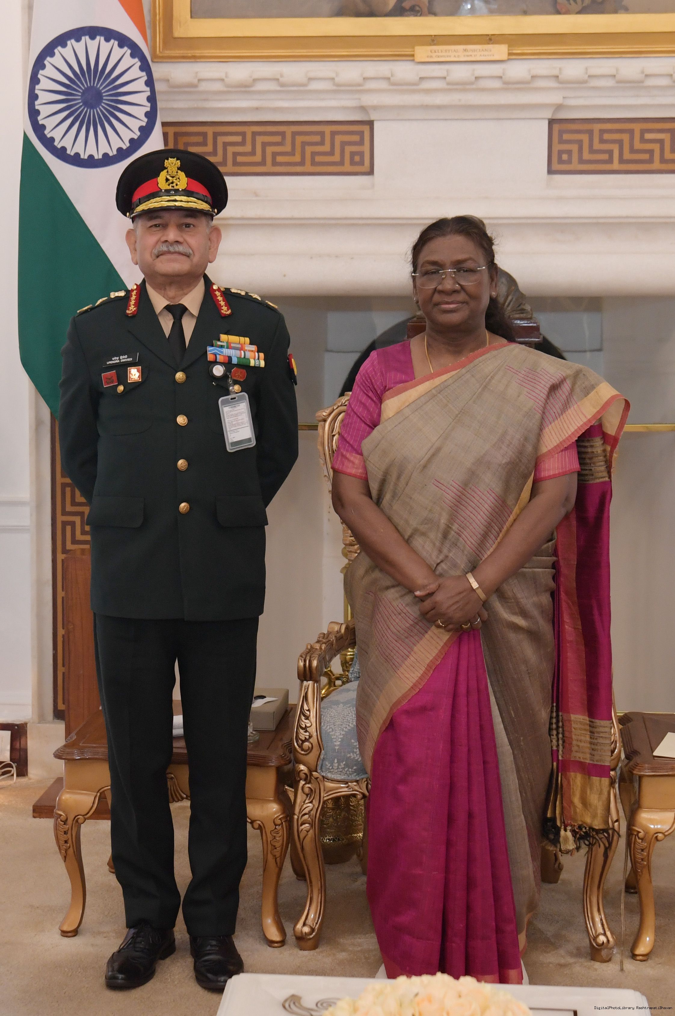 | Caption: | The Chief of the Army Staff, General Upendra Dwivedi called on the President of India Smt. Droupadi Murmu at Rashtrapati Bhavan on December 11, 2024. |